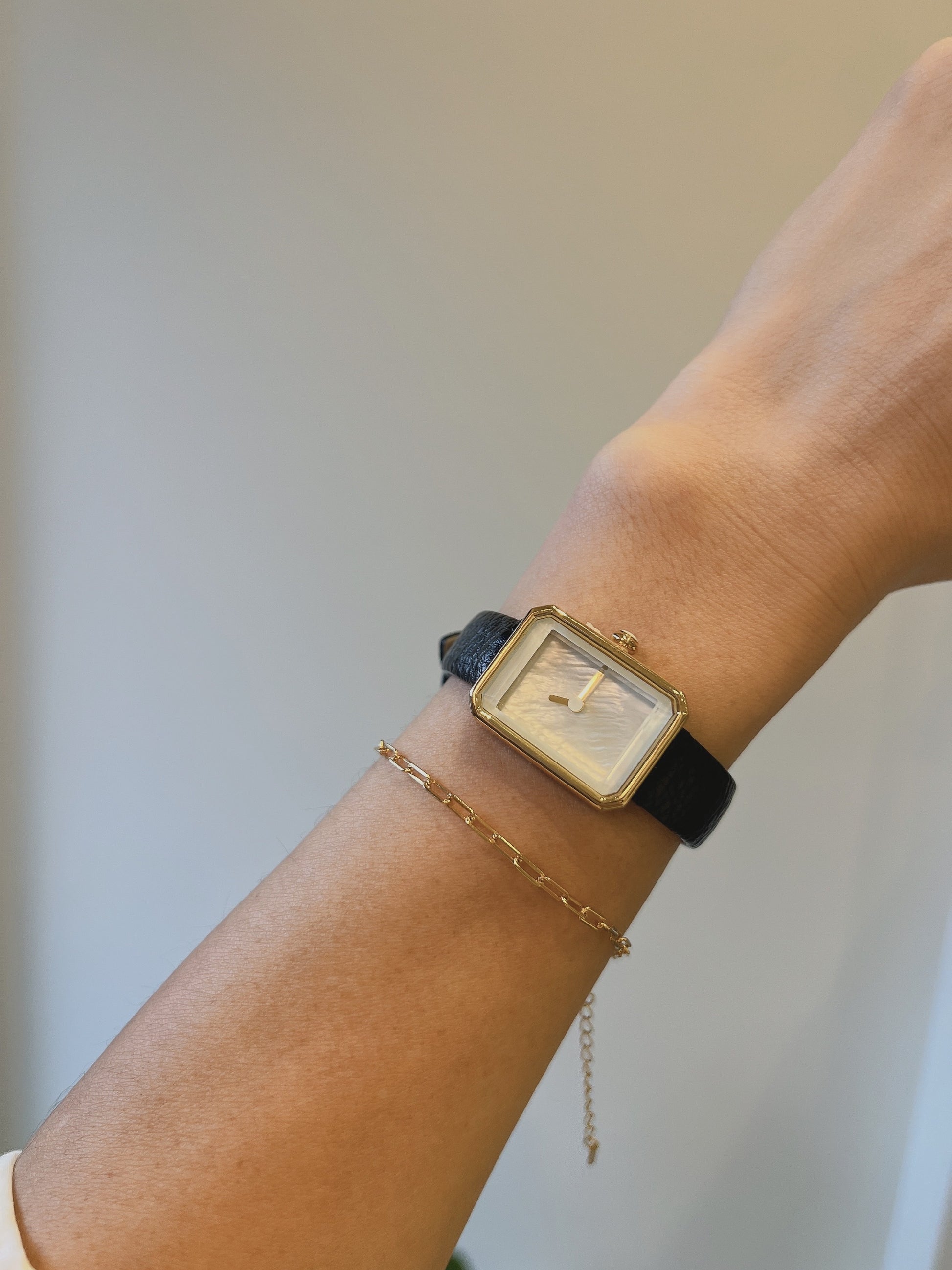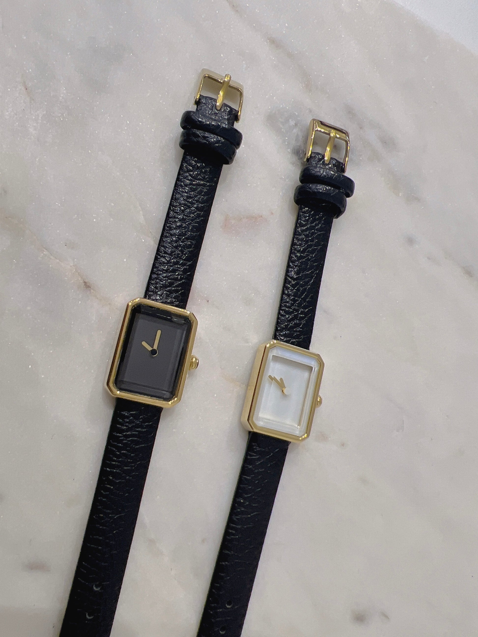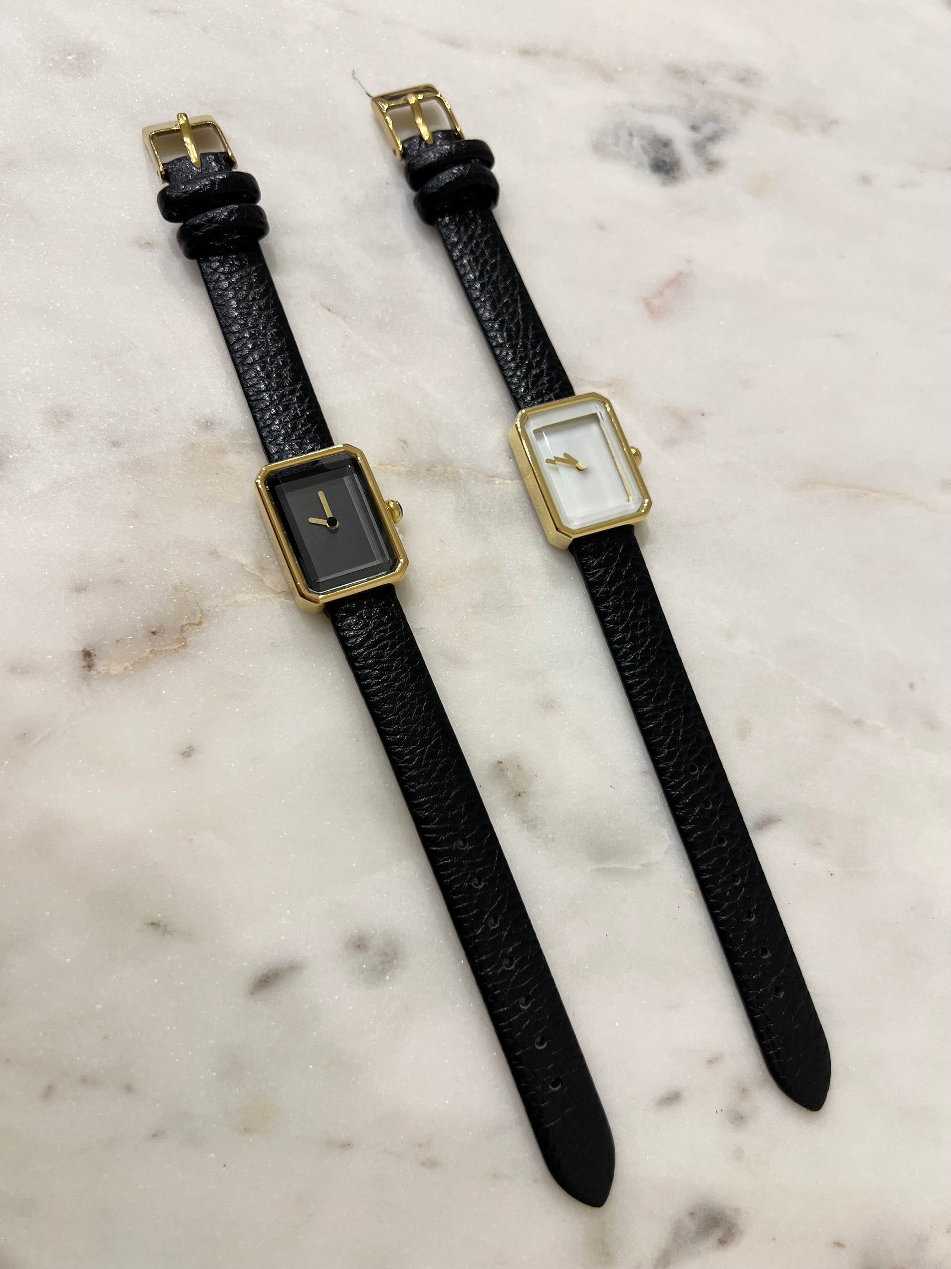 Gold tone hardware with black leather strap