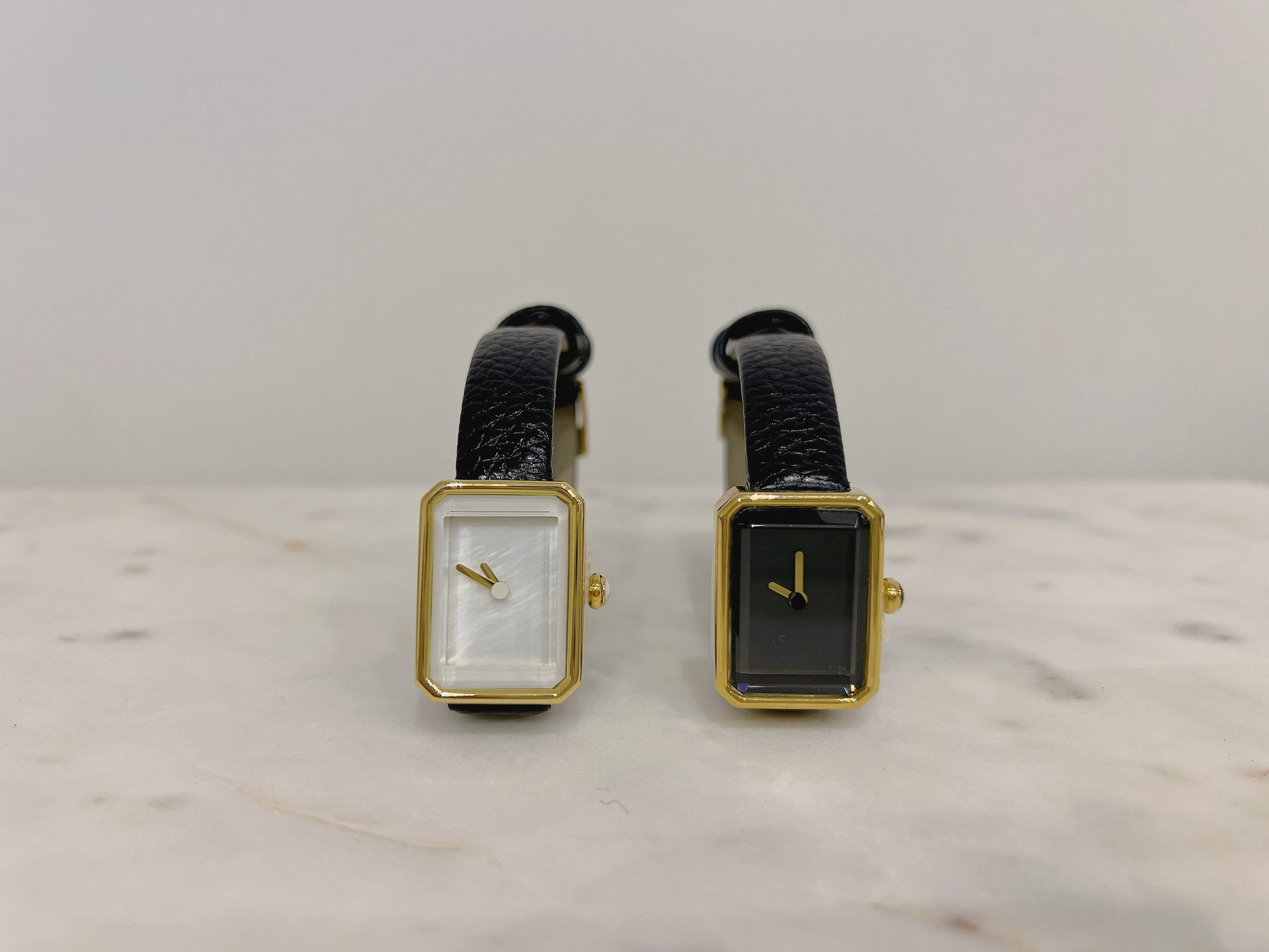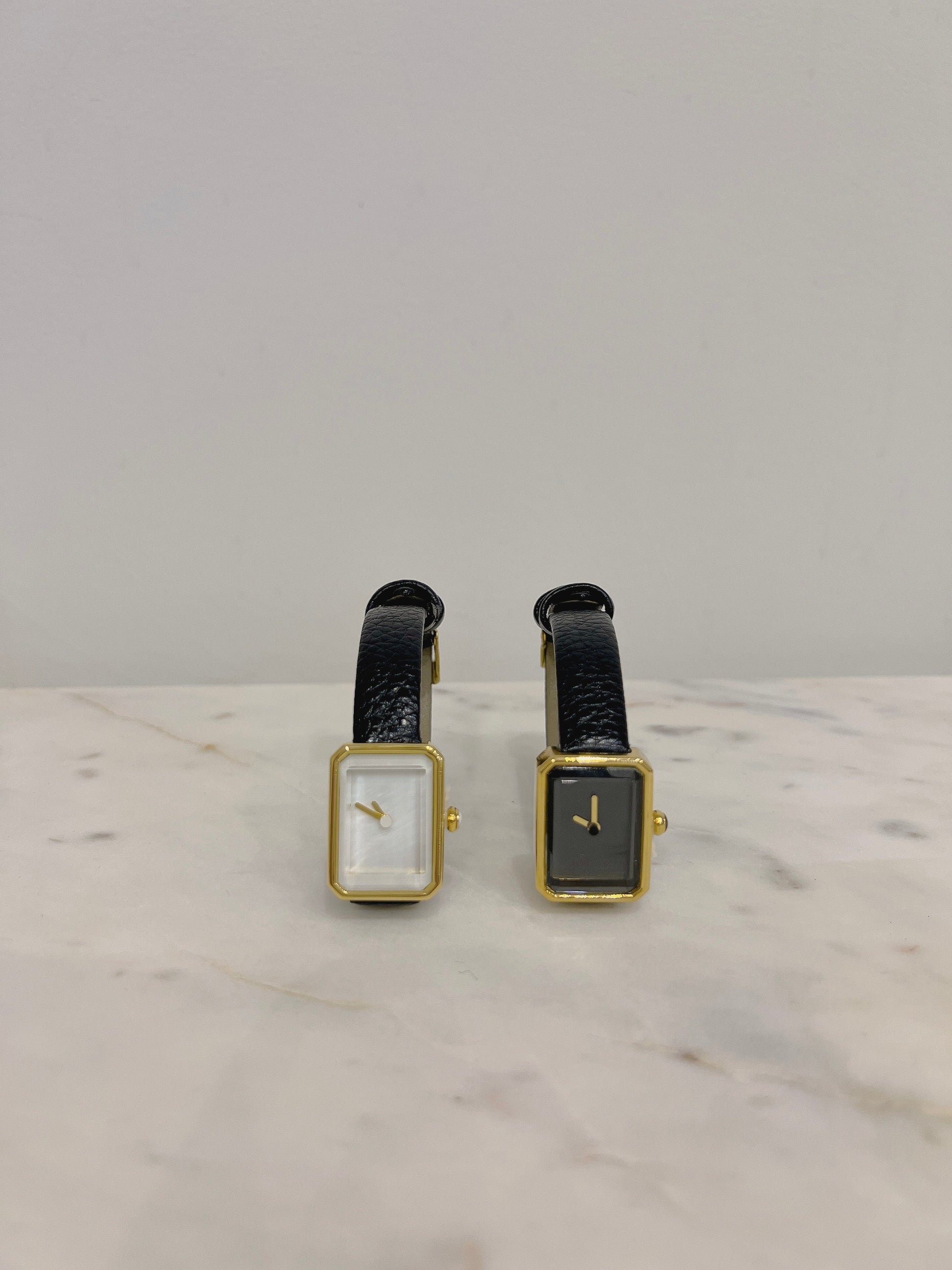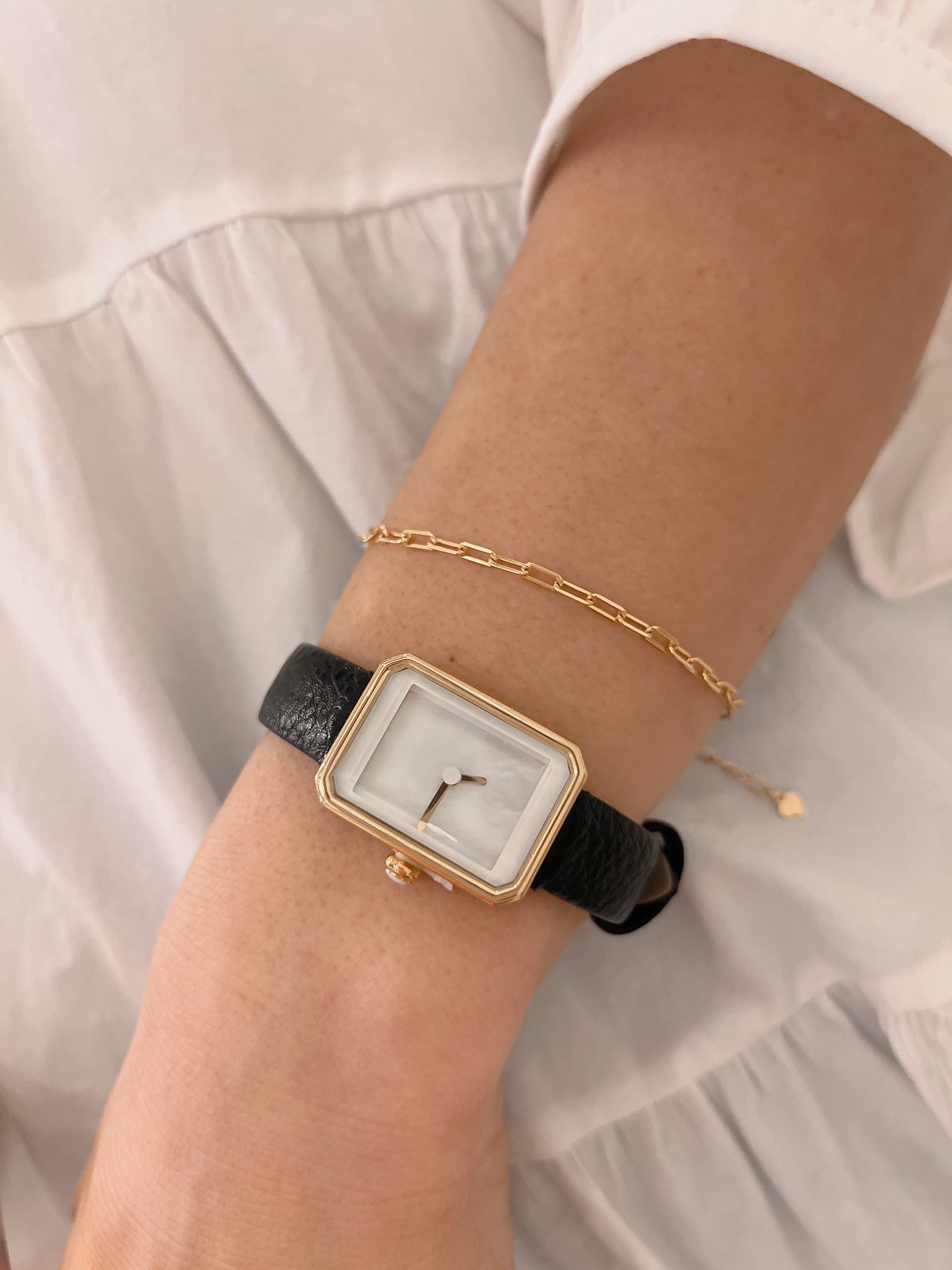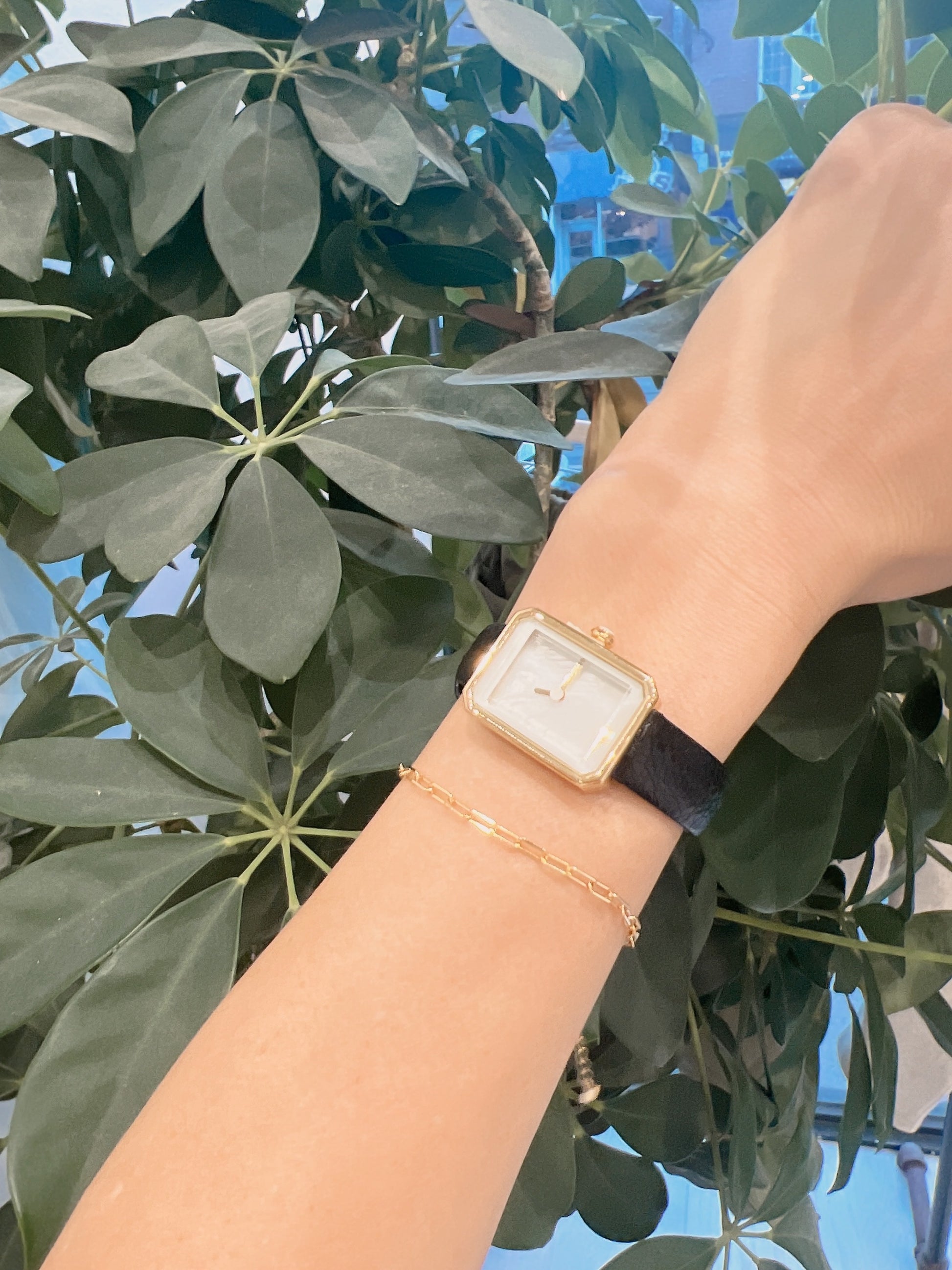 Gold tone hardware with black leather strap