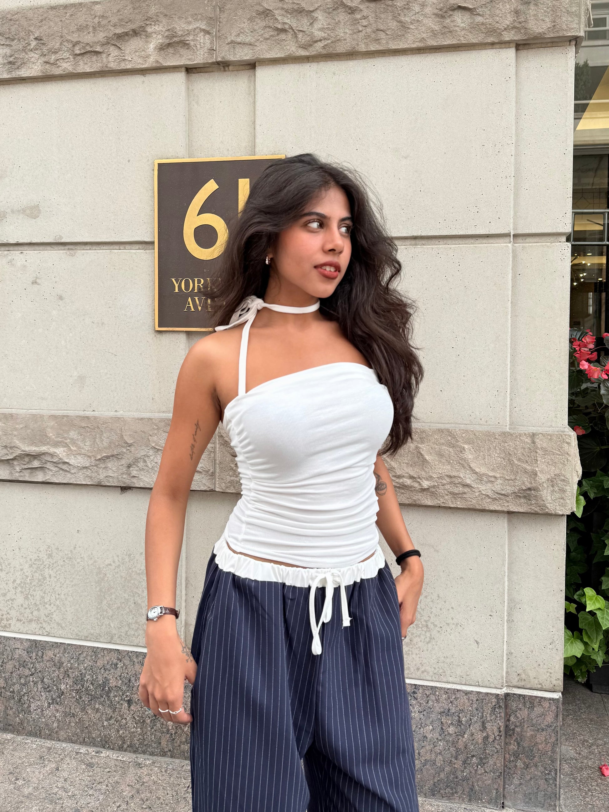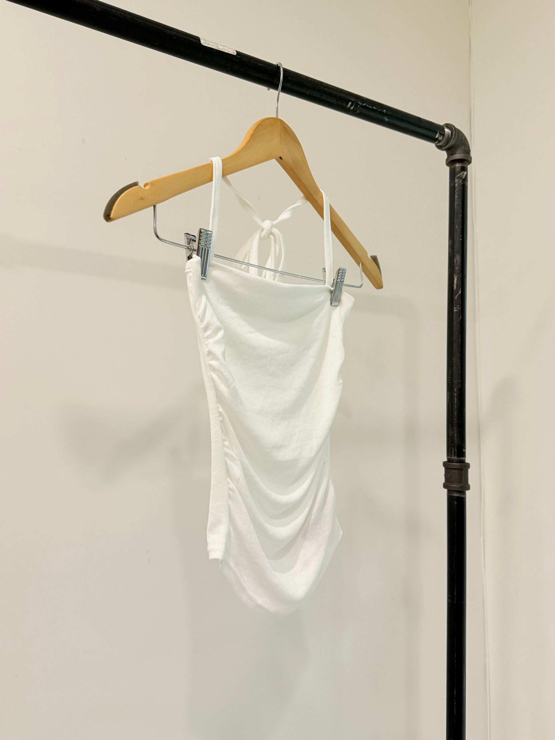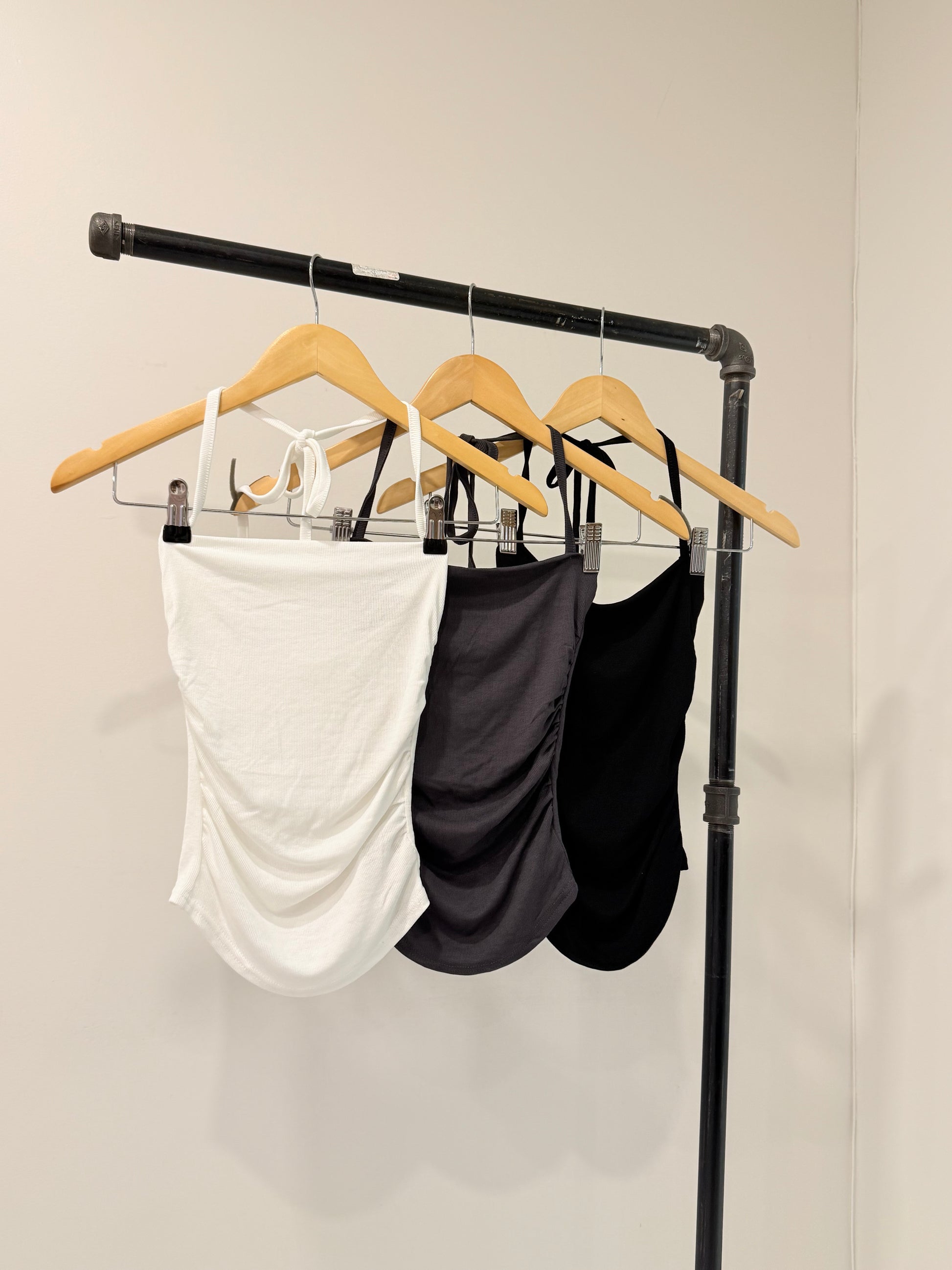 We love a simple fitted top that hugs in all the right places; and this ribbed gem delivers. She’s simple but stunning, with all-over ribbing, ruched sides, and soft-as-clouds fabric. The thin tie-up noodle straps sit just right, paired with a bandeau-style neckline that’s a total no-brainer combo. Available in black or white—because you can never go wrong with the classics.