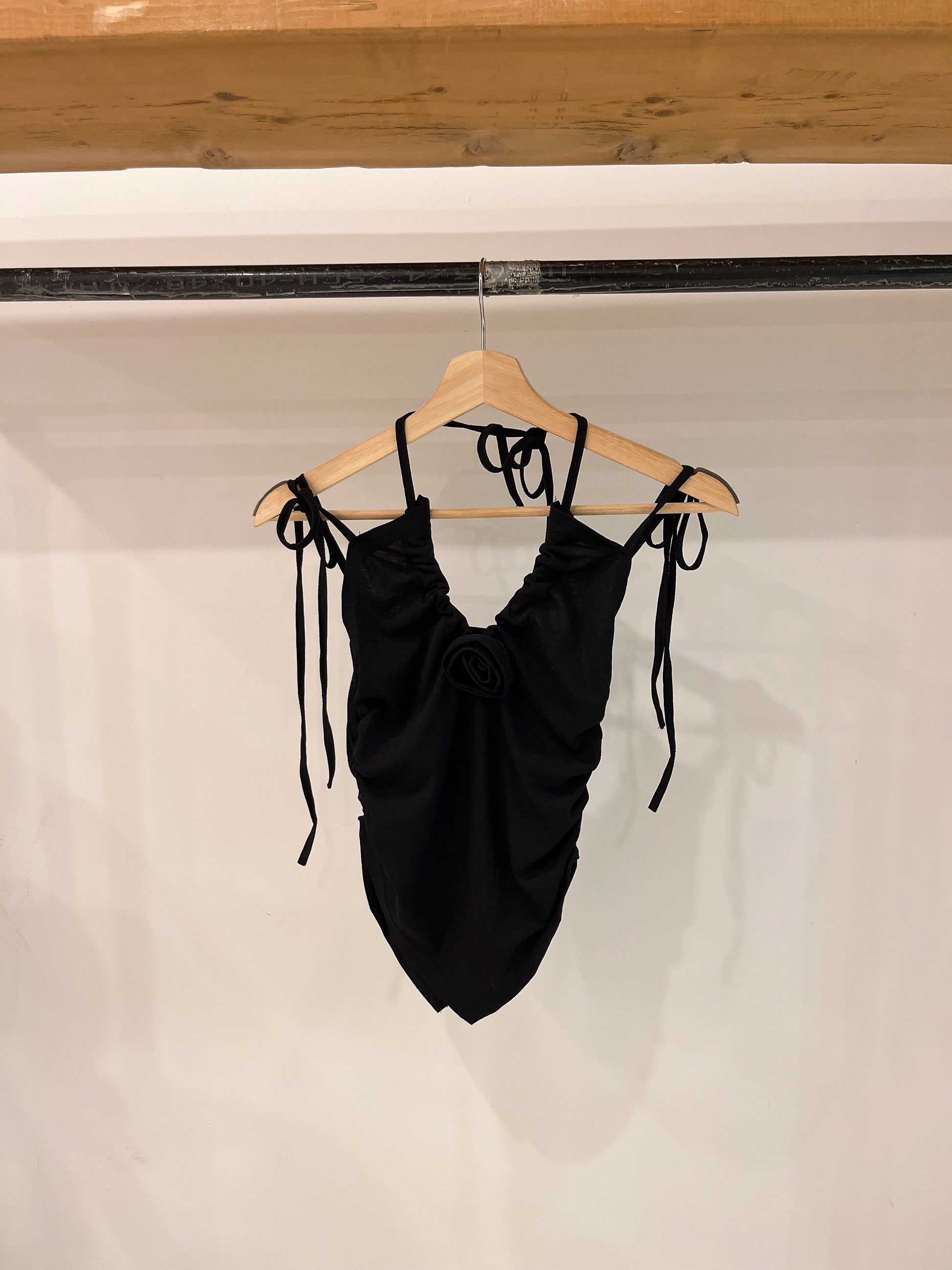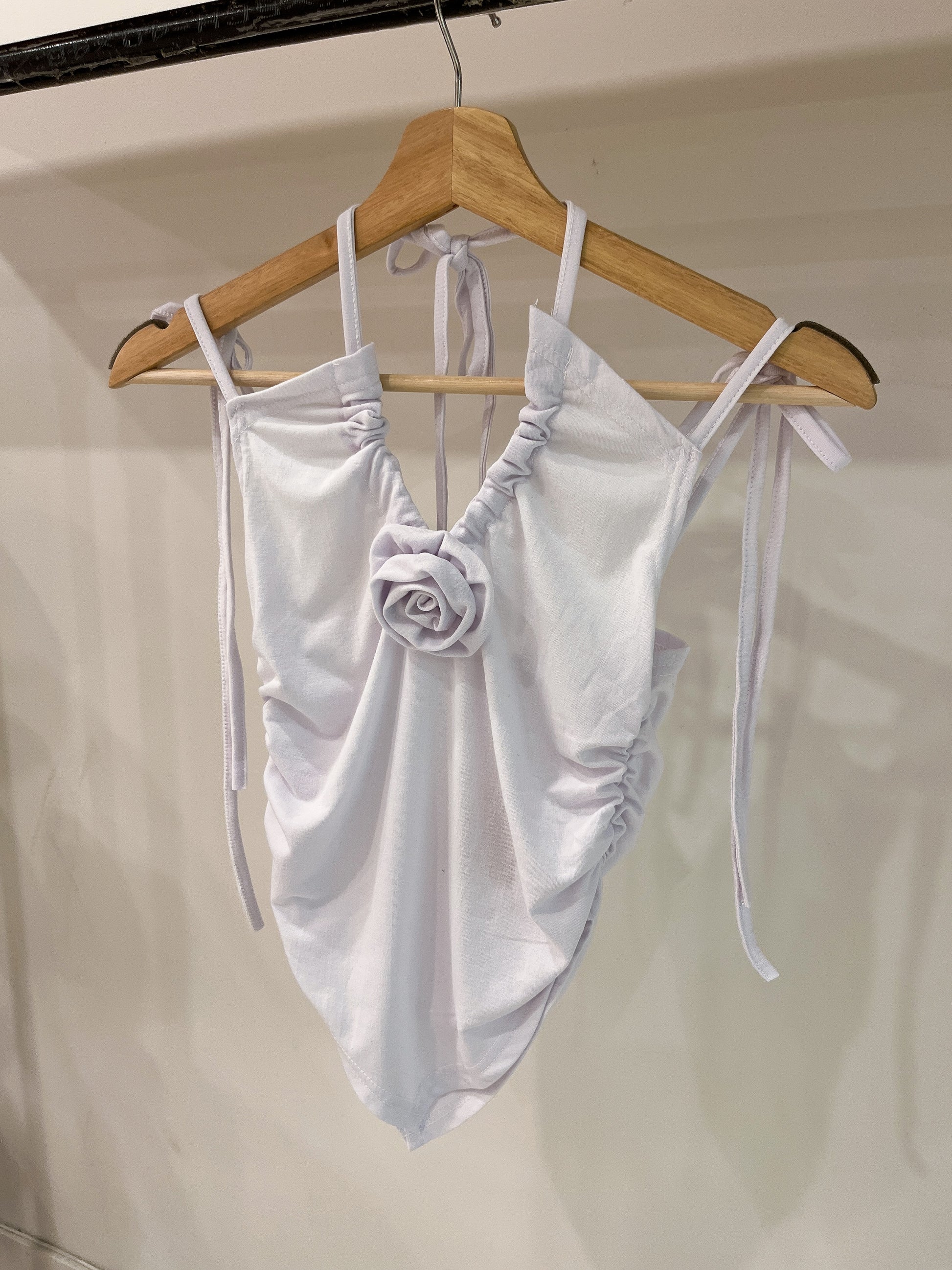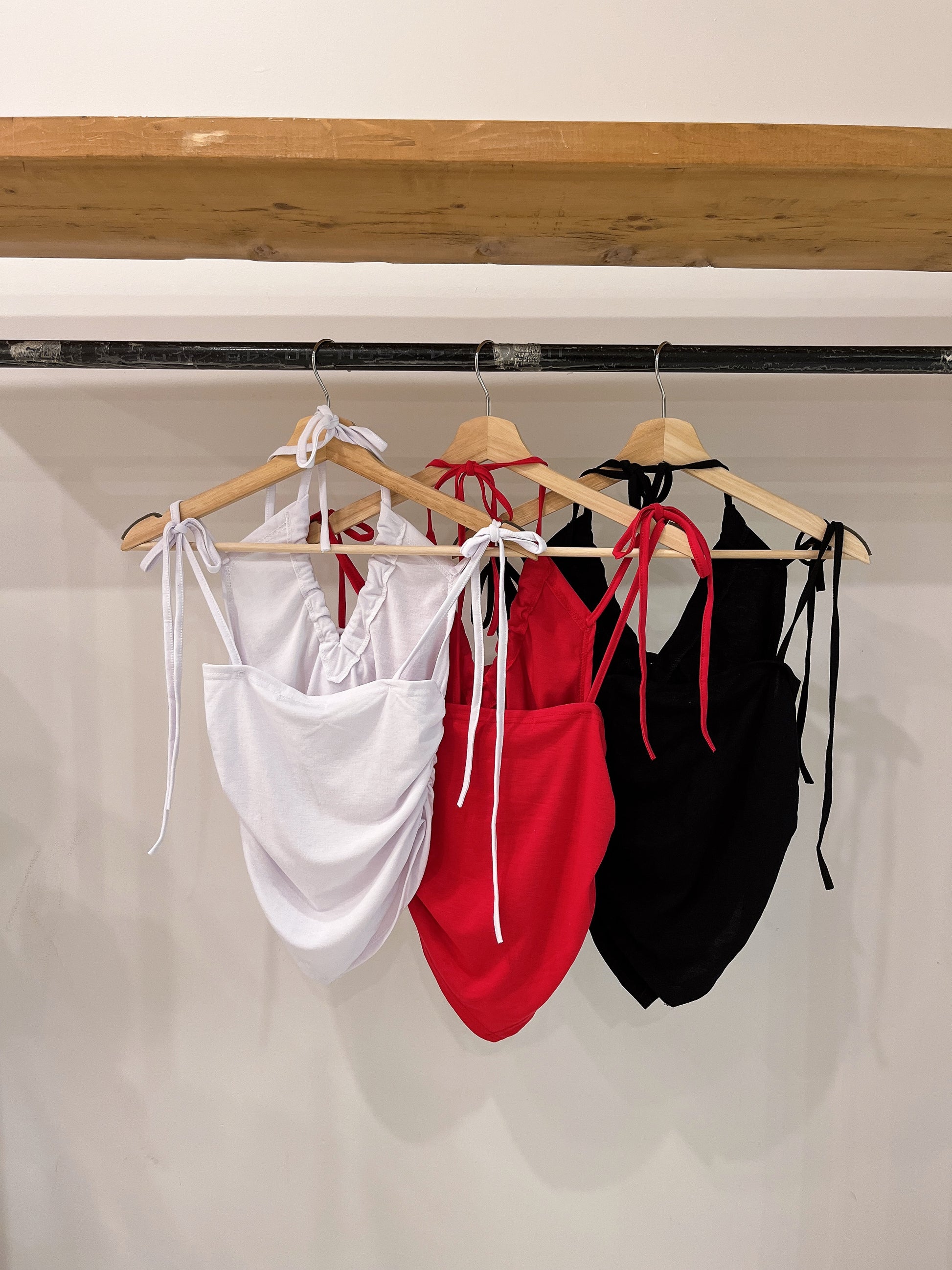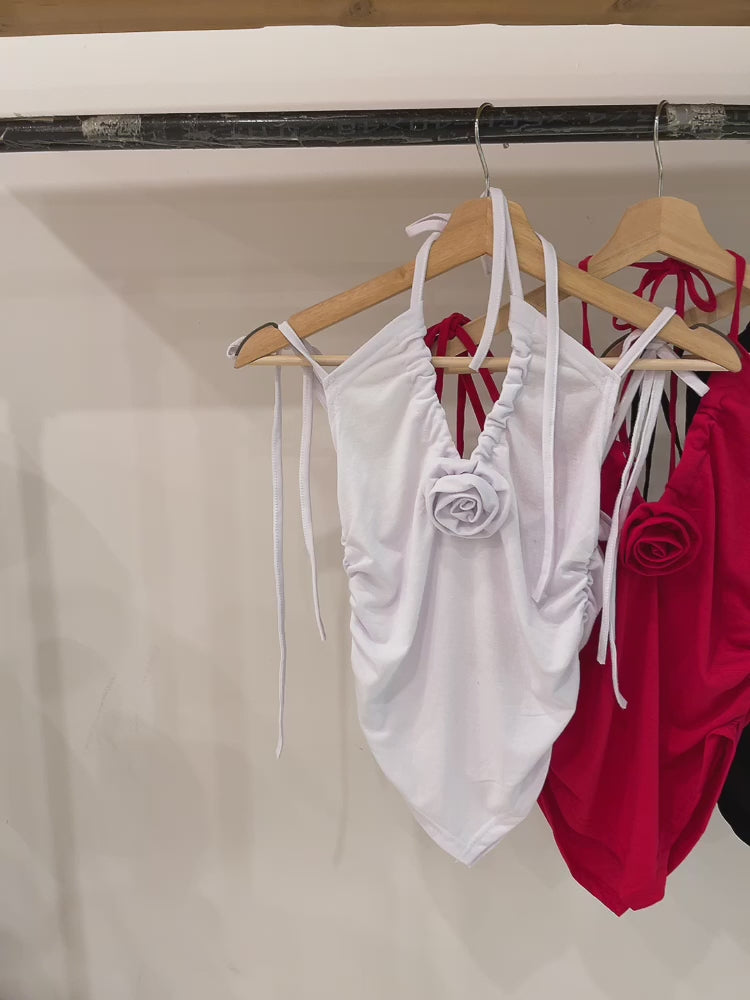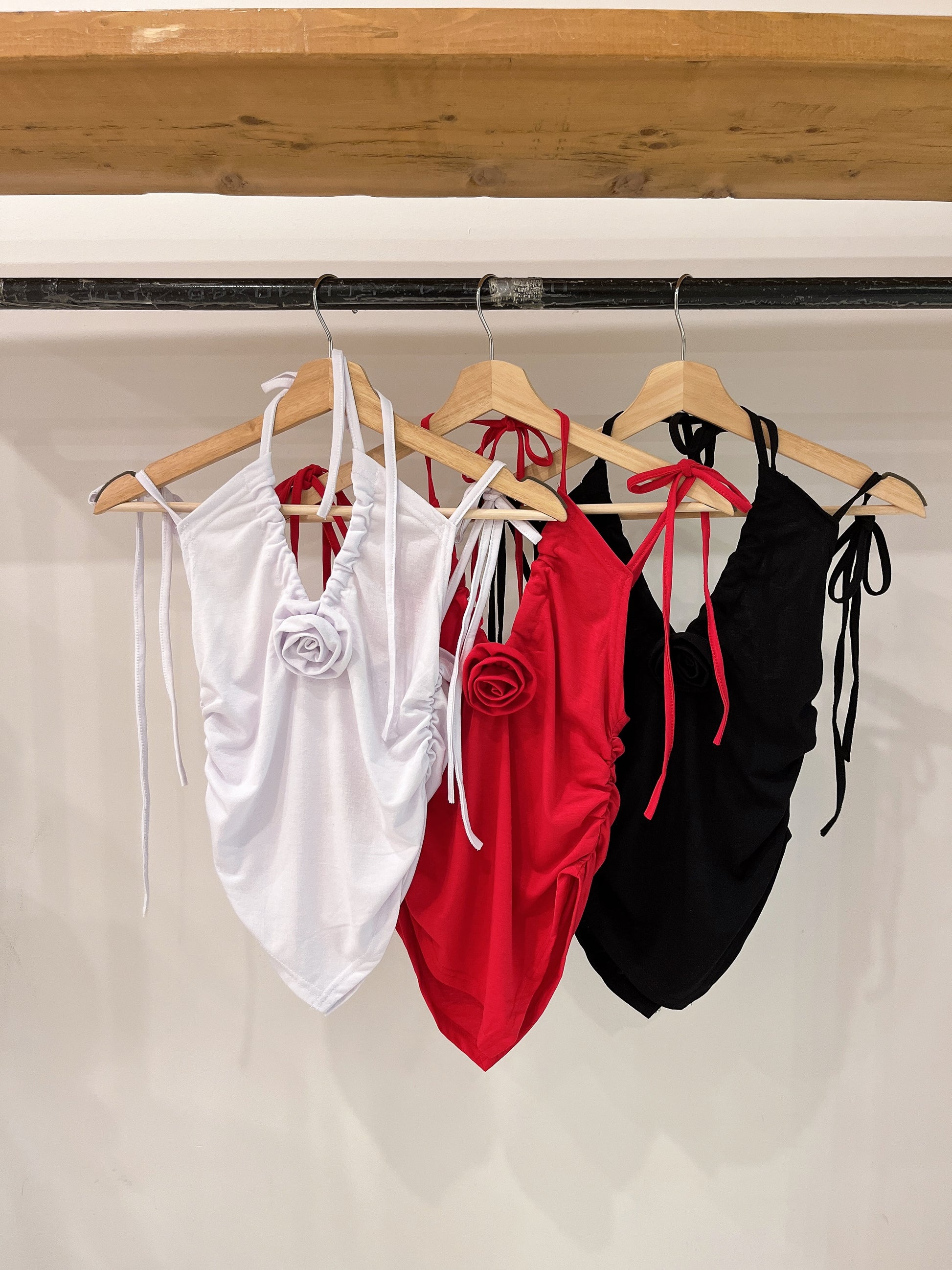 Quirky and super fun, our gorgeous "BEVEL" top features a pointy handkerchief hem, ruched sides for a fitted look, double tie up strings and a dainty detachable 3D rose pin! This stylish number is now available in Red, Black and White!