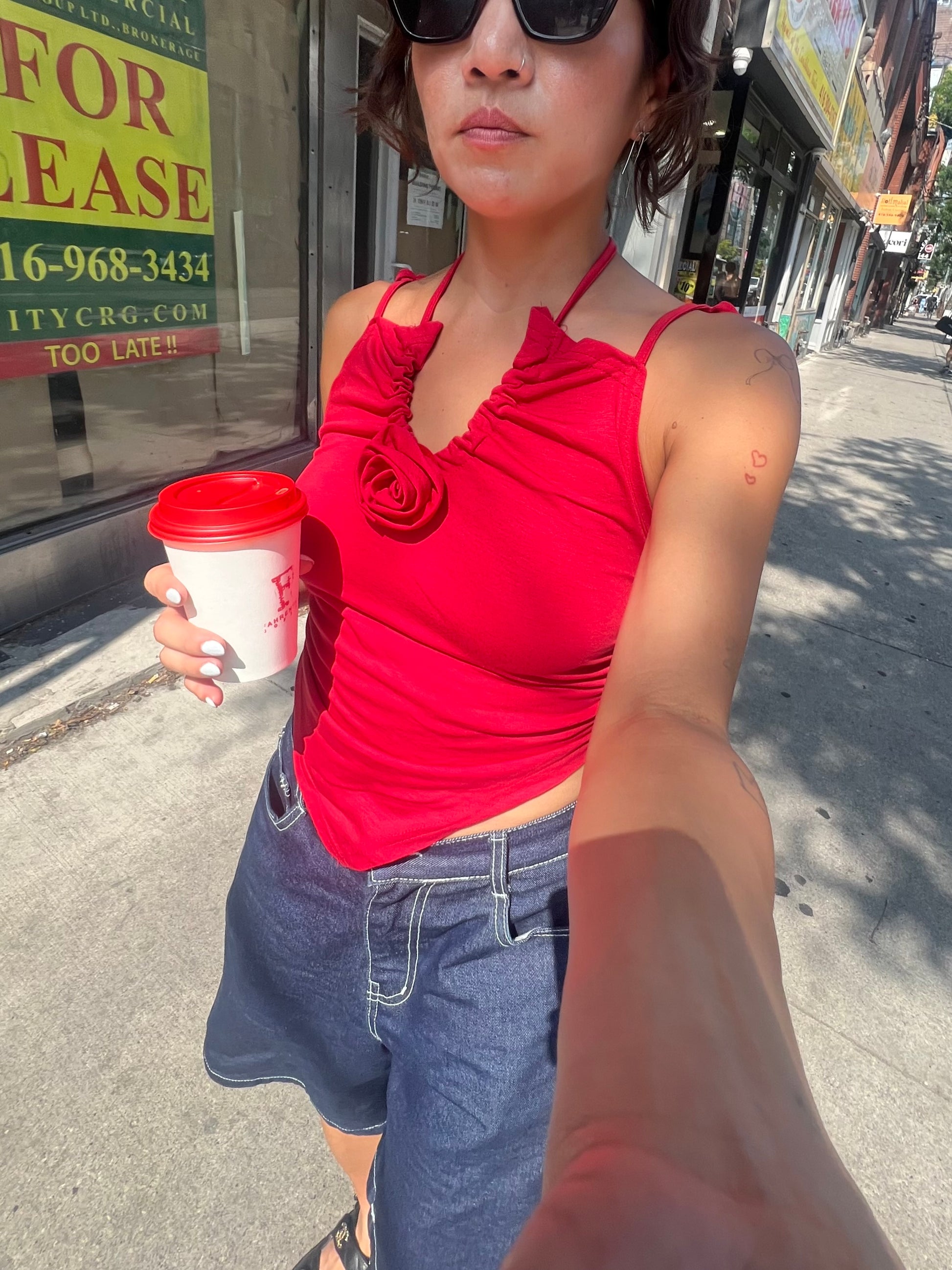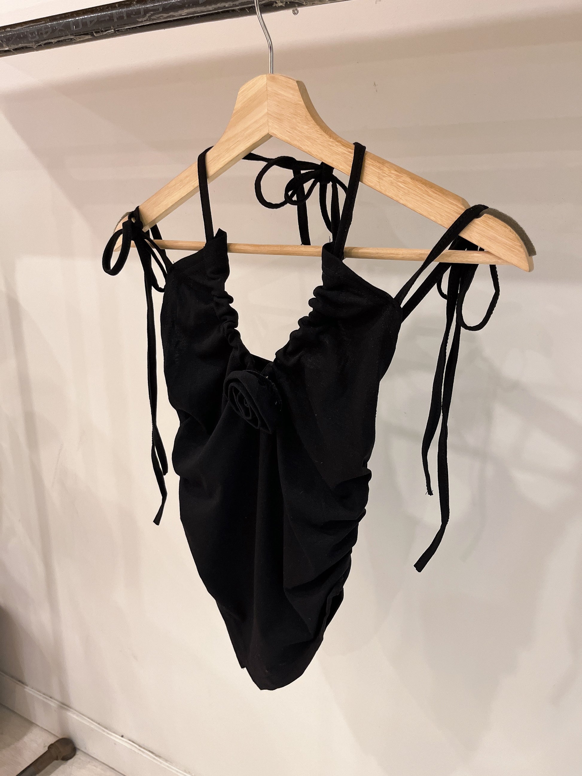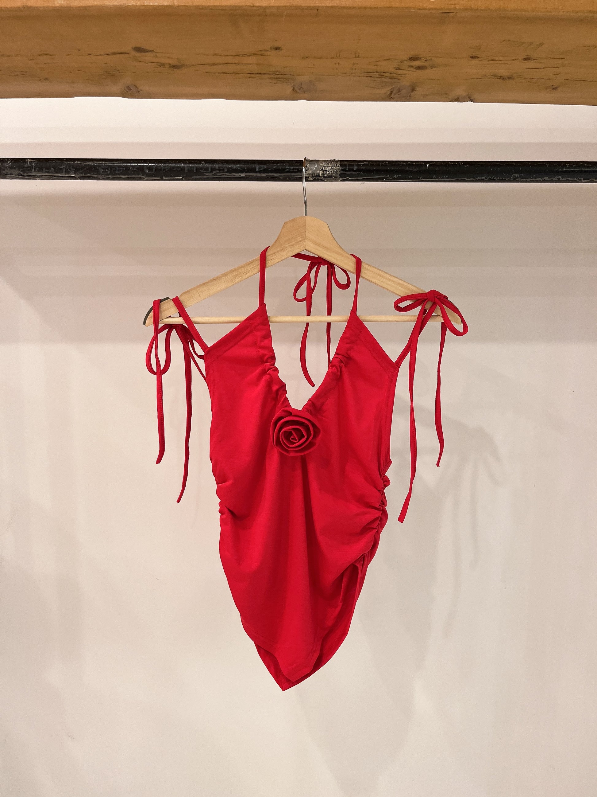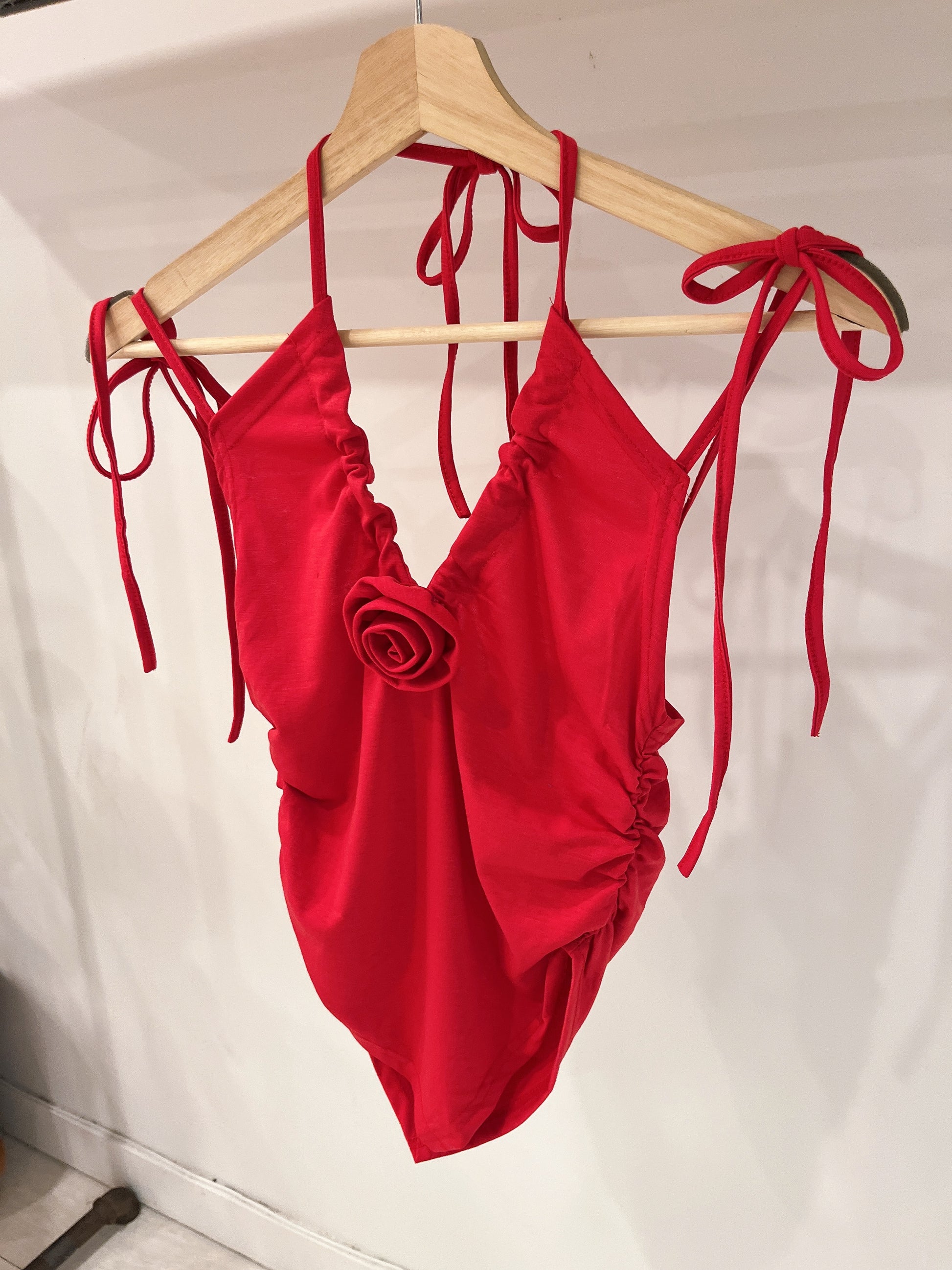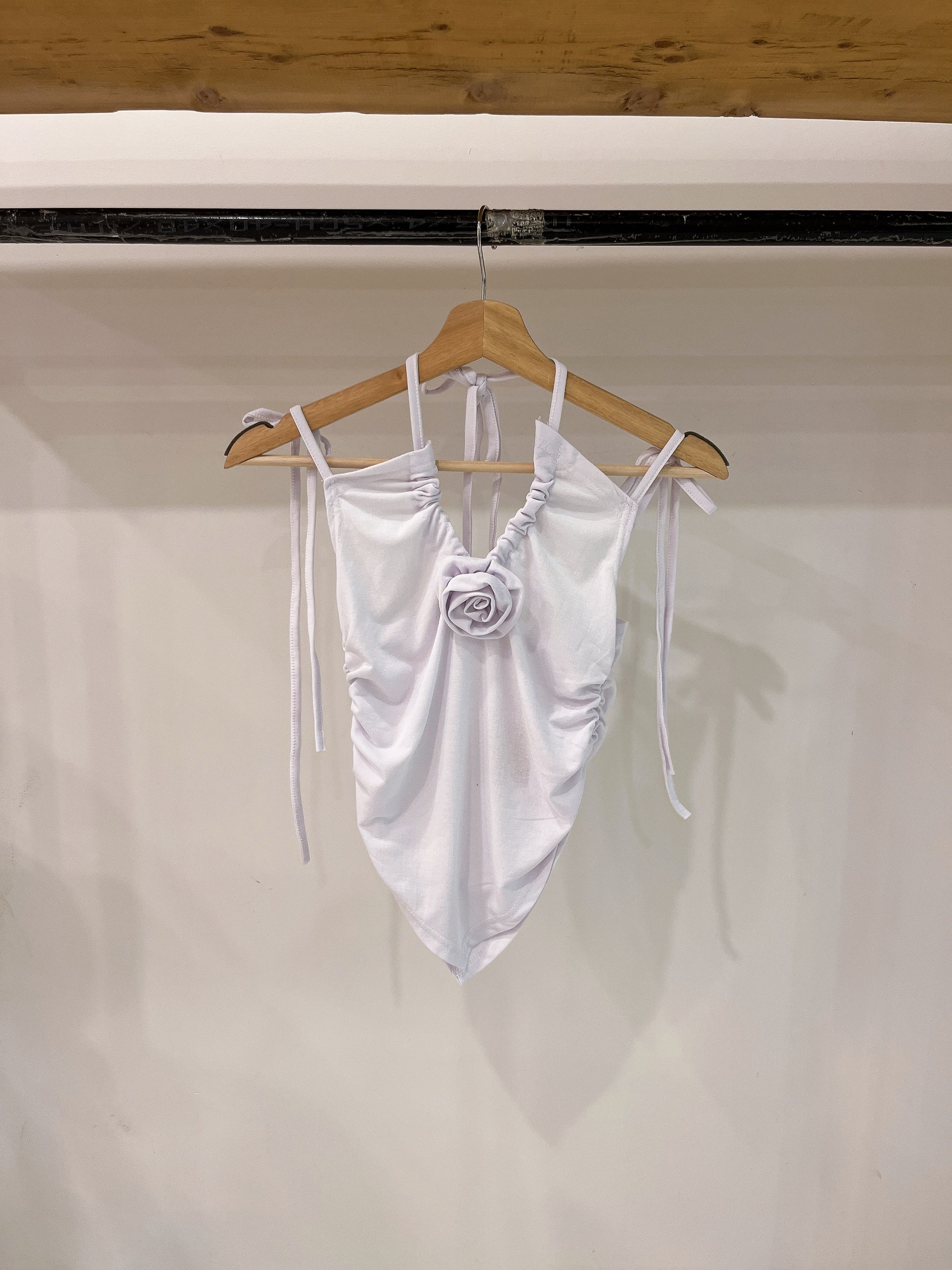 Quirky and super fun, our gorgeous "BEVEL" top features a pointy handkerchief hem, ruched sides for a fitted look, double tie up strings and a dainty detachable 3D rose pin! This stylish number is now available in Red, Black and White!