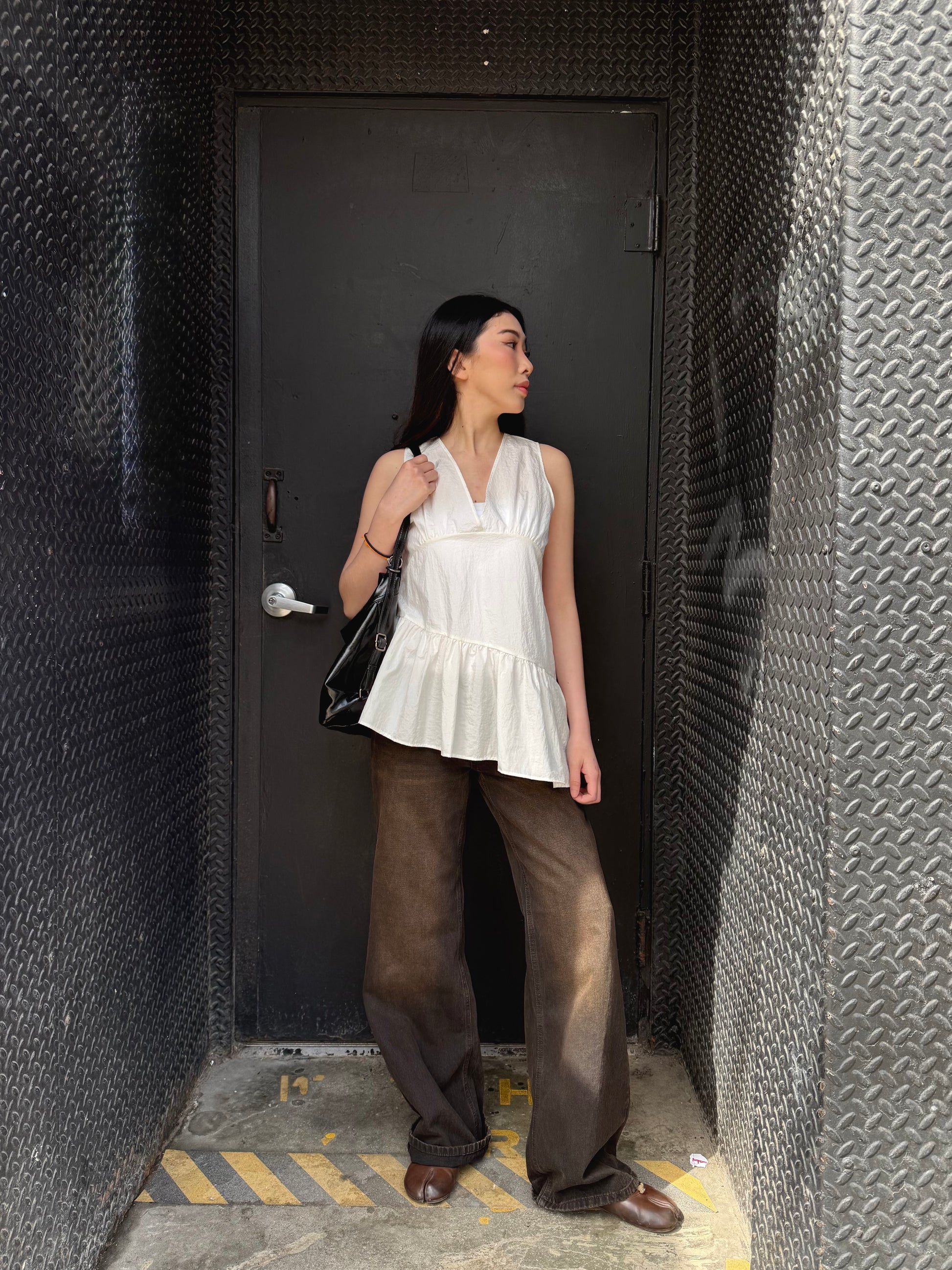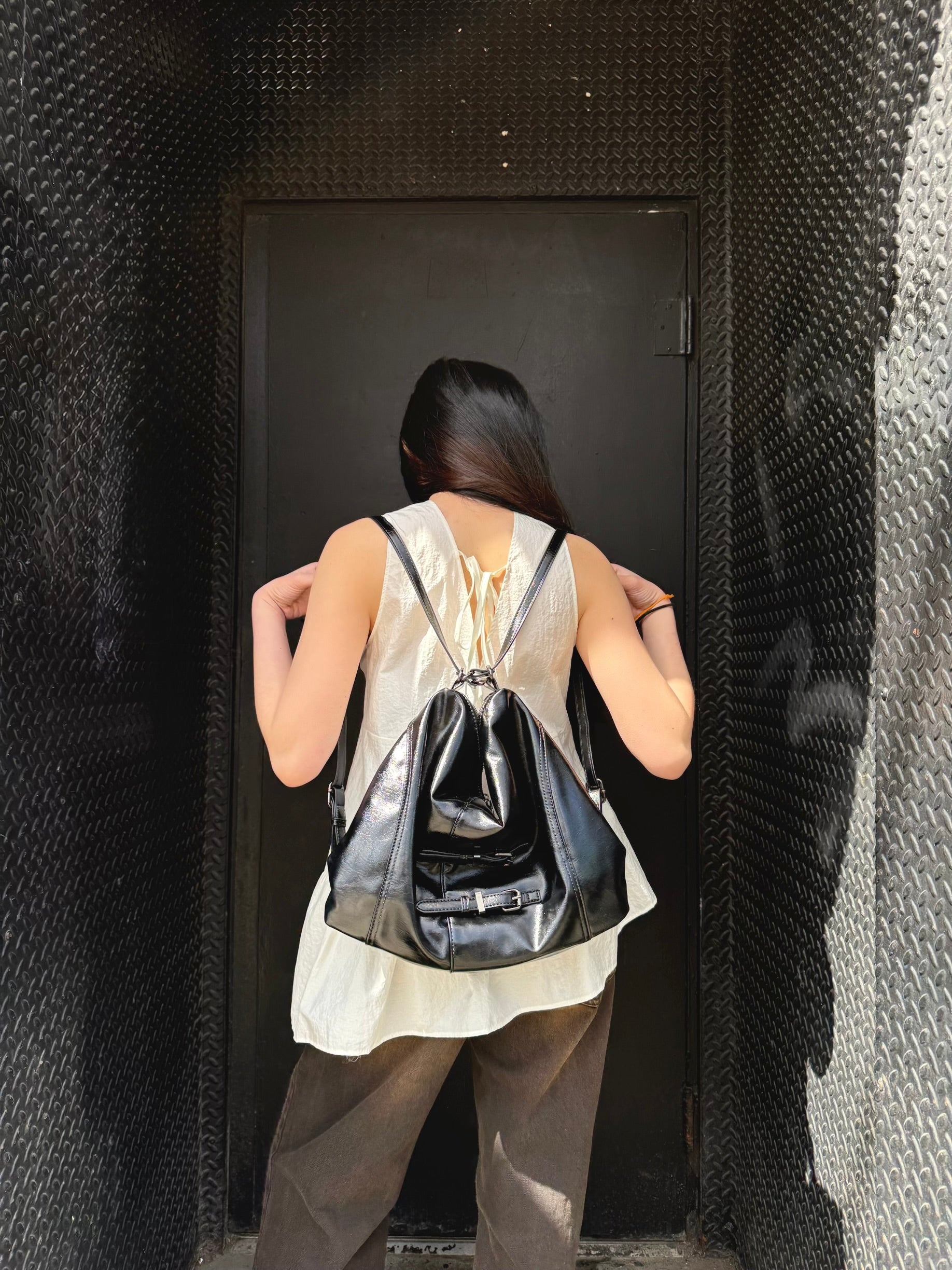 Sporting a high-gloss patent finish that's shinier than a fresh glaze. Its mechanical soul lies in the super practical strap system that toggles between a balanced backpack and a cool, slouchy shoulder bag in approximately three seconds. Handpicked from Seoul, it's the ultimate overachiever for anyone who can't decide if they're heading to a lecture or a rooftop bar.