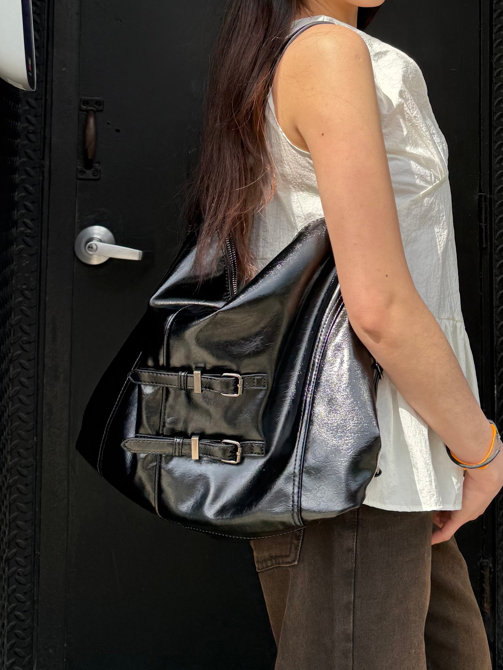 The bag features a wide-base hobo silhouette with dual-buckle silver hardware that adds practicality to its polished exterior. Crafted with a weather-resistant sheen, this piece provides enough volume for your essentials while maintaining its structural cool. Super versatile and ready to be worn your way.