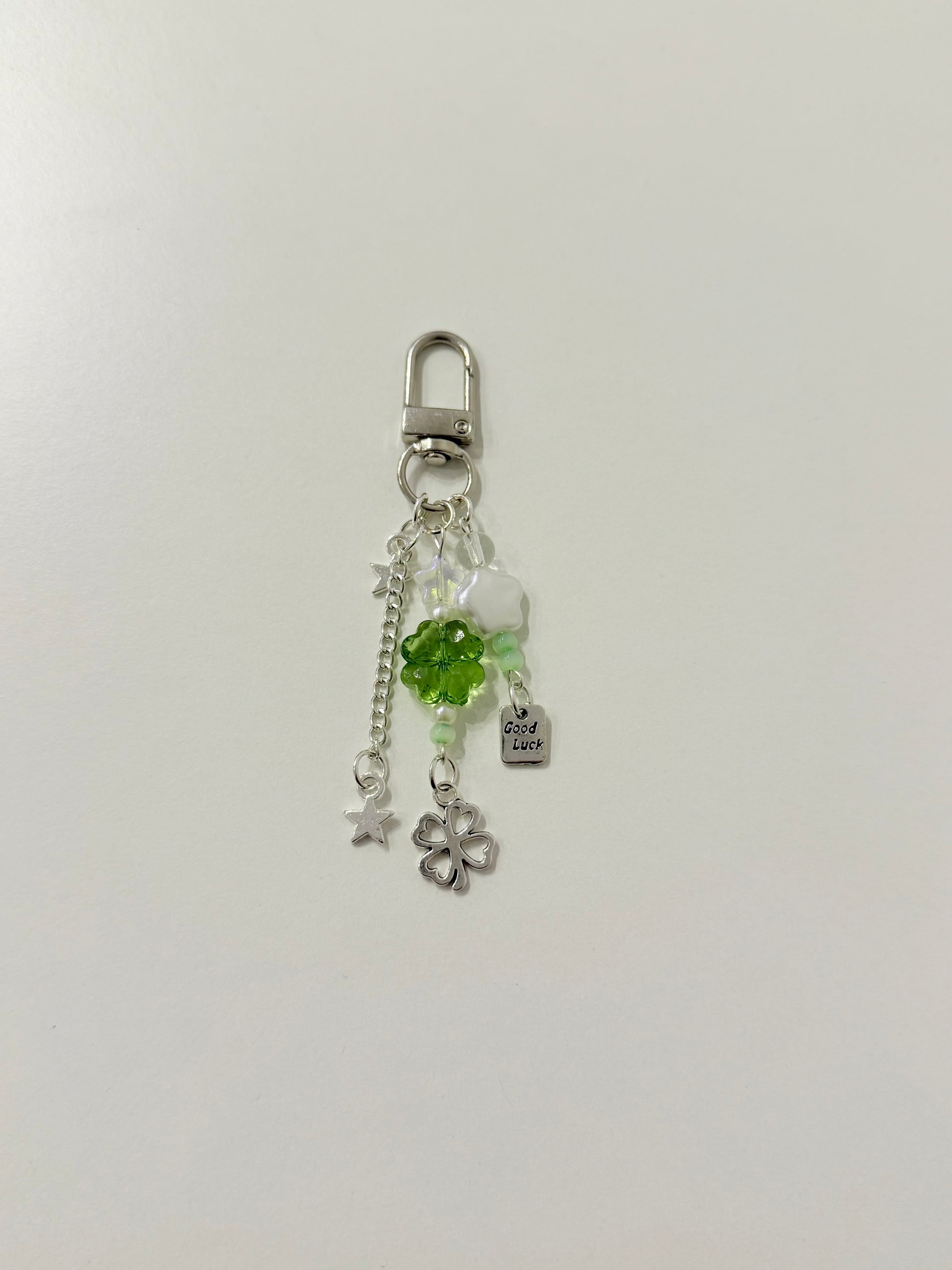 CLOVER a shiny, clear beaded bag charm made to bring you a touch of good luck wherever you go!
