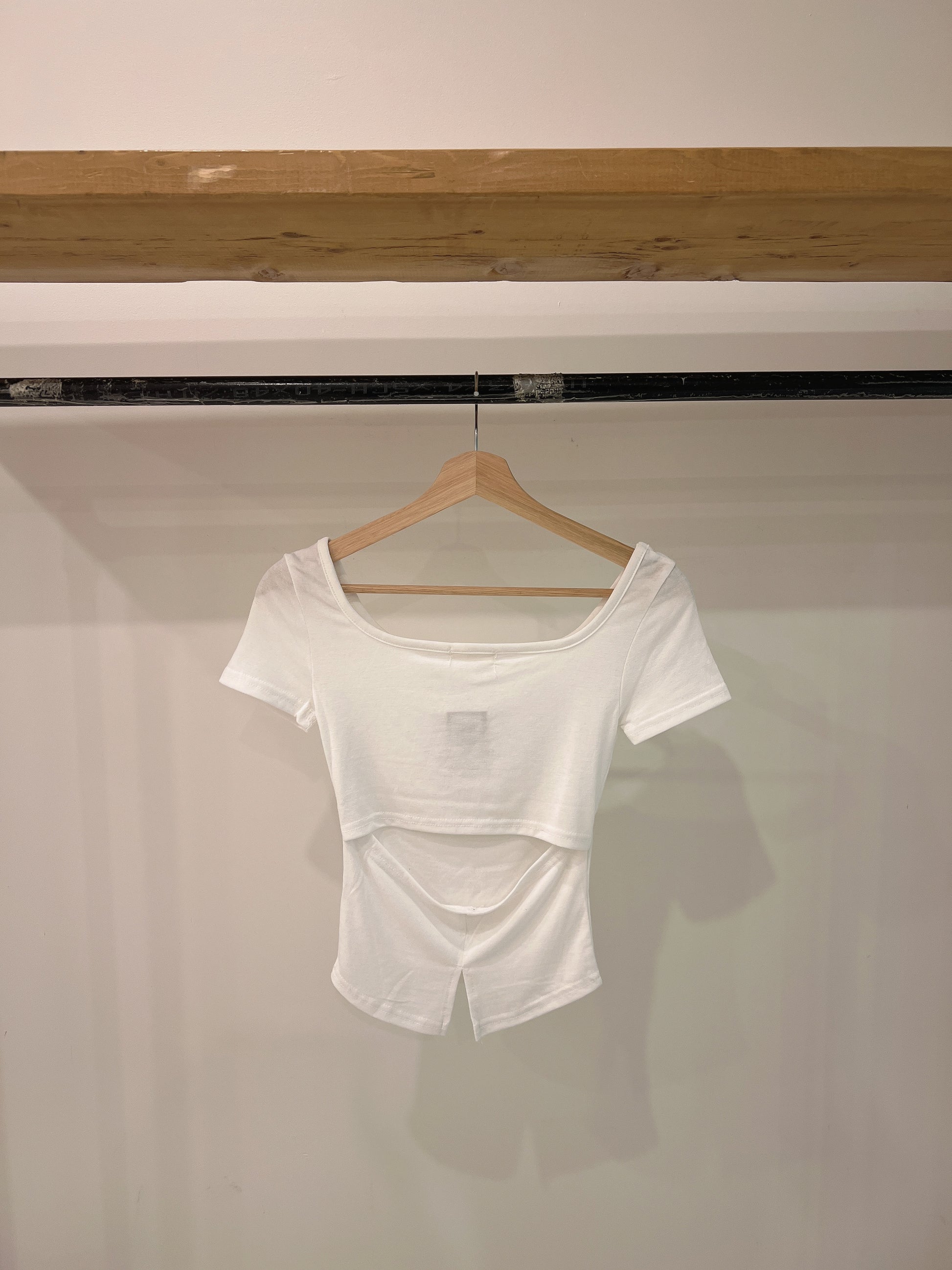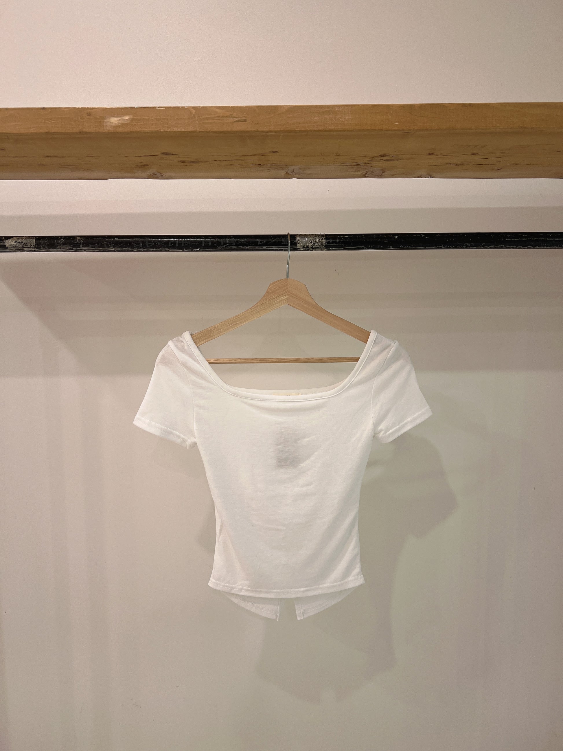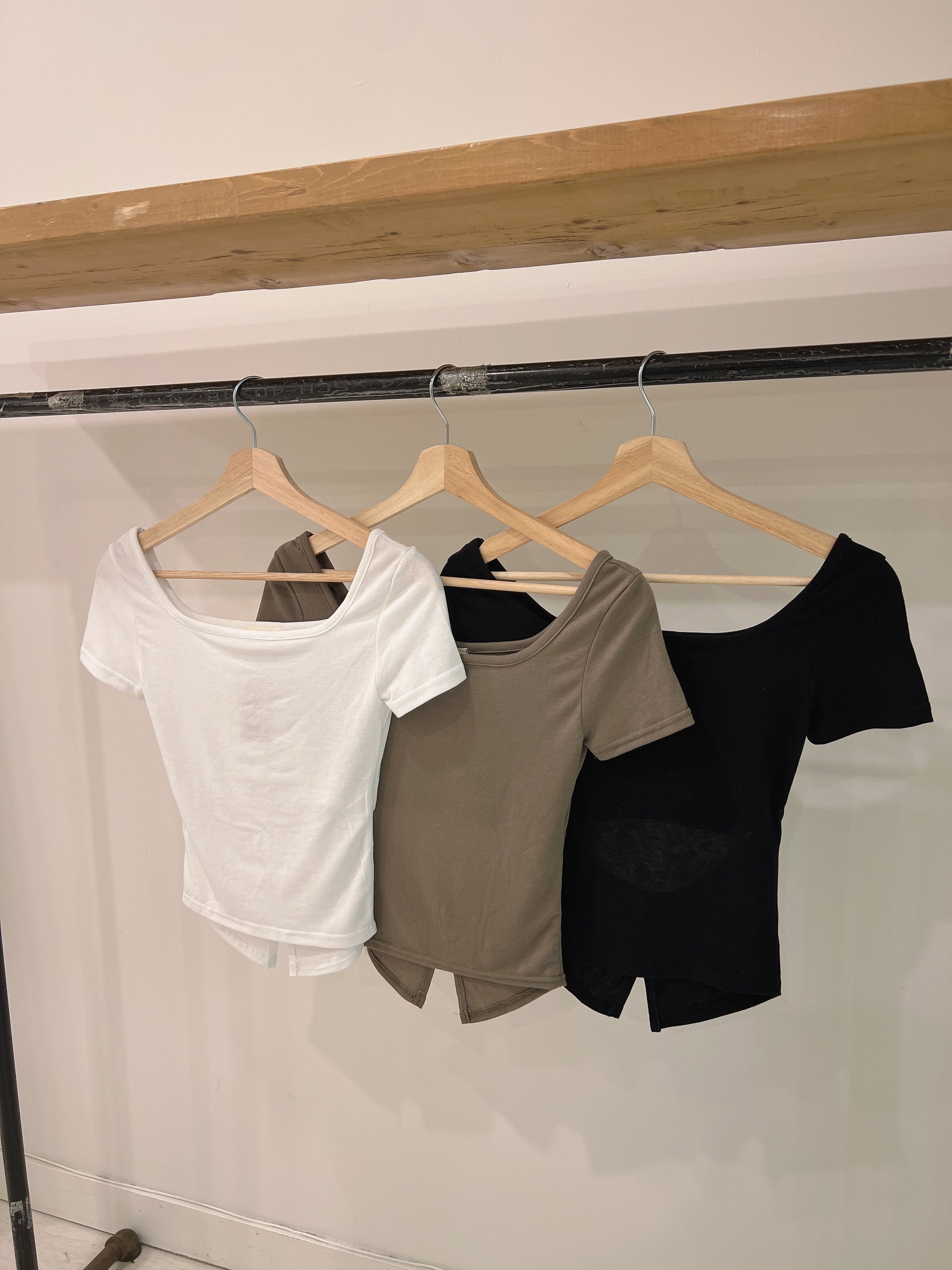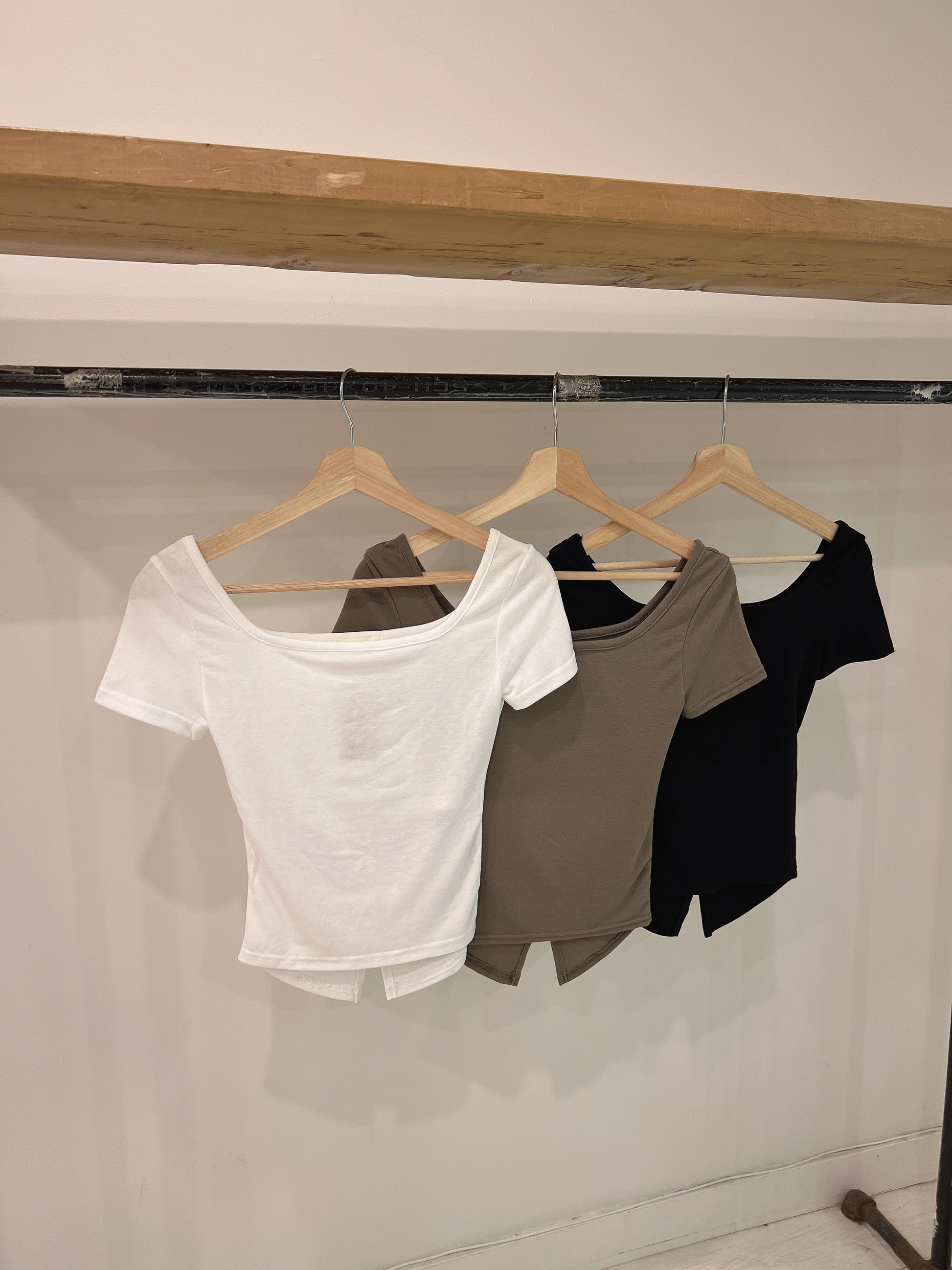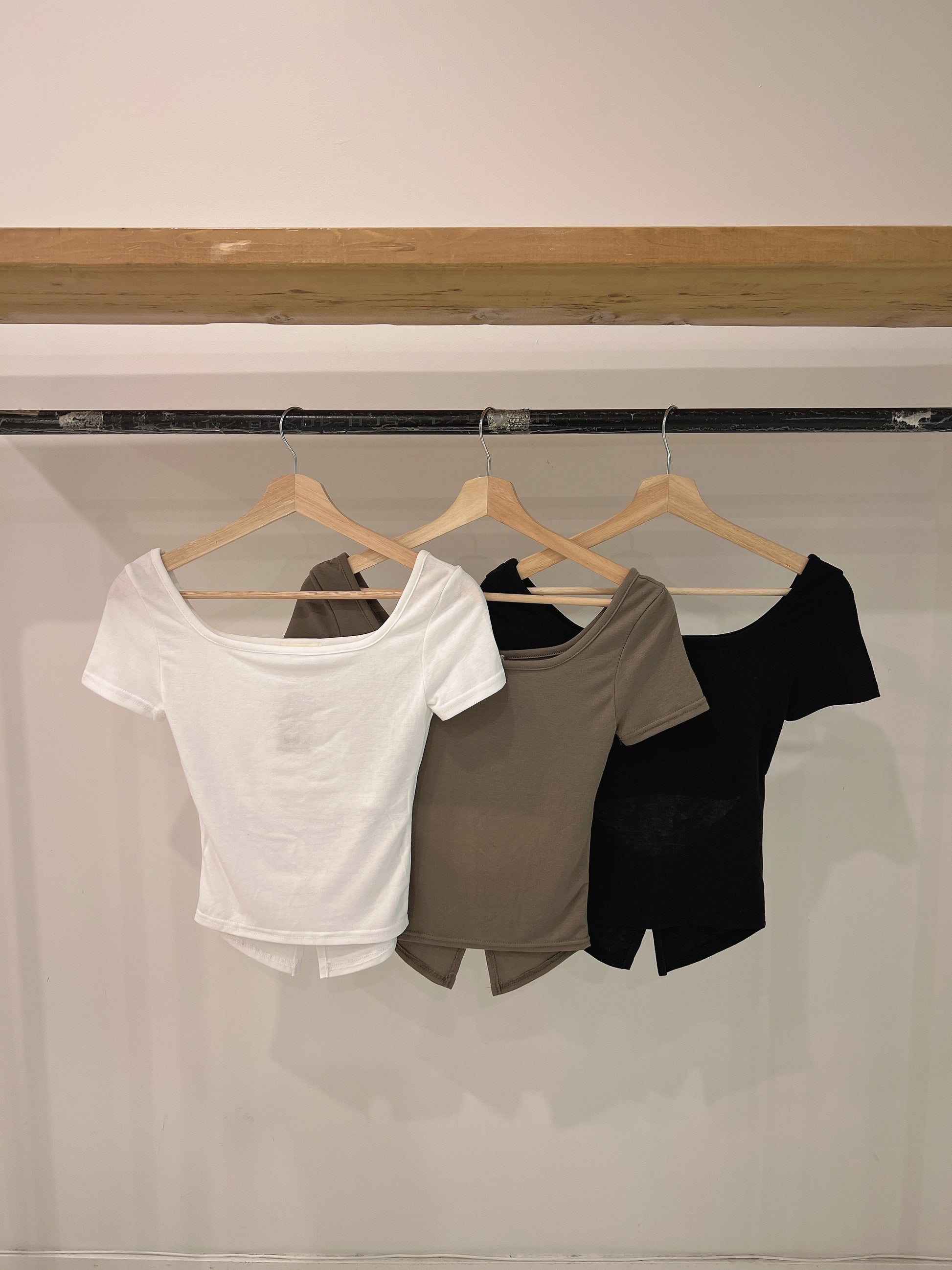 Our super soft scoop neck short sleeve tee with split back and back cut out detail comes in black, white and green and is an effortlessly stylish pick for a fitted look this summer!