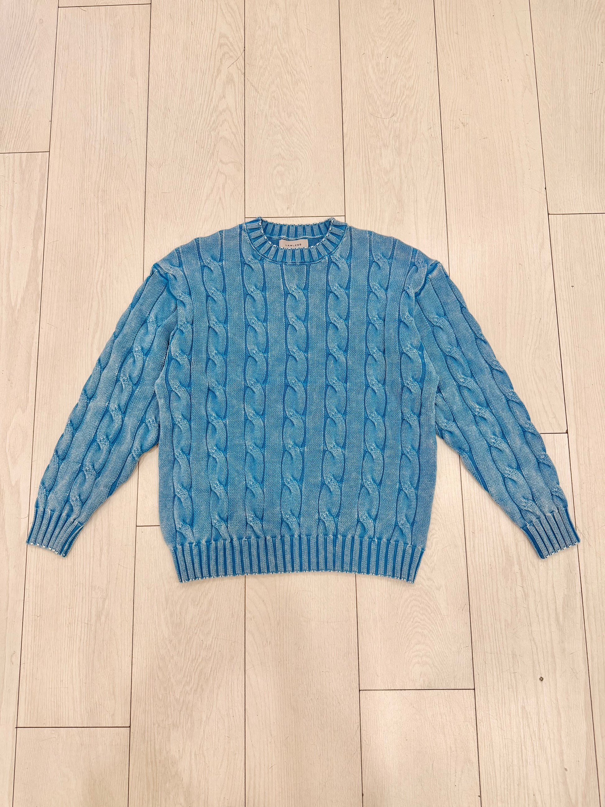 Bringing the bright neon era back, with softness and sophistication. This oversized cable-knit sweater features a round ribbed neckline, ribbed cuffs and hem, and a beautifully textured cable-knit design. Cozy, warm, and full of character. Available in neon pink, green, and blue.