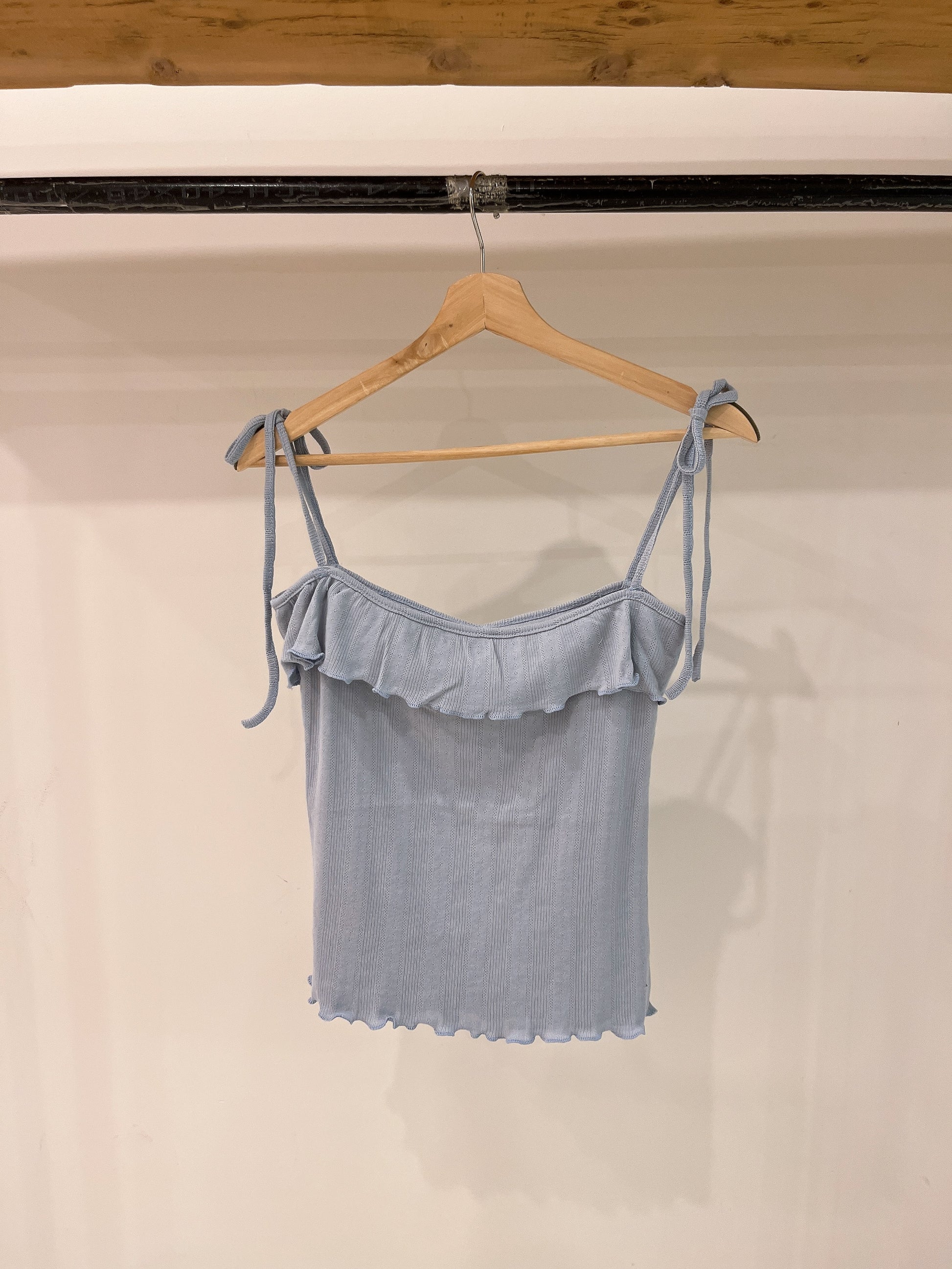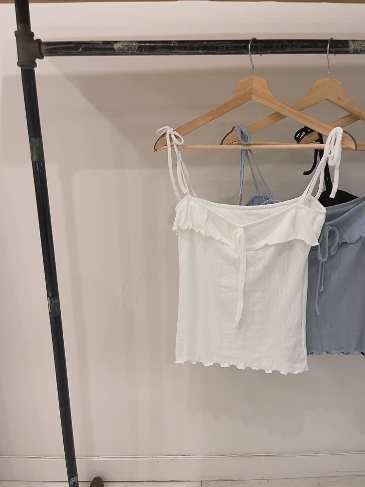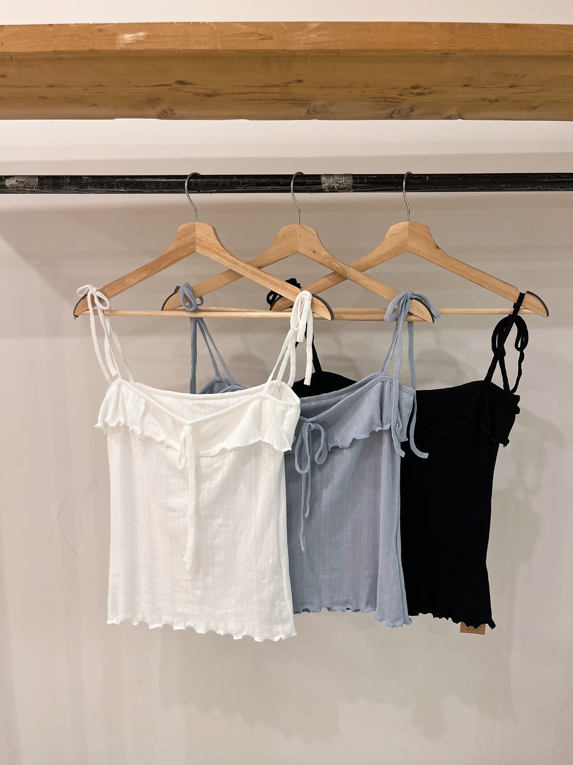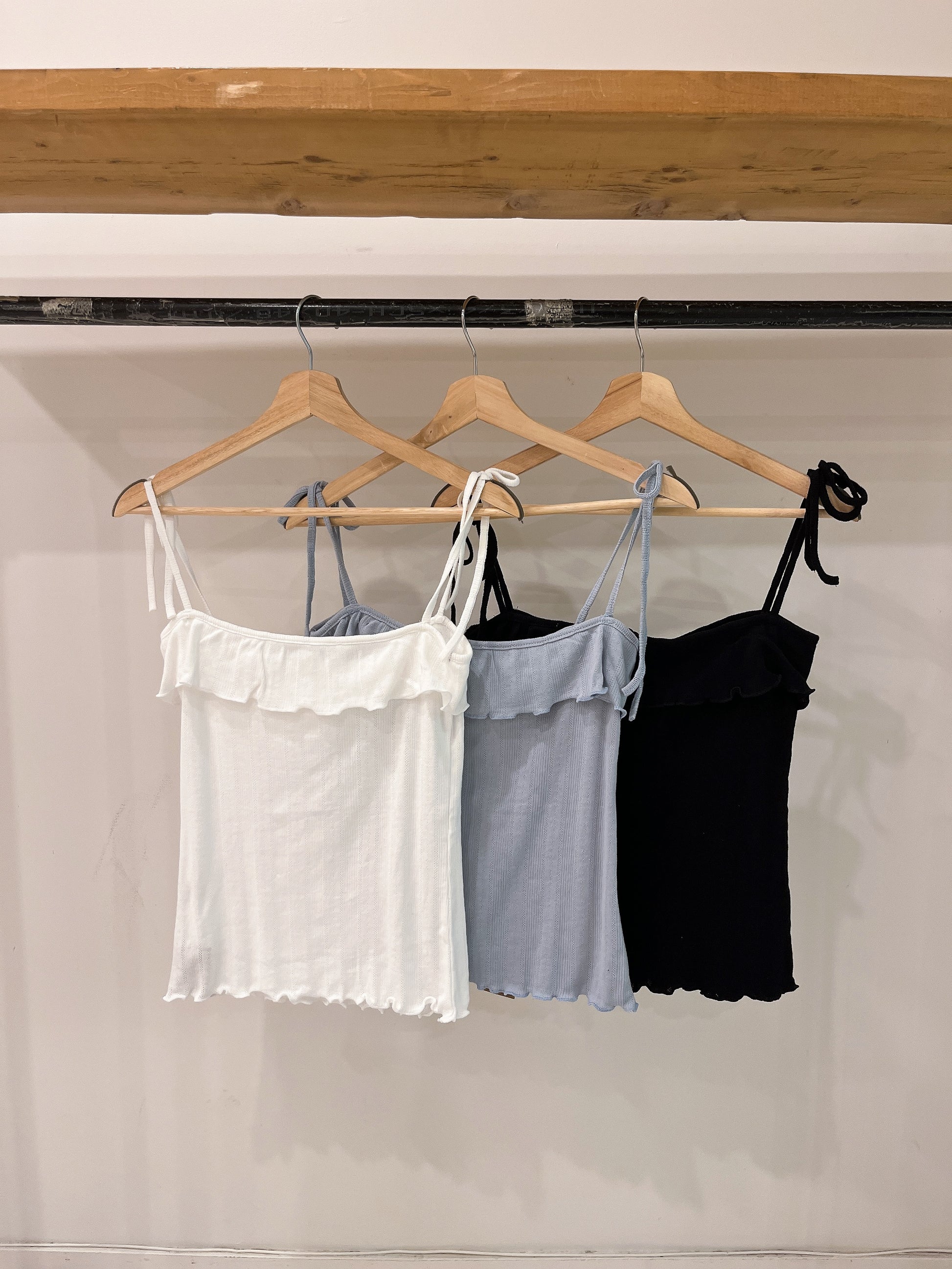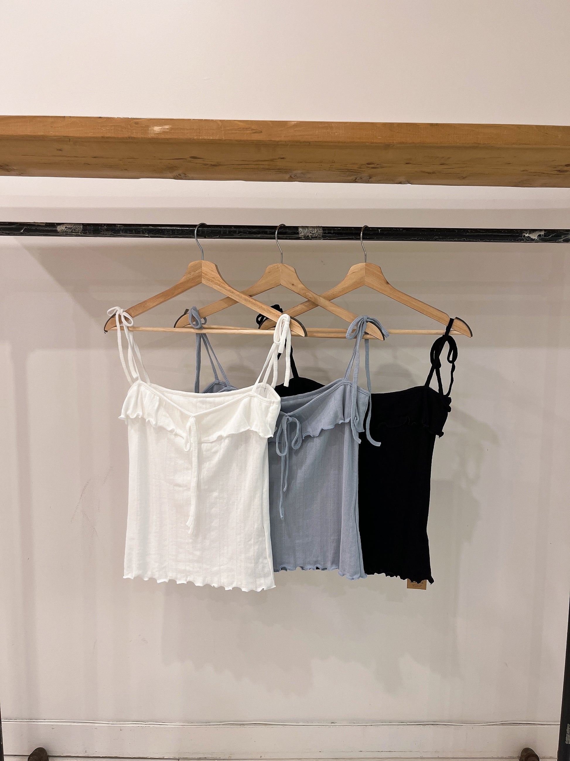 Our super cute, relaxed fit ruffled tank top with adjustable tie straps, front tie detail and a ruffled hemline. Feel the feminine ease in Blue, white or black.