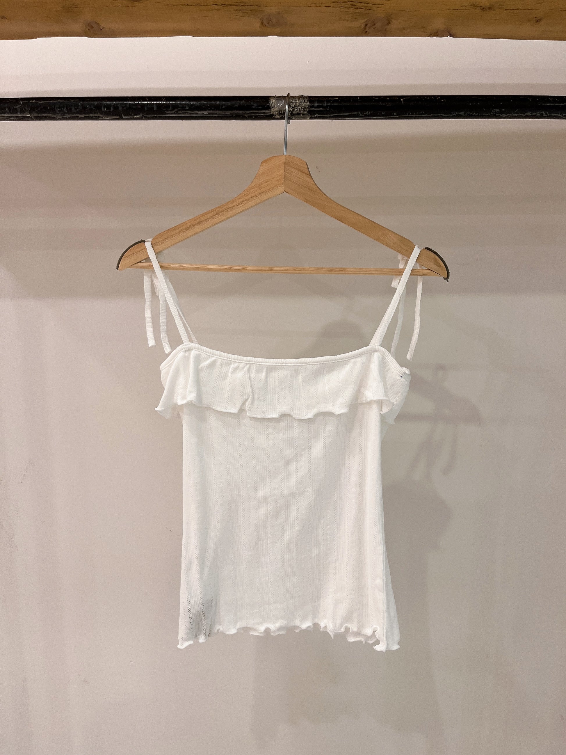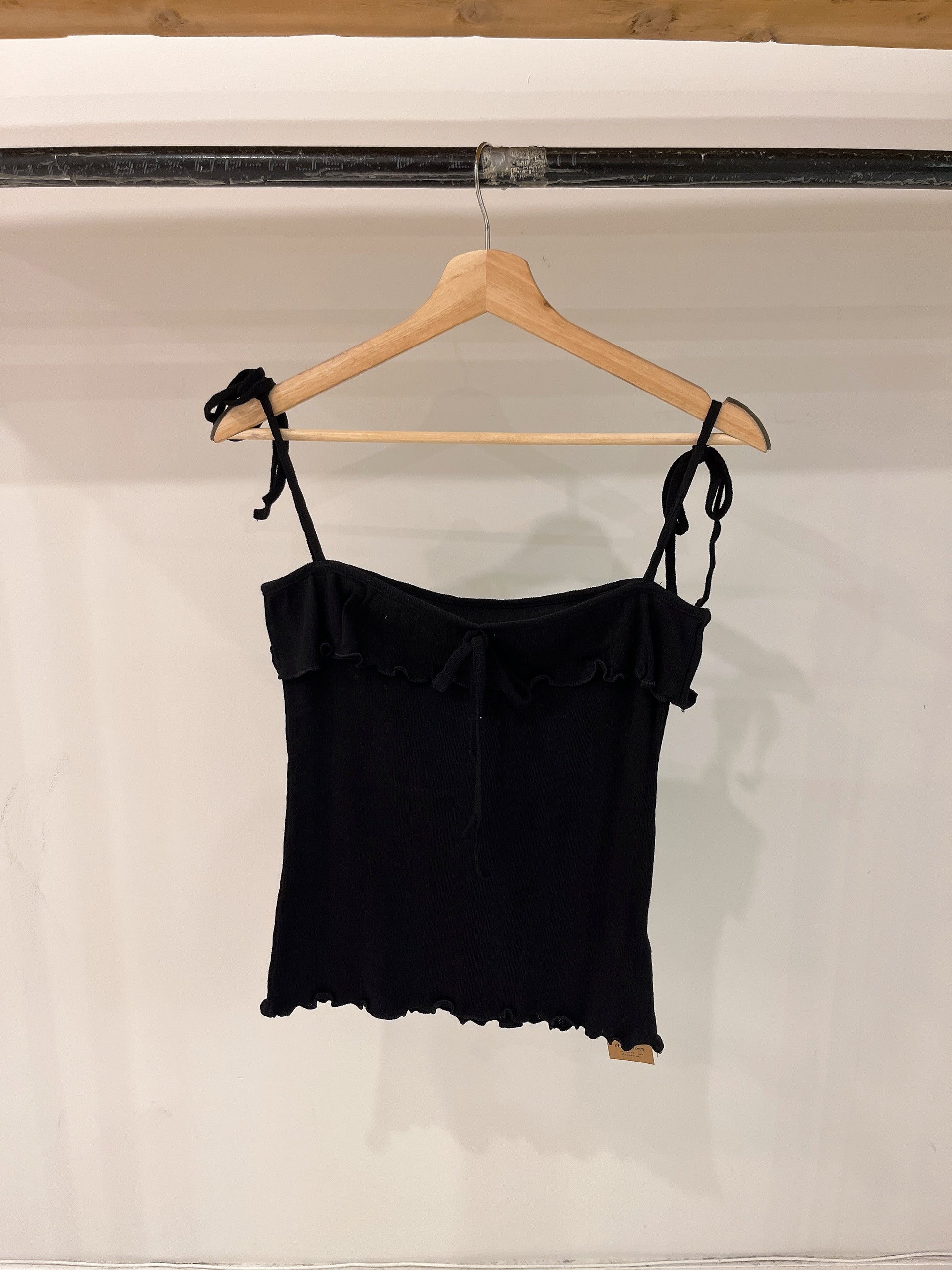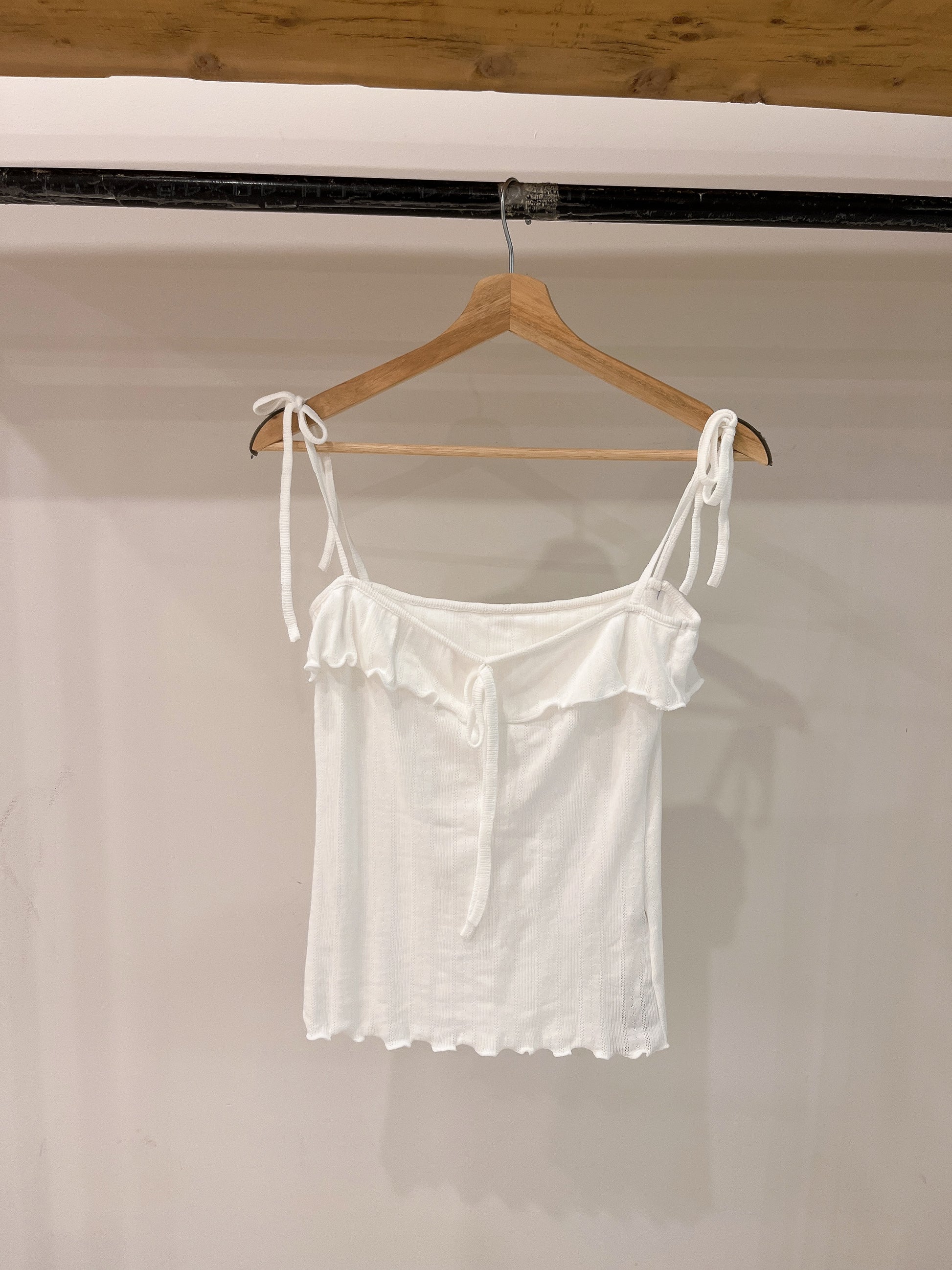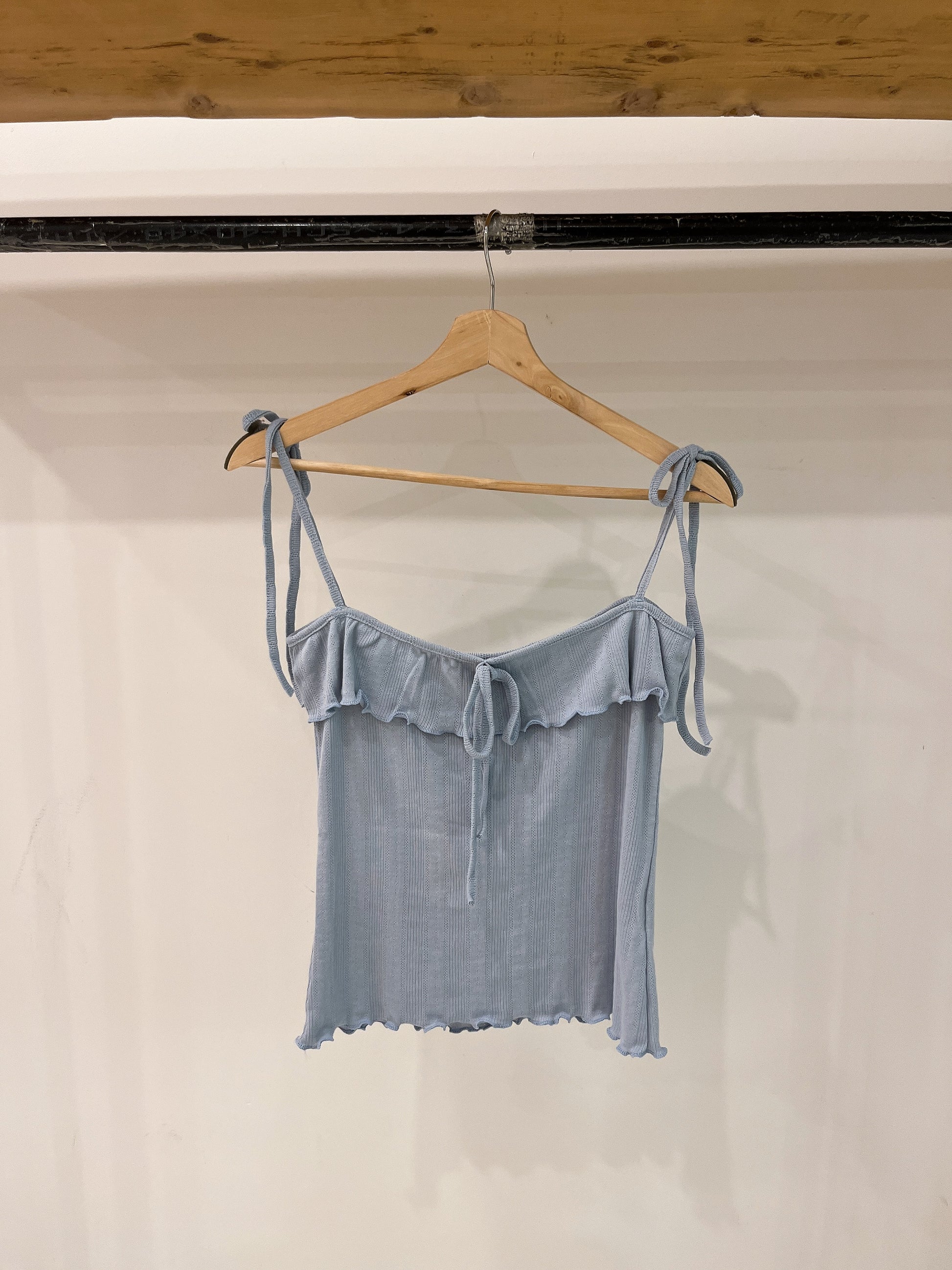 Our super cute, relaxed fit ruffled tank top with adjustable tie straps, front tie detail and a ruffled hemline. Feel the feminine ease in Blue, white or black.