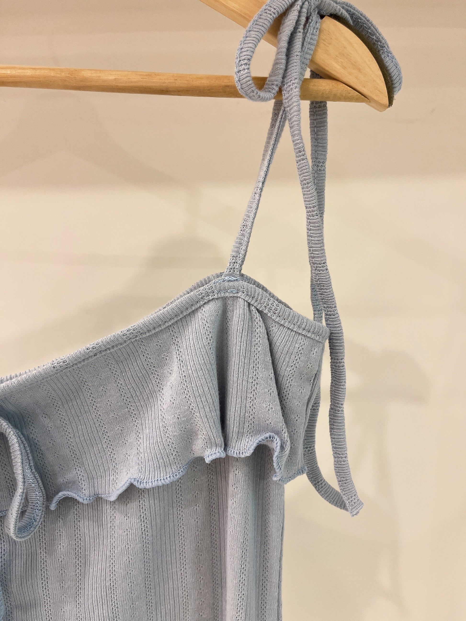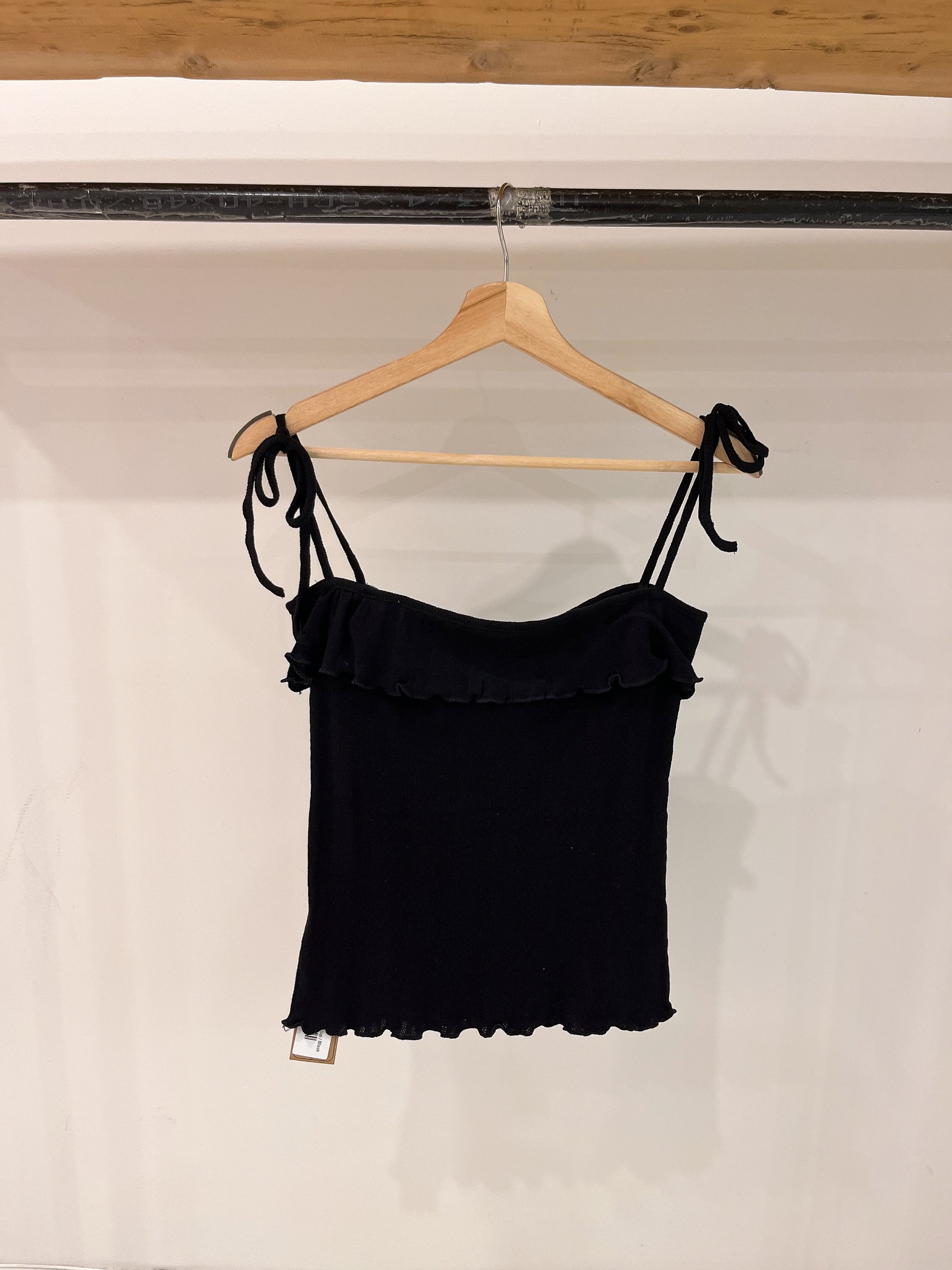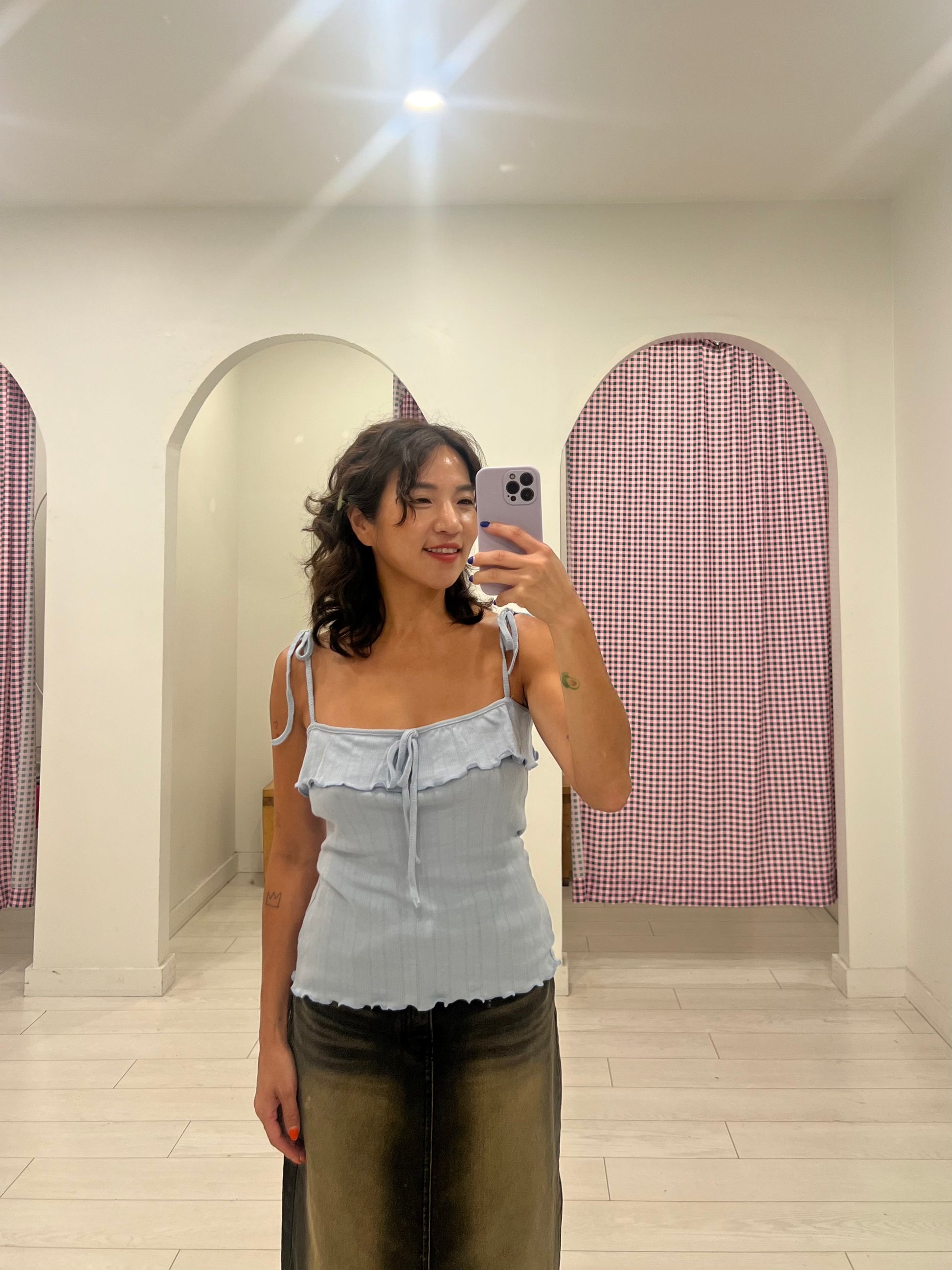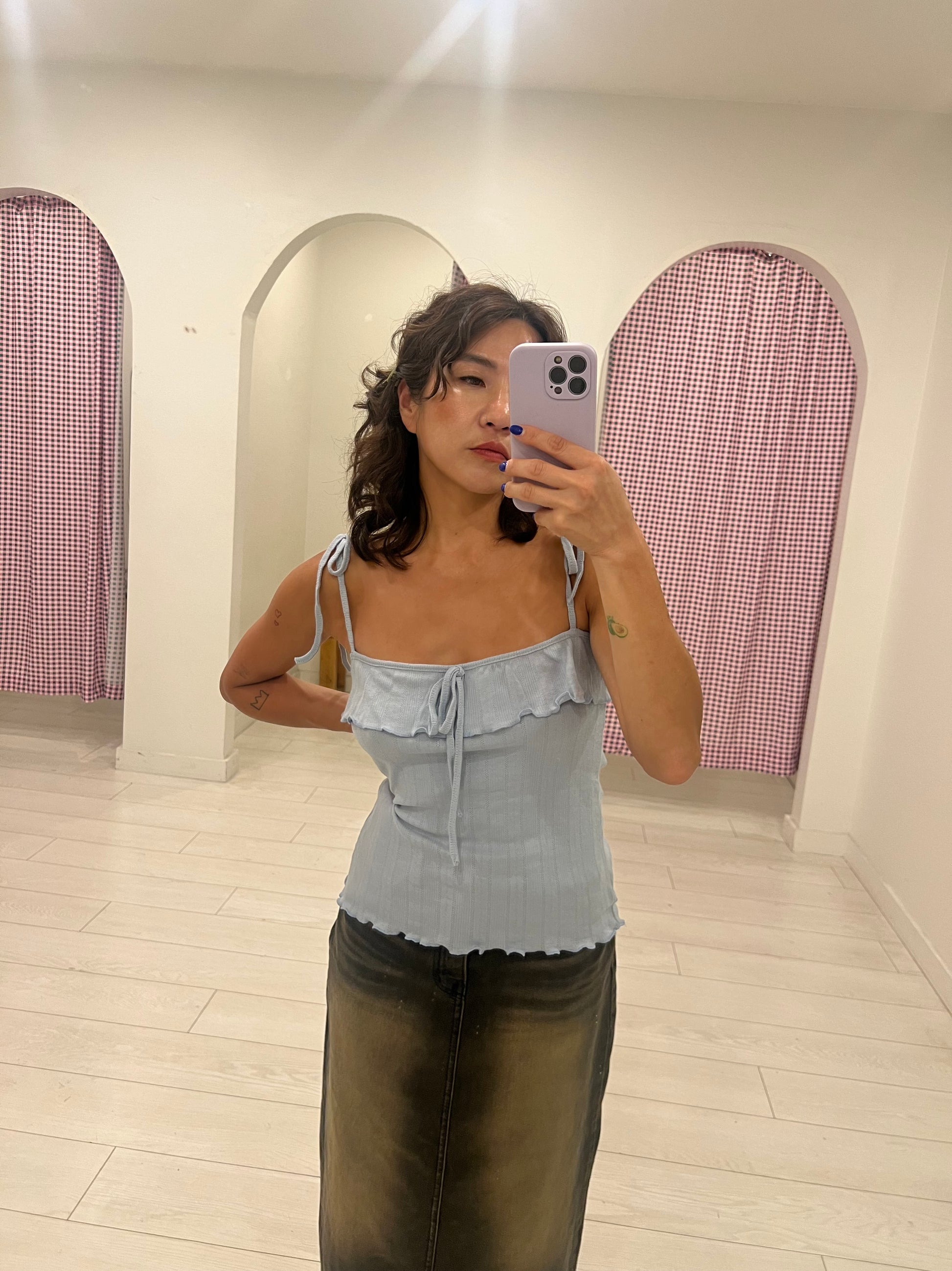 Our super cute, relaxed fit ruffled tank top with adjustable tie straps, front tie detail and a ruffled hemline. Feel the feminine ease in Blue, white or black.