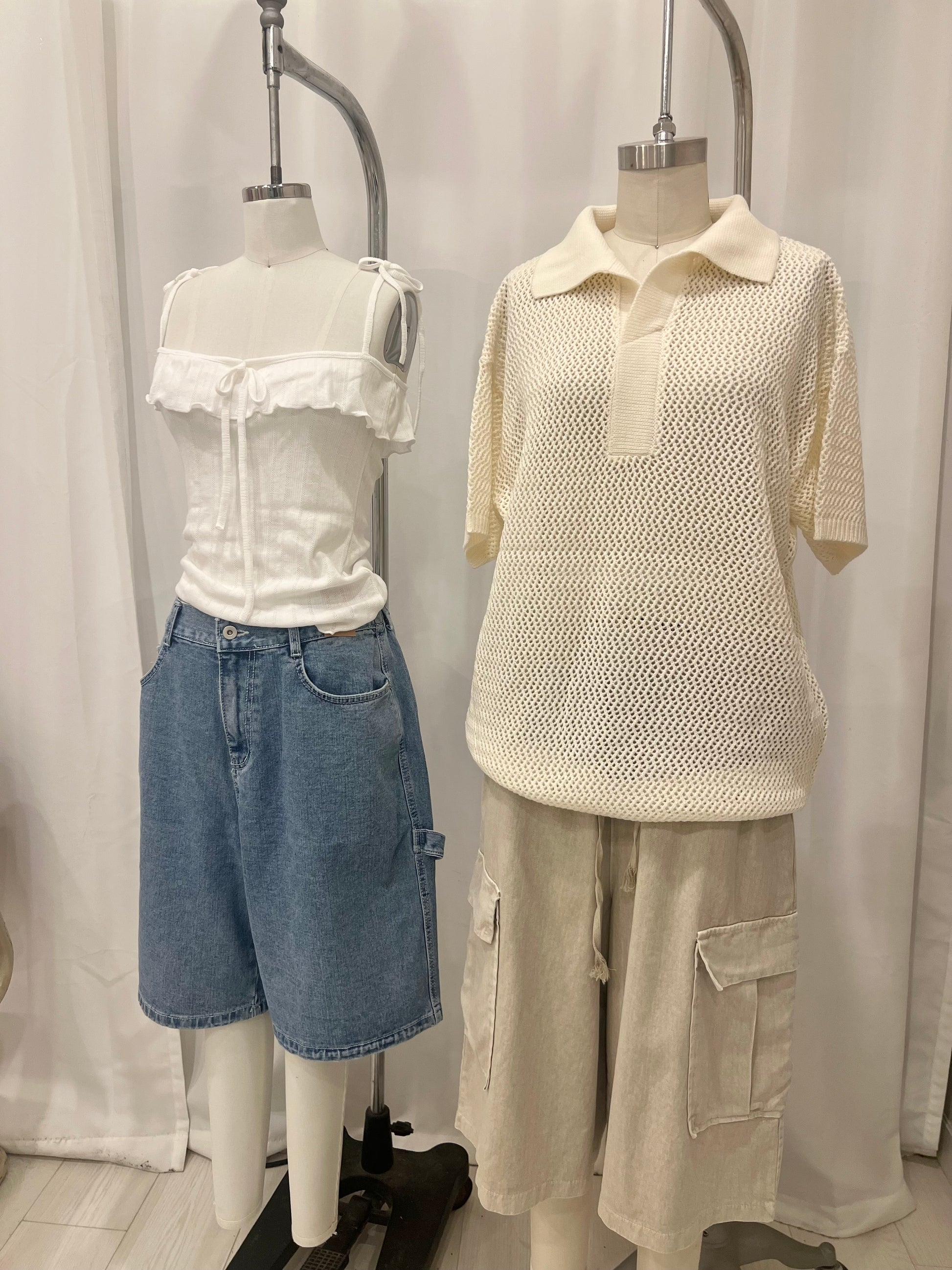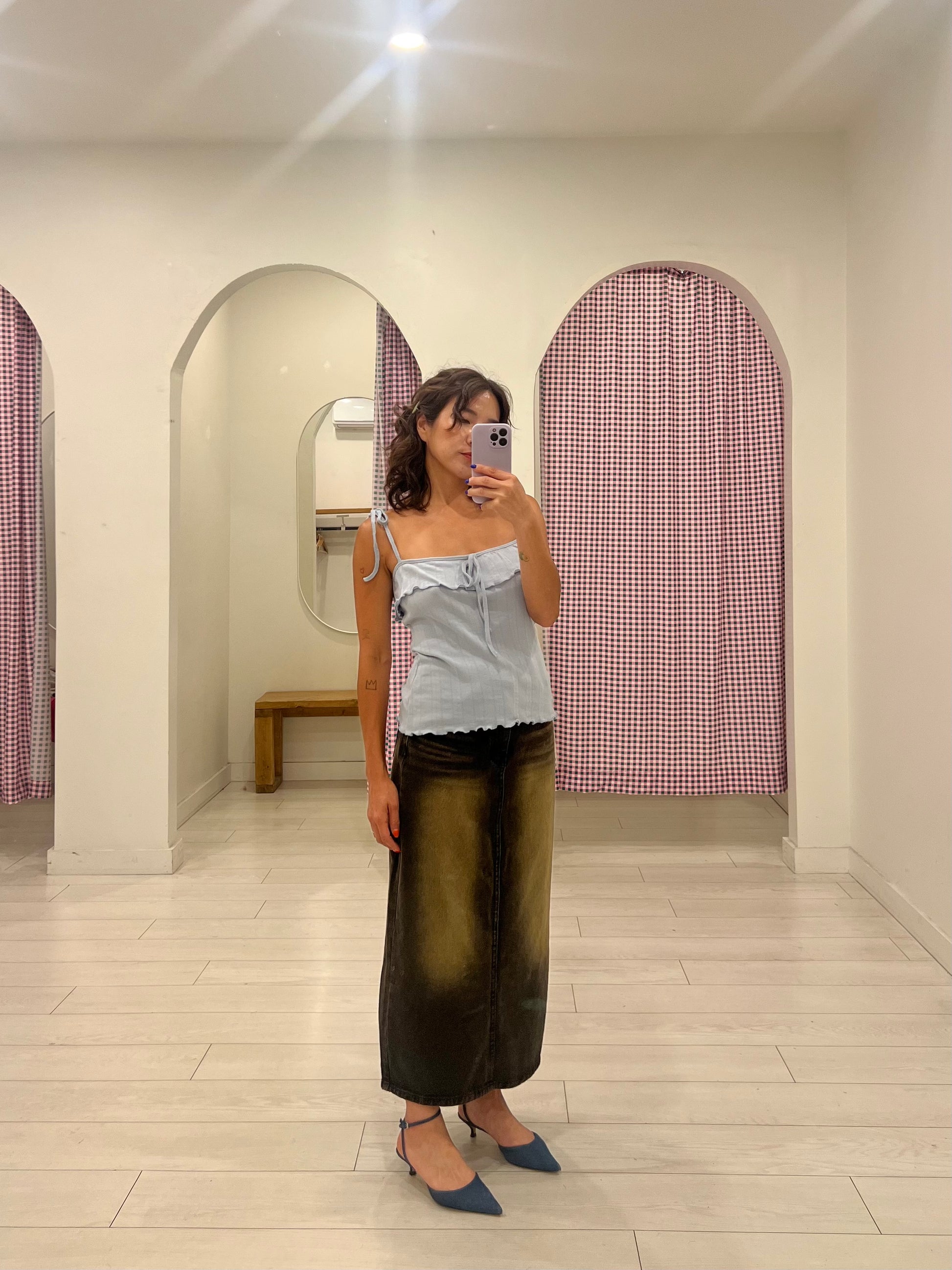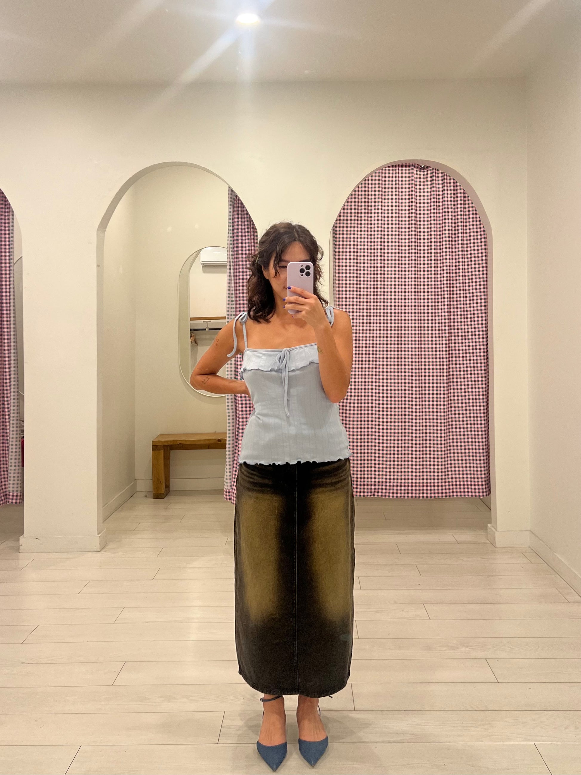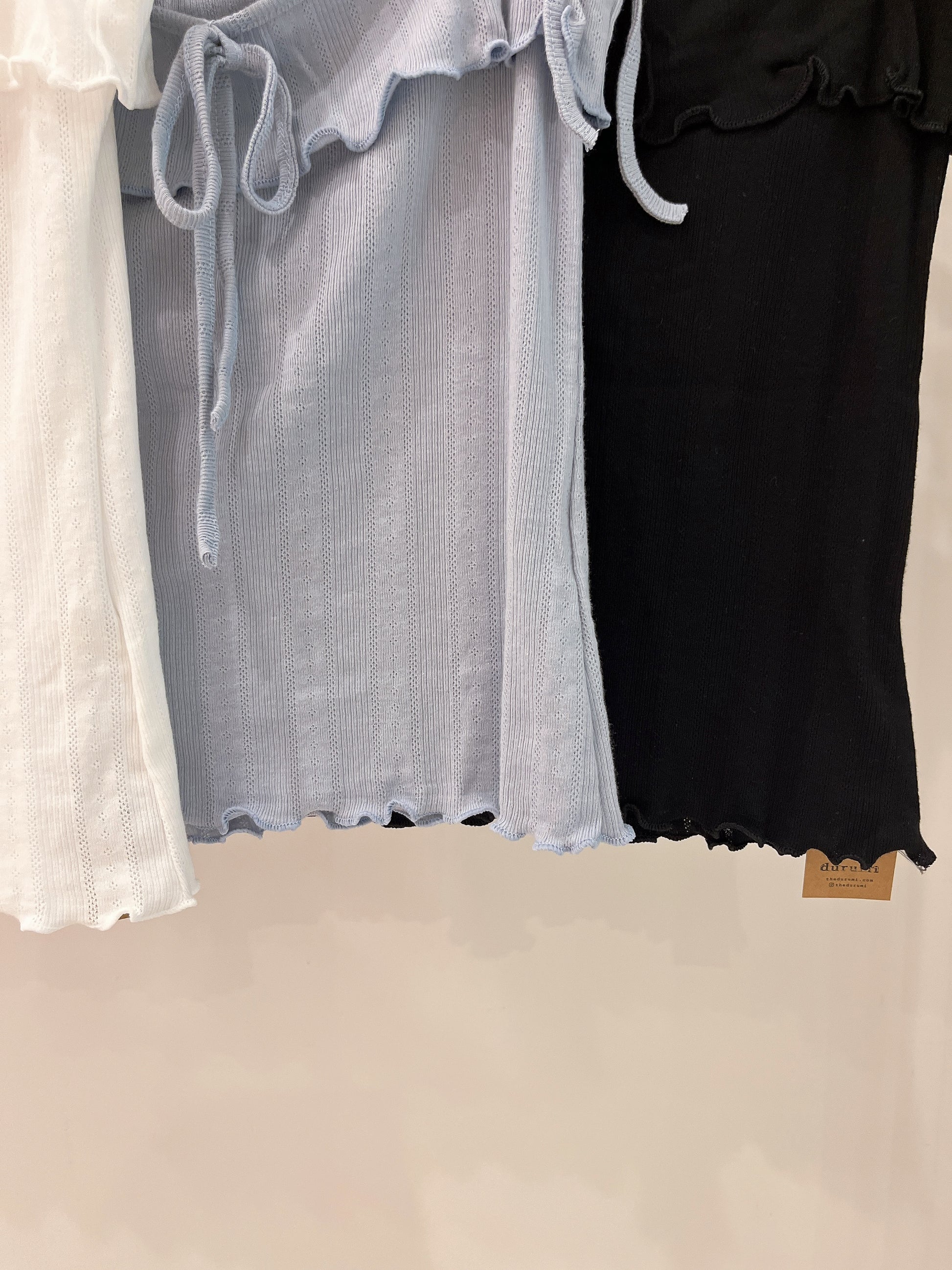 Our super cute, relaxed fit ruffled tank top with adjustable tie straps, front tie detail and a ruffled hemline. Feel the feminine ease in Blue, white or black.