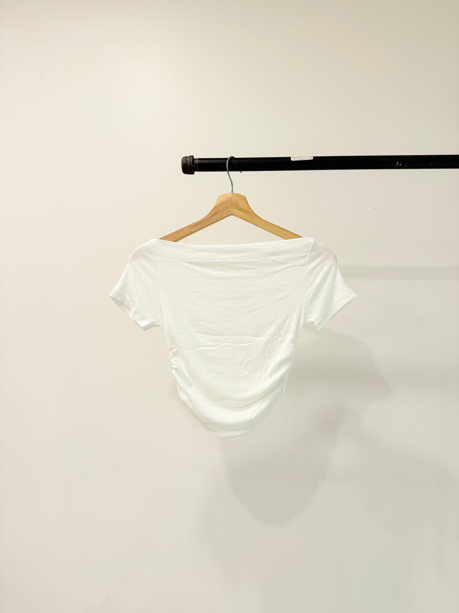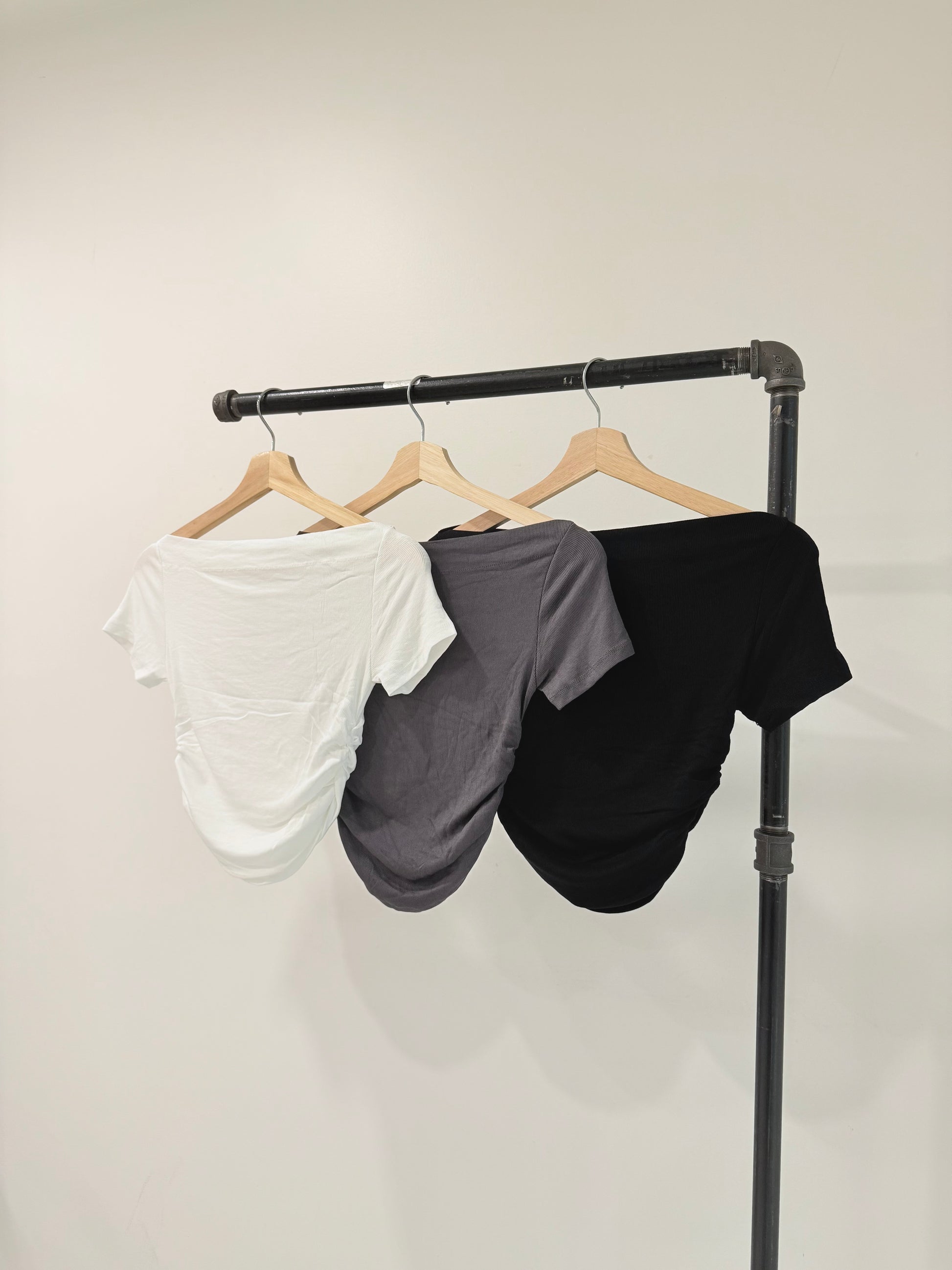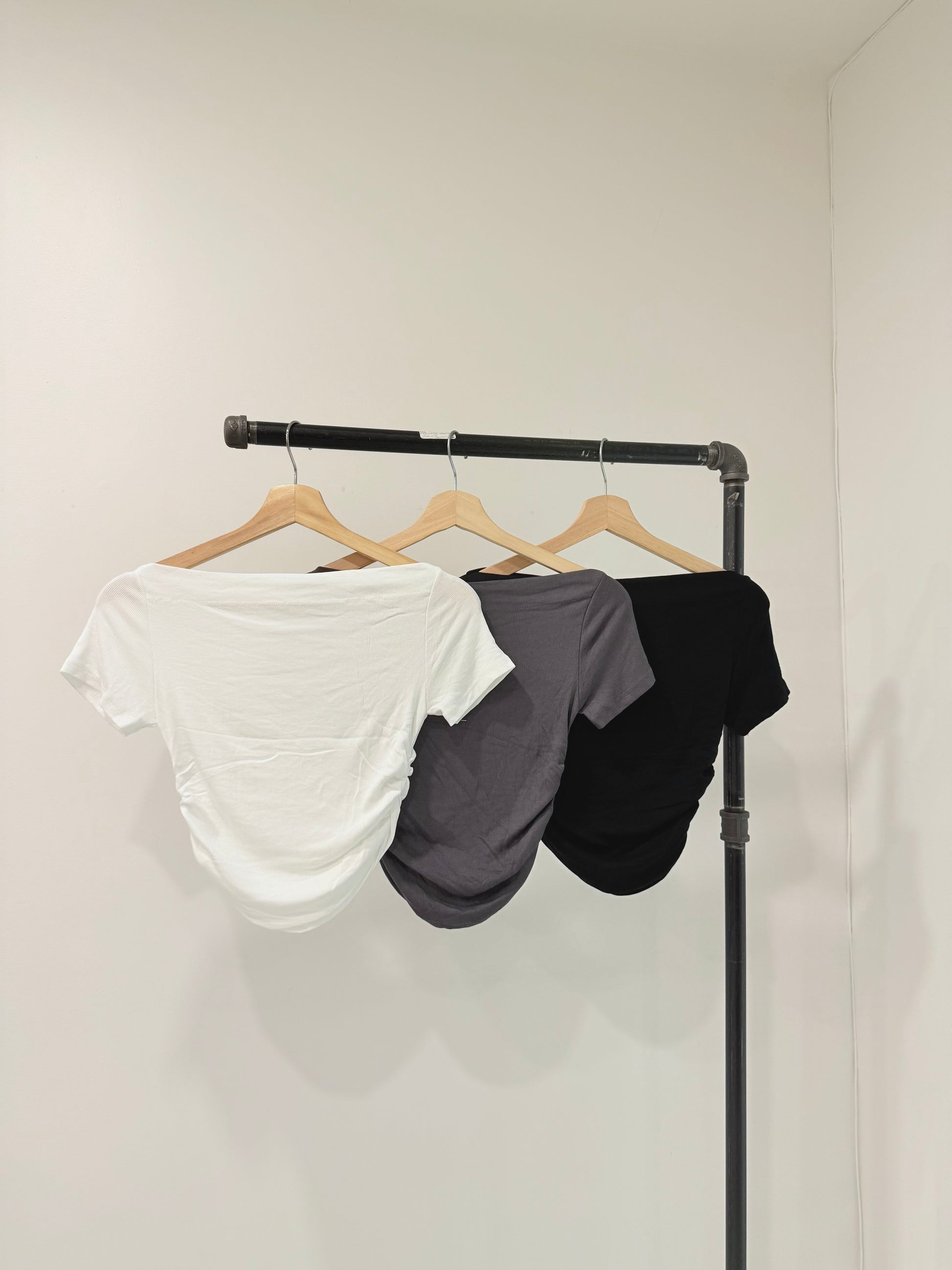 This ribbed, short-sleeve tee features a flattering boat neckline and a form-fitting silhouette. The ruched sides and rounded hemline give it a simple yet stylish edge, making it the perfect piece for your off-duty days when you're serving "casual baddie" vibes. available in charcoal, black and white options.