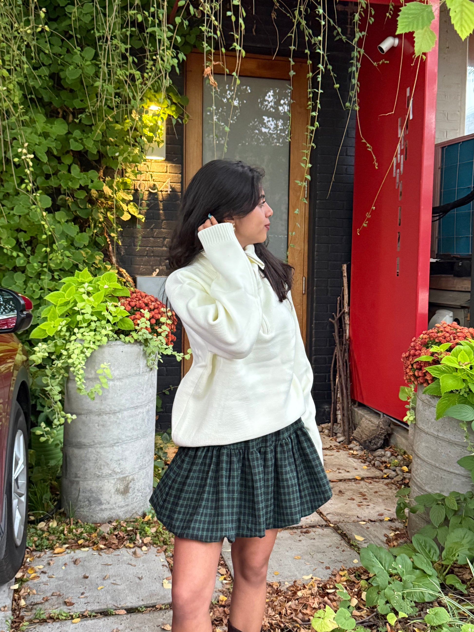 A voluminous, tiered bubble shape meets fall’s ultimate favorite: classic plaid. Talk about an iconic combo. Get the best of both worlds in this super chic, super fun, grungy skirt crafted from thick fabric with an overall plaid design. Featuring a bubble silhouette and comfy elasticated waist. Now available in three options – black, green and brown.