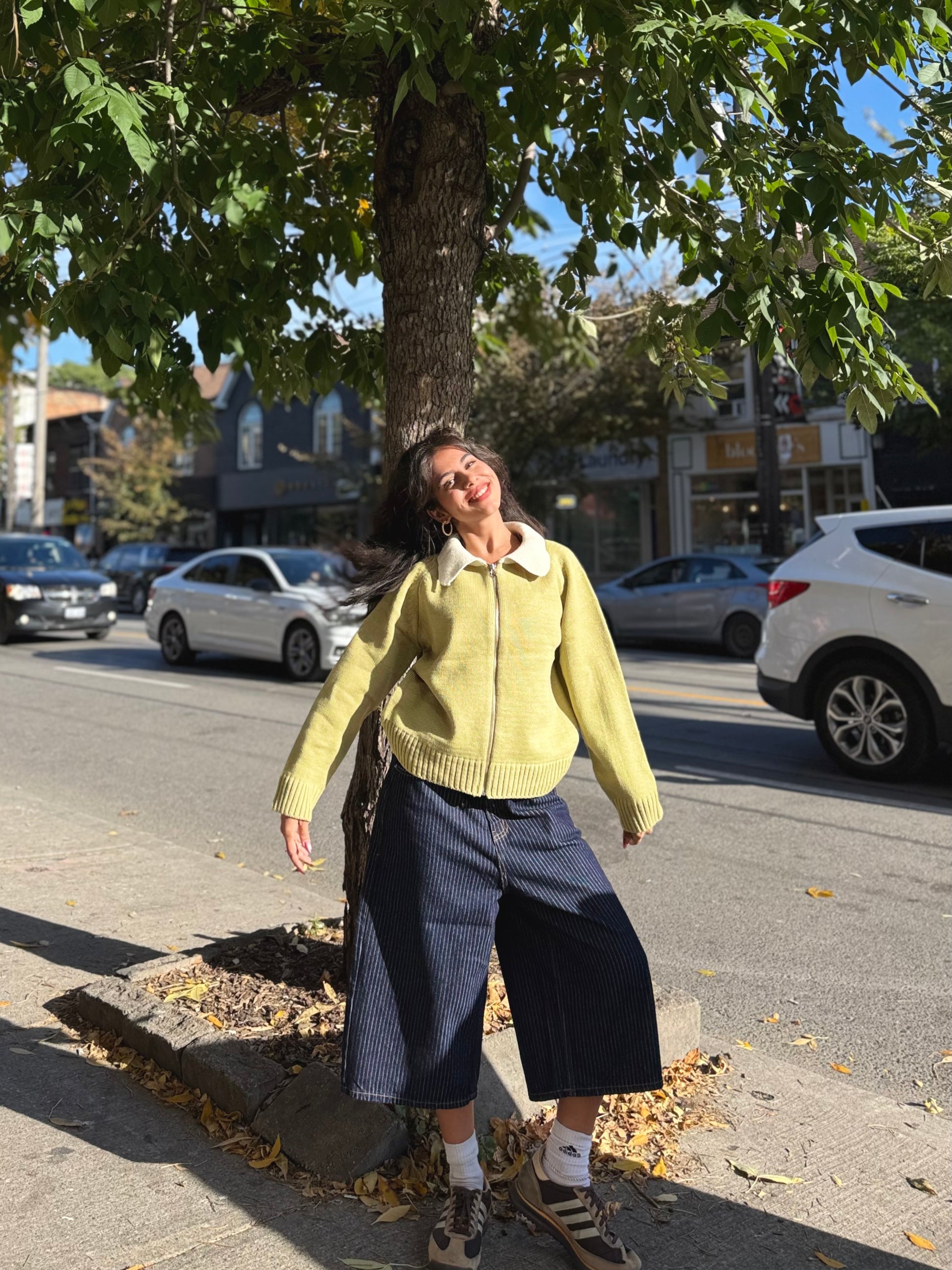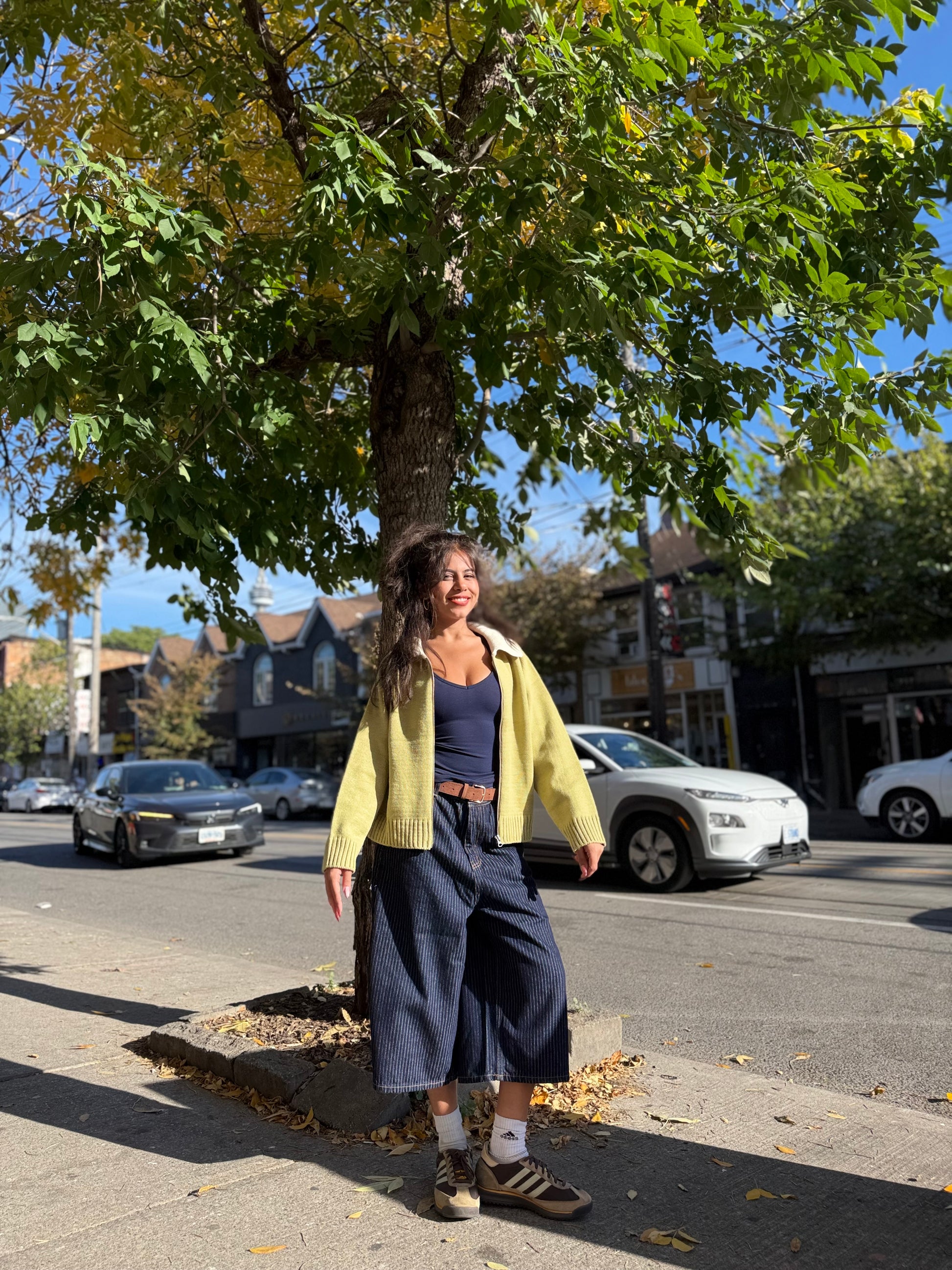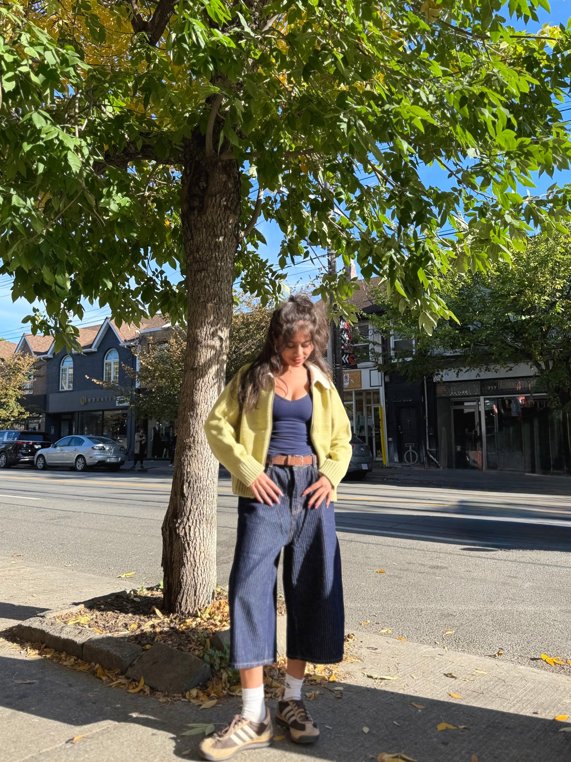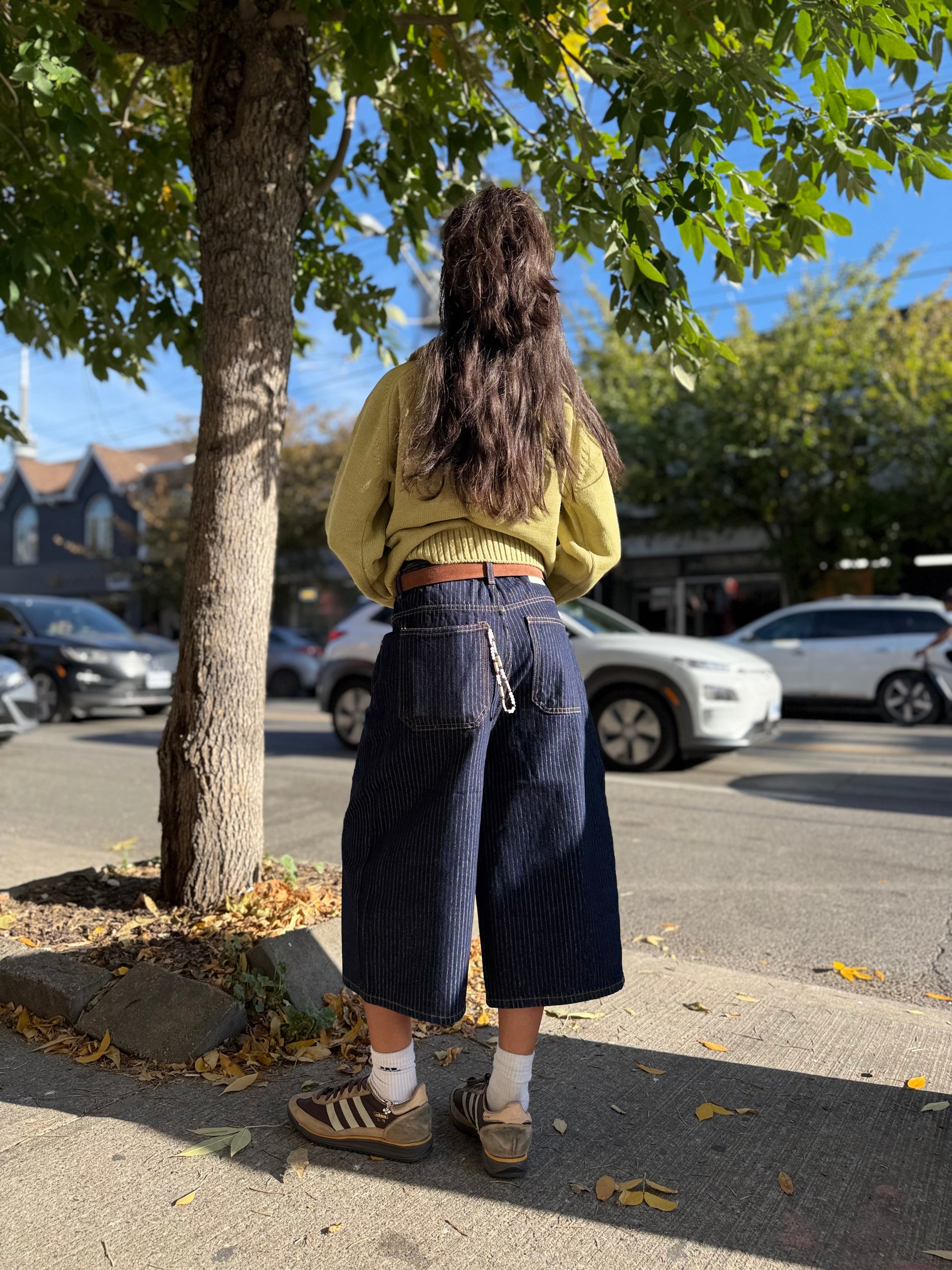 these jeans will have everyone wishing theirs were half as fun as yours. the ultimate cool-girl pick, our striped 3/4 culotte jeans come in a dark, raw-textured wash with bold vertical stripes and contrast yellow stitching for that extra pop. essential details include belt loops, a button-and-zip closure, roomy side slash pockets, and classic back patch pockets to keep things practical. A no-brainer for effortless streetwear chic.