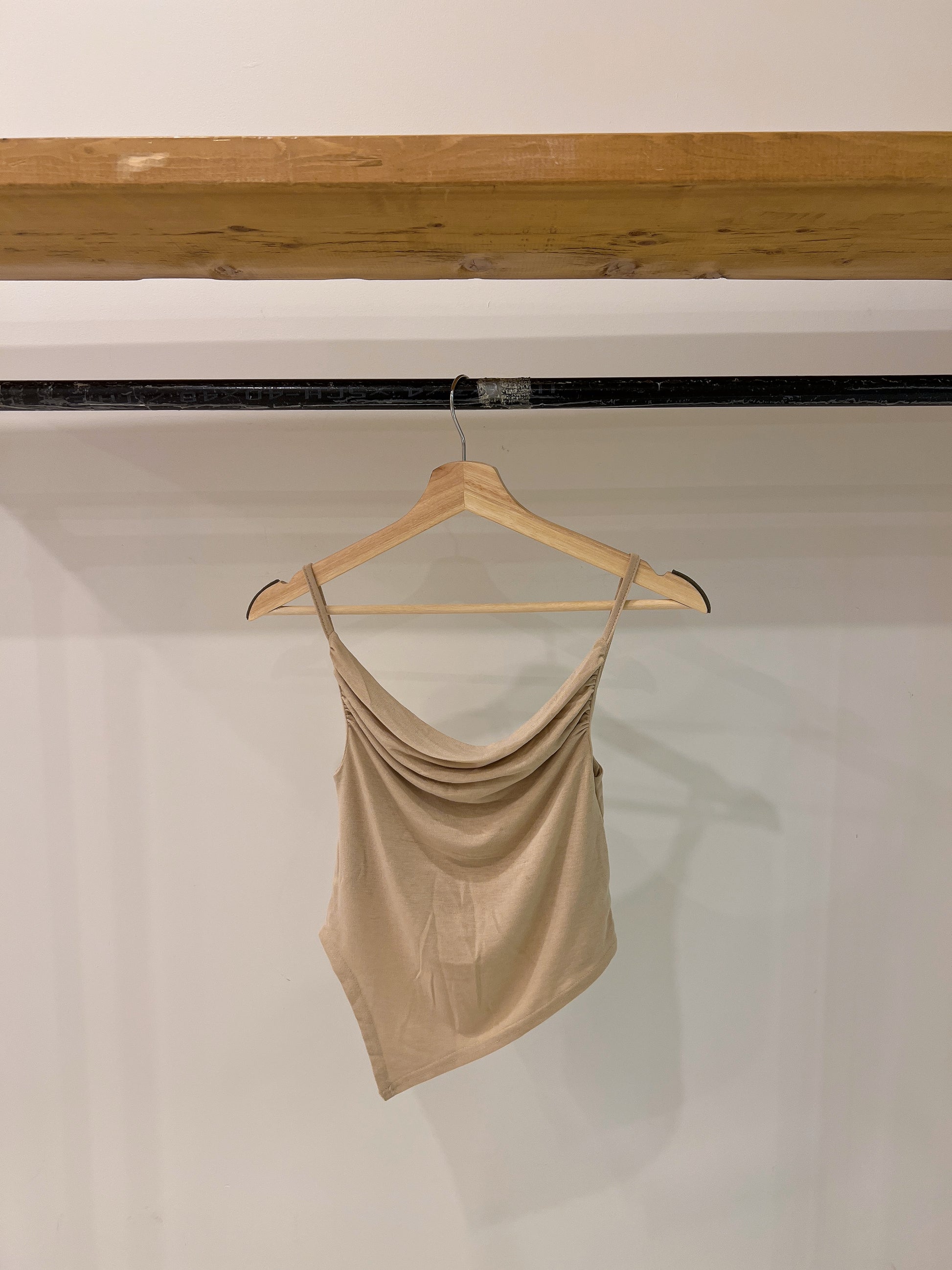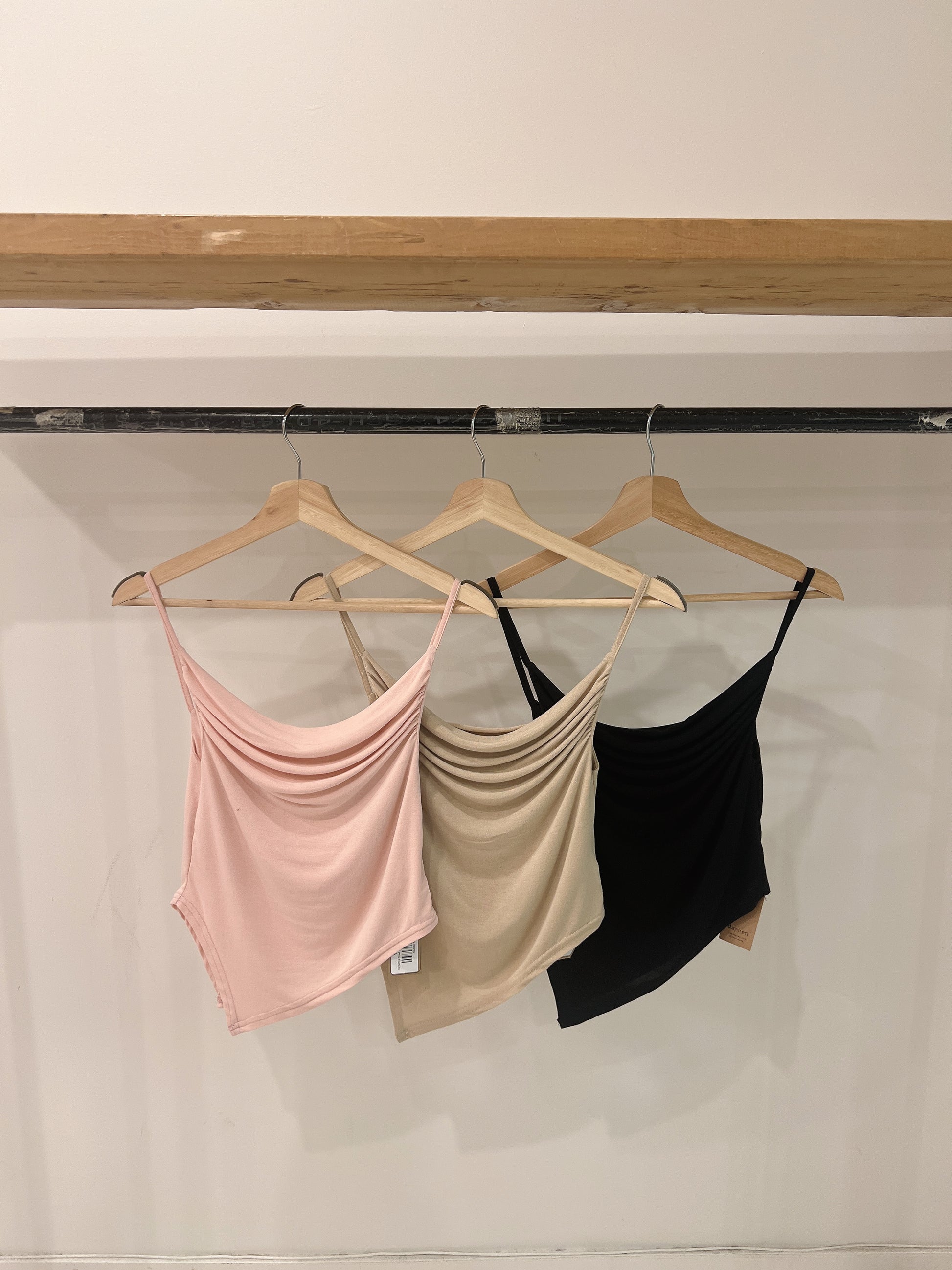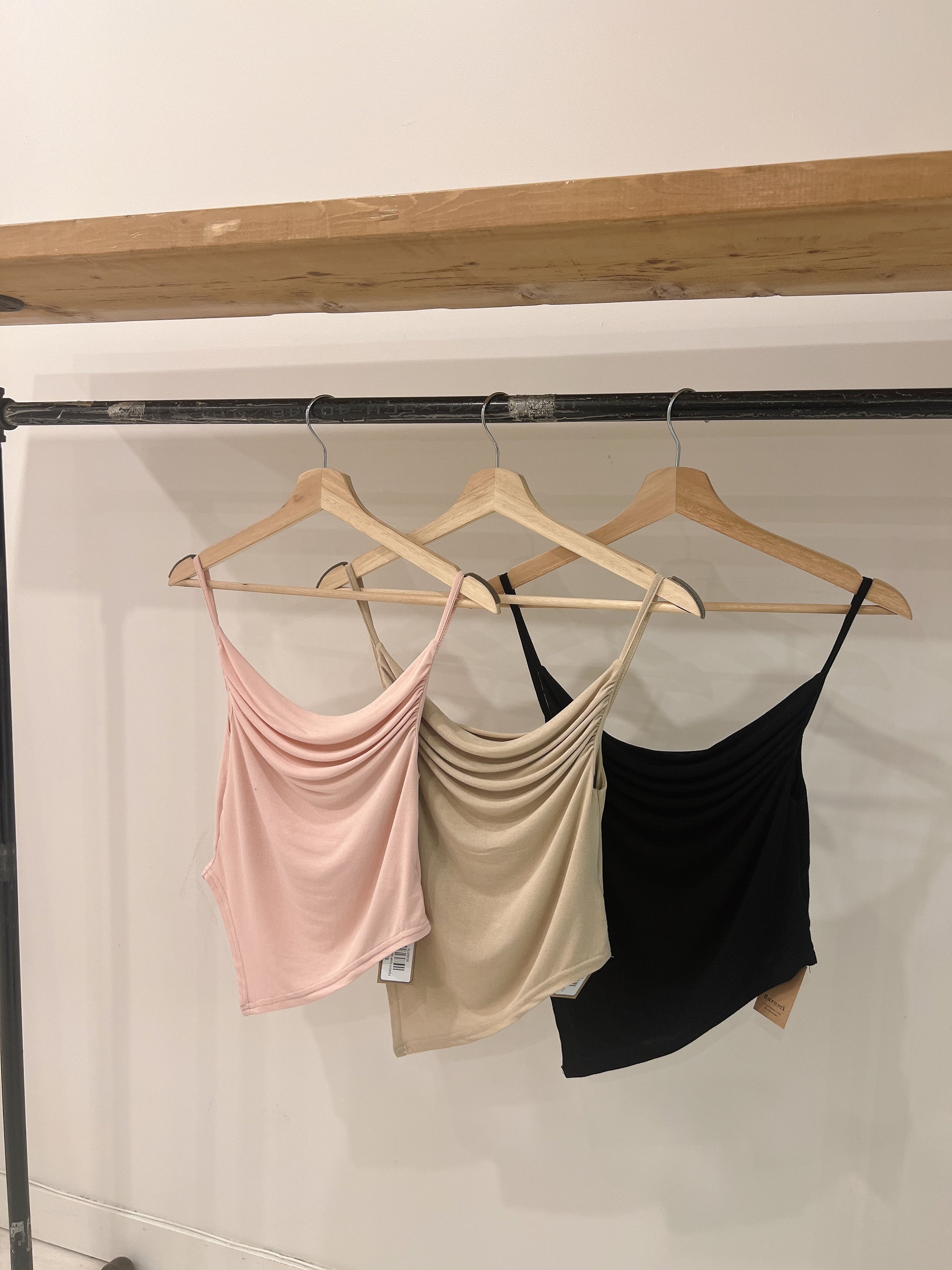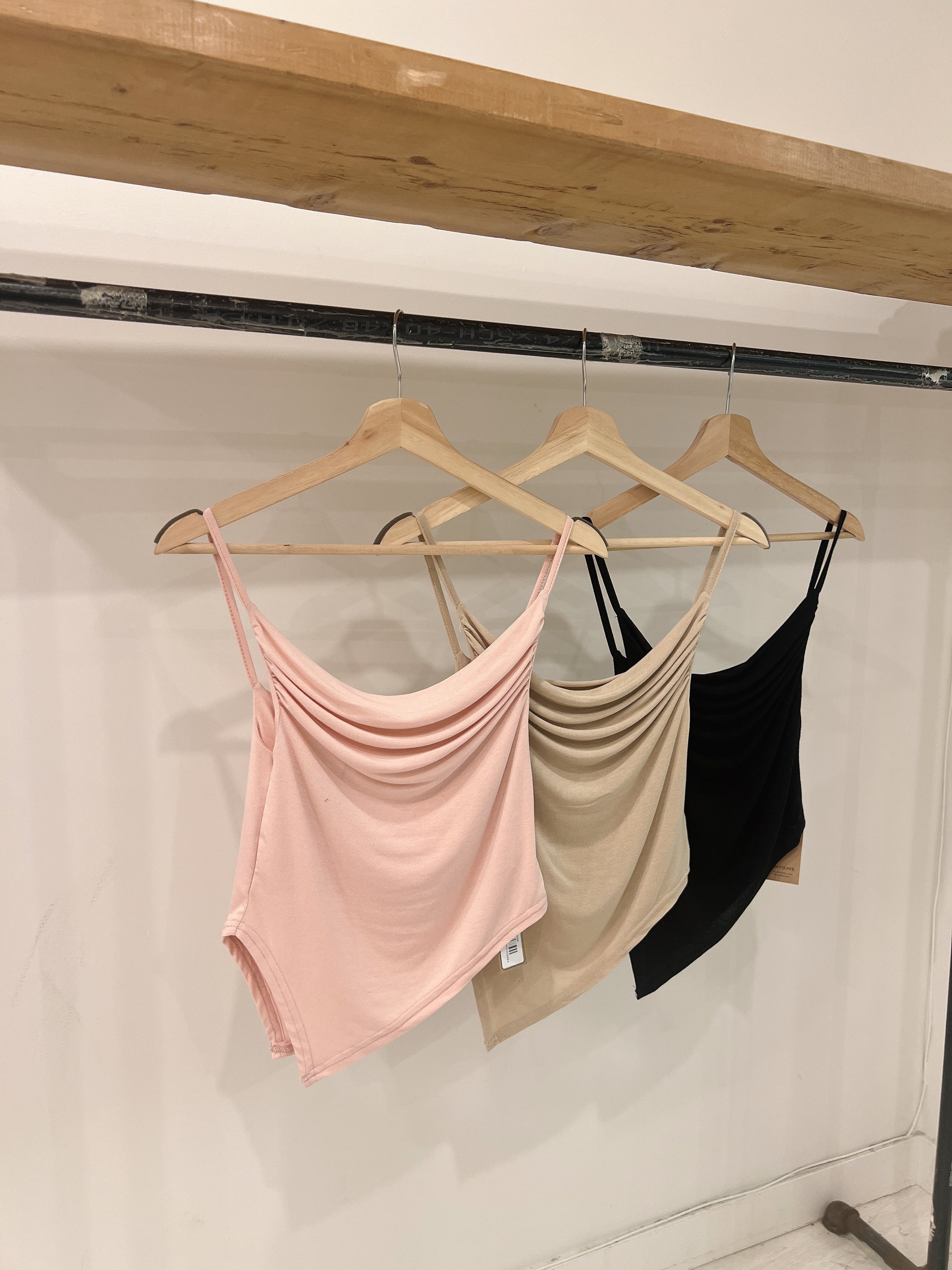 Introducing our ruched tank top with a cowl neckline, asymmetrical hanker-chief hemline and noodle straps, a playful top for your summer fits checks! Now available in Beige and Black.