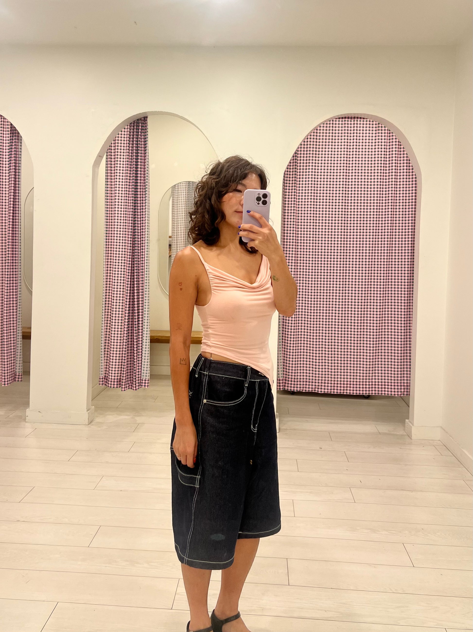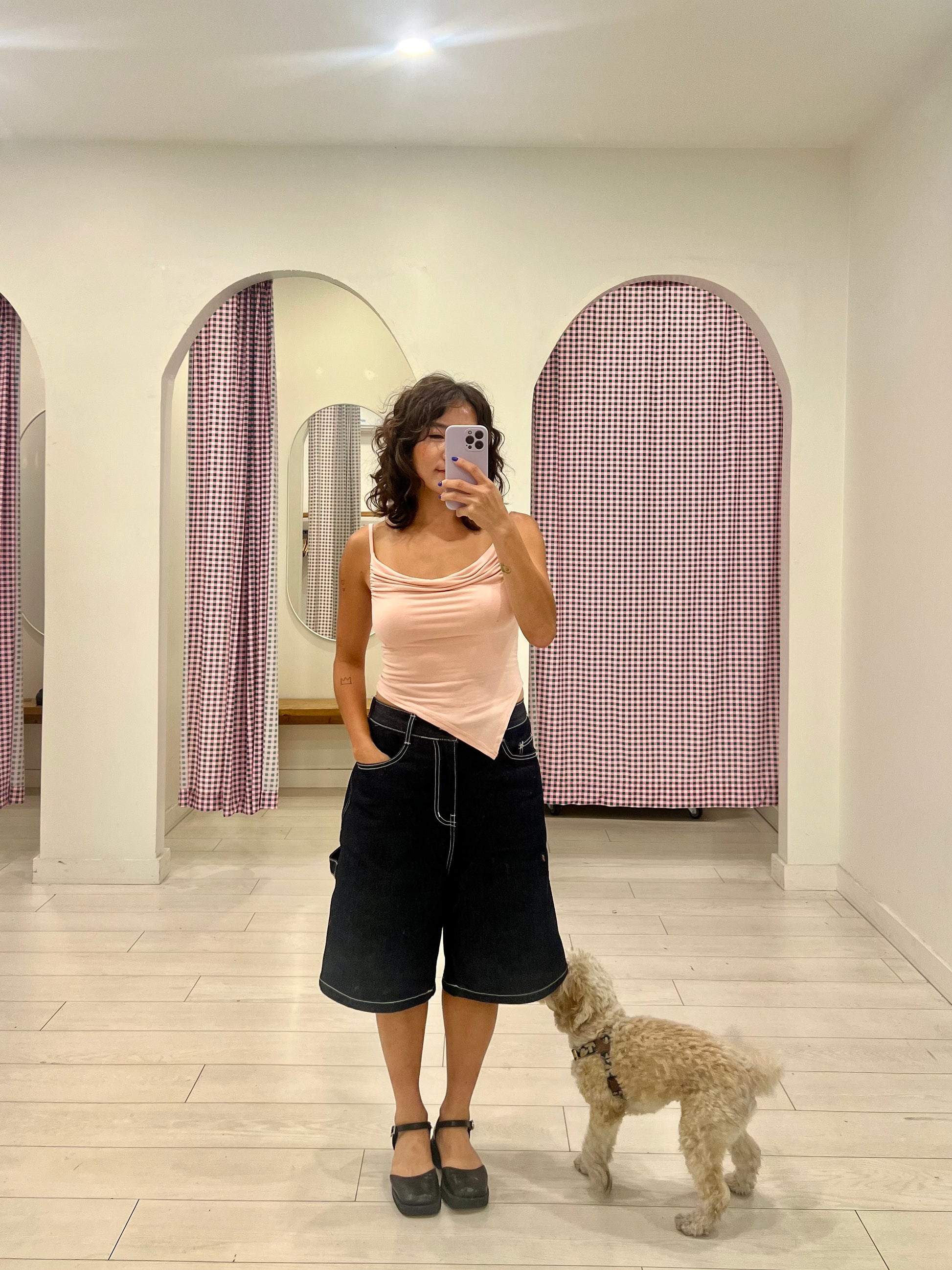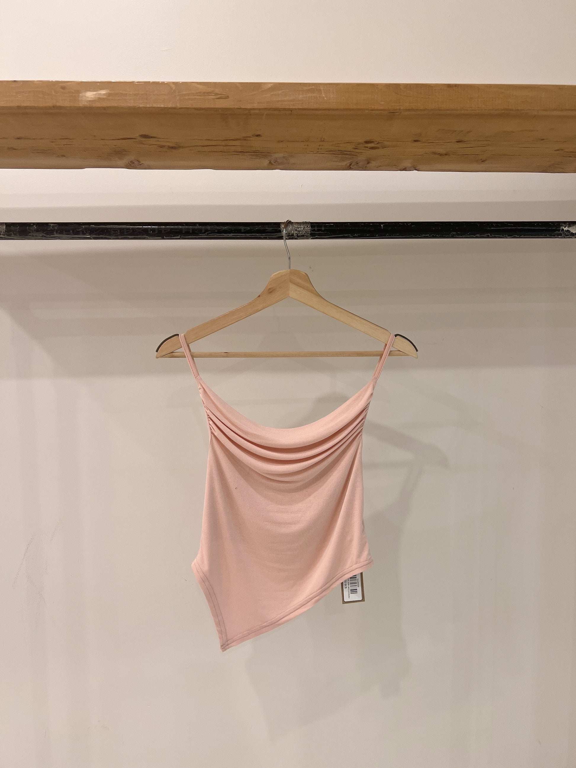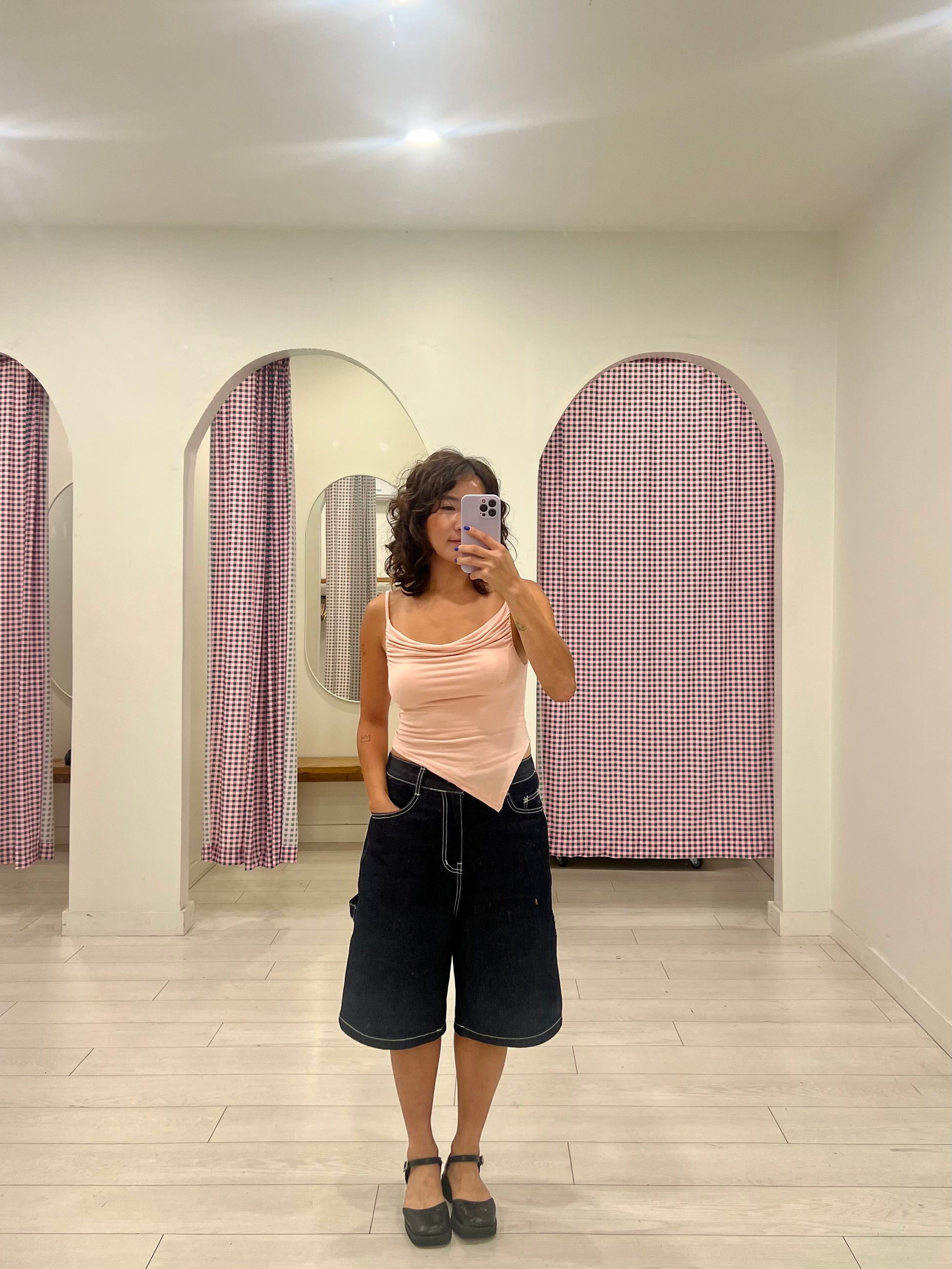 Introducing our ruched tank top with a cowl neckline, asymmetrical hanker-chief hemline and noodle straps, a playful top for your summer fits checks! Now available in Beige and Black.
