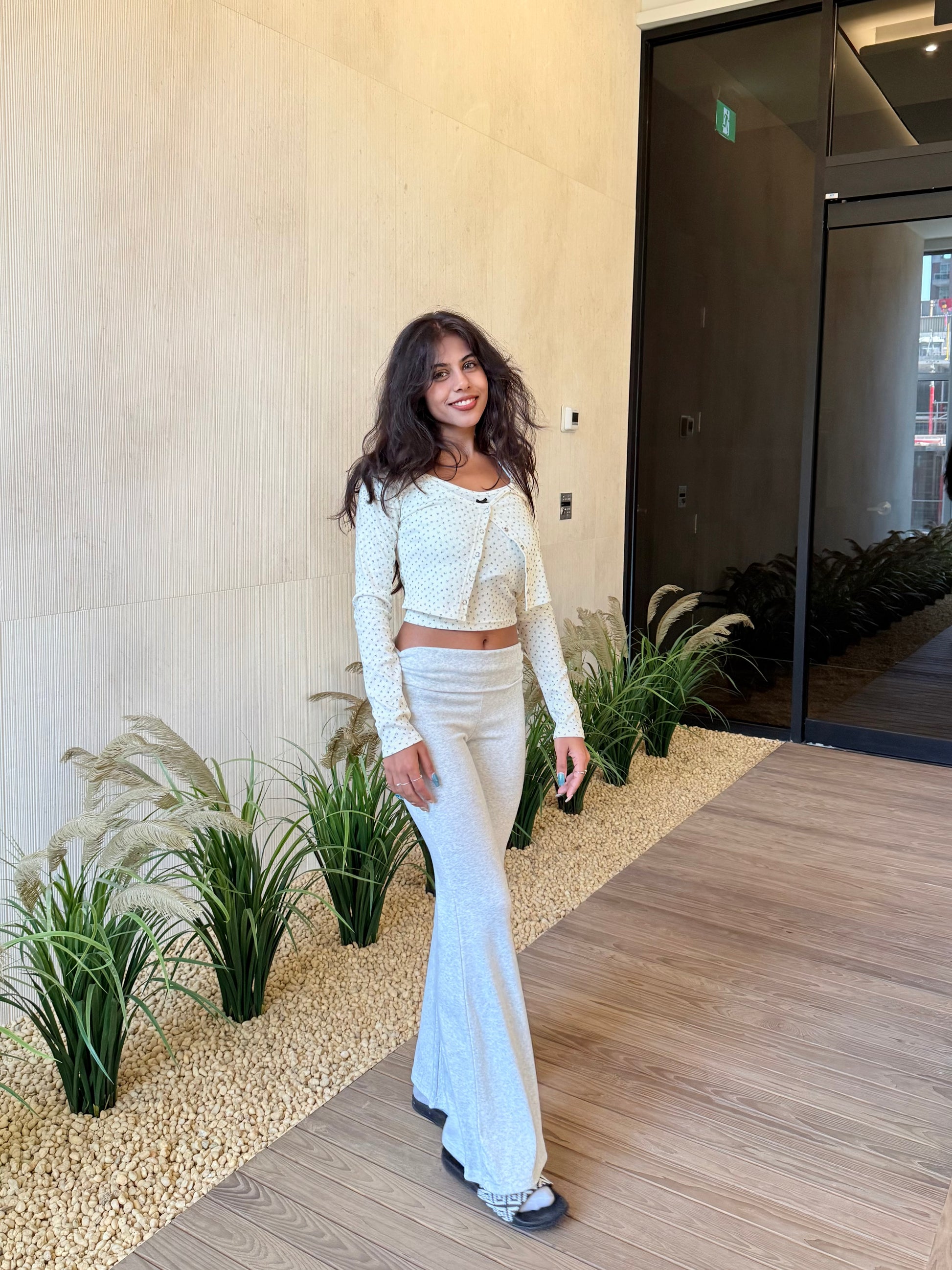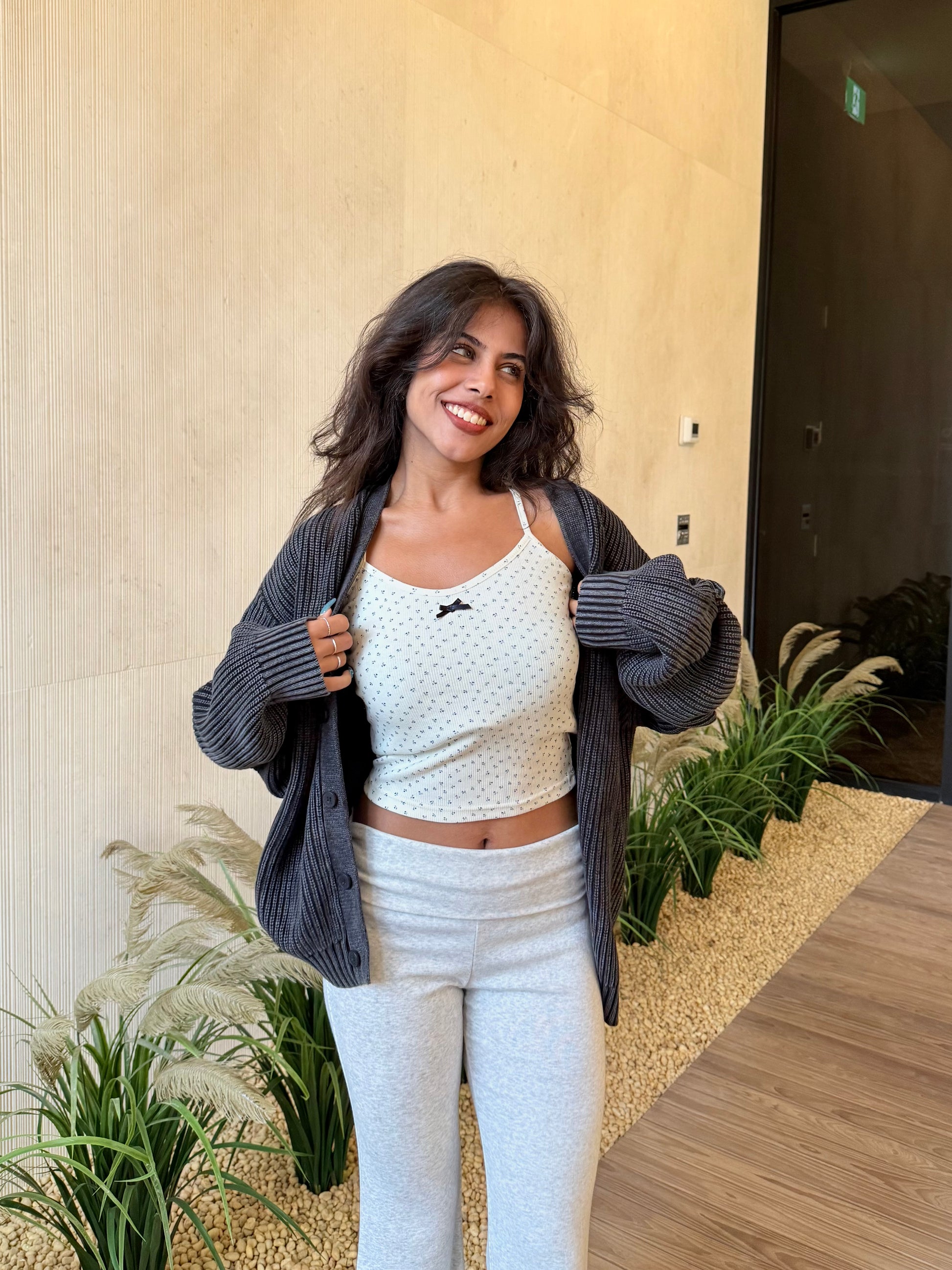 It’s perfectly paired with a fitted long-sleeve cardigan, designed with a plunging neckline, snap-button front, and snug silhouette for some cheeky, flirty styling. Available in cream, brown, and grey—fall-ready shades for feminine fits.