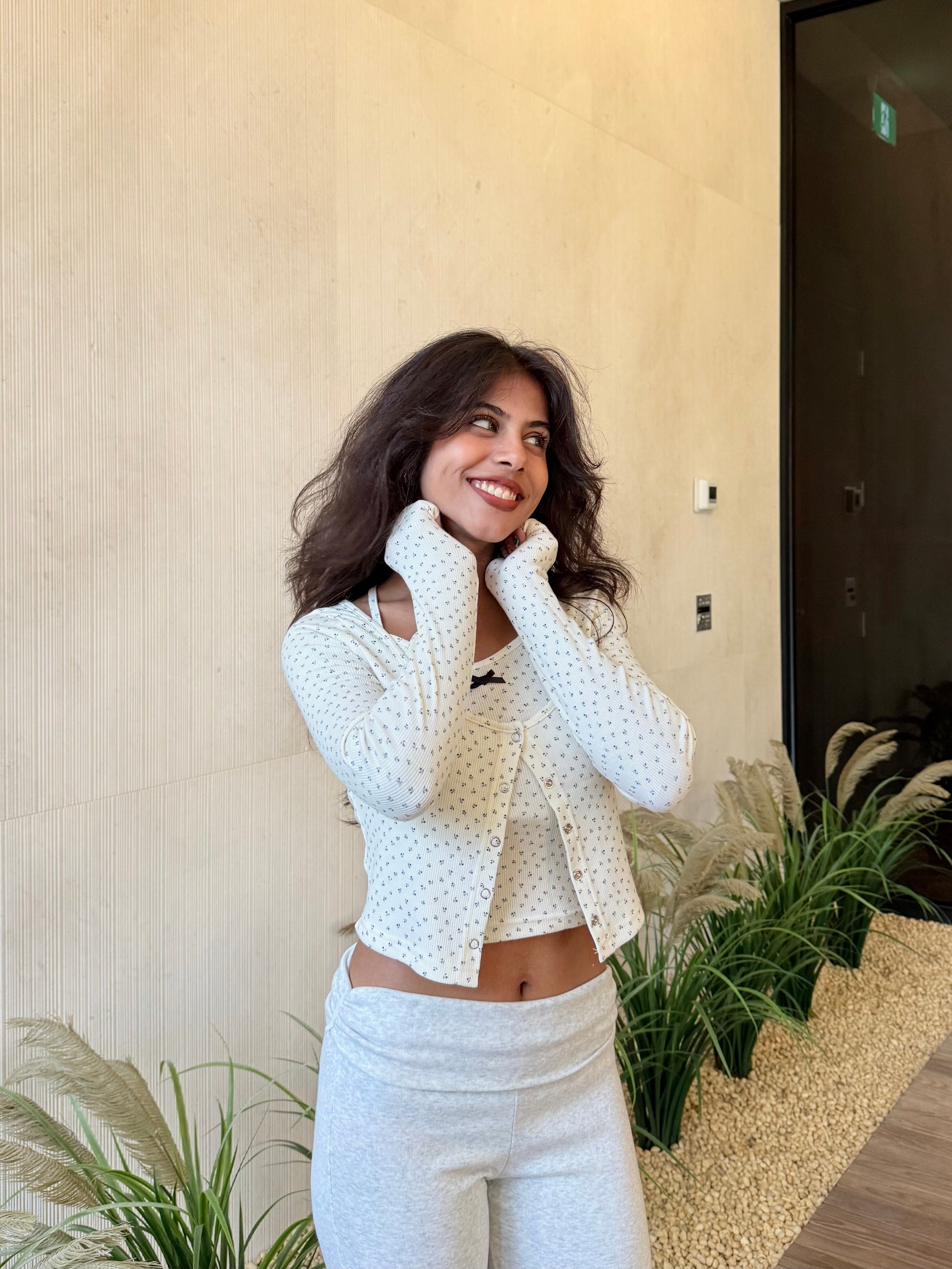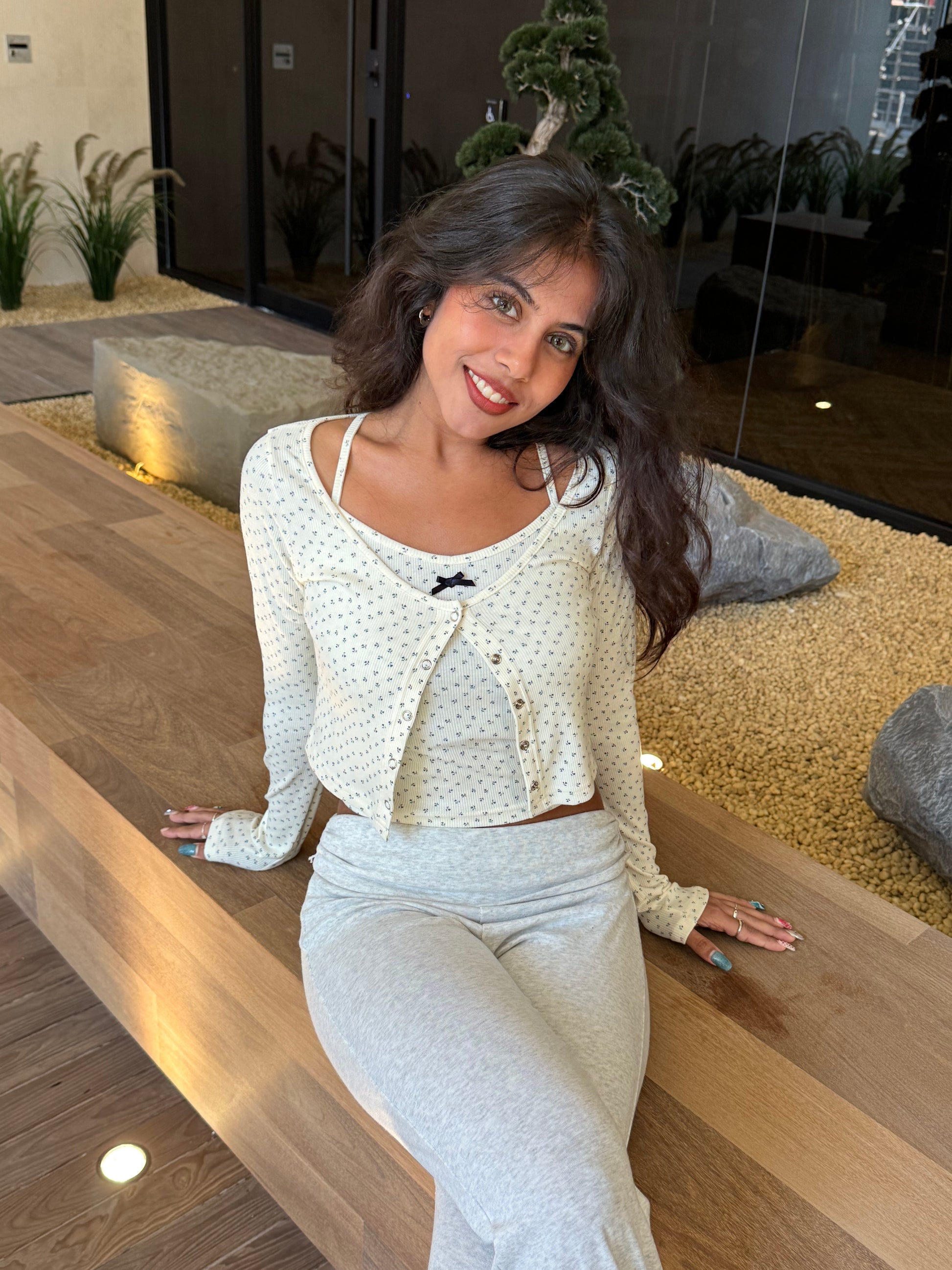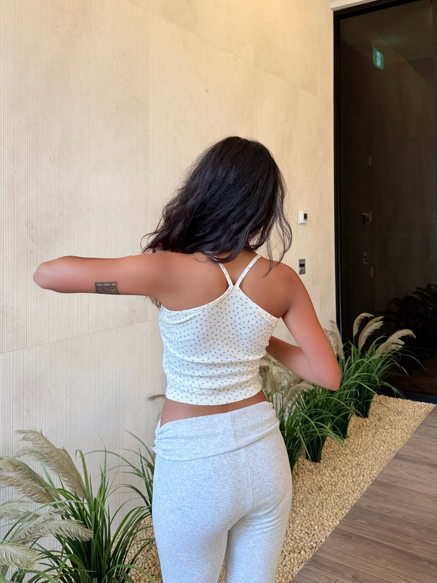 For post-pilates lounging or for the soft girlies who can’t get enough of florals, this set is your new favorite. The racerback tank with noodle straps features a delicate floral print, ribbed texture, and a dainty bow at the neckline.