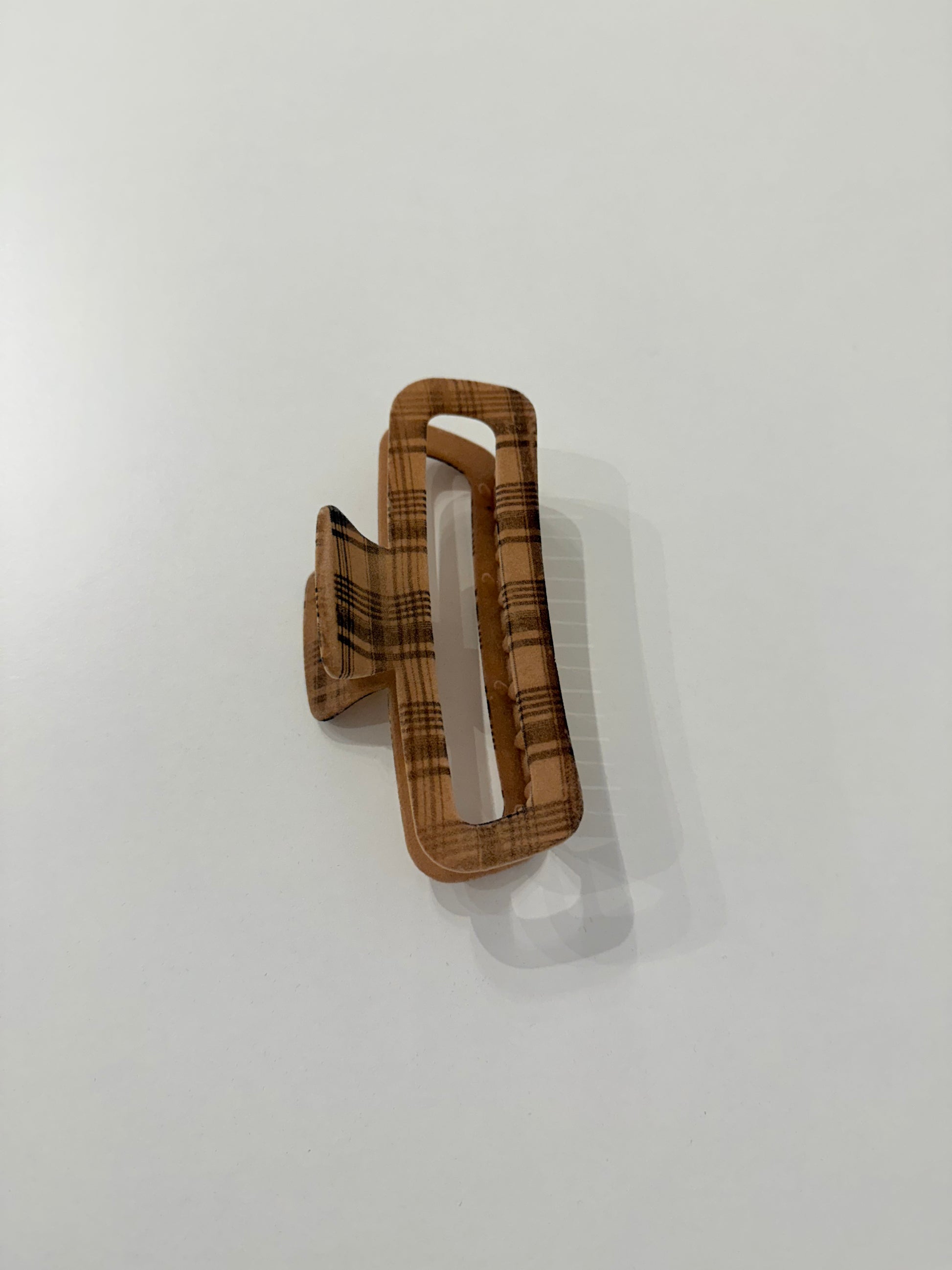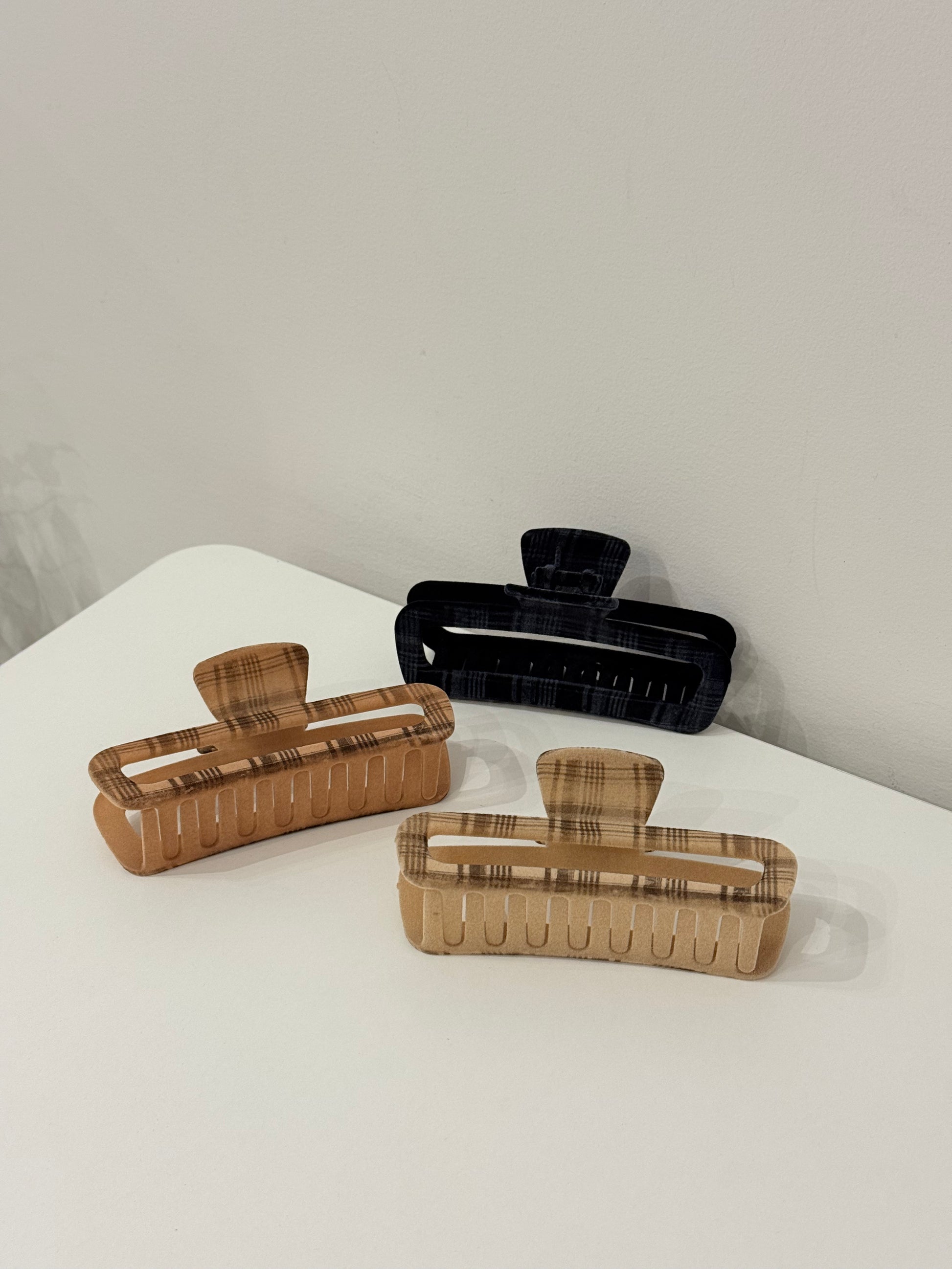 Elevate your daily up-do with our Matte Plaid Hair Claws. Featuring a modern rectangular silhouette and a soft-touch matte finish, these clips offer a secure hold without pulling. The subtle checkered pattern adds a touch of texture to any outfit. Available in Black, Tan, and Beige.