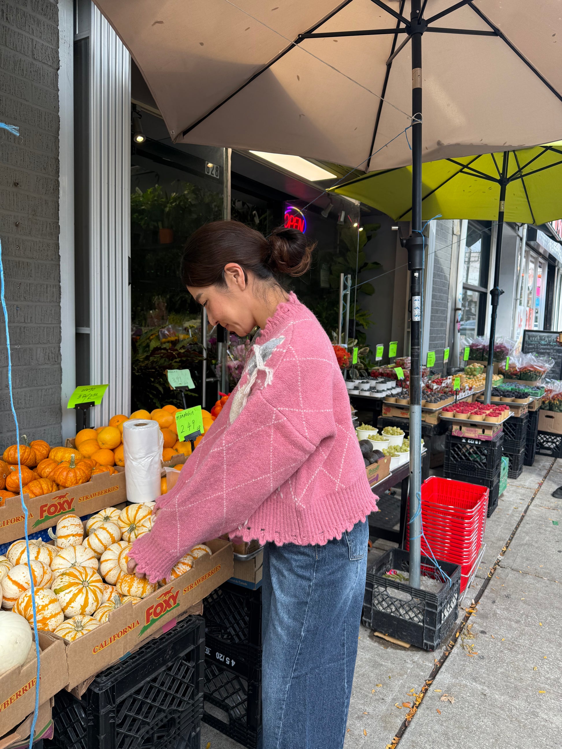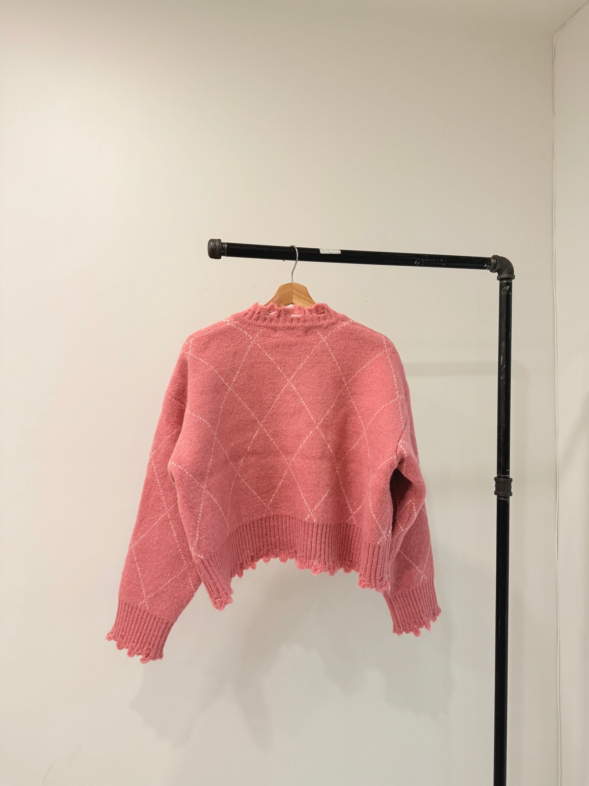 We love giving a classic pretty in pink a playful, whimsical twist! So say hello to our pink argyle knit cardigan featuring a button-up front closure, cable-knit detailing along the placket, and a ribbed crew neckline. Designed with long sleeves, ribbed cuffs, and a cropped hemline finished with subtle lettuce trim edges.