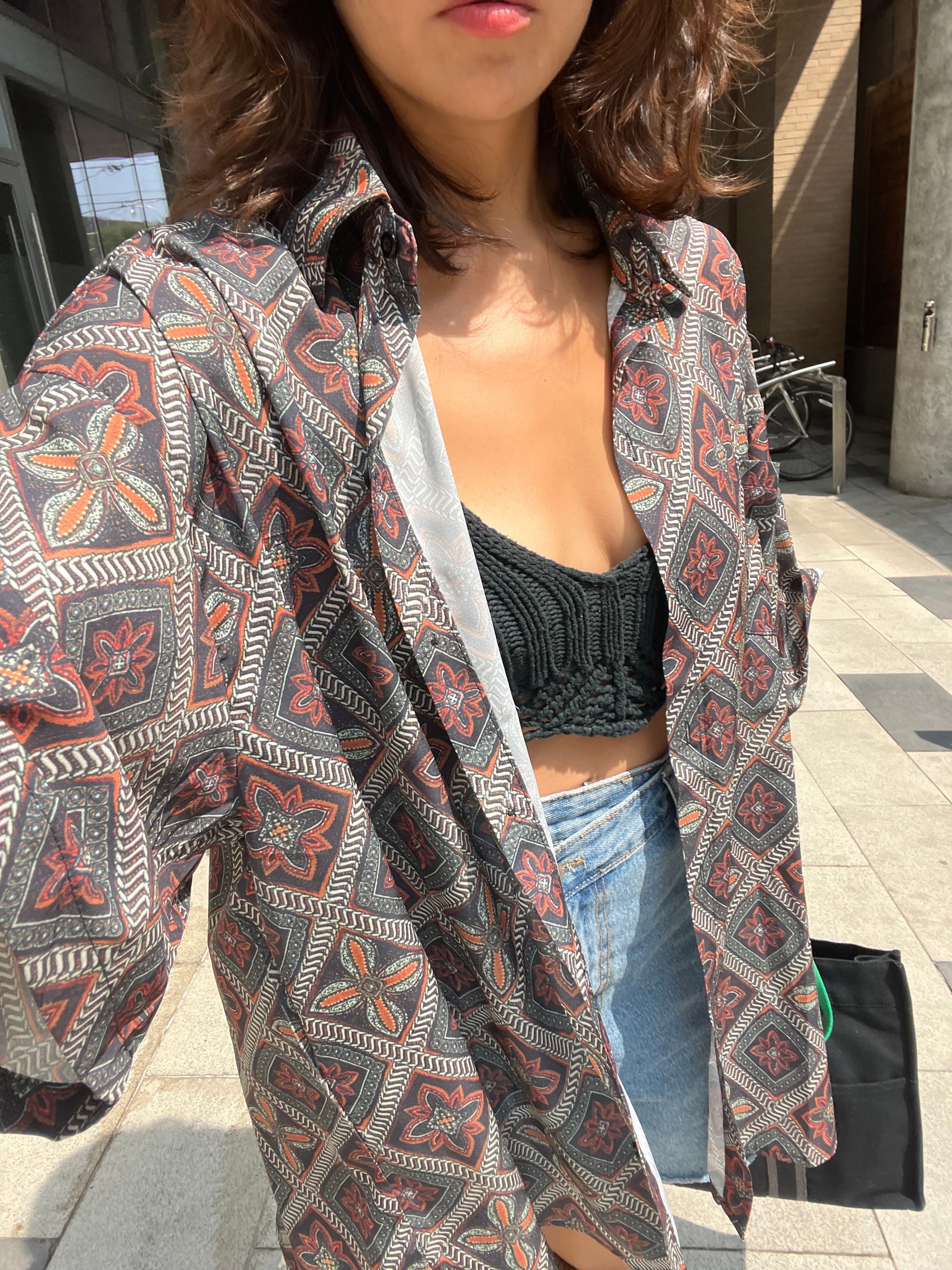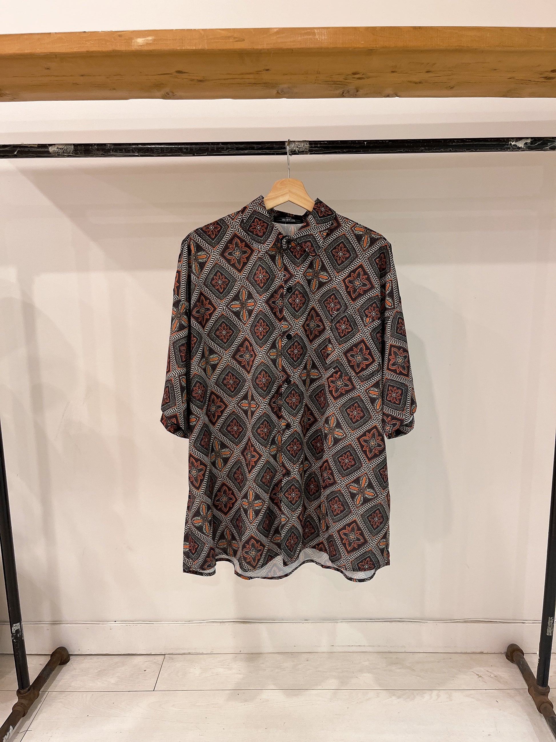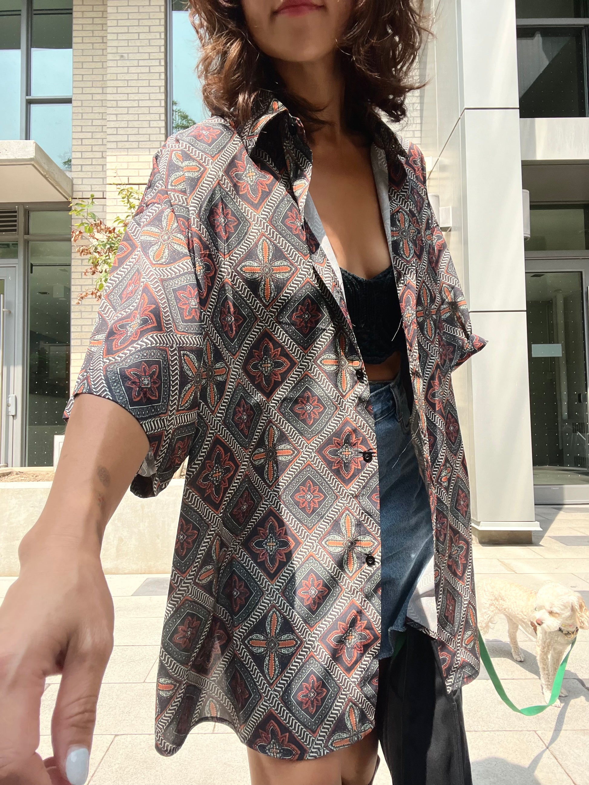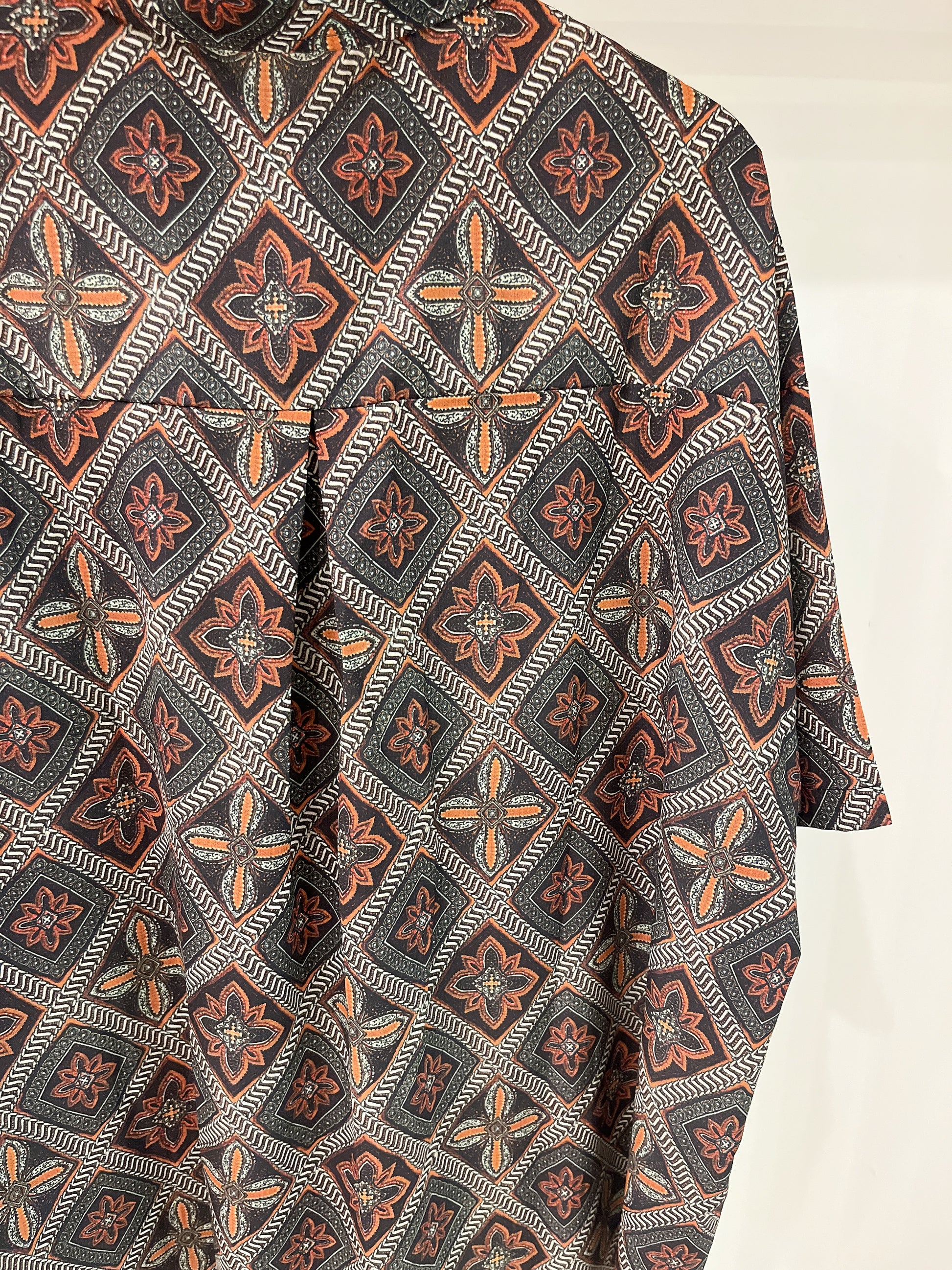 Perfectly oversized and unisex, our button-down shirt features a crisp collar, a gorgeous vibrant tropical print, black buttons and a front pocket on the left chest area.