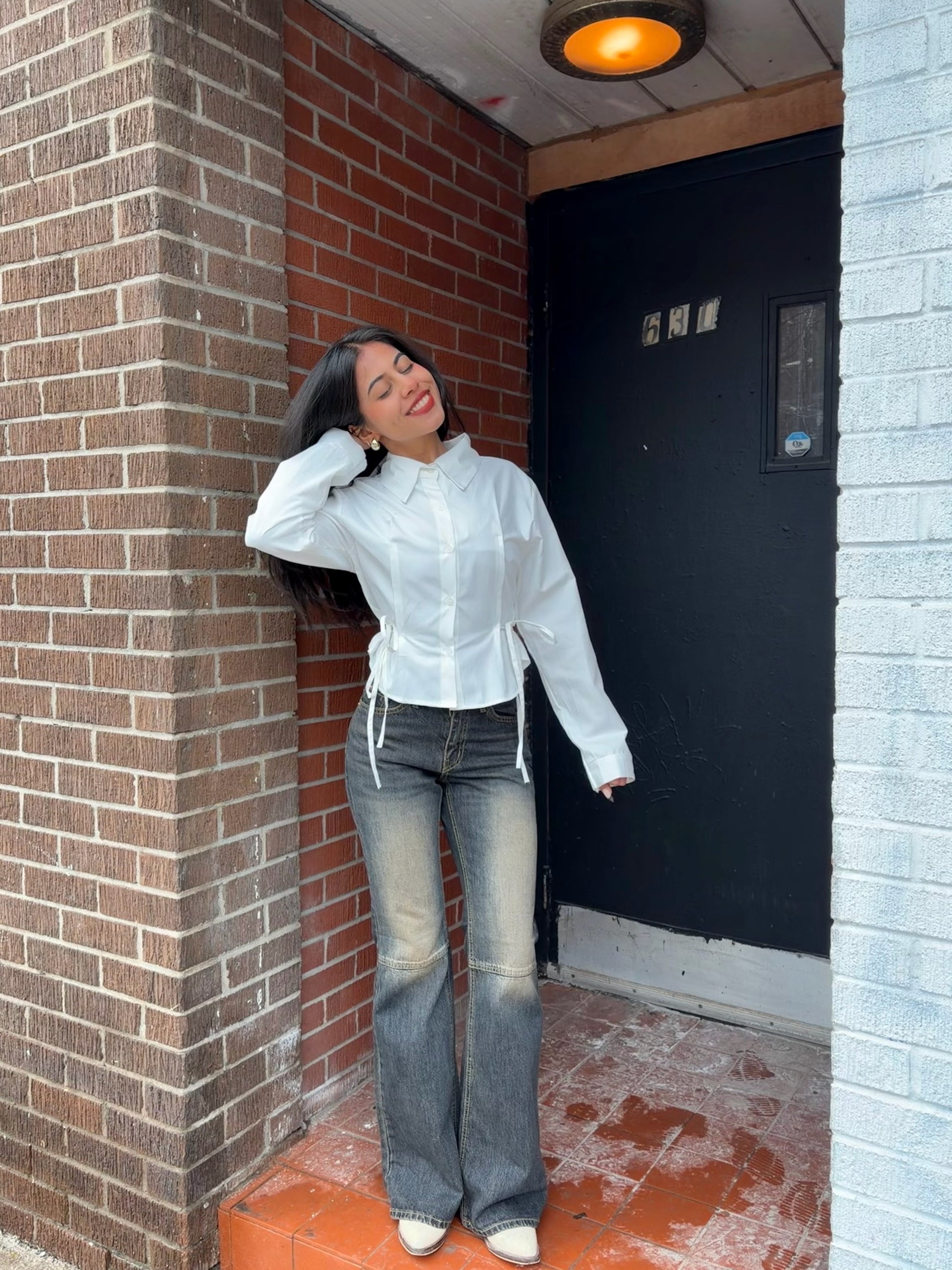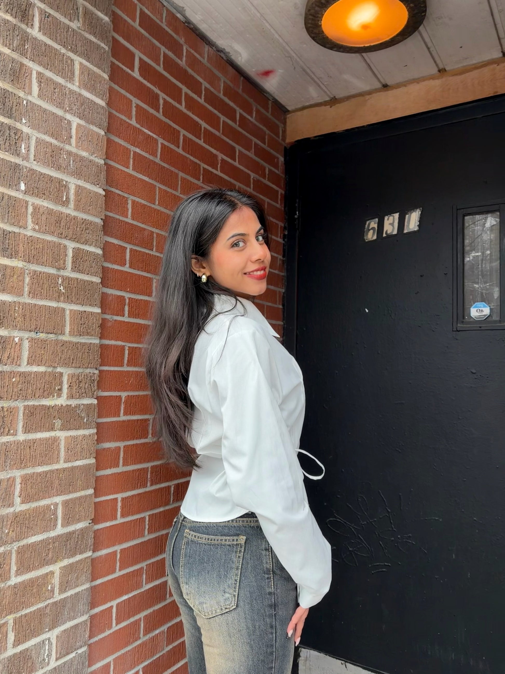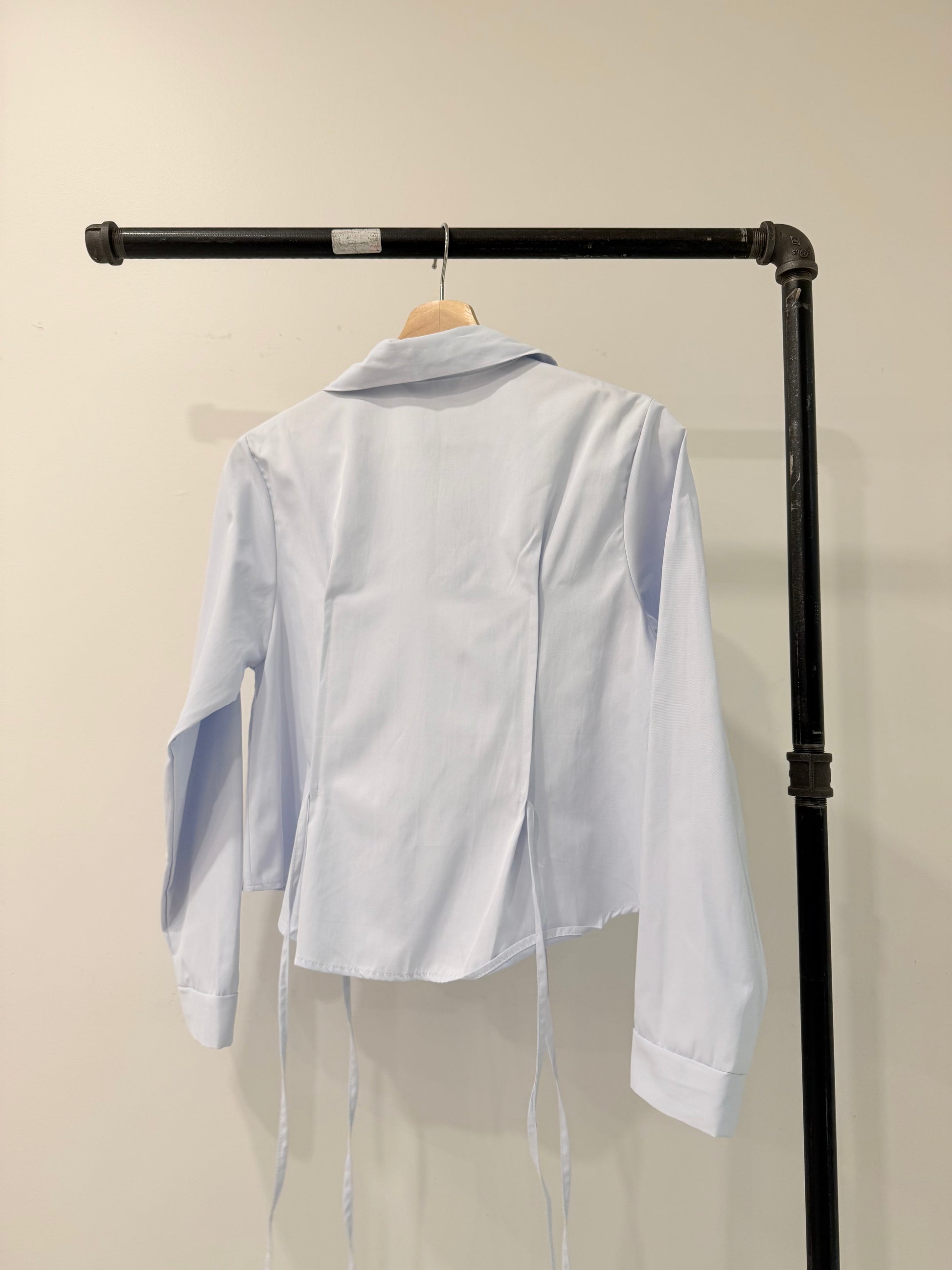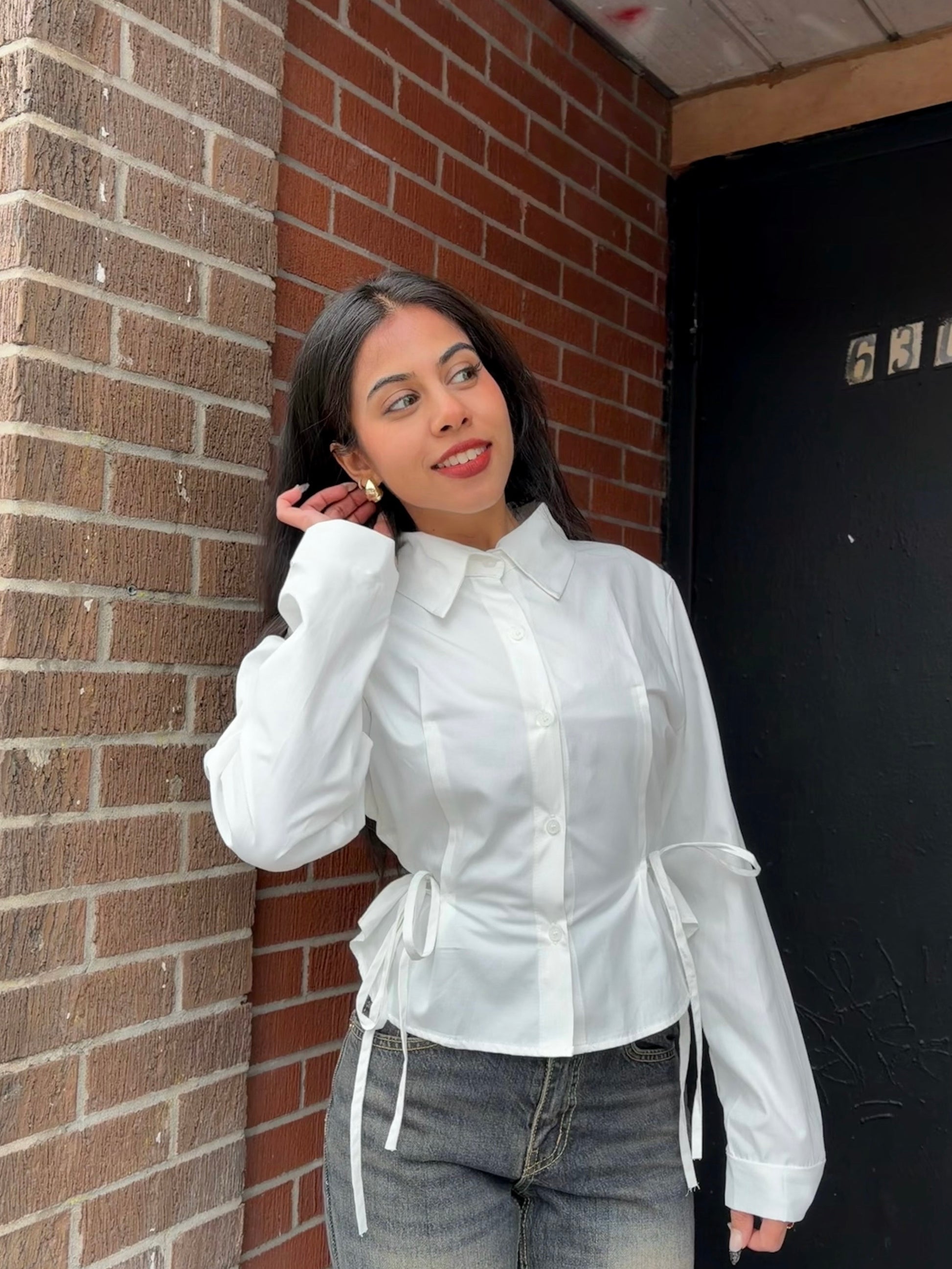 This one’s definitely going on your list of top cutie wardrobe staples. A button-up, full-sleeved shirt with a crisp collar and a softly rounded hemline, featuring panel stitching at the front and side ties that create a subtle scrunched, peplum-like shape. A classic silhouette with dainty, feminine details for an effortlessly girly look. Available in blue, white, and black.