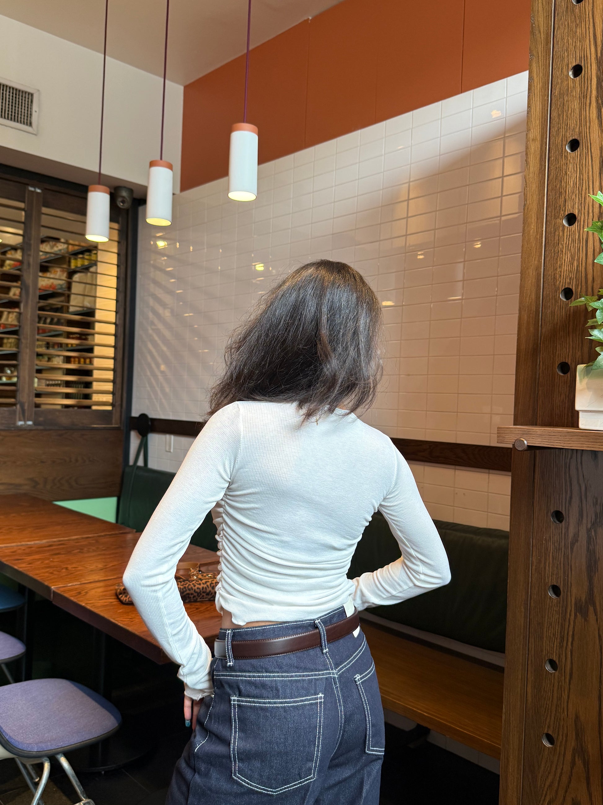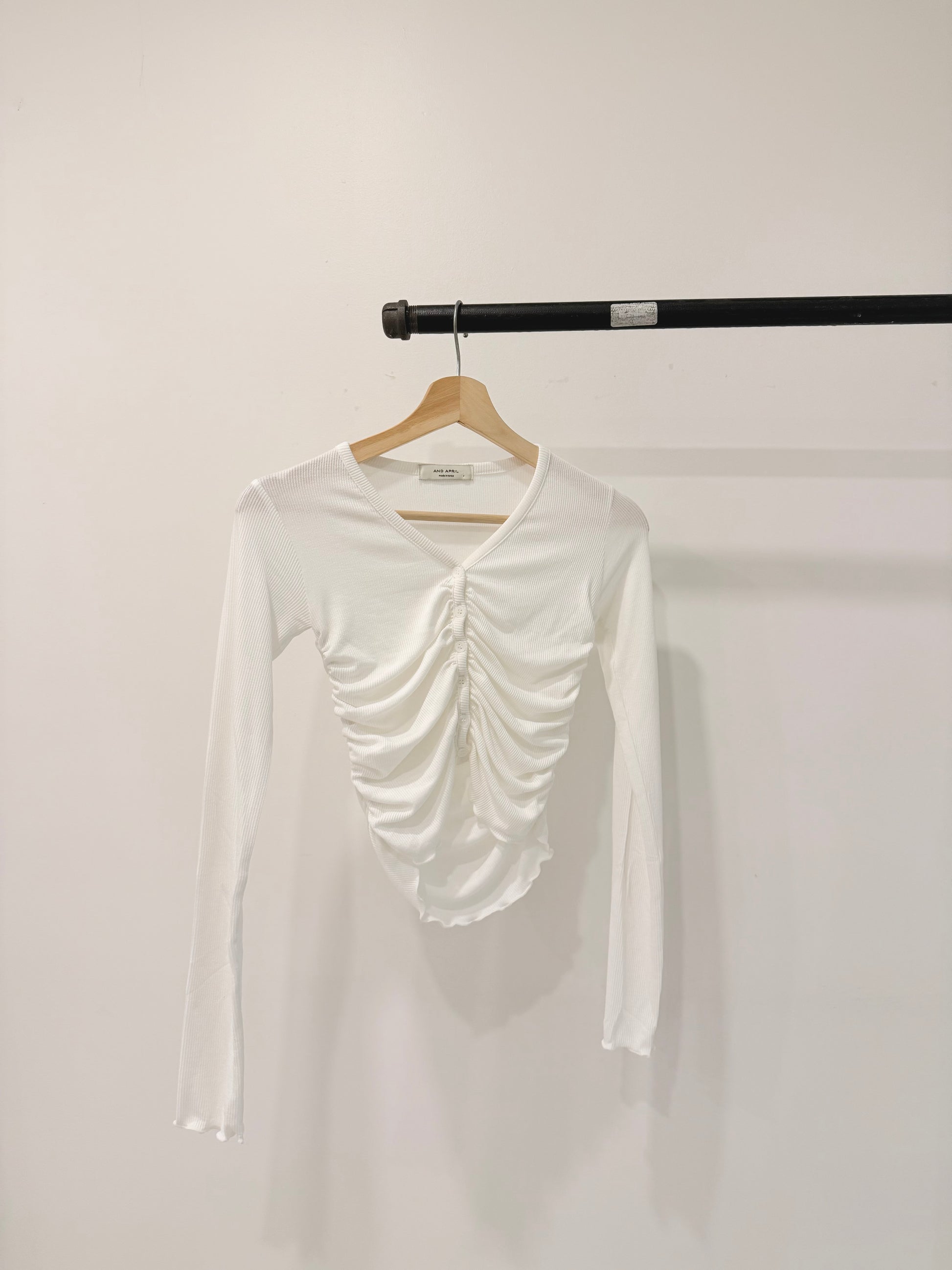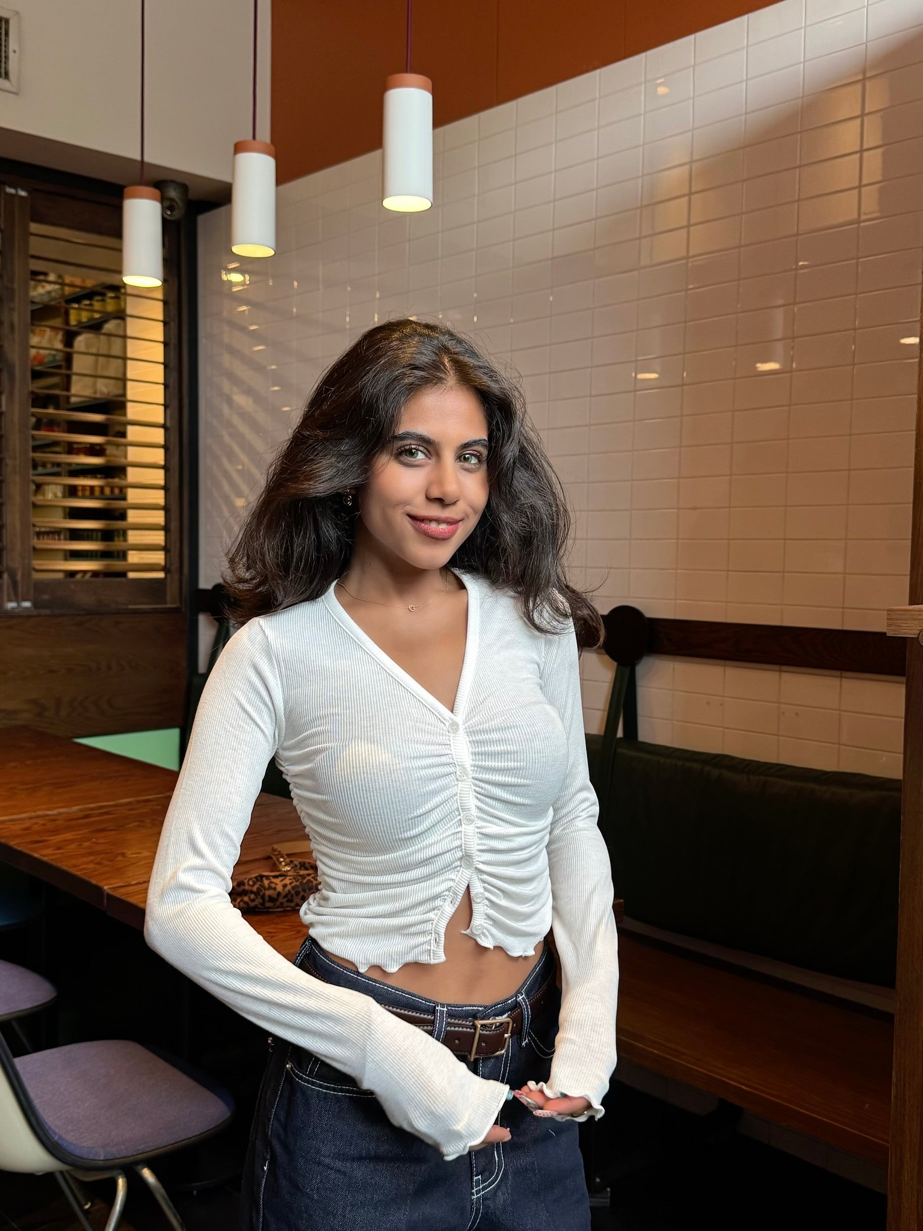 Cinched and sexy this fall, this shirt’s got stunning details to spare. A ruched button-up with full sleeves, allover ribbing, a flattering V-neckline, and delicate lettuce trim at the hem and cuffs. Extra ruching along the open front and a slightly cropped cut give you that perfectly cinched, curve-hugging fit. Lightweight, soft, and ribbed — it’s the effortless it-girl pick for the season. Available in classic black, brown and white.