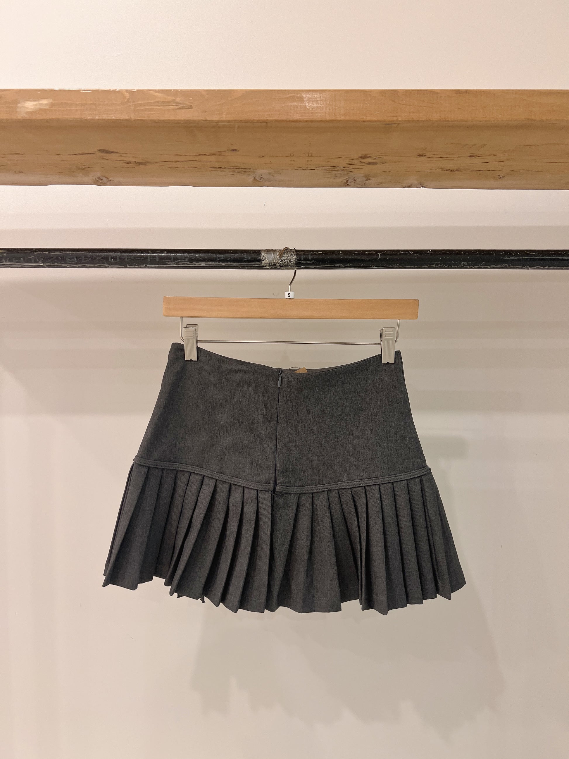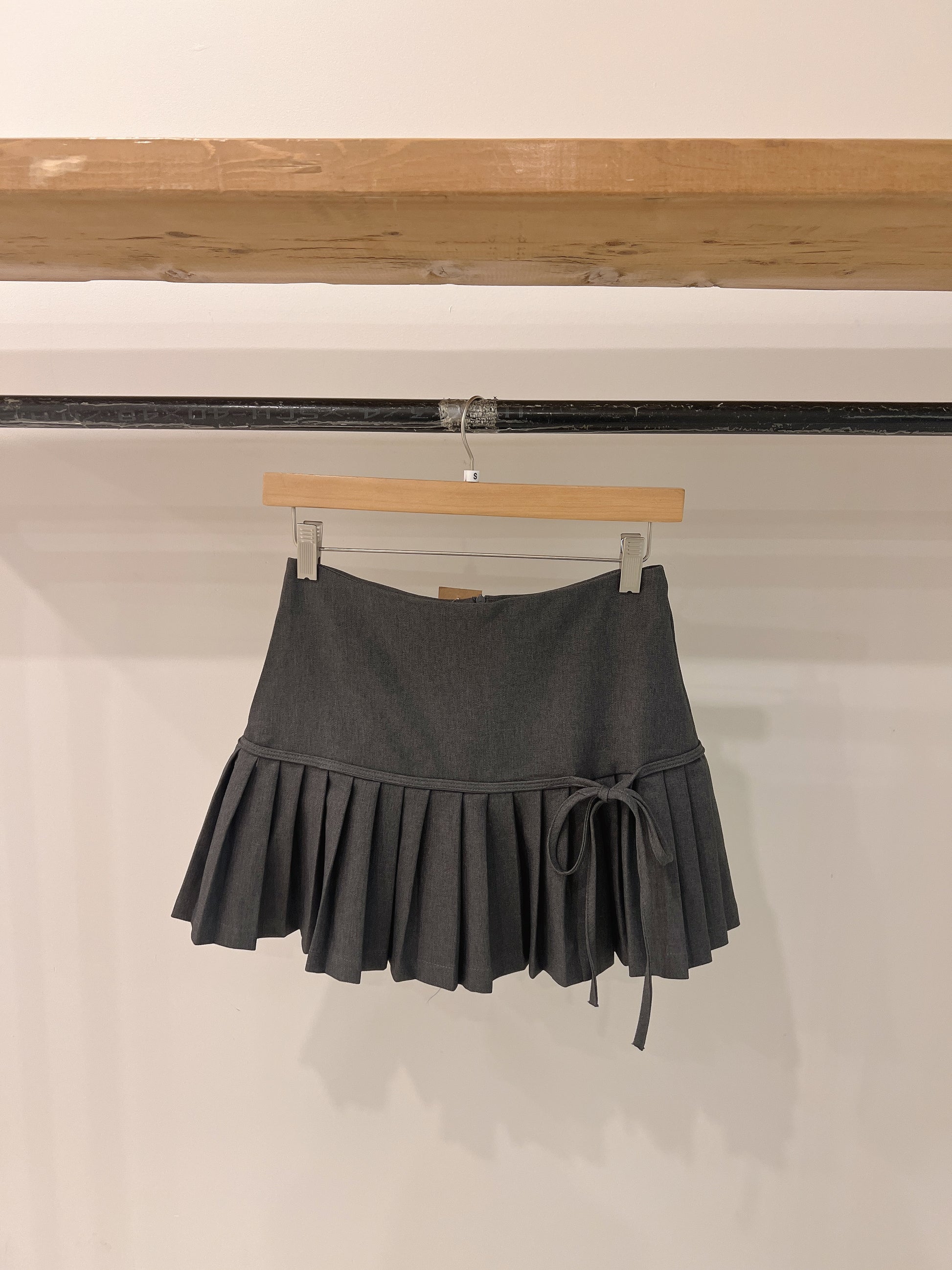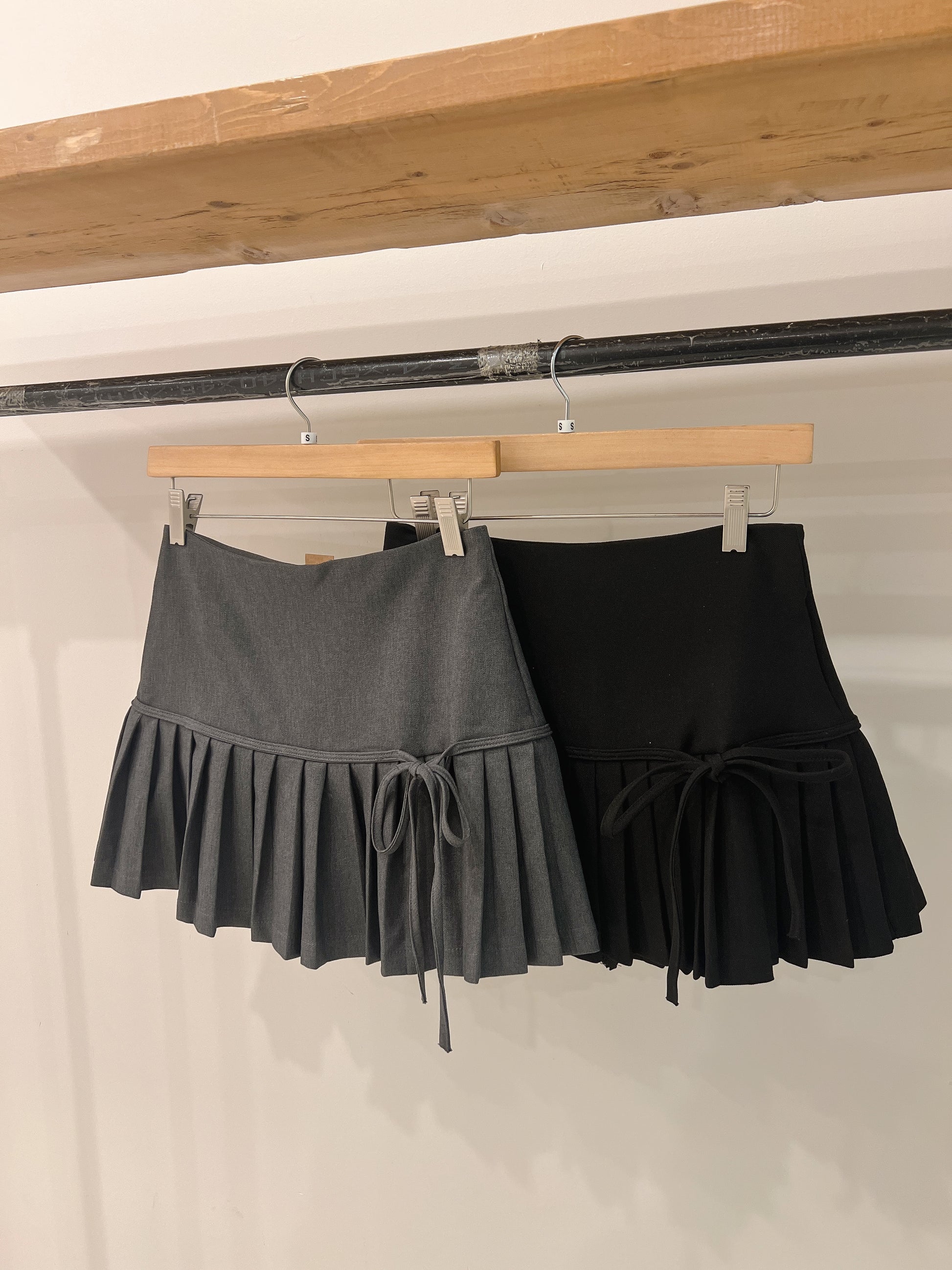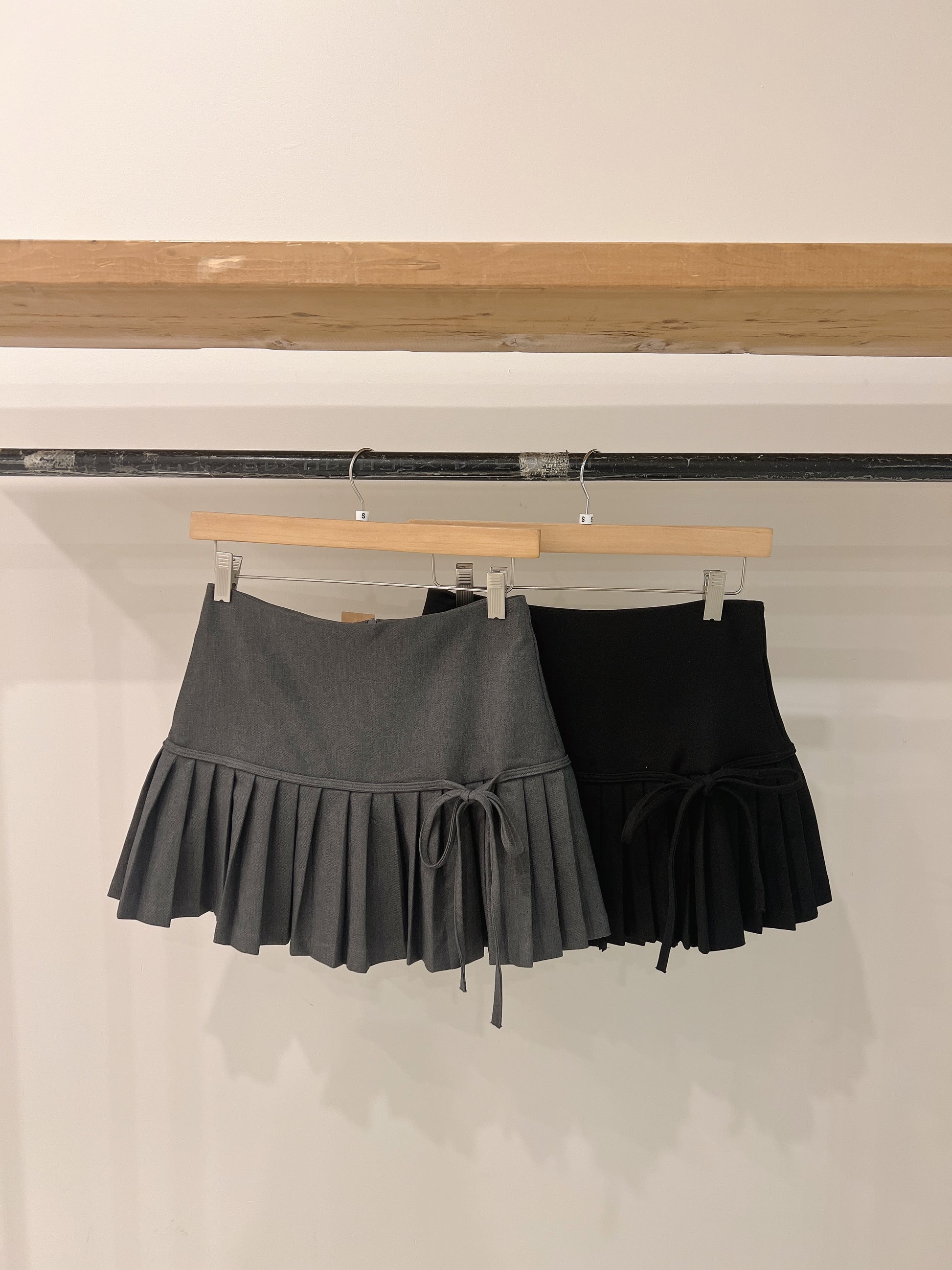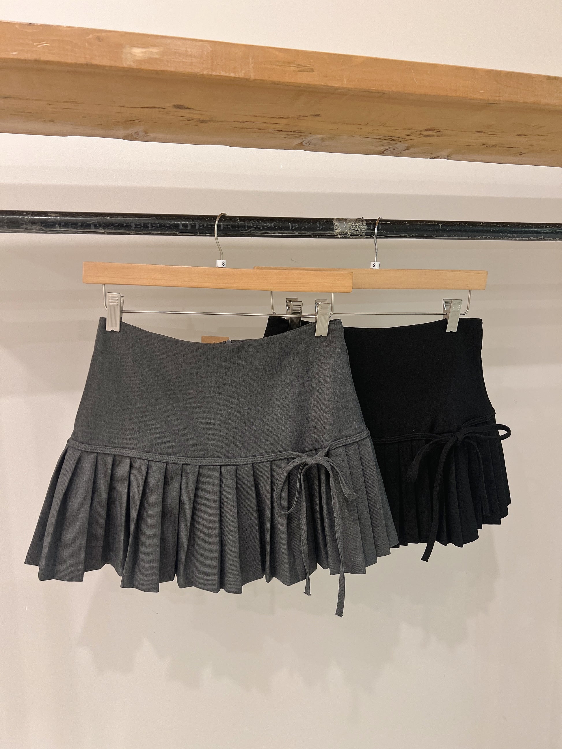 Embrace pleated perfection in our stylish pleated mini skirt with tip-up ribbon detail, a discreet side zipper and fitted feel. Now available in black and grey.