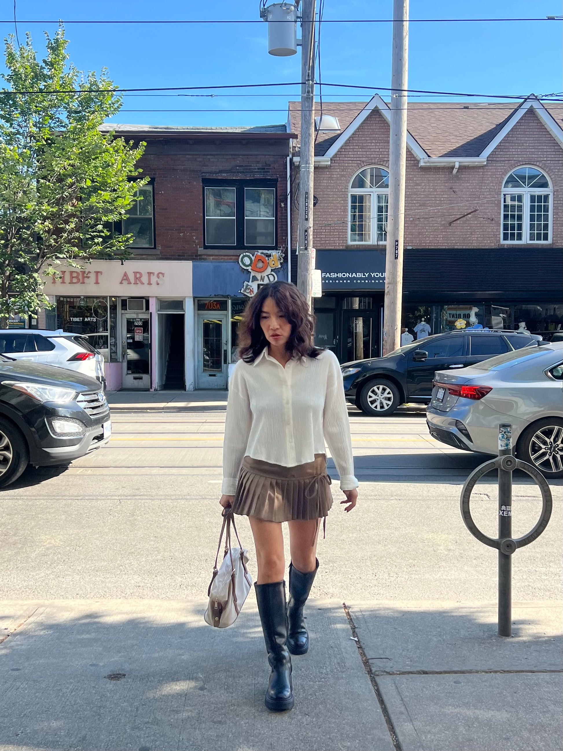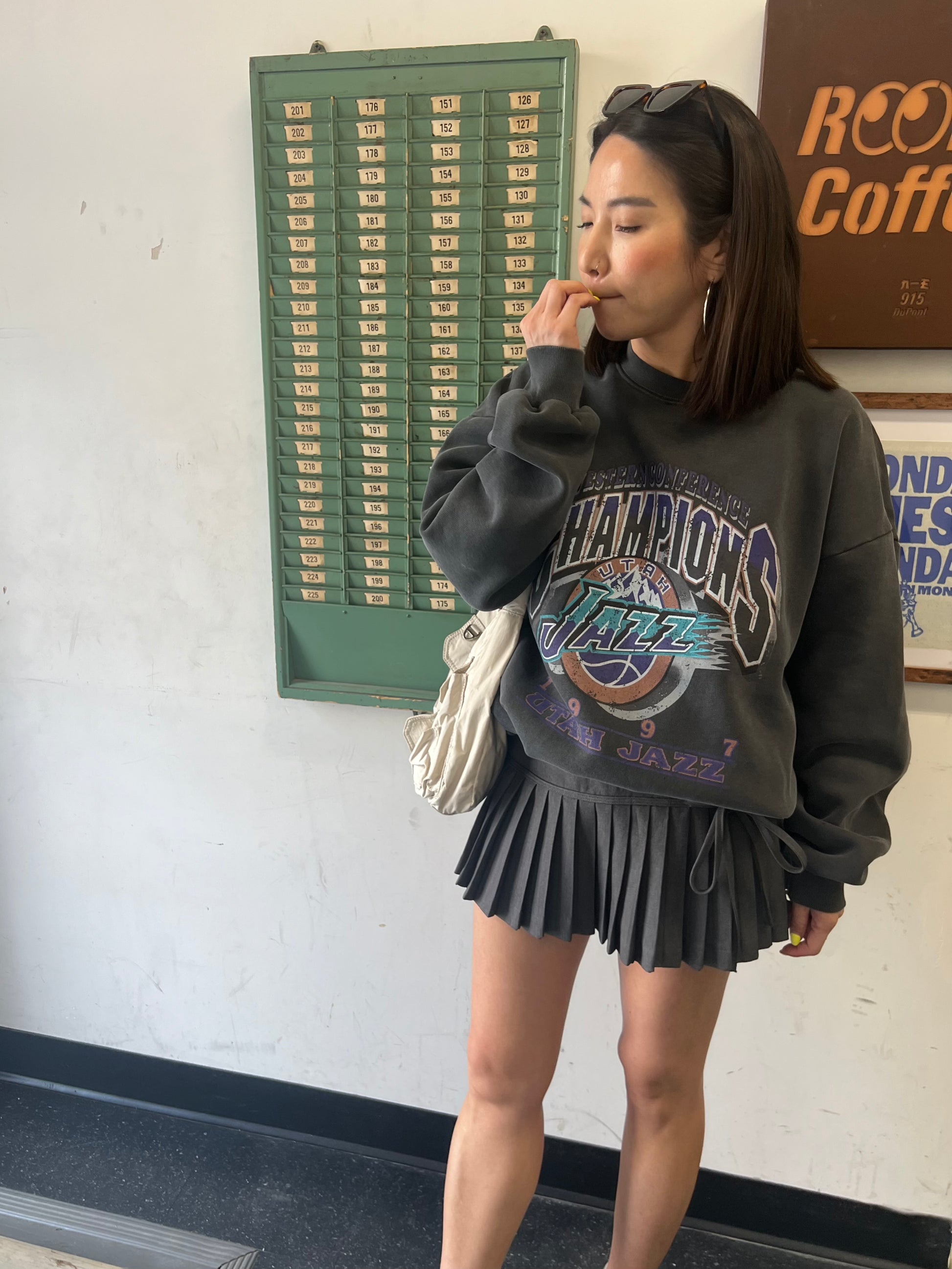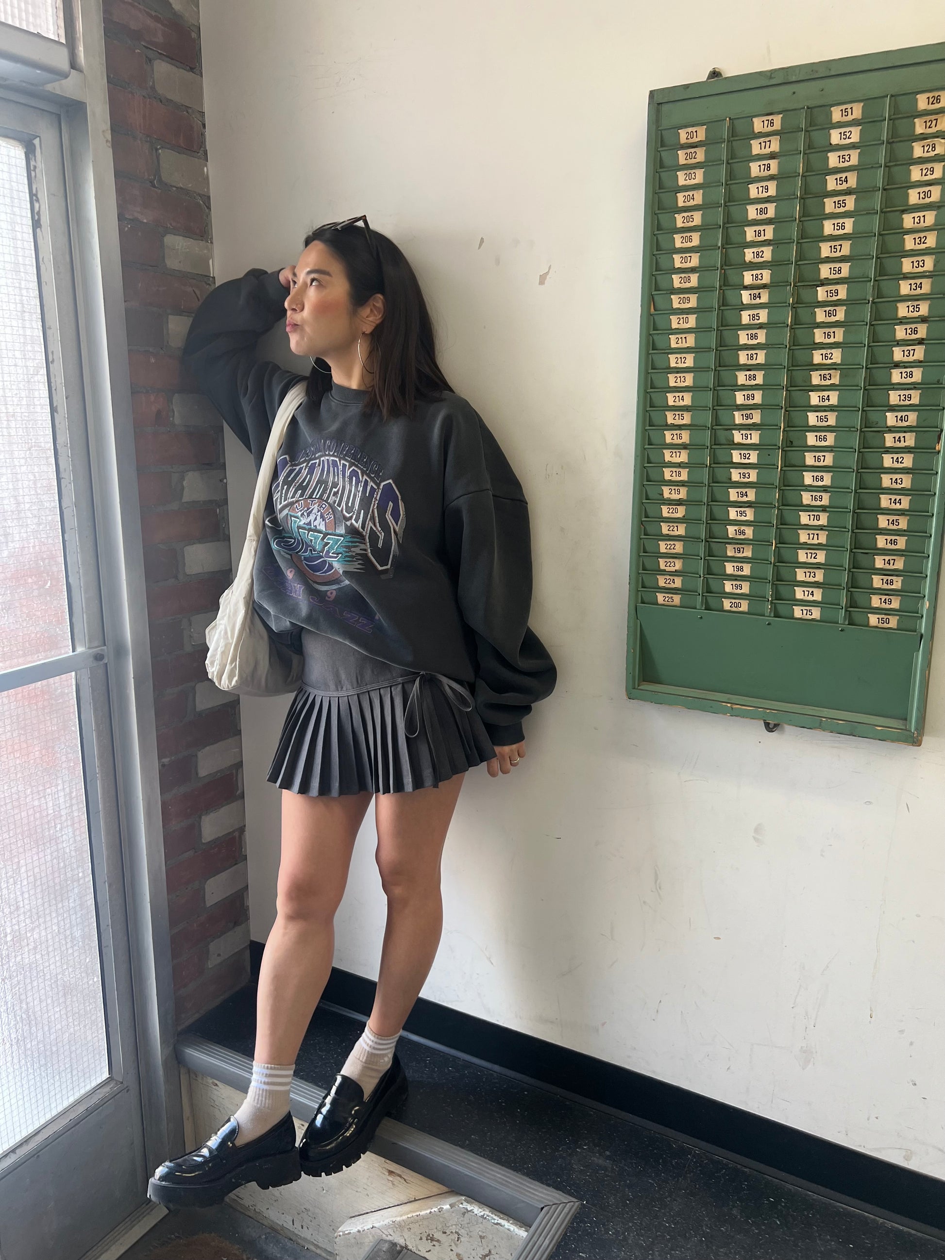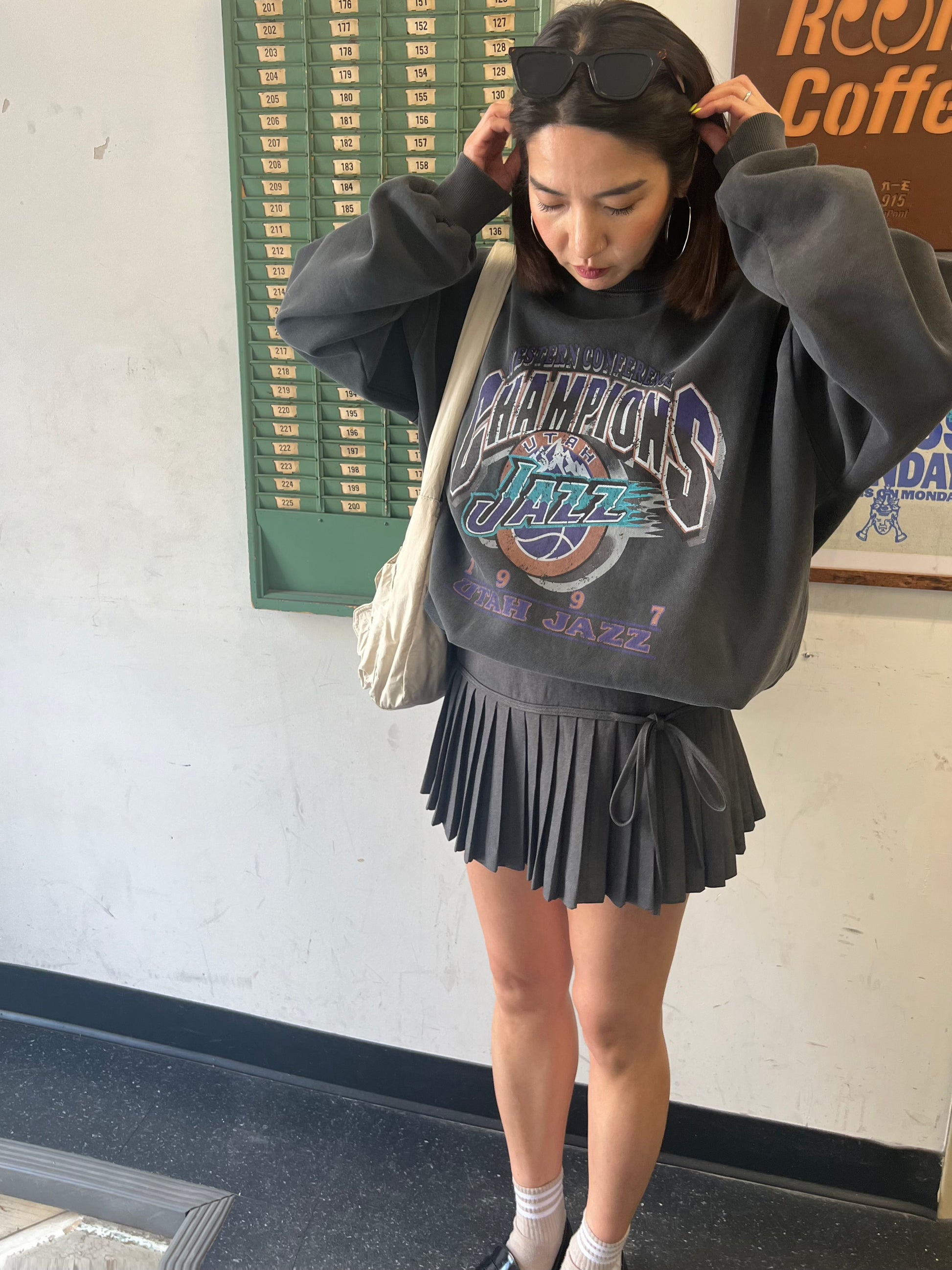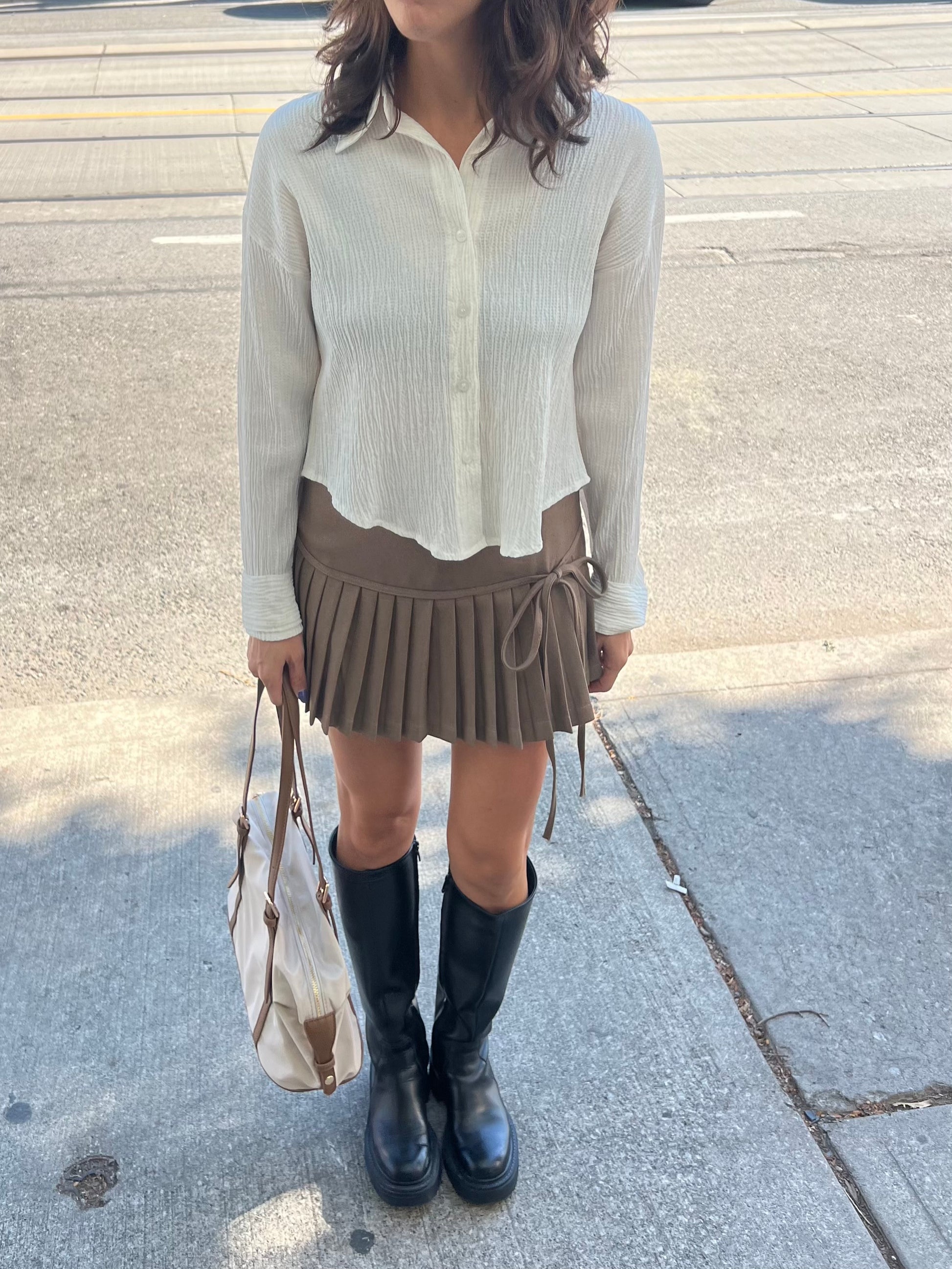 Embrace pleated perfection in our stylish pleated mini skirt with tip-up ribbon detail, a discreet side zipper and fitted feel. Now available in black and grey.