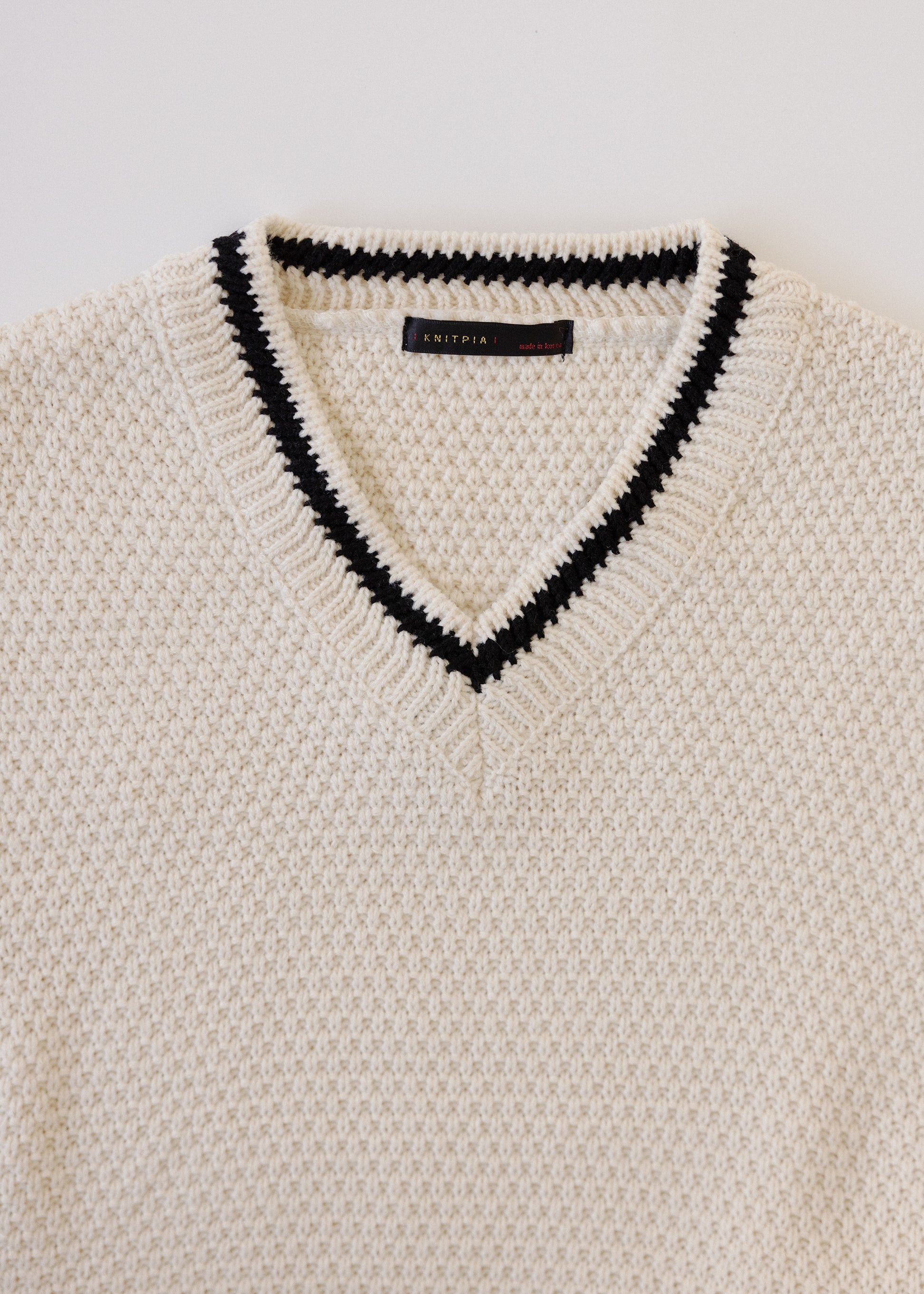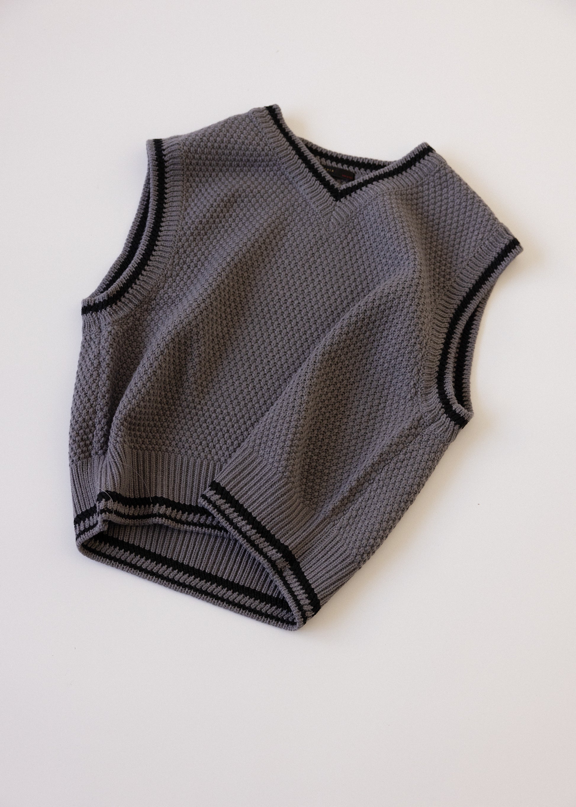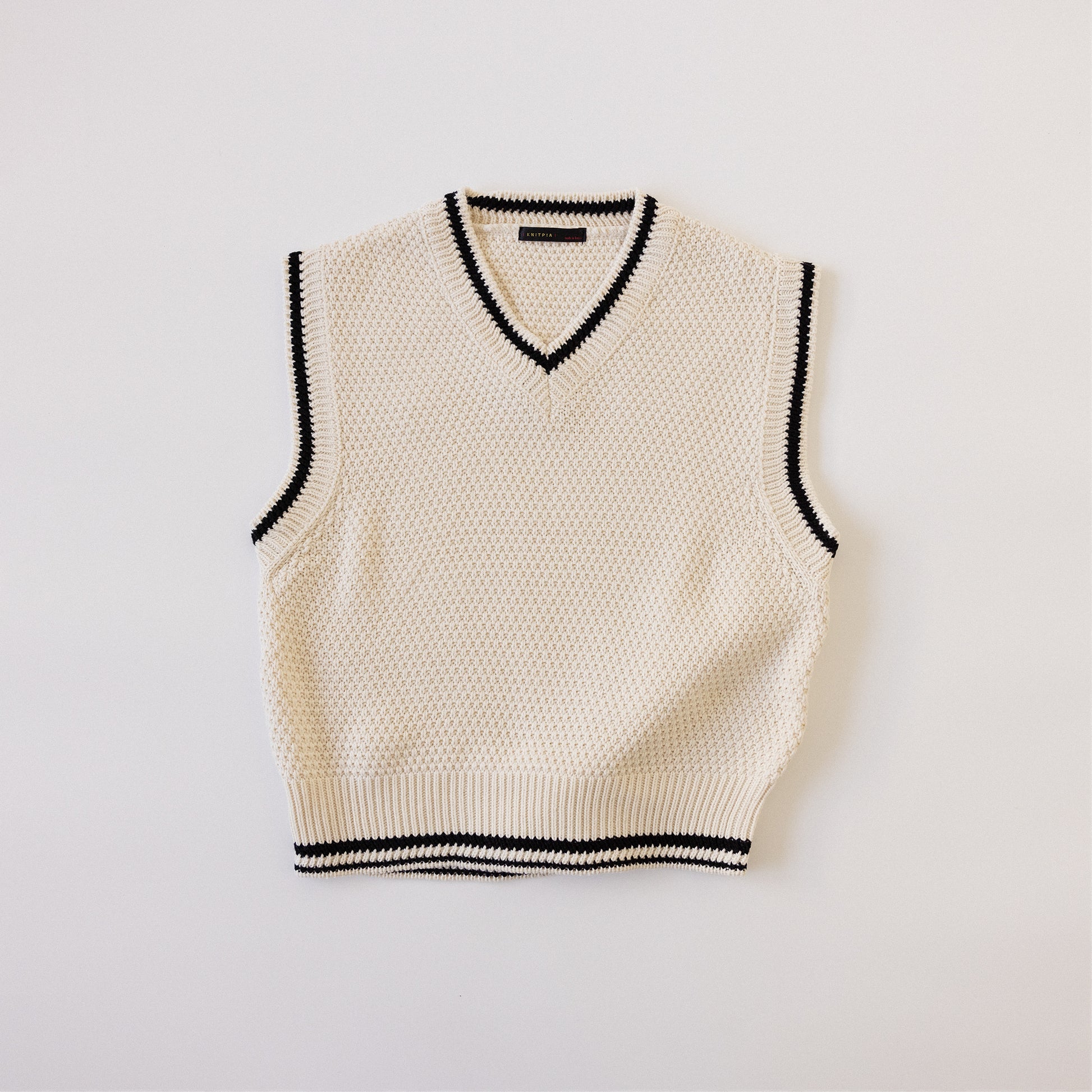 Time to cozy up slowly and playfully! So, say hello to our knitted vest with contrast stripes along the edges and hemline, finished with a classic V-neckline and ribbed empire detail for that perfectly scrunched look. Layer it, love it — your transition fits are officially sorted. Available in black and cream.