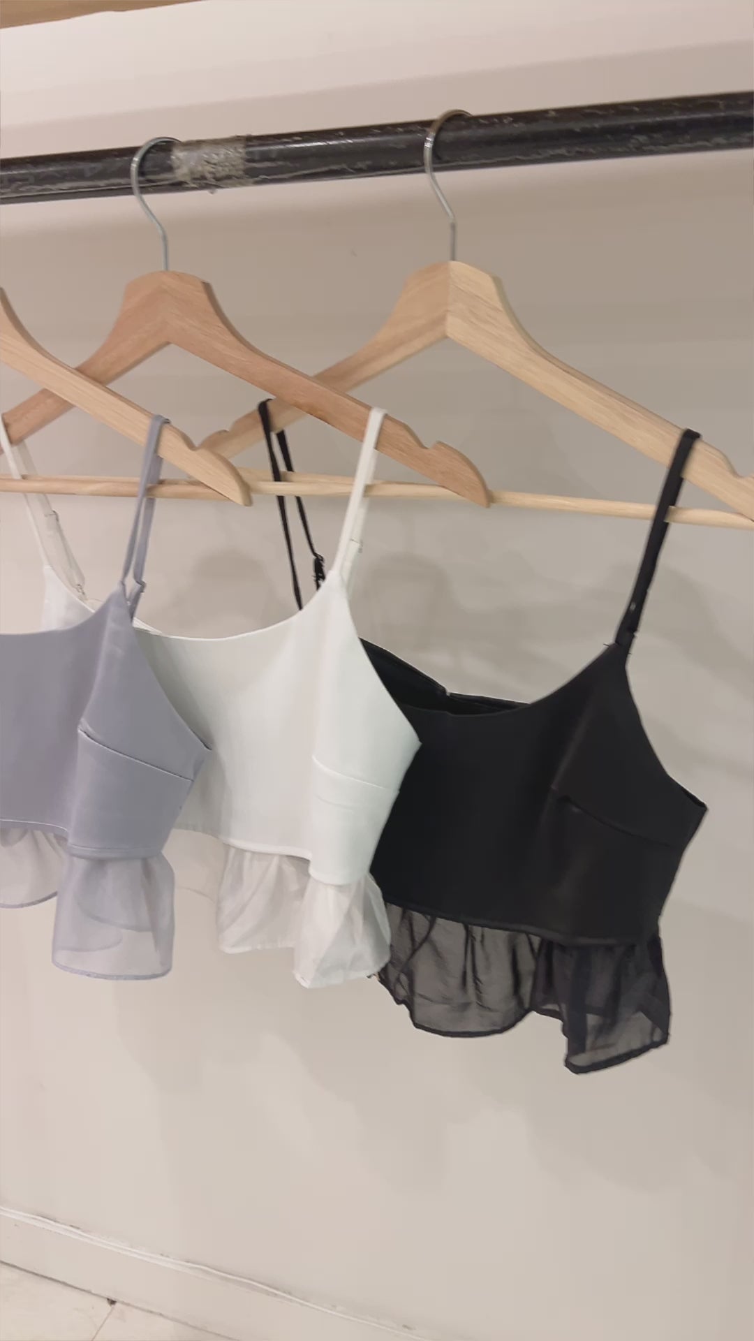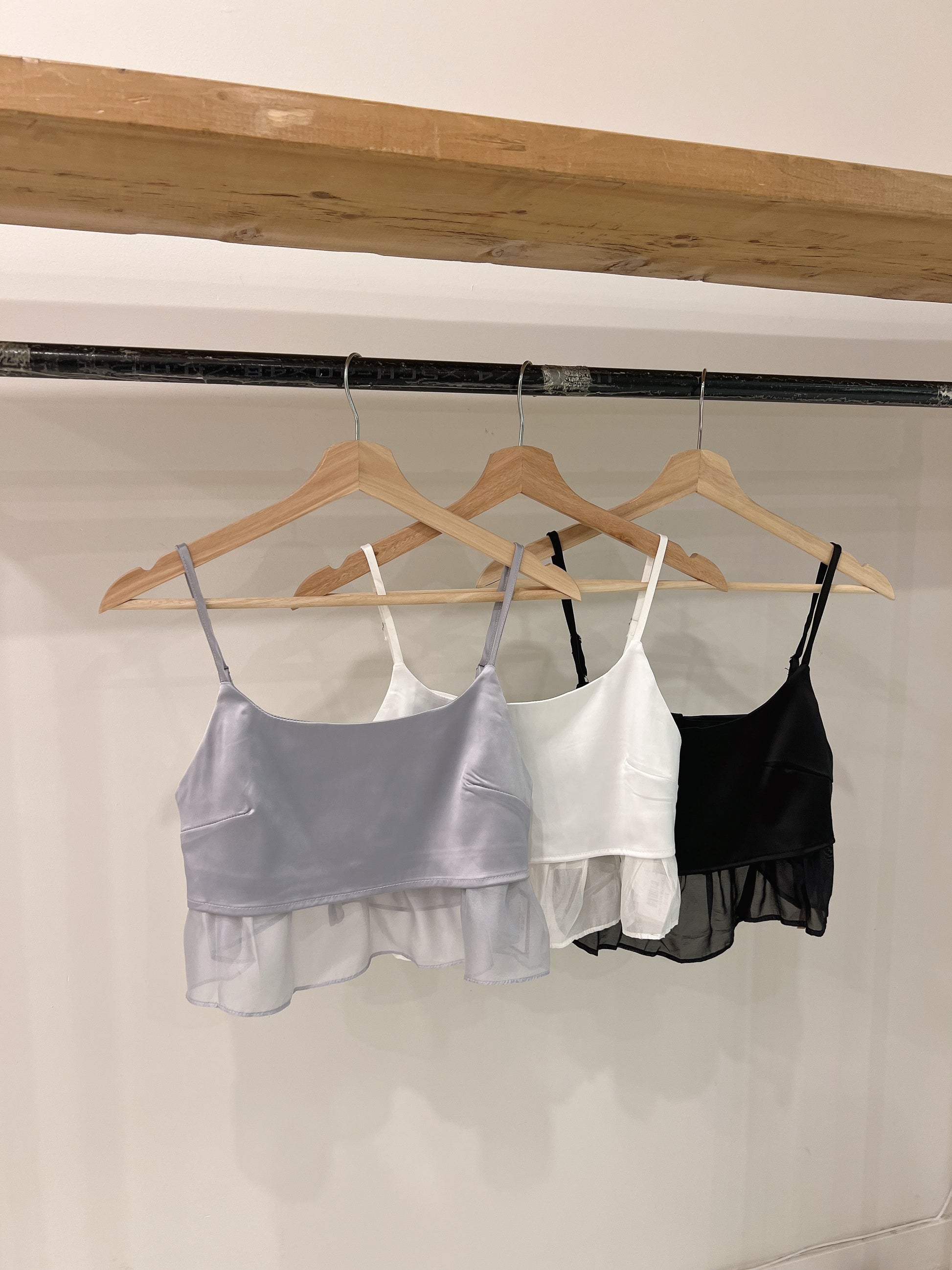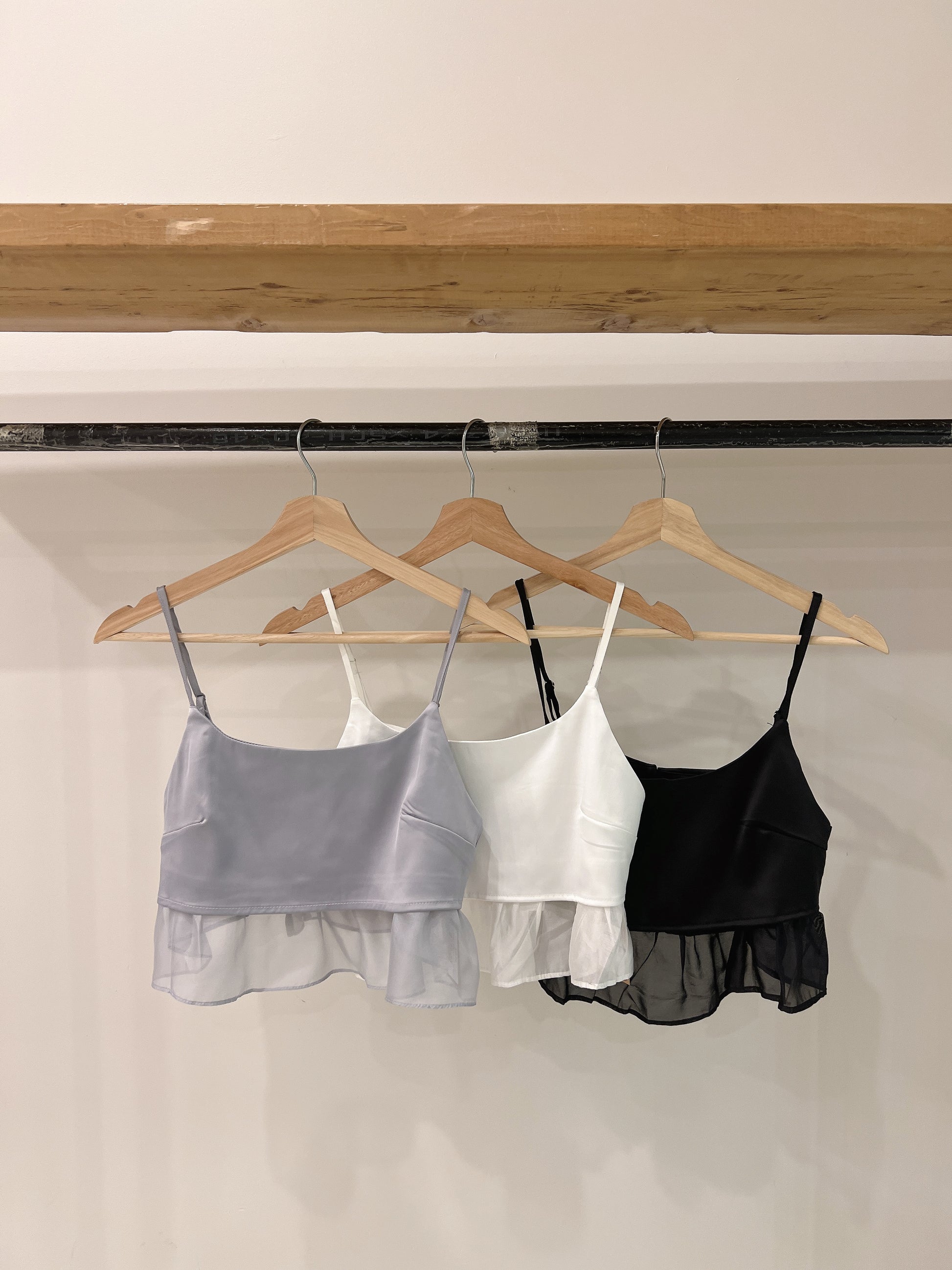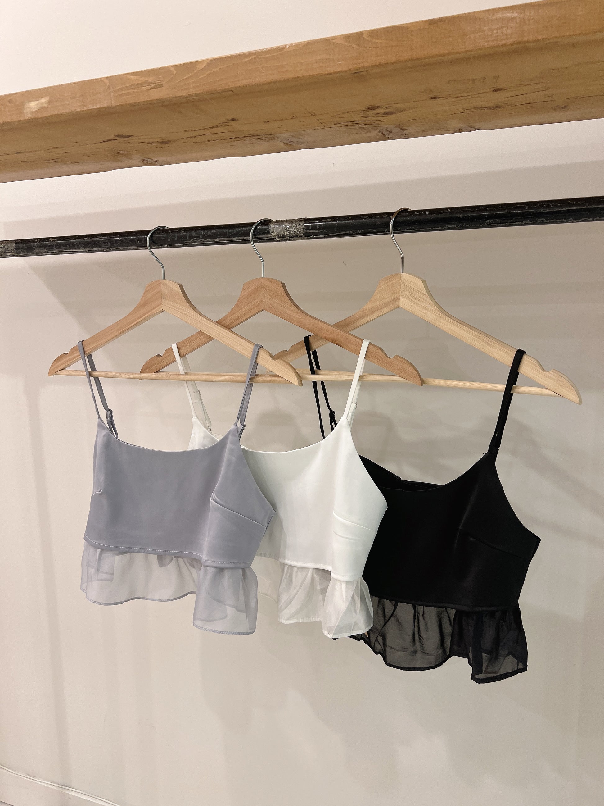 Our adorable silk bra top with peplum mesh hem detail and adjustable noodle straps gives you the cutest light and breezy look this summer. Now available in black, grey and white