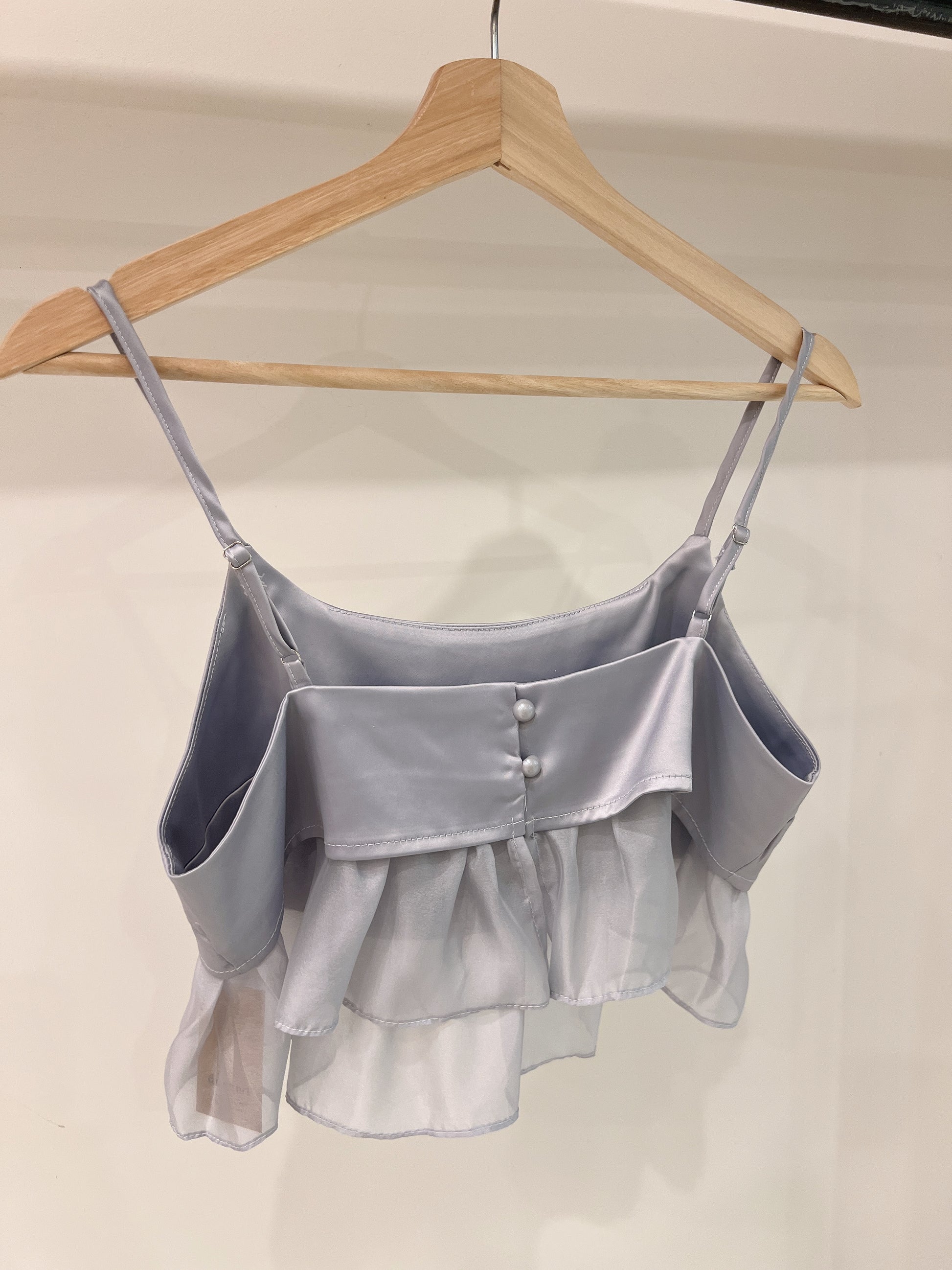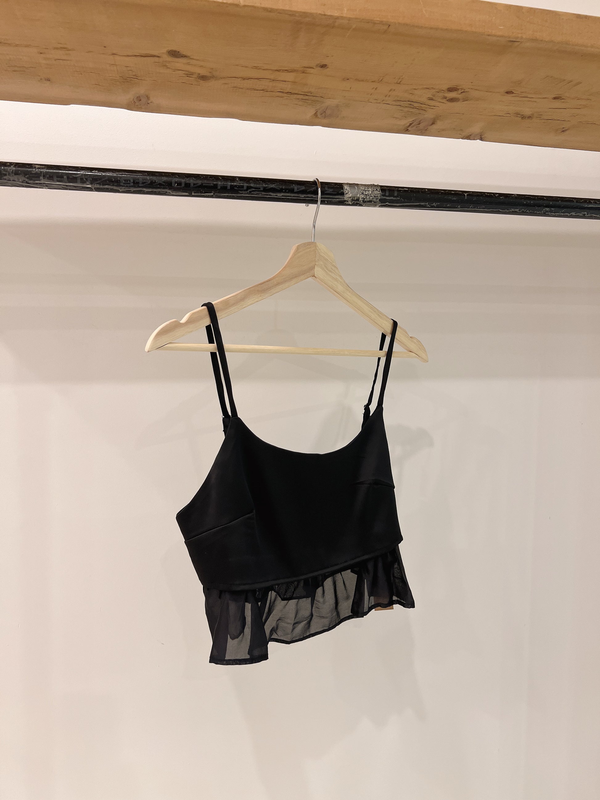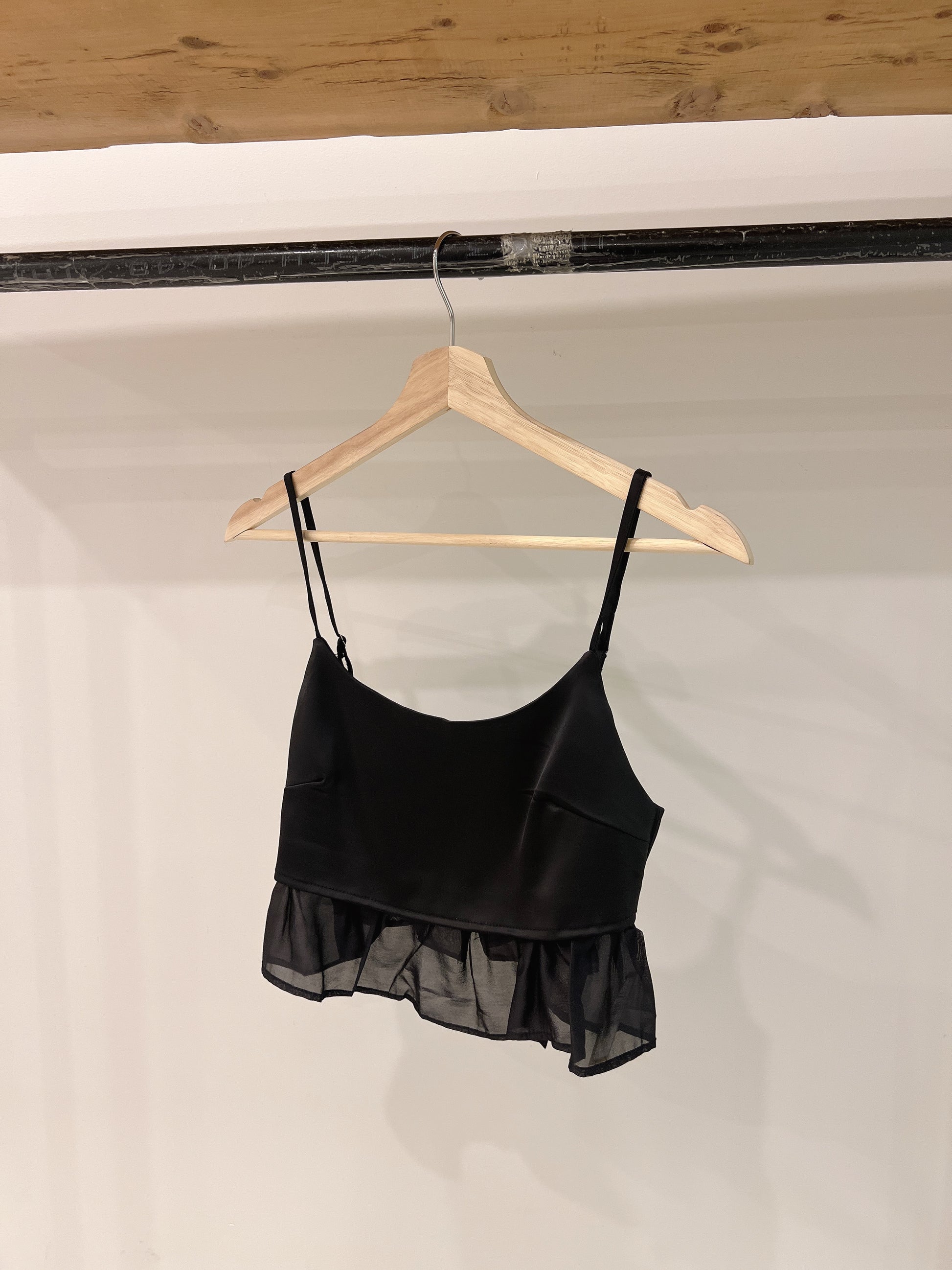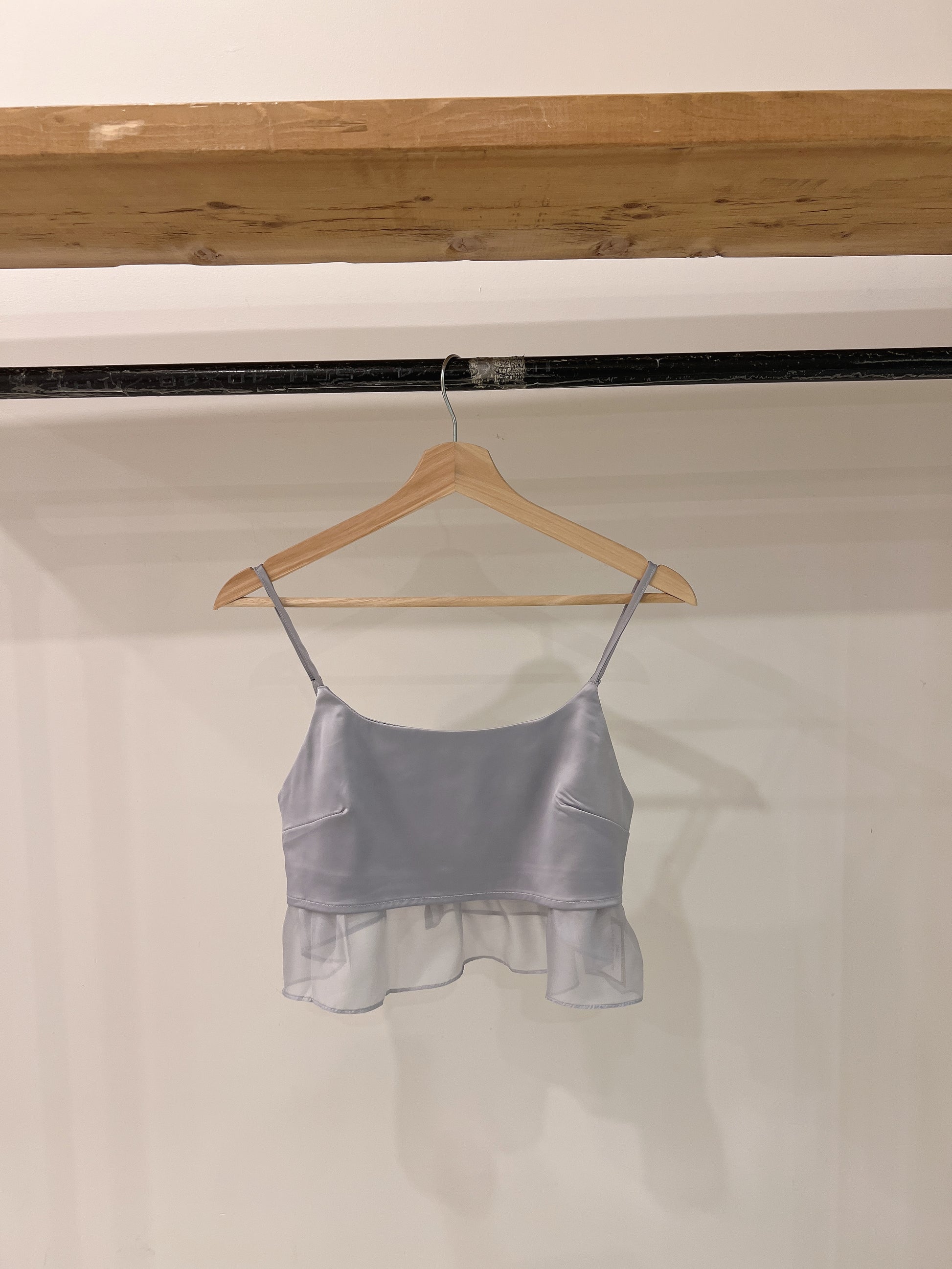 Our adorable silk bra top with peplum mesh hem detail and adjustable noodle straps gives you the cutest light and breezy look this summer. Now available in black, grey and white