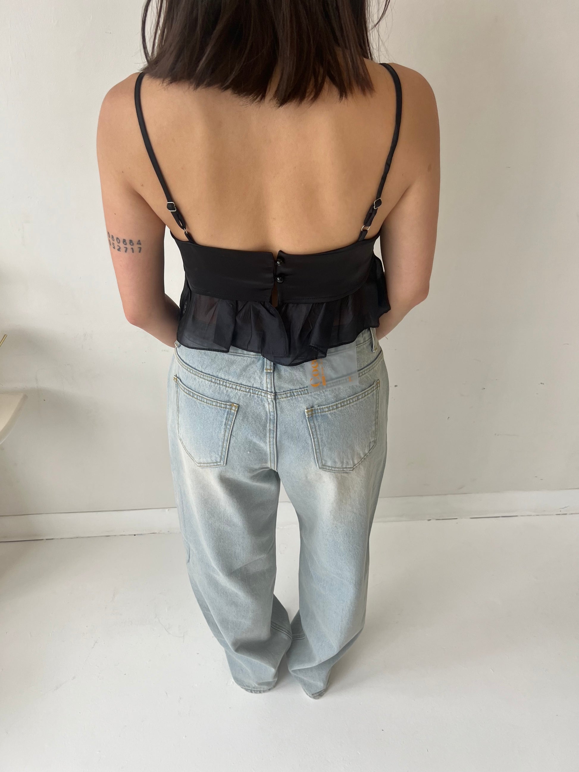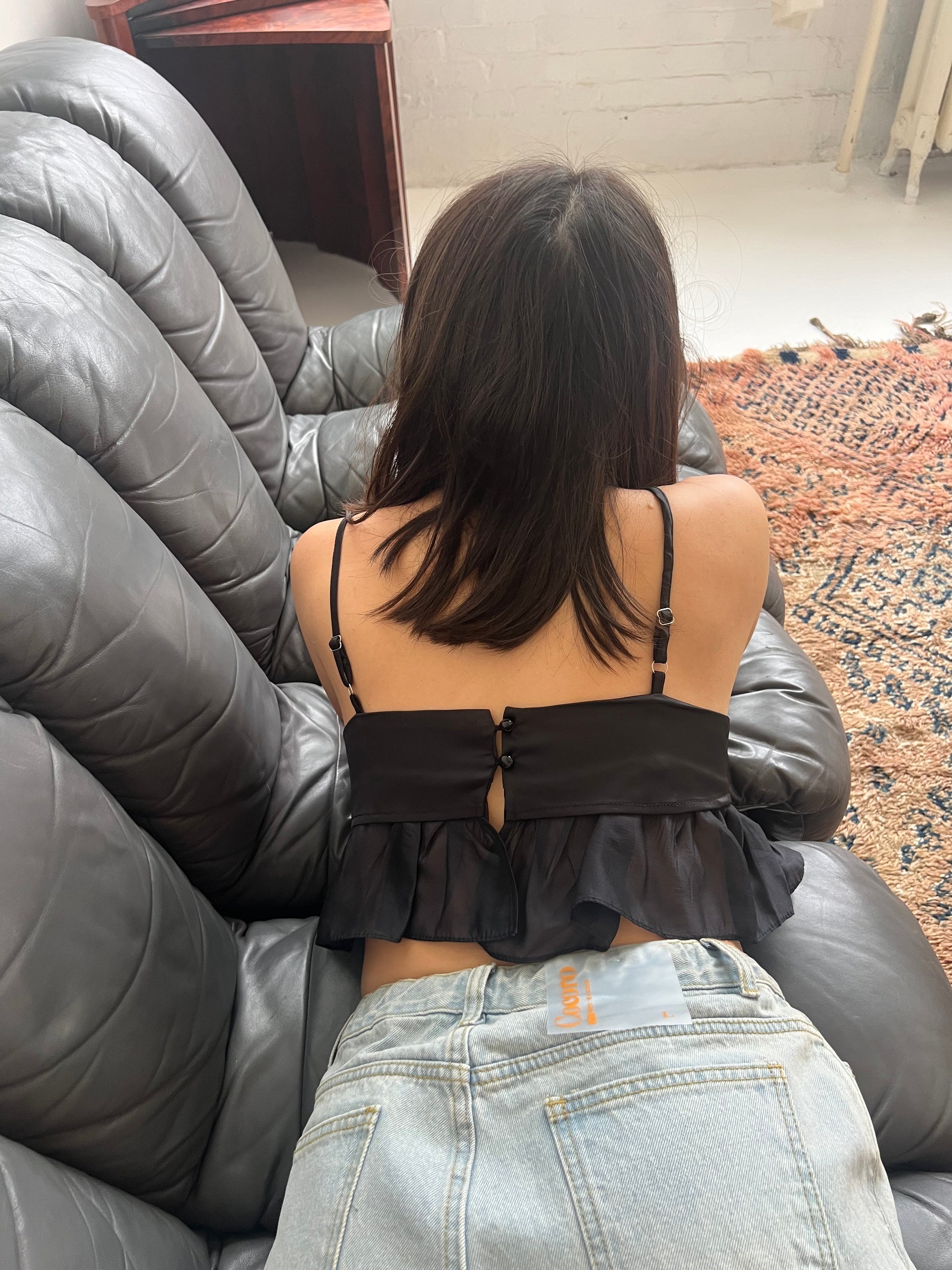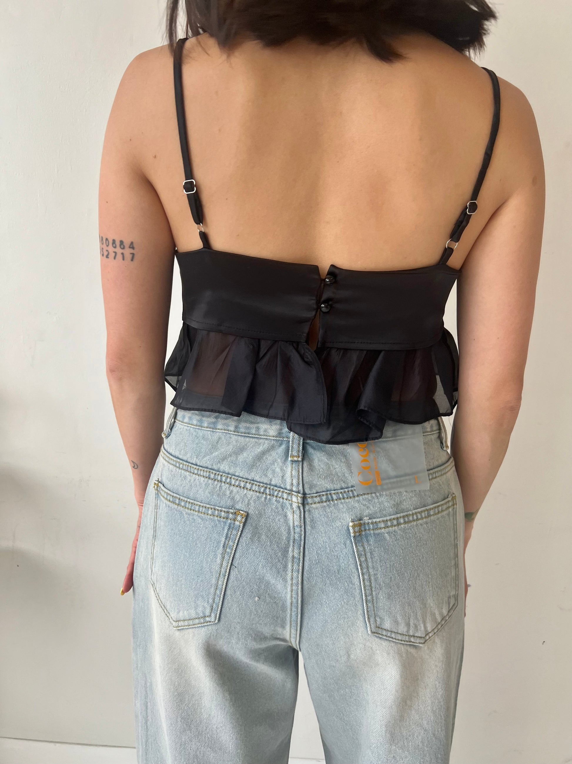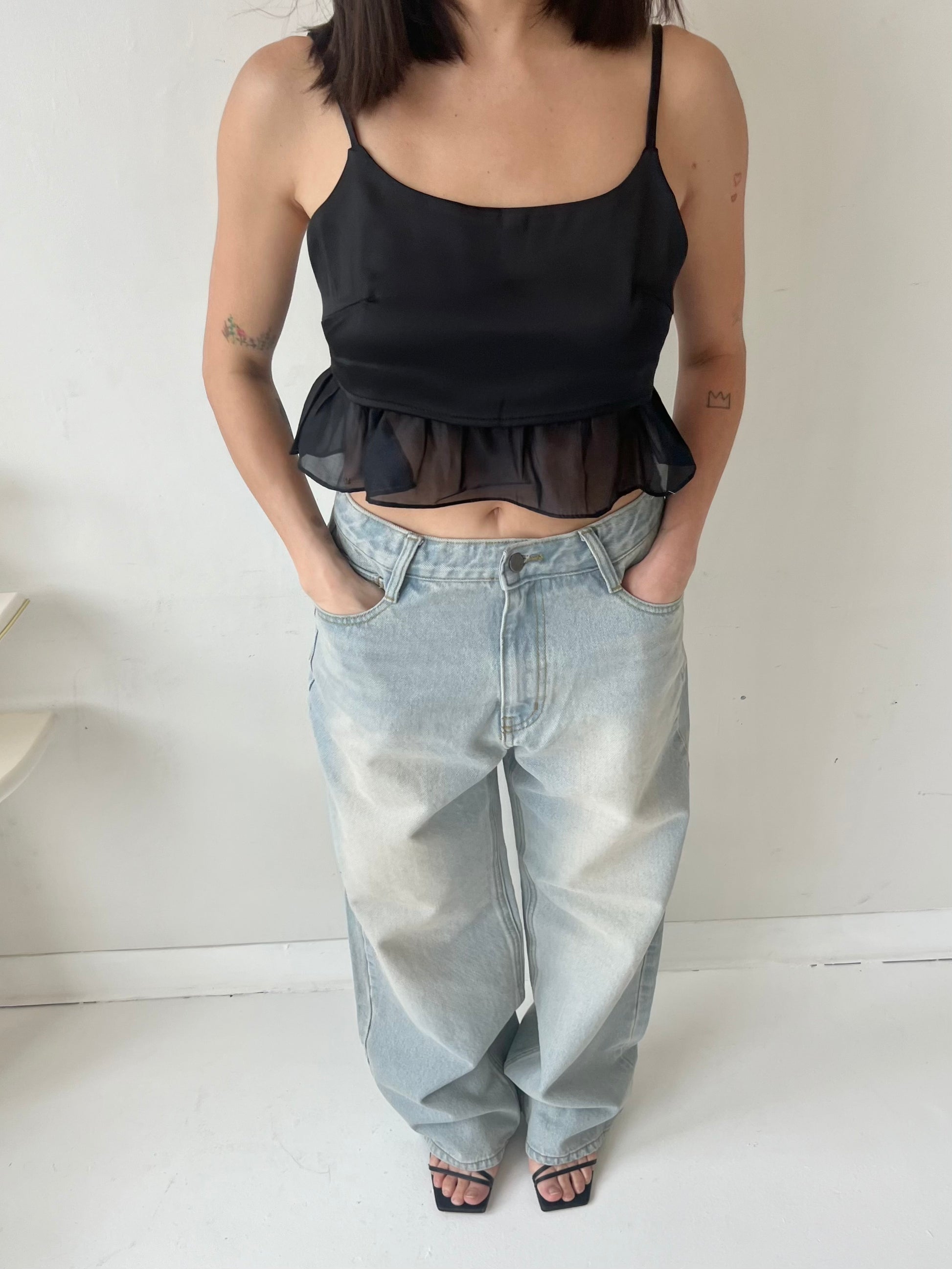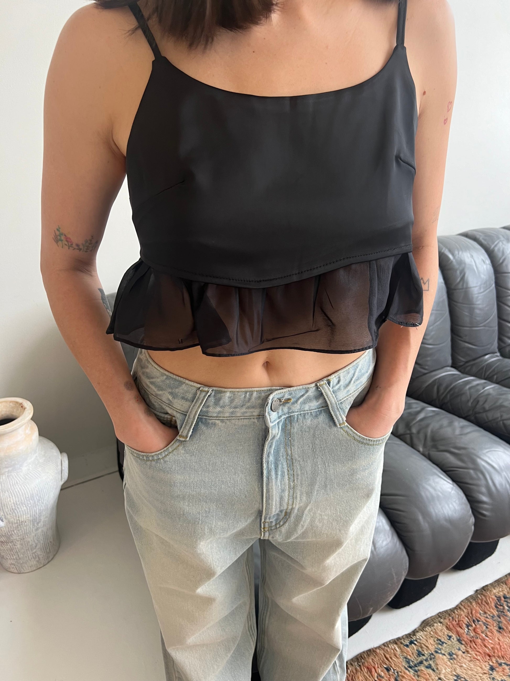 Our adorable silk bra top with peplum mesh hem detail and adjustable noodle straps gives you the cutest light and breezy look this summer. Now available in black, grey and white