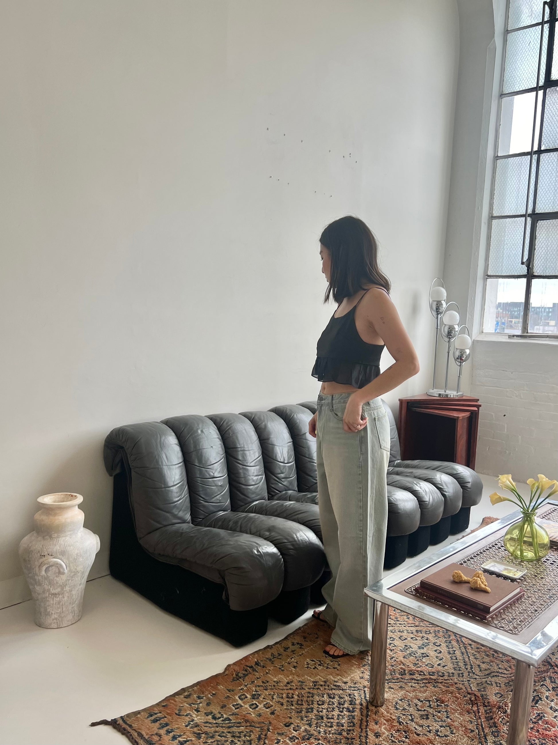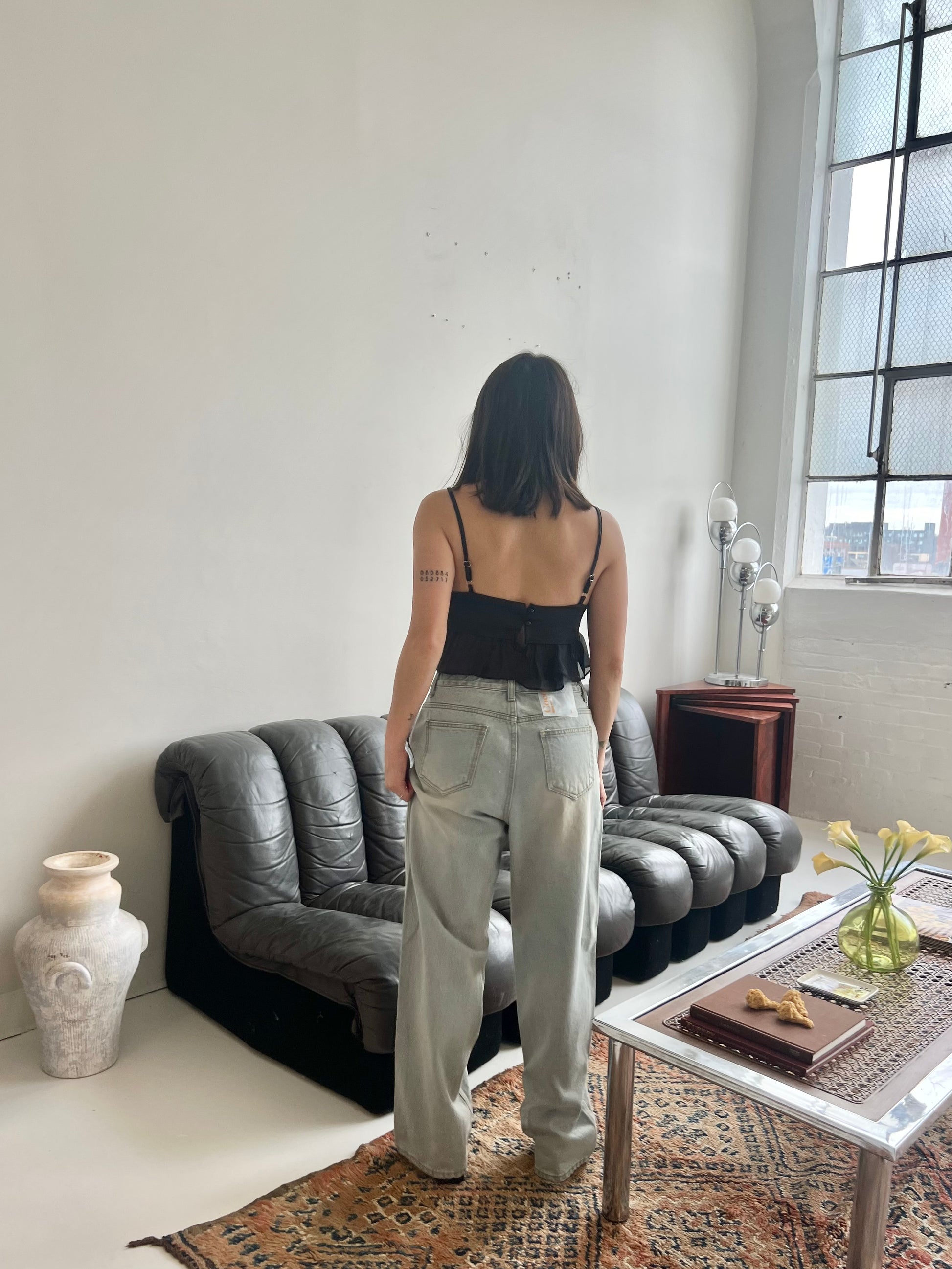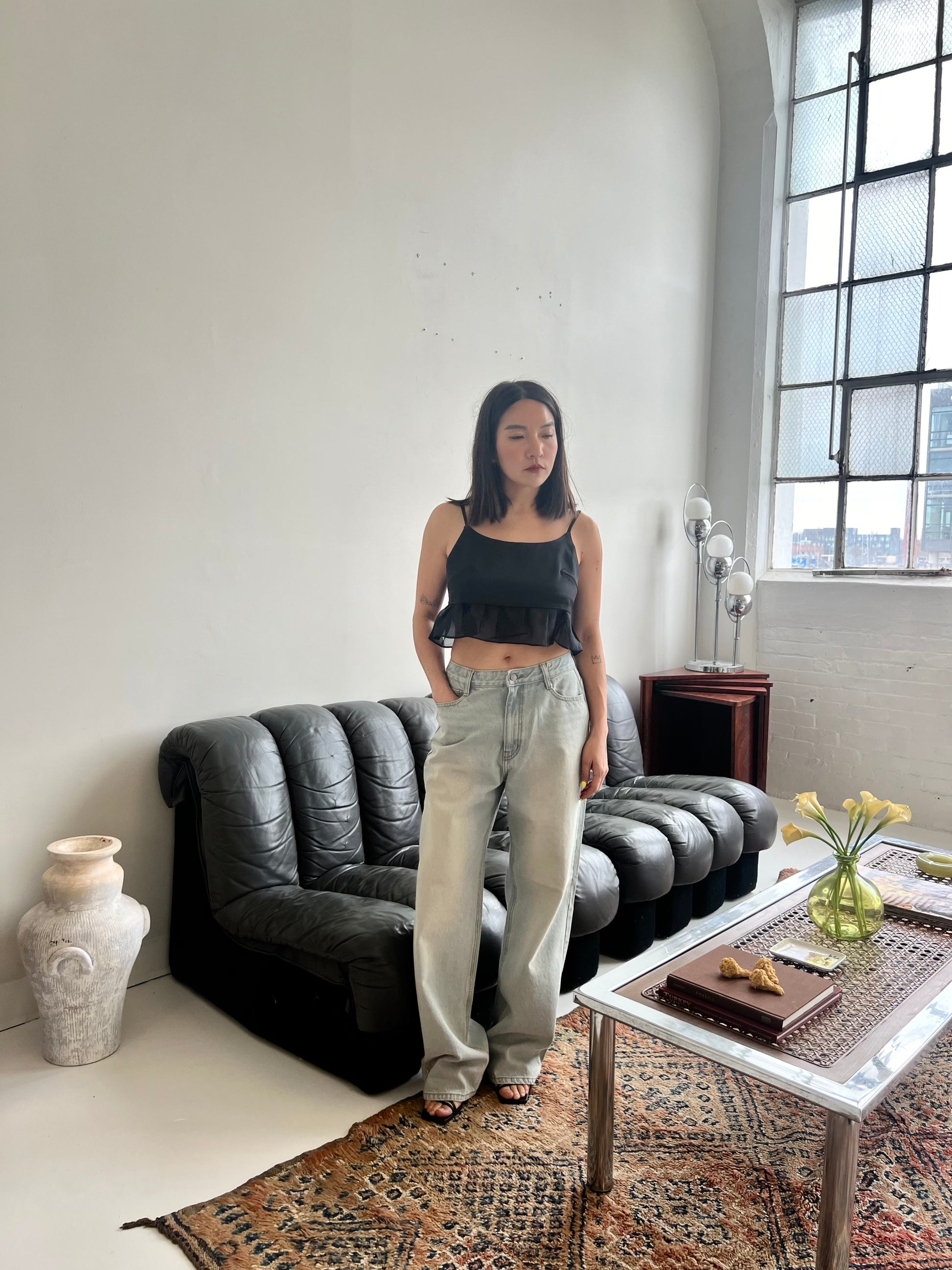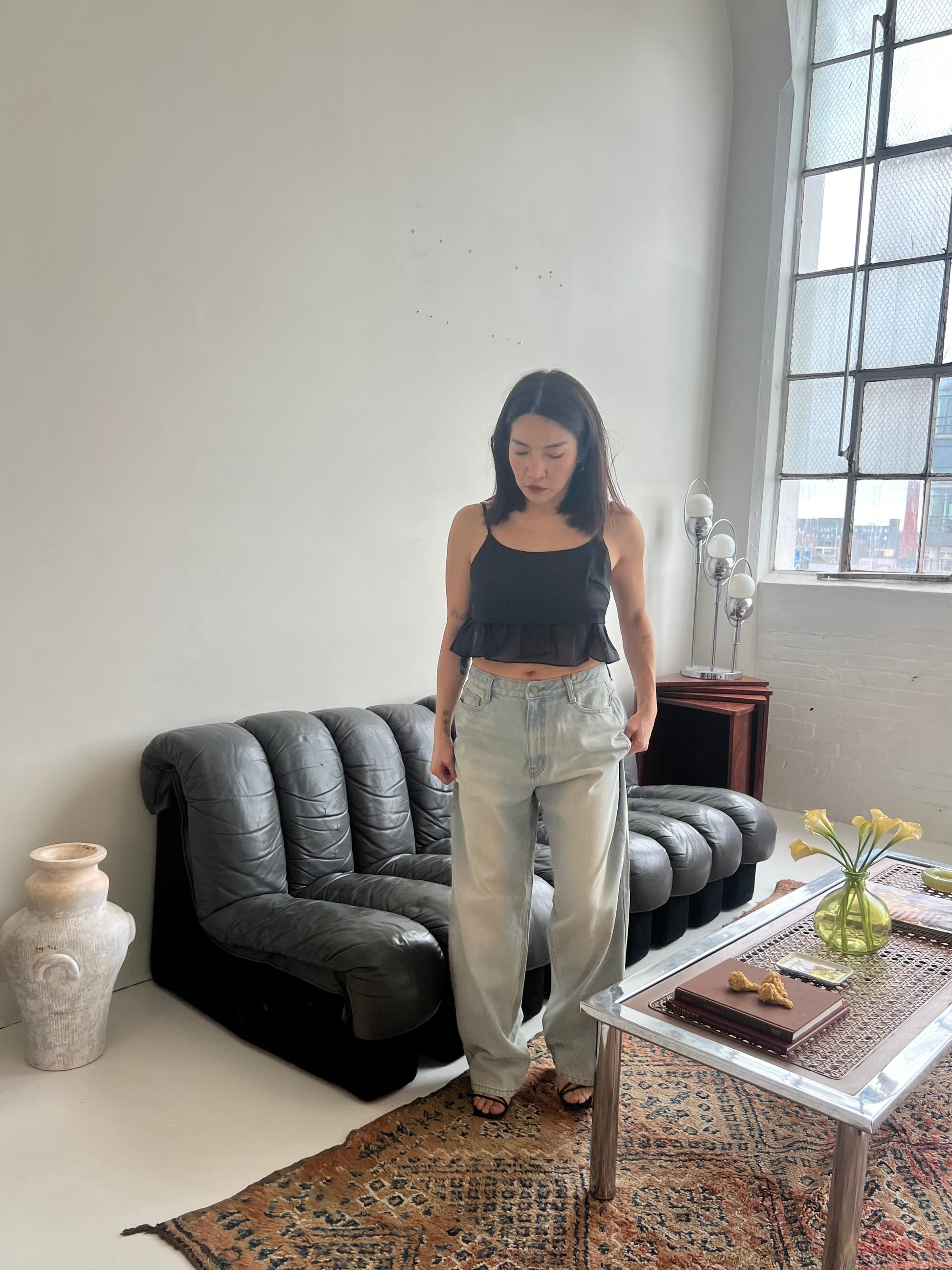 Our adorable silk bra top with peplum mesh hem detail and adjustable noodle straps gives you the cutest light and breezy look this summer. Now available in black, grey and white
