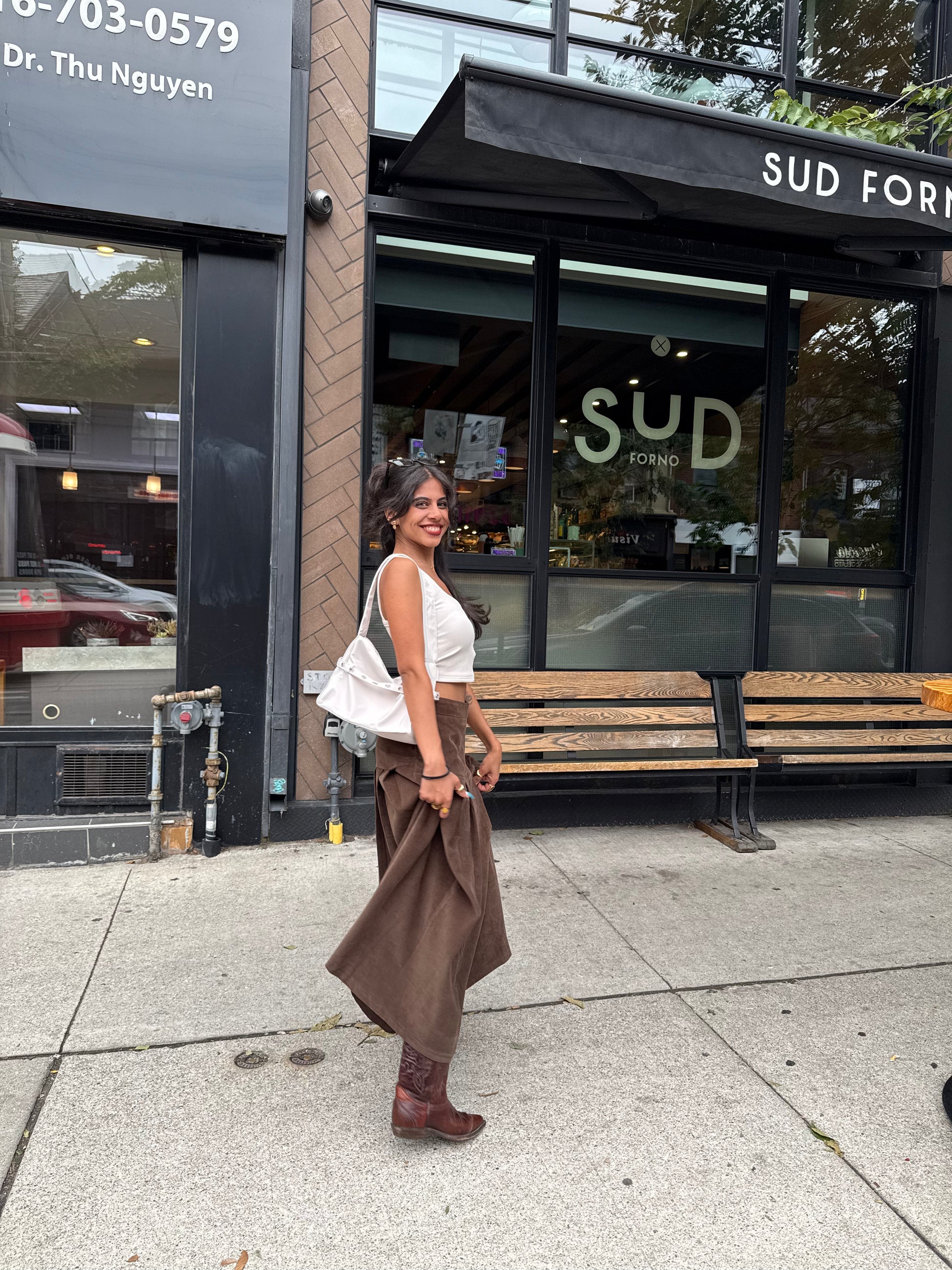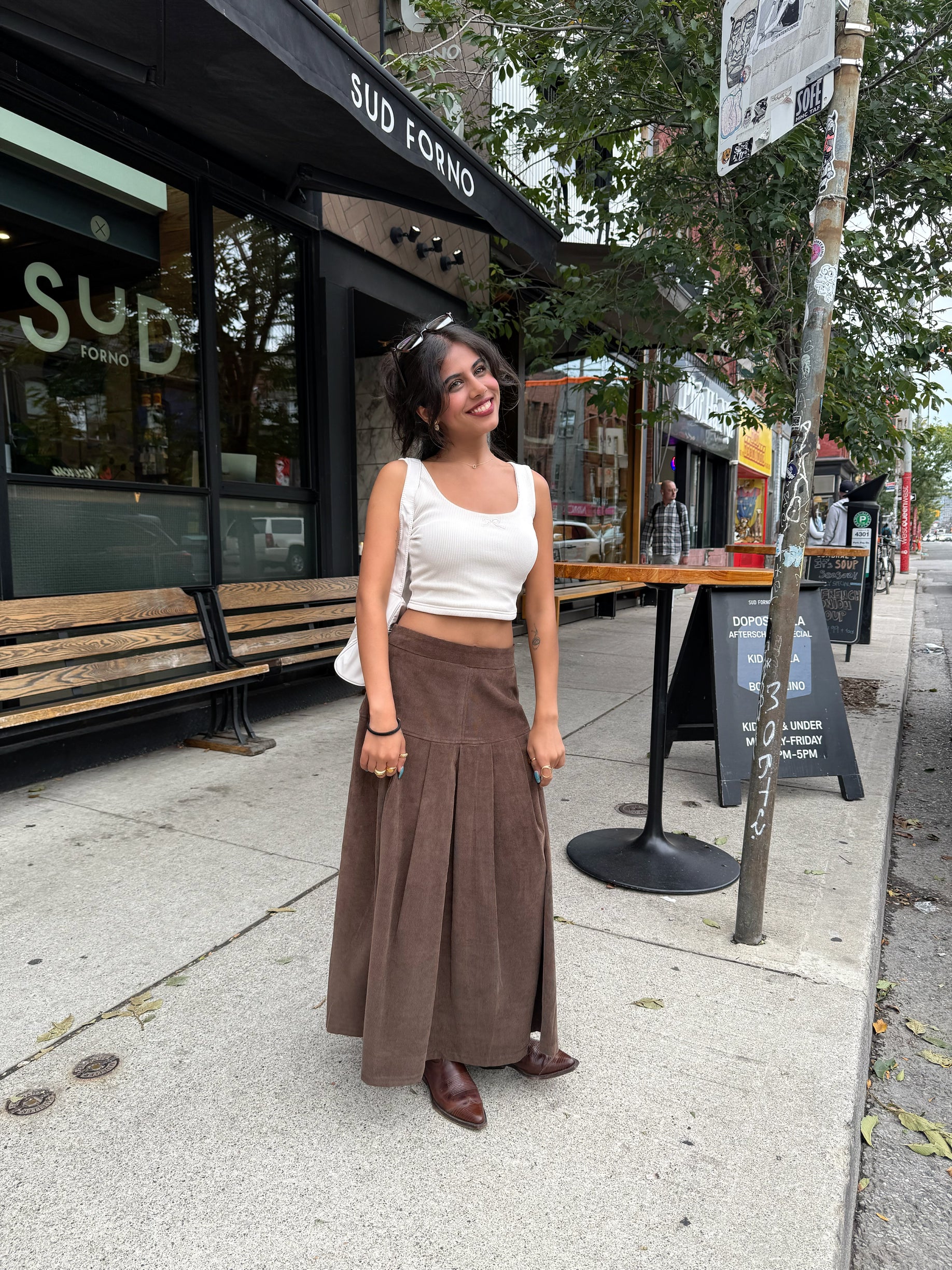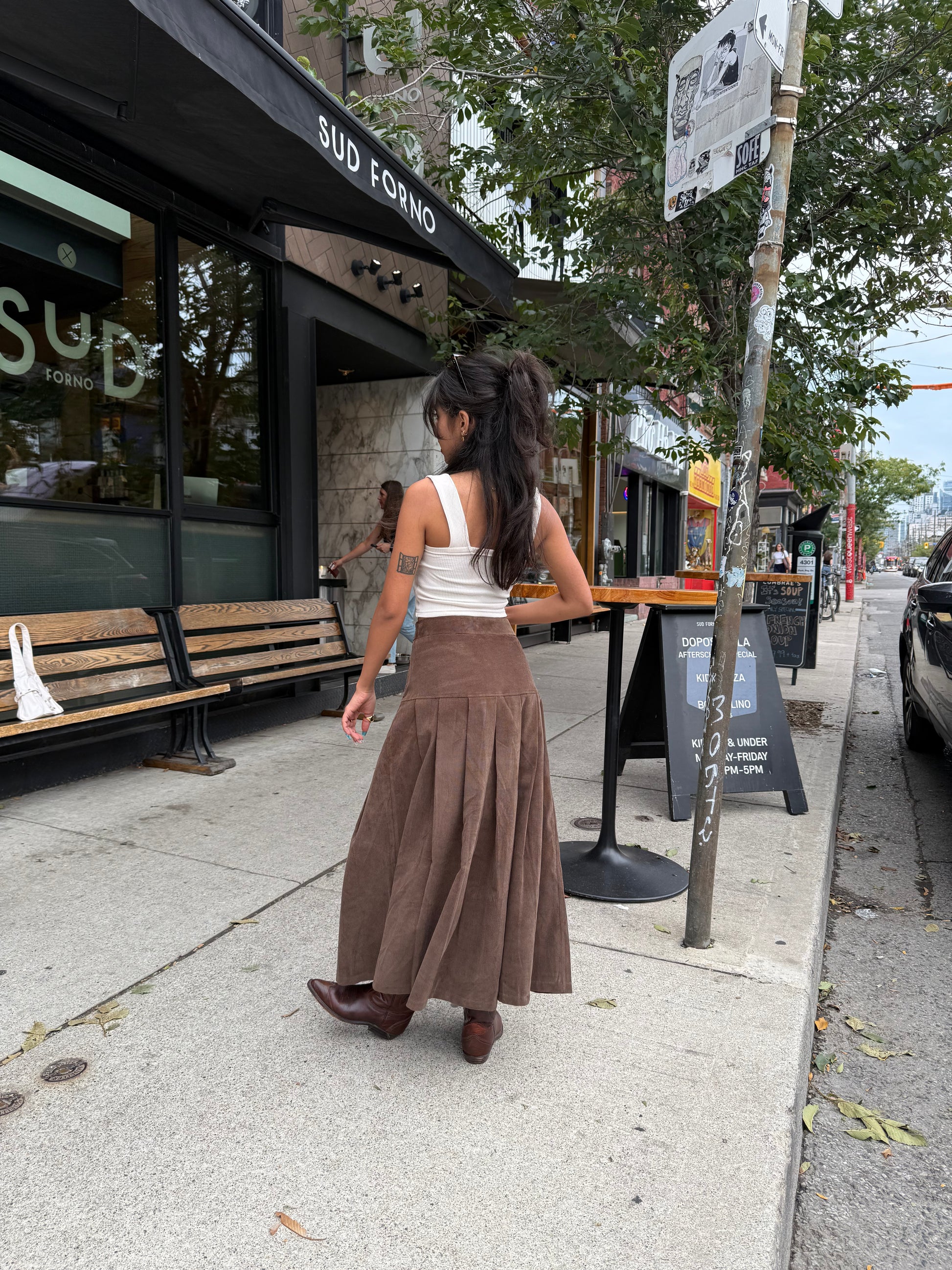 You can’t go wrong with a well-tailored maxi skirt in the fall—and this corduroy beauty is chic proof of that. Designed with a mid-to-low waist, pleated silhouette, matching waistband, and a discreet side zipper, it’s crafted from a thick fabric that delivers cozy comfort with a polished, stunning edge.