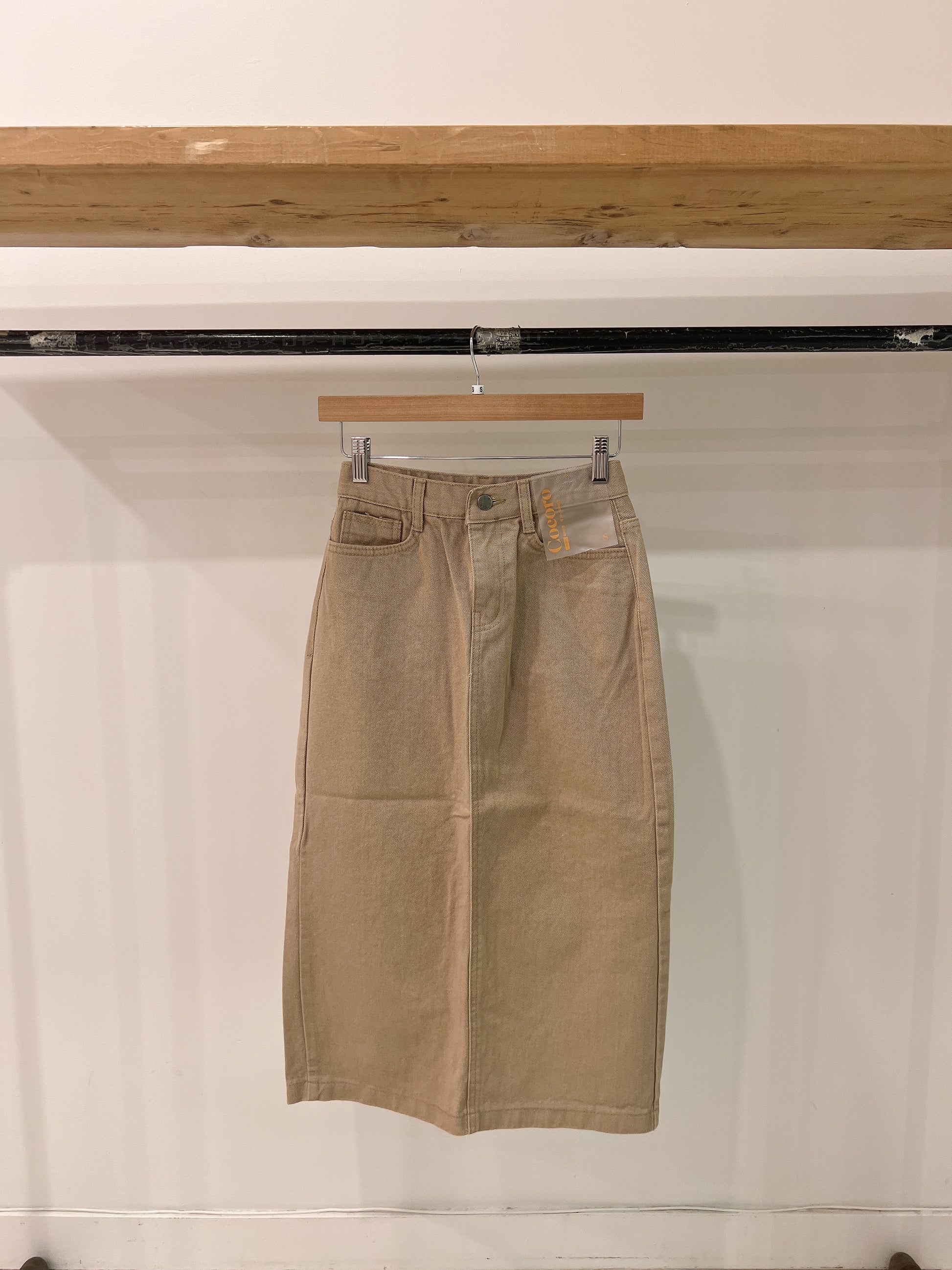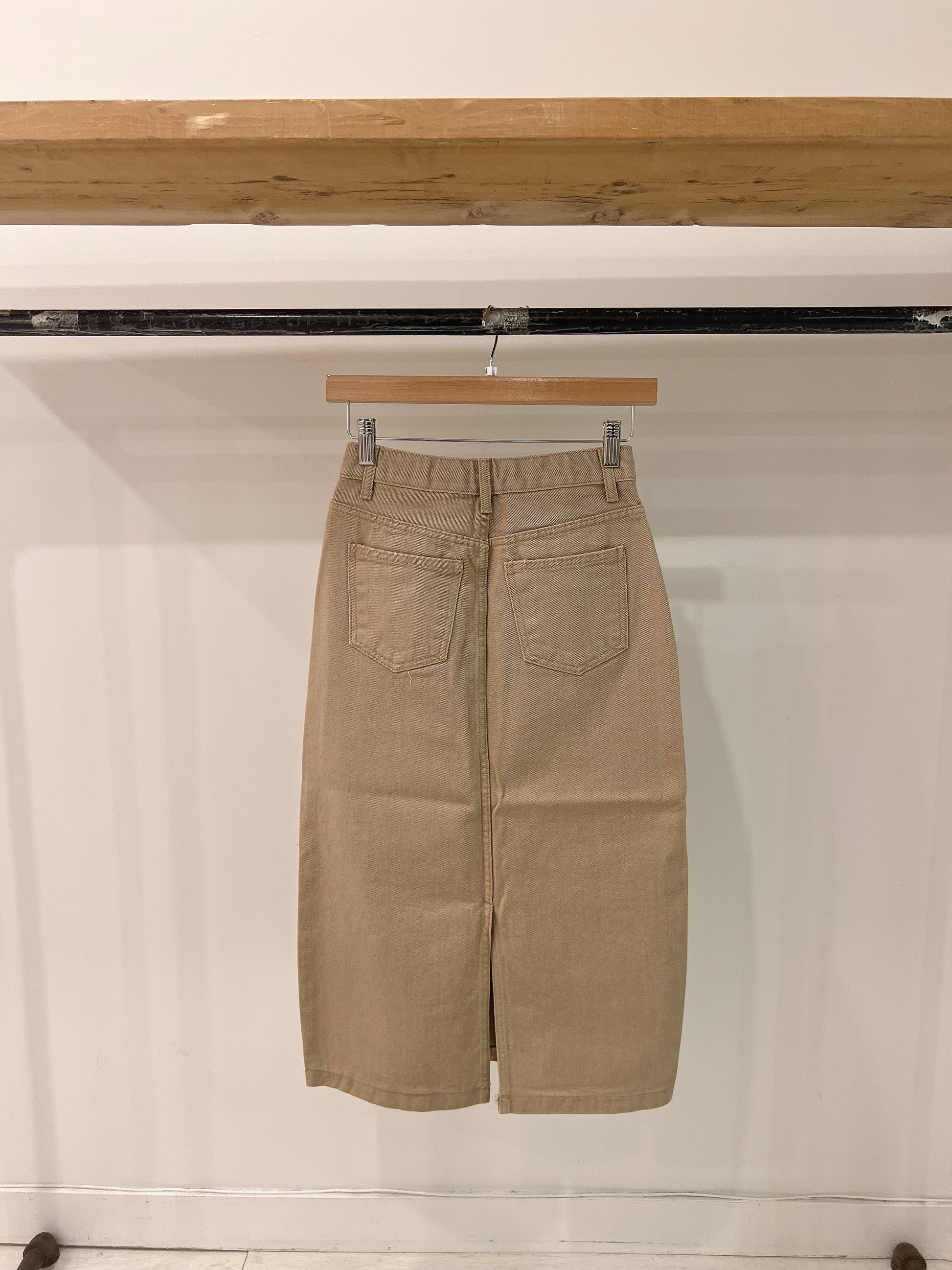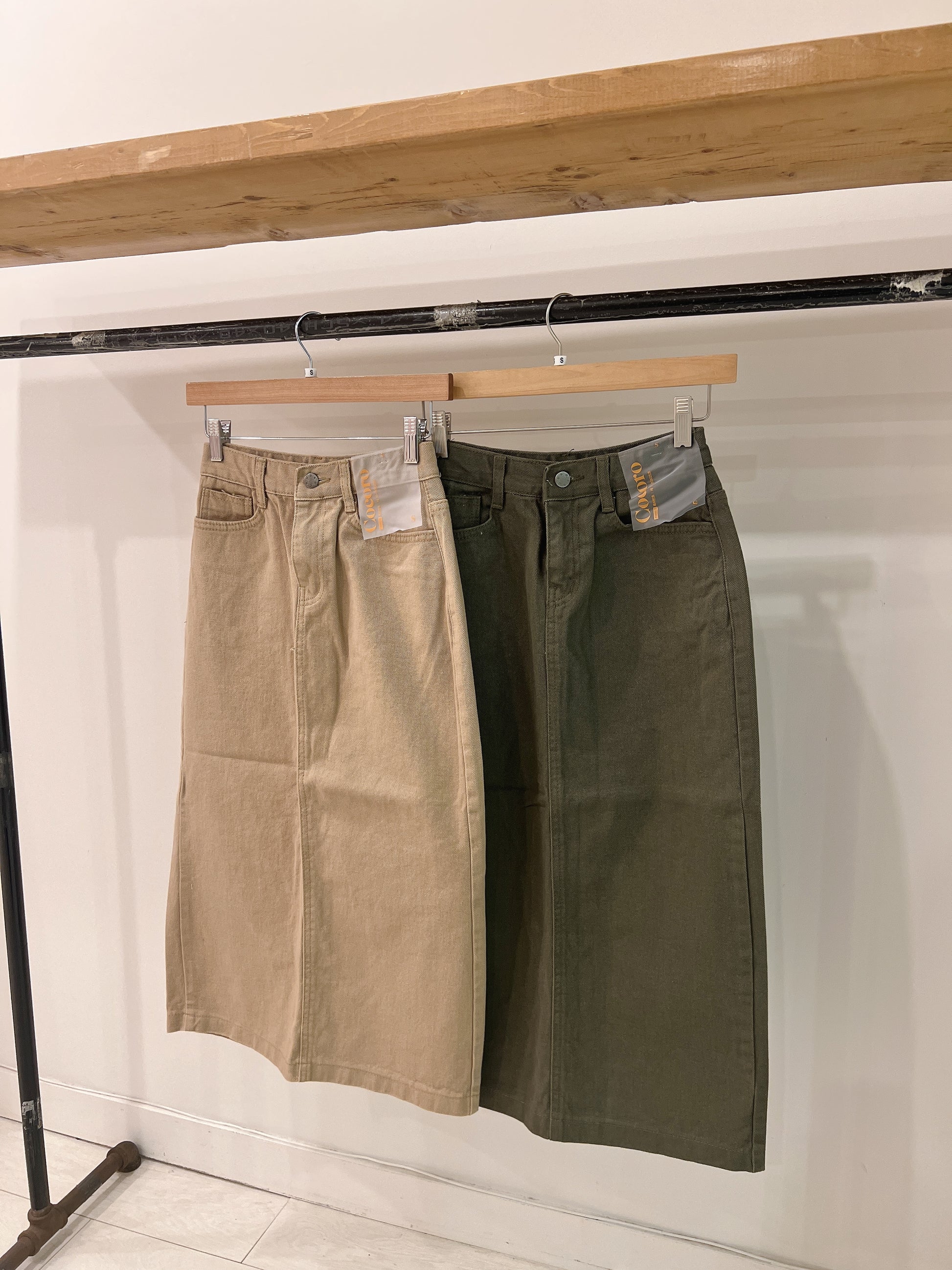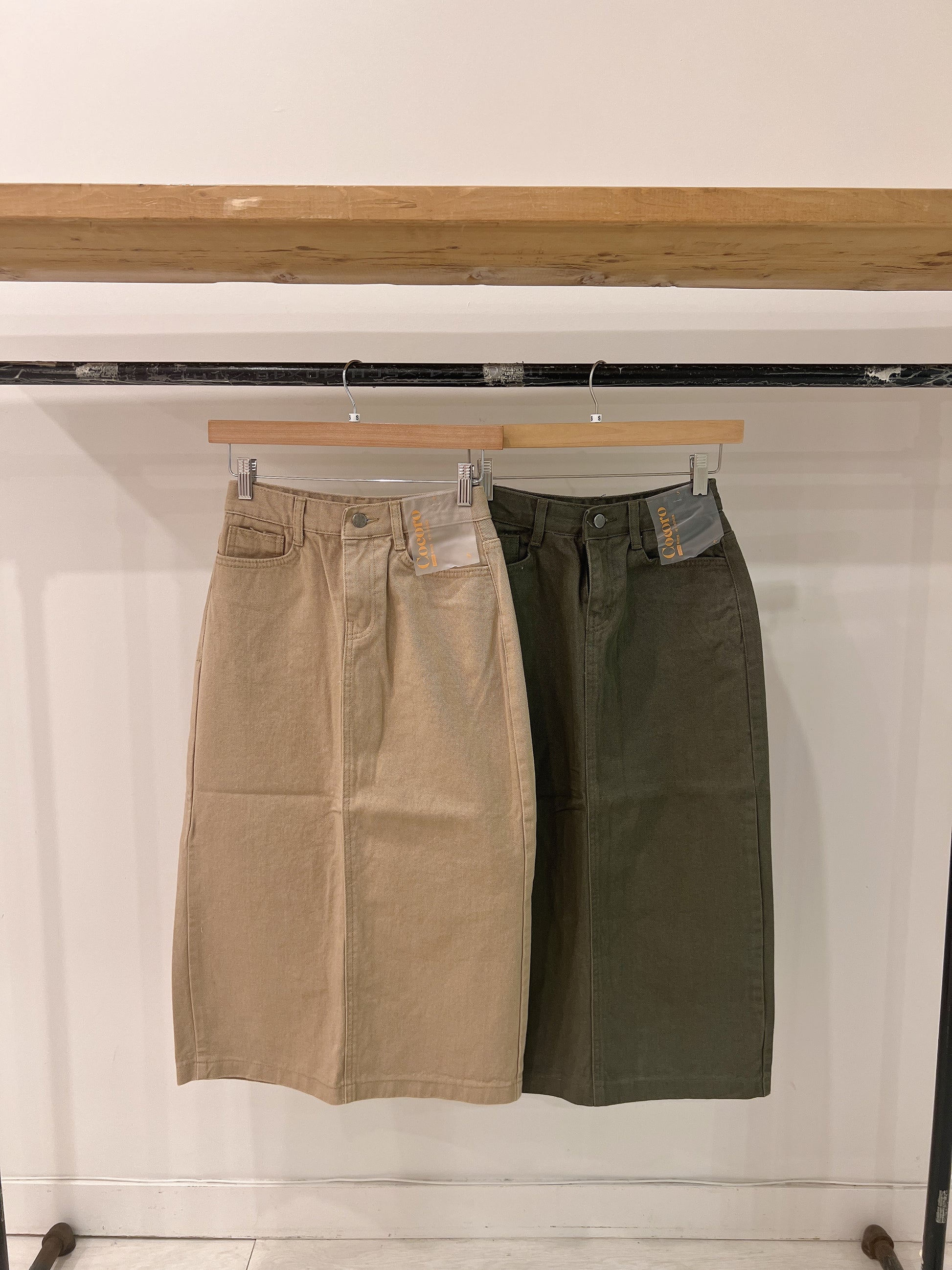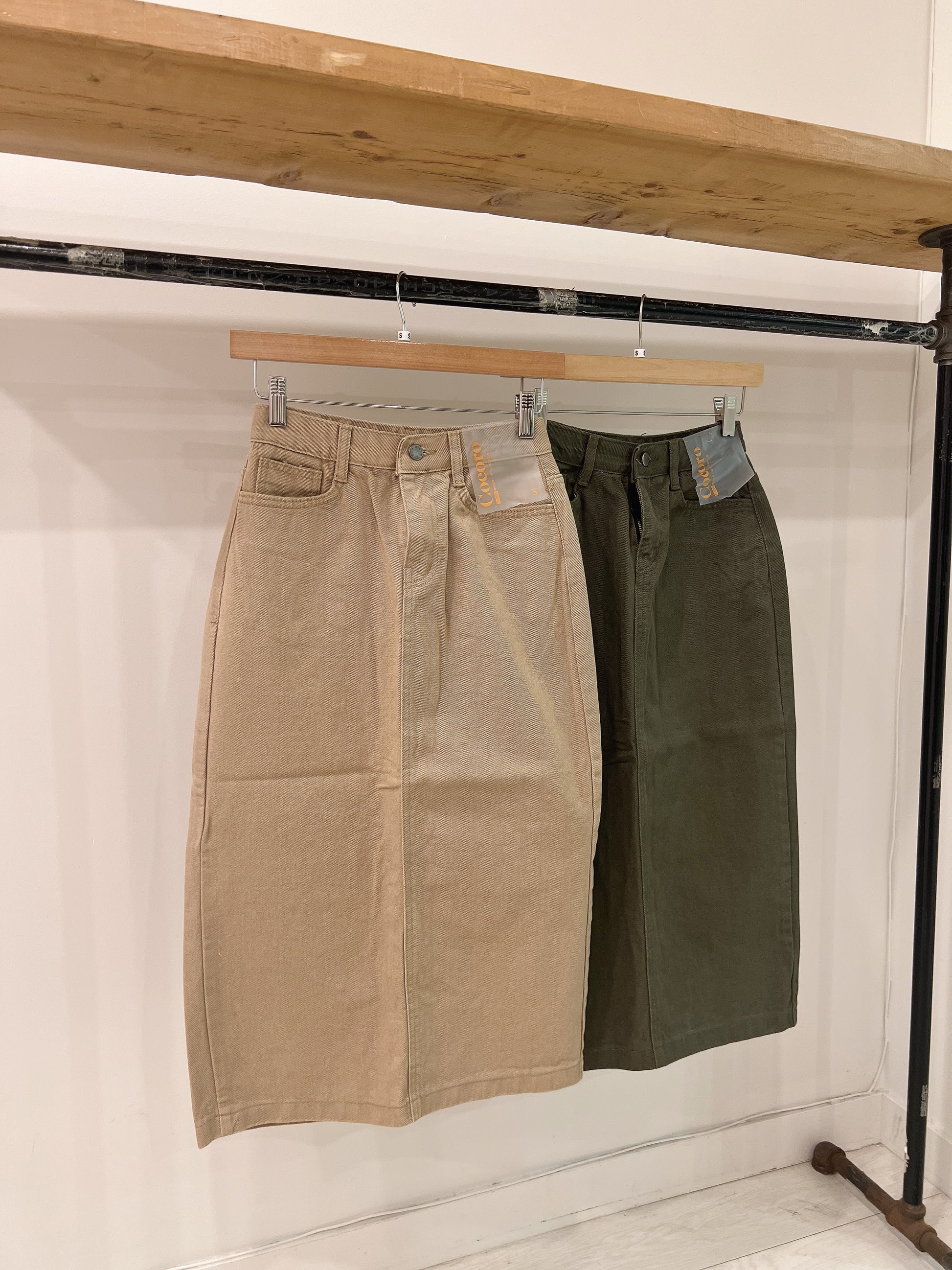 Introducing our midi length, fitted denim skirt with a slit back detail and high waist for a classic look. This gorgeous skirt is now available in earthy tones of beige and green.