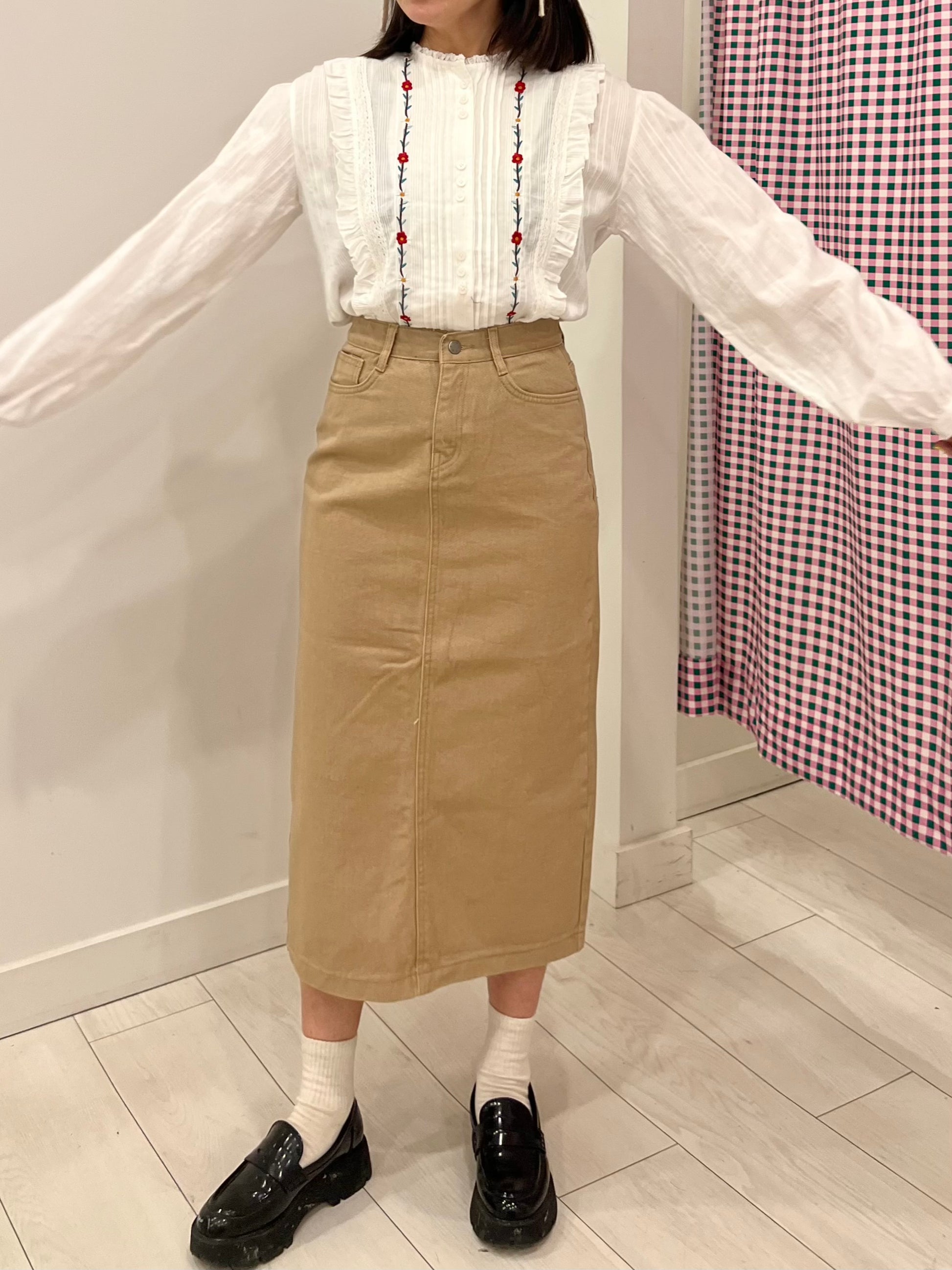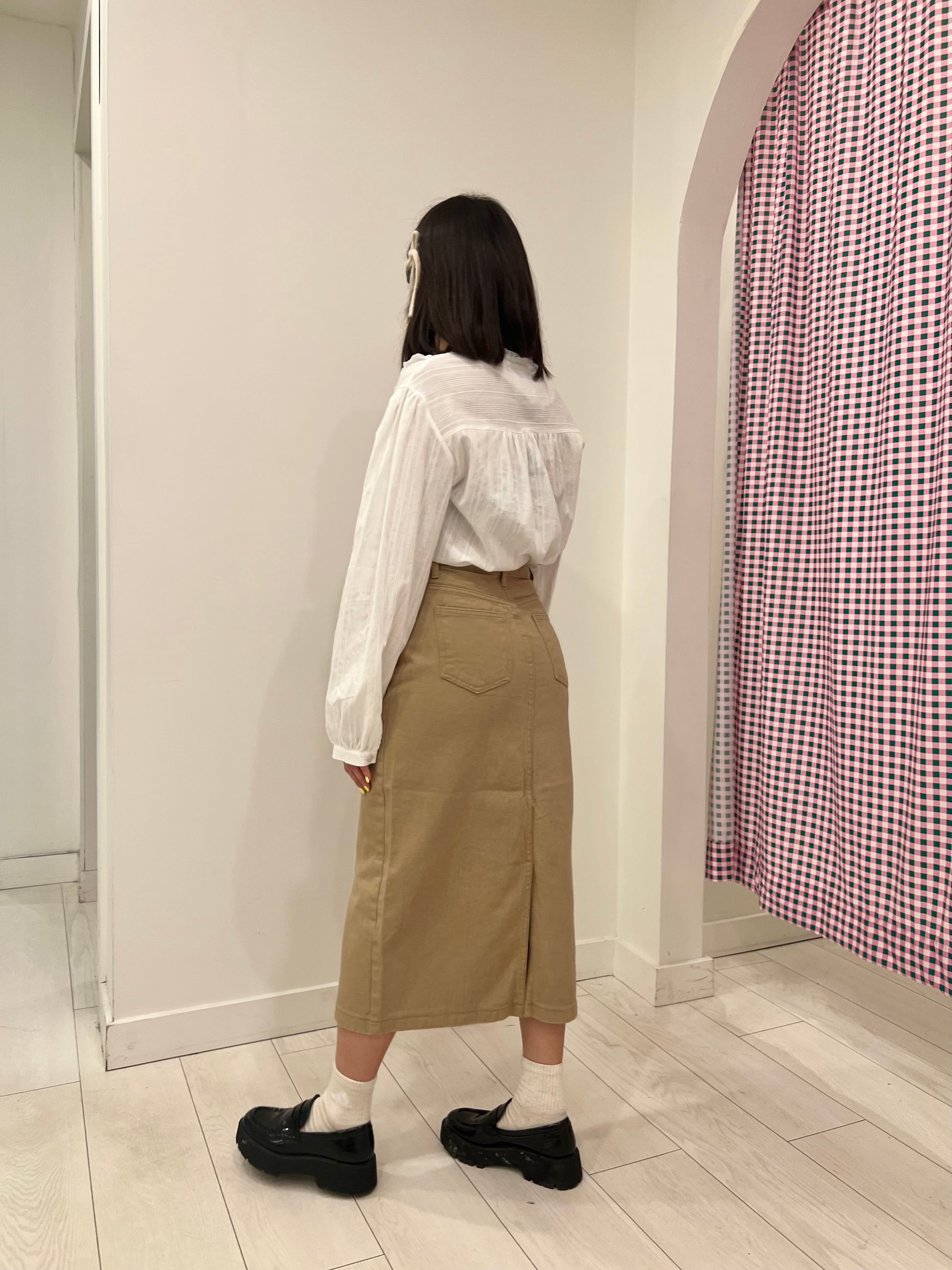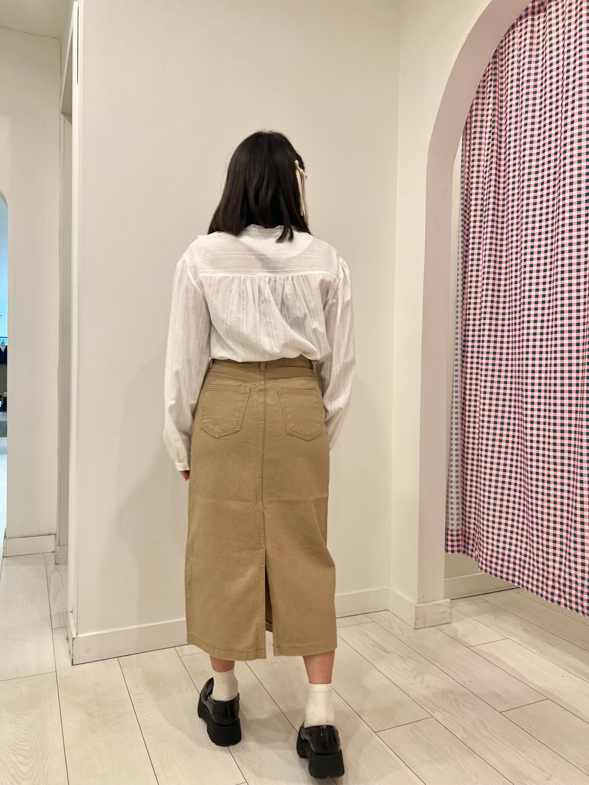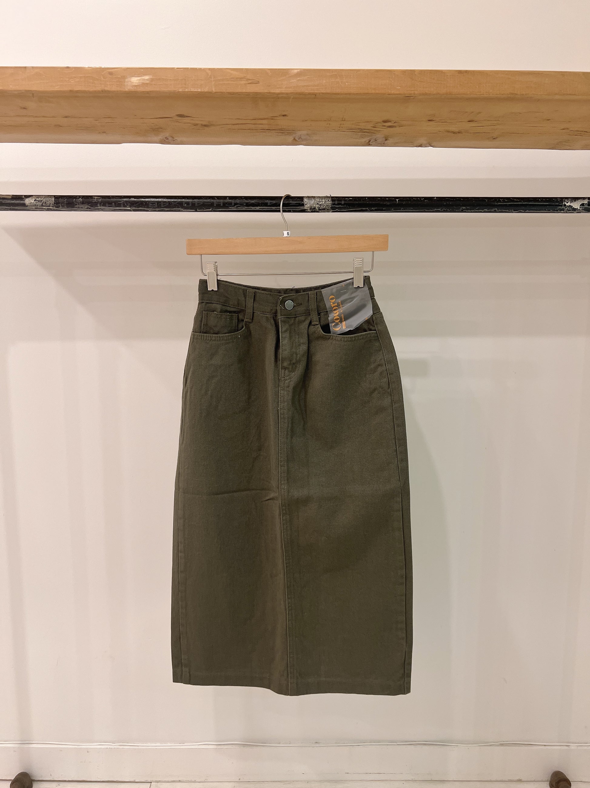 Introducing our midi length, fitted denim skirt with a slit back detail and high waist for a classic look. This gorgeous skirt is now available in earthy tones of beige and green.