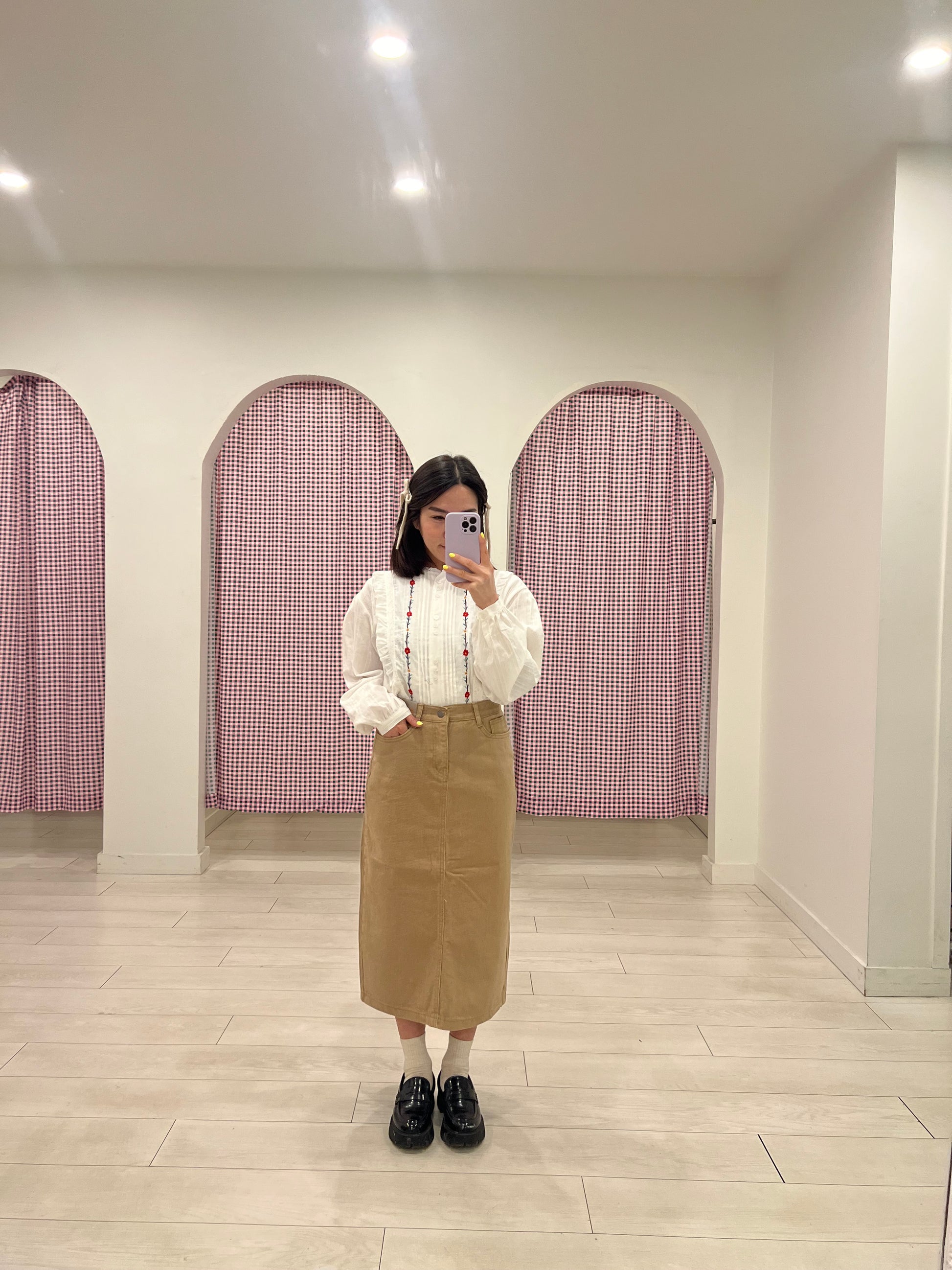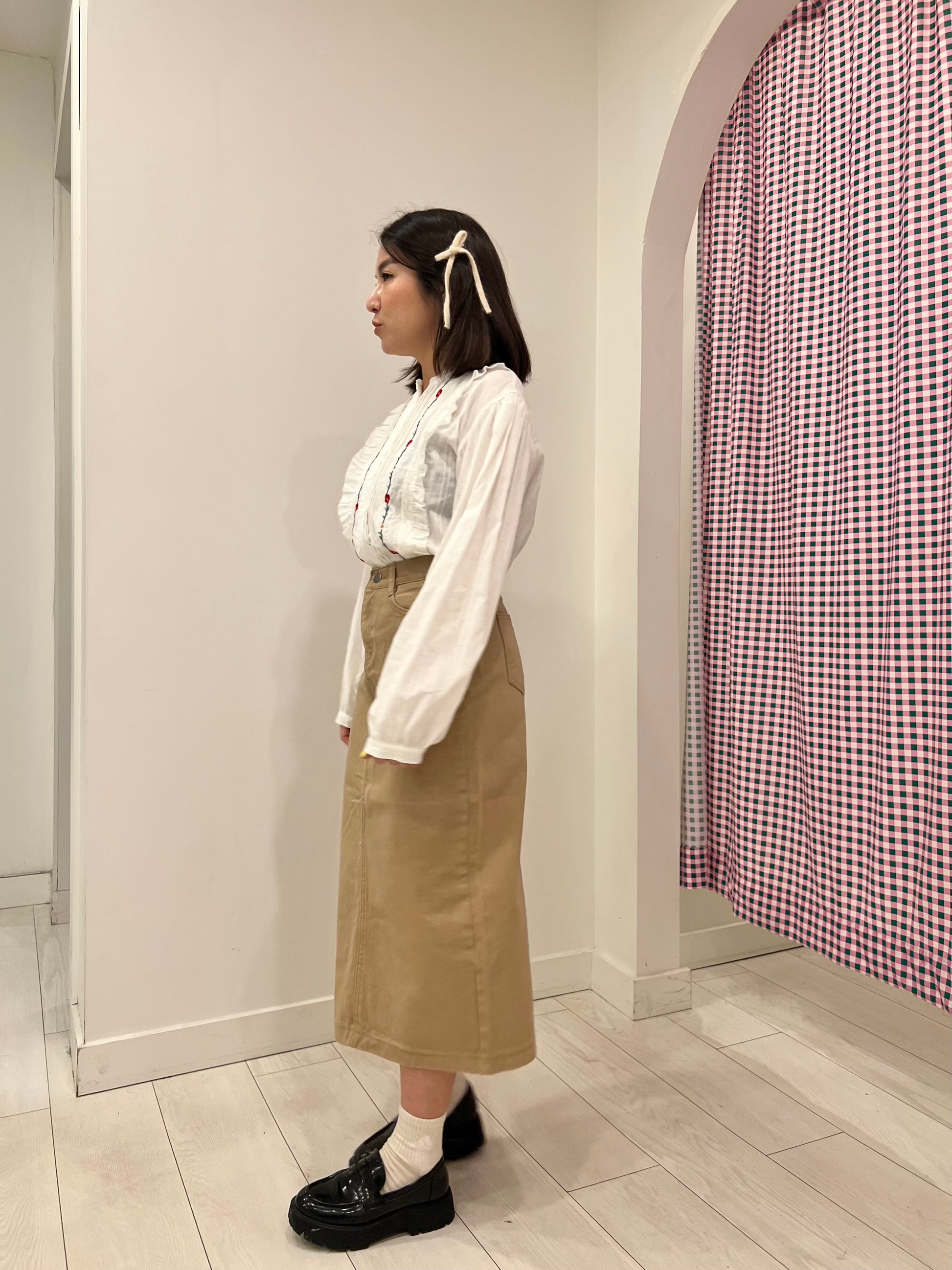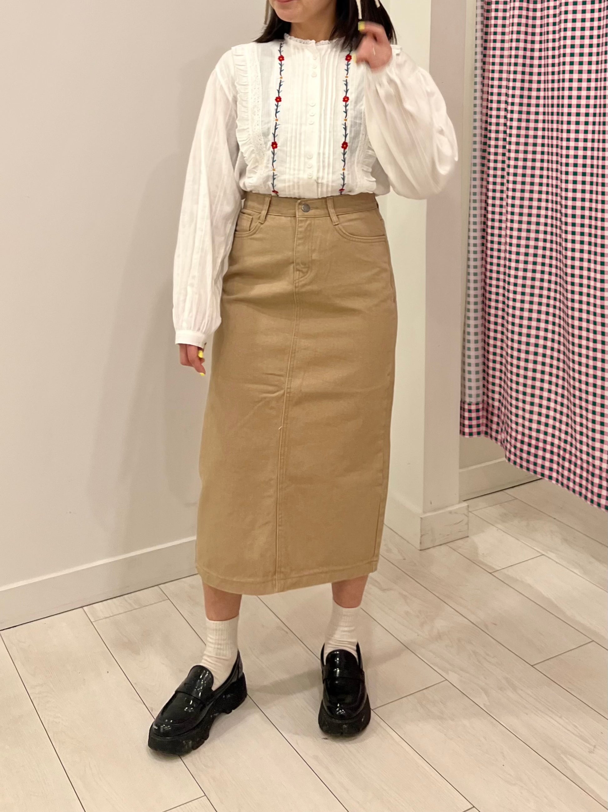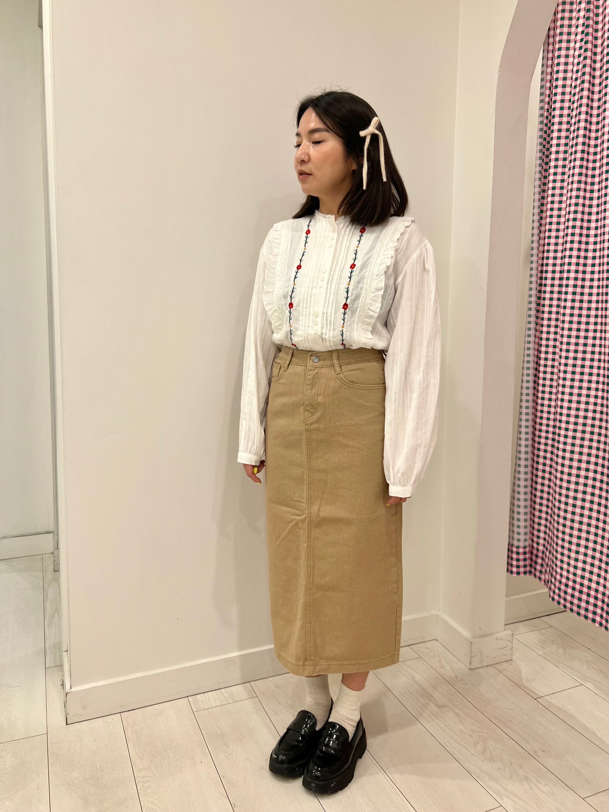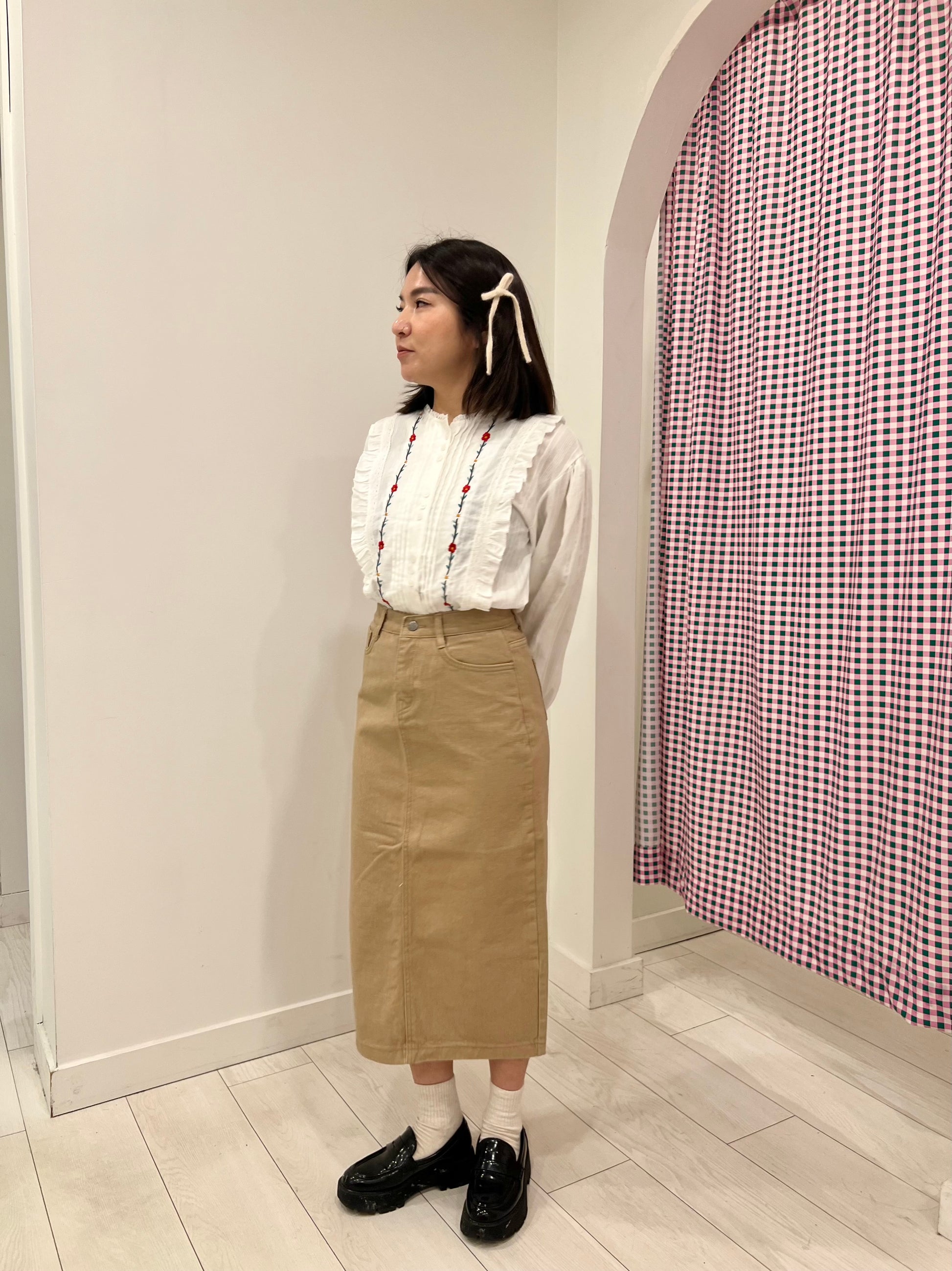 Introducing our midi length, fitted denim skirt with a slit back detail and high waist for a classic look. This gorgeous skirt is now available in earthy tones of beige and green.