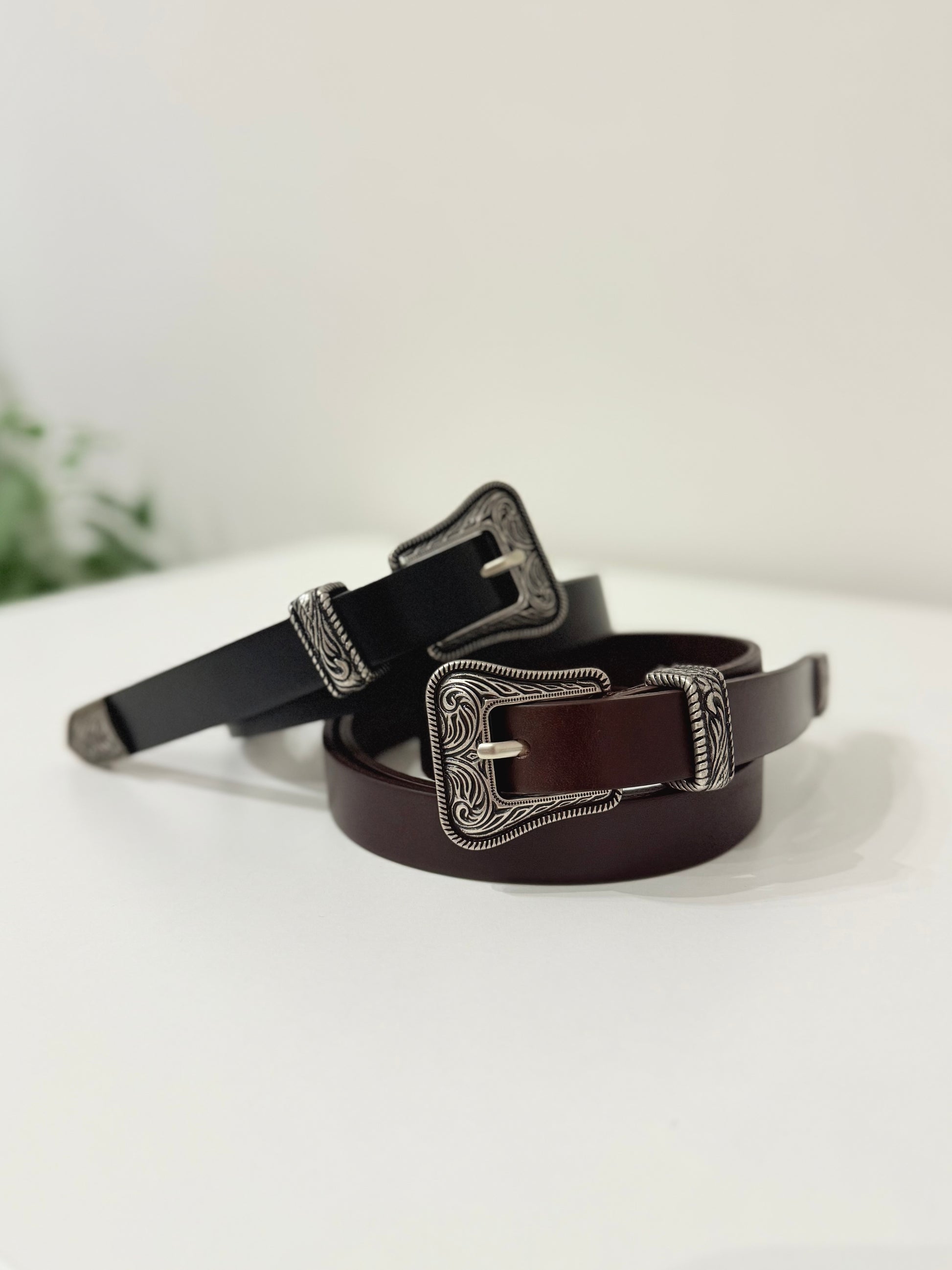 A sleek and versatile thin western belt available in classic brown and black. Crafted from smooth faux leather with a slim profile, it’s finished with a polished metal buckle in a subtle western-inspired design. Lightweight yet durable, this belt is perfect for cinching high-waist denim, skirts, or layering over dresses.