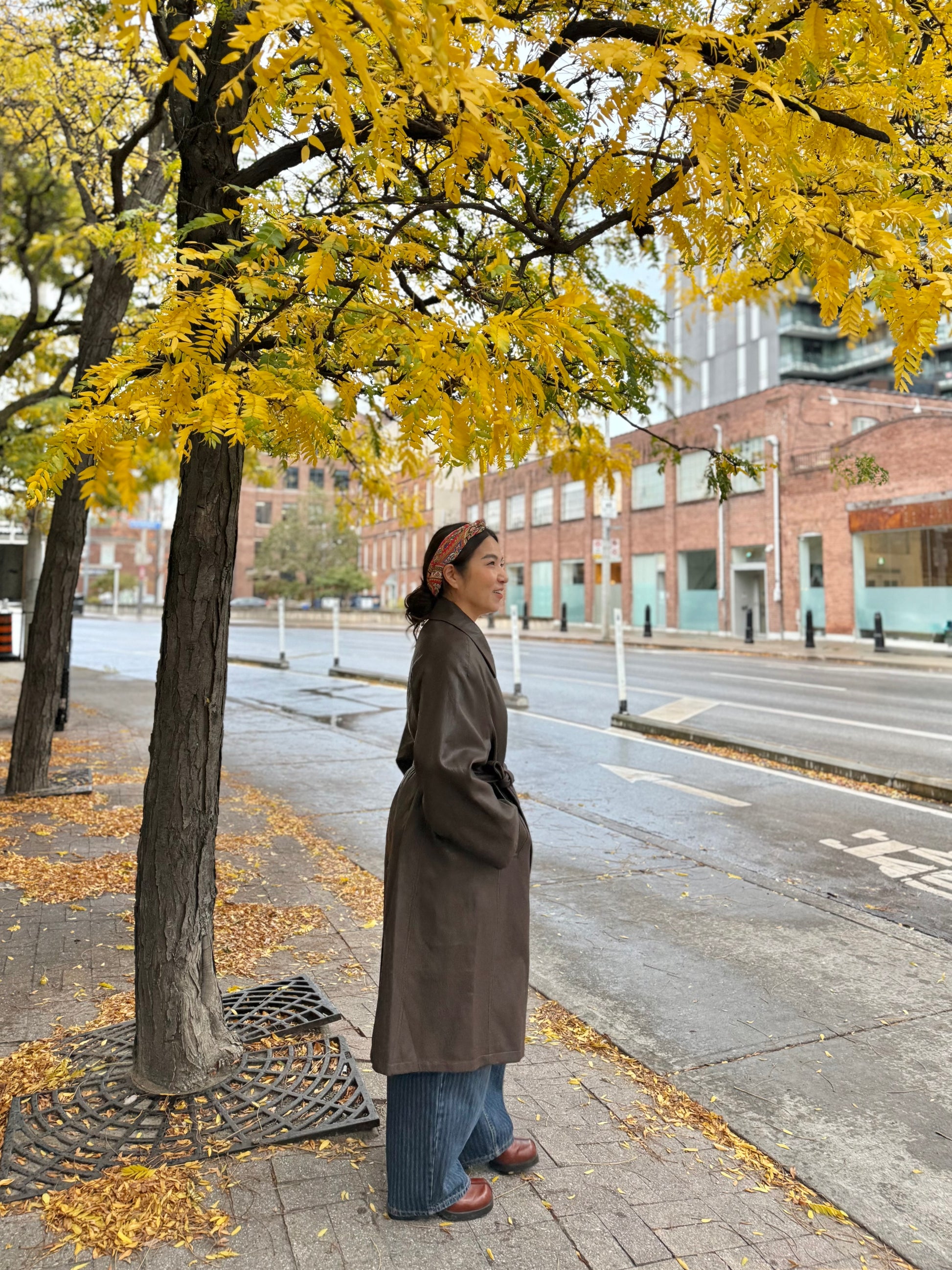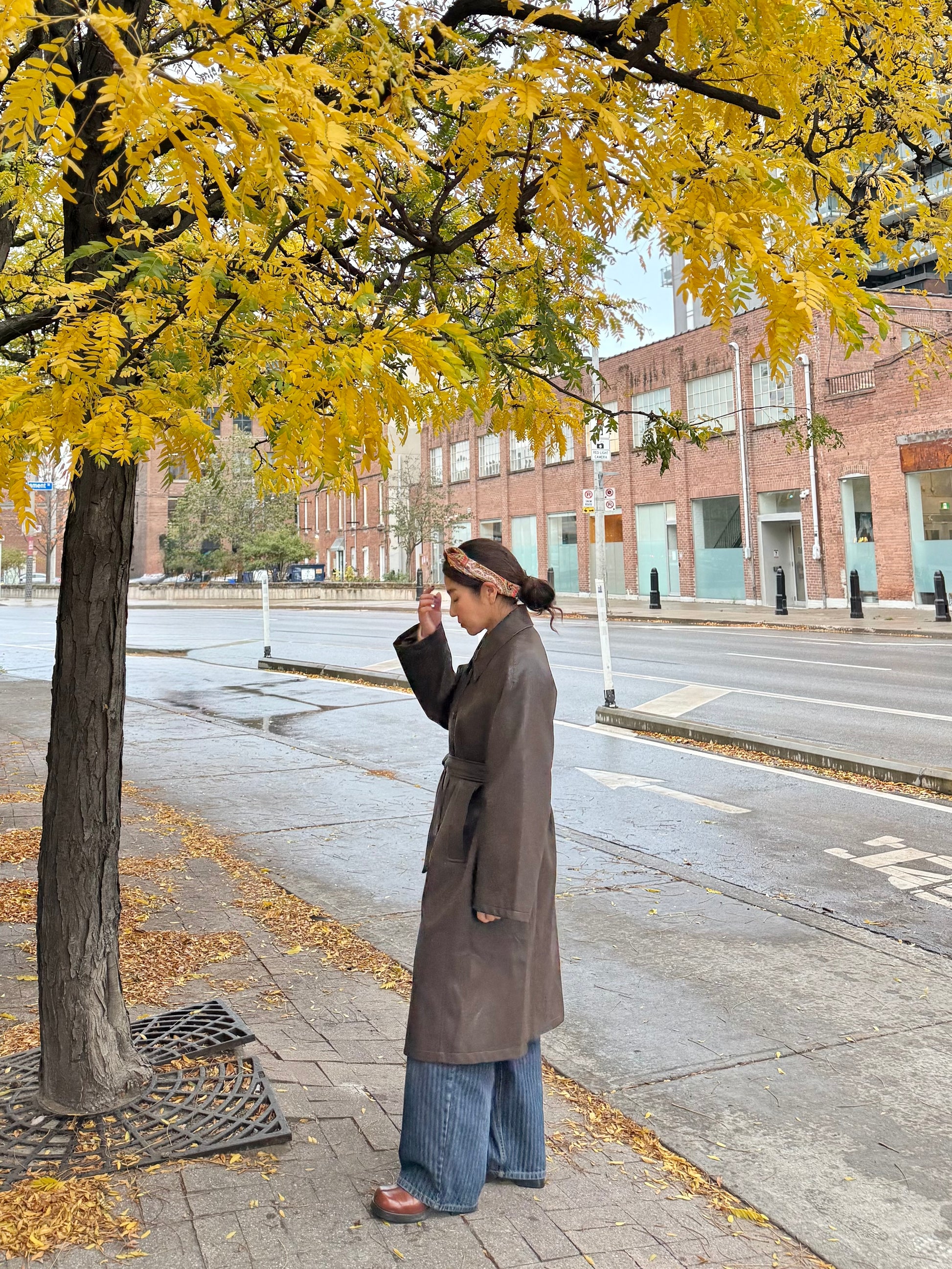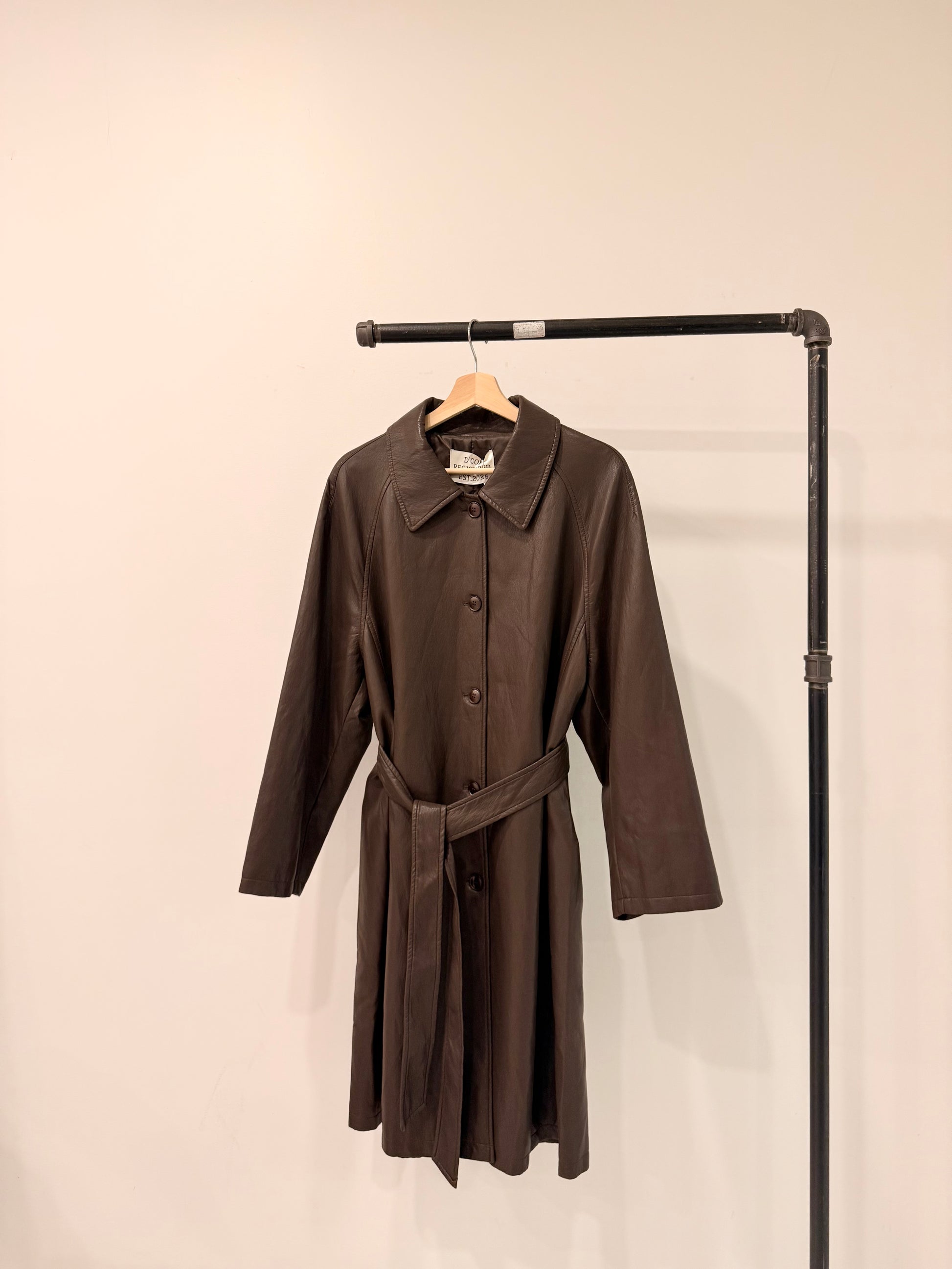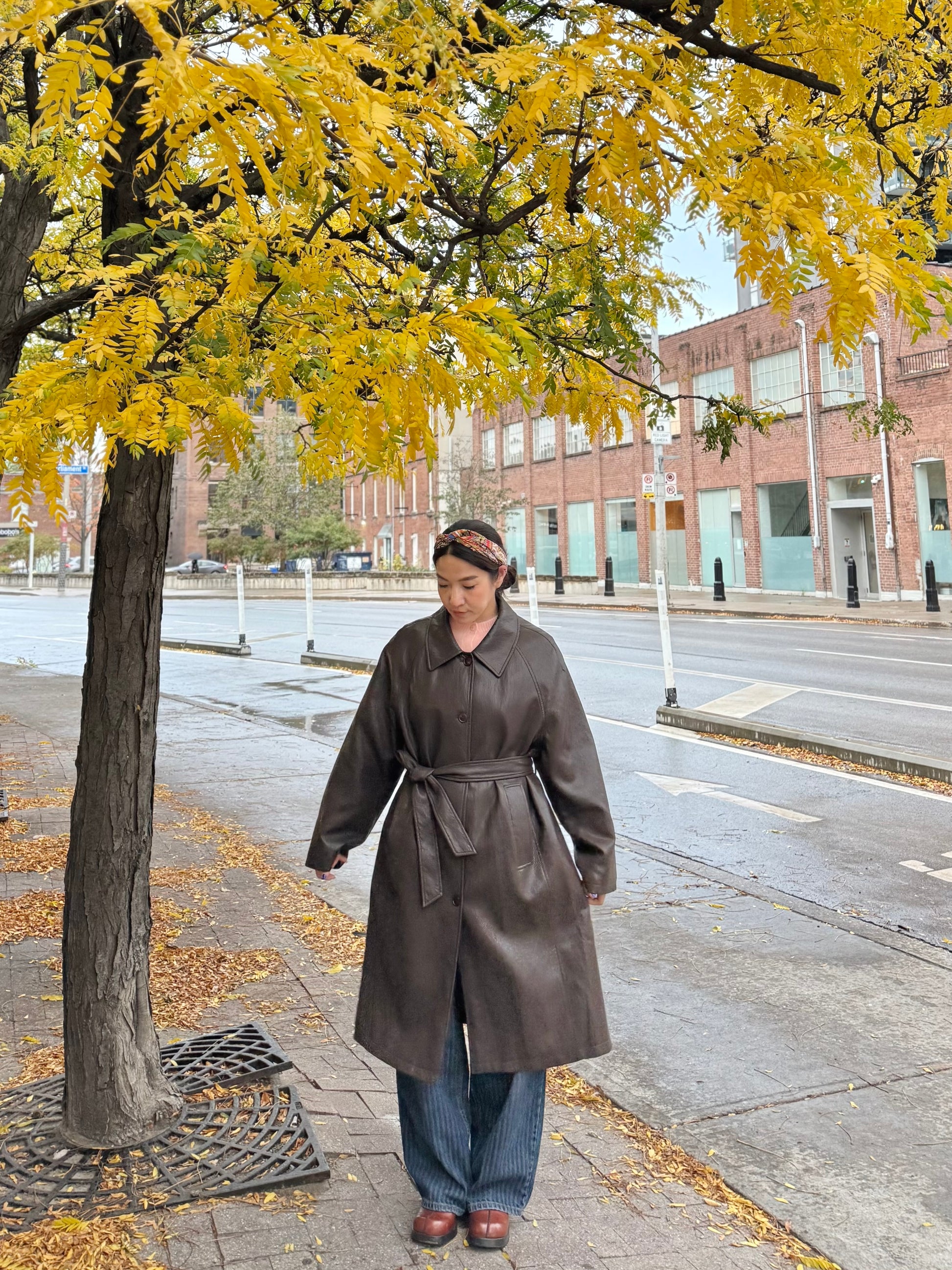 Effortlessly chic with a modern edge — this vegan leather belted coat is a true statement piece. Featuring a tie-waist belt for a flattering, cinched silhouette, a partially rounded collar, and slash pockets on both sides.