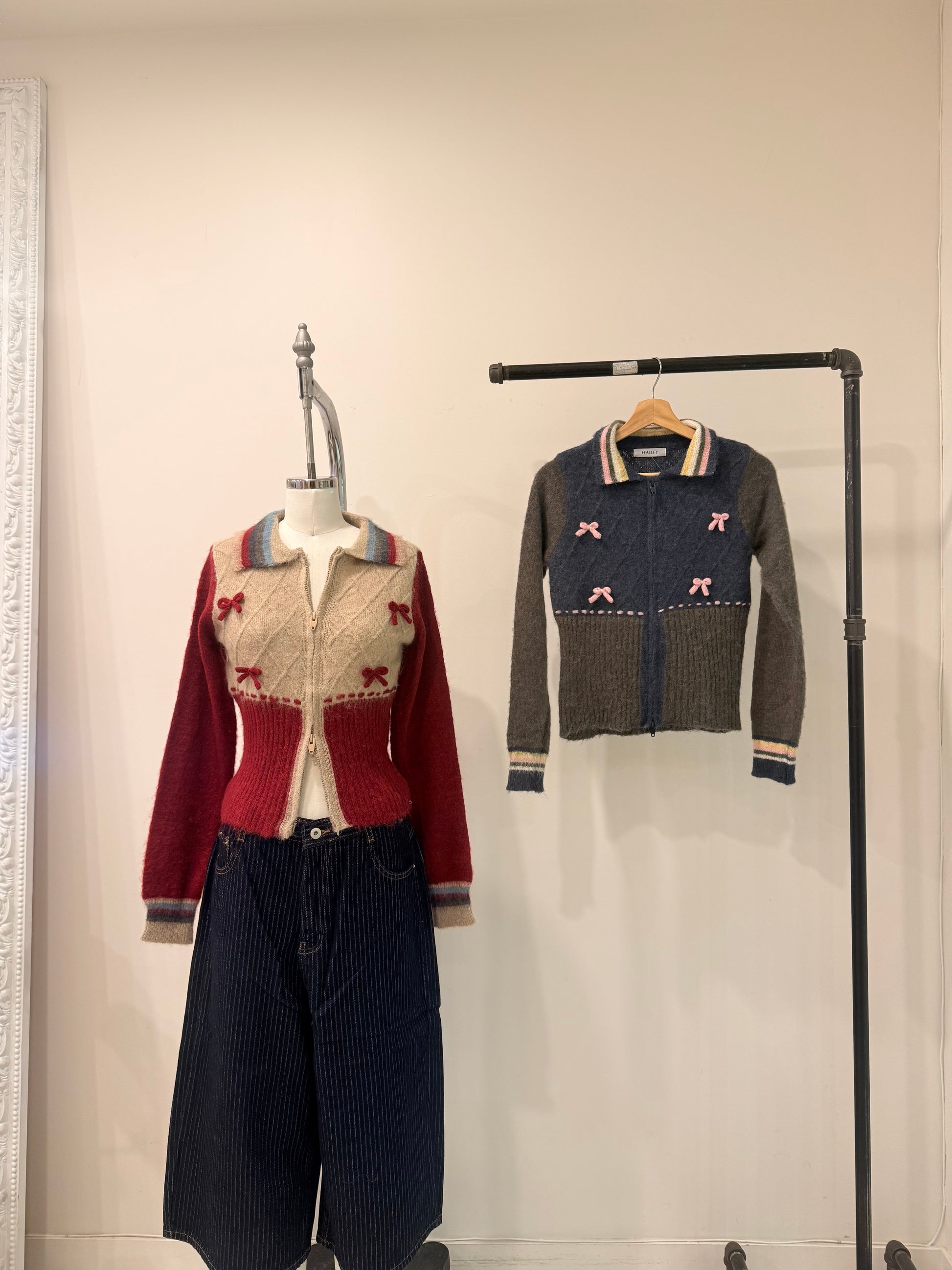 If you love embodying cute and cozy, let's introduce you to the sweater of your dreams. This fuzzy cable knit sweater brings texture and sweetness together with its collared neckline and zip-up front. Four dainty bows accent the front for a playful twist, while the lower half features subtle ribbing that gives it a shaped, easy fit. Finished with contrast trim along the neckline and cuffs for a quiet pop of color. Comes in two colorways that scream cutesy - Red and Charcoal.