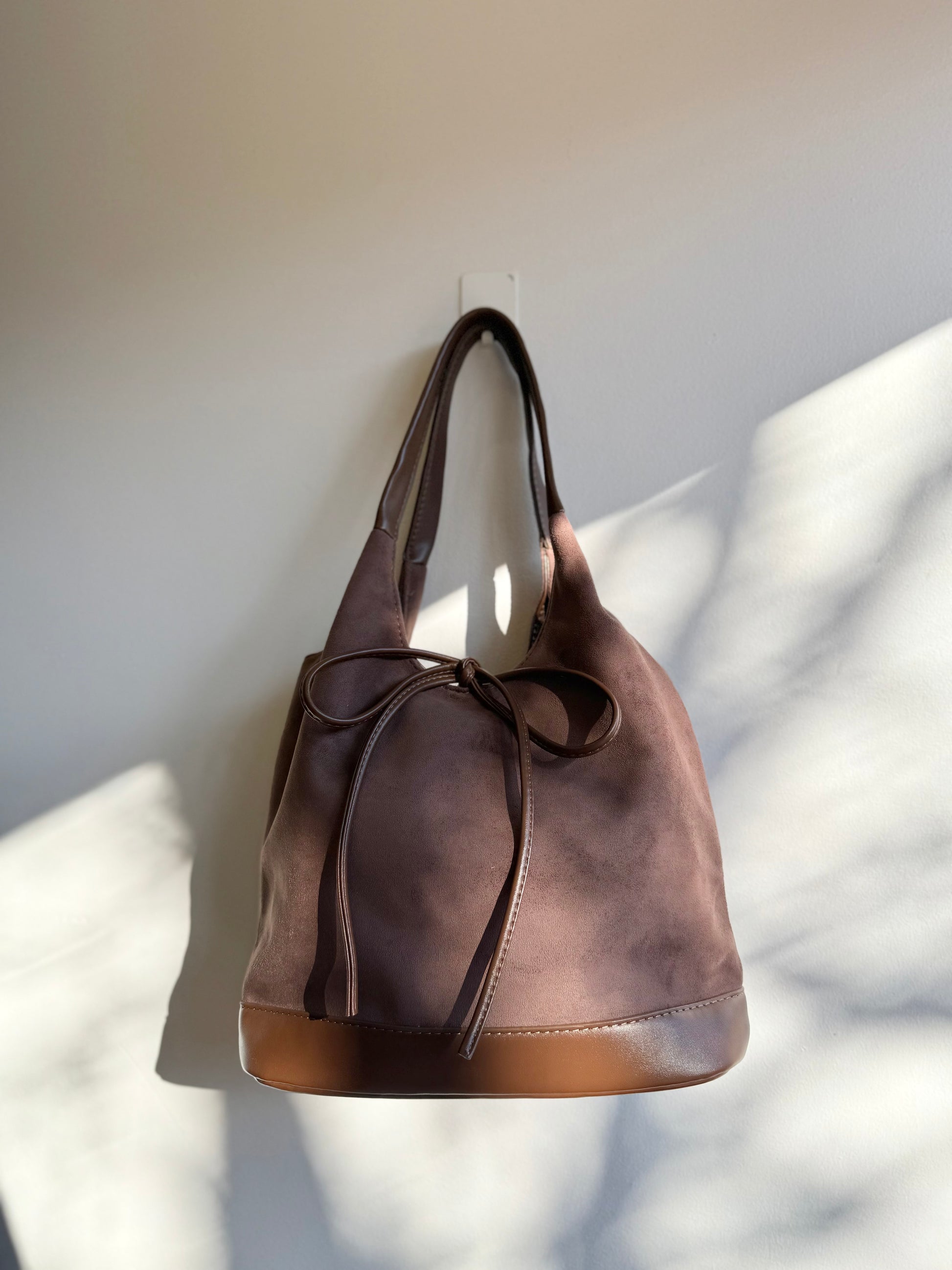 A sleek bucket-style bag with a soft, velvety suede finish and smooth leather trim for a clean contrast. Designed with a structured silhouette that still feels relaxed, it features an adjustable drawstring closure that keeps your essentials secure while adding a subtle, dainty detail.