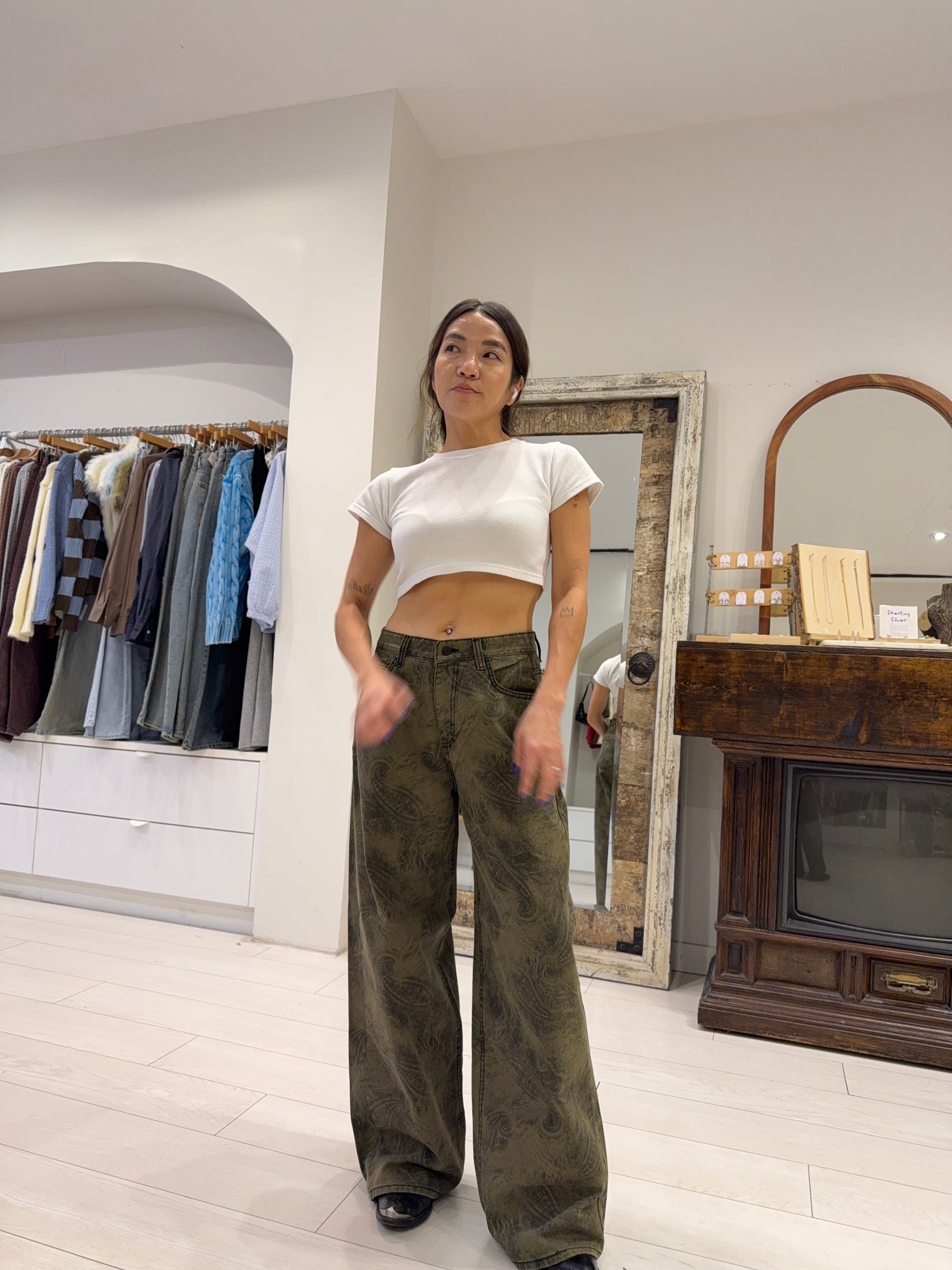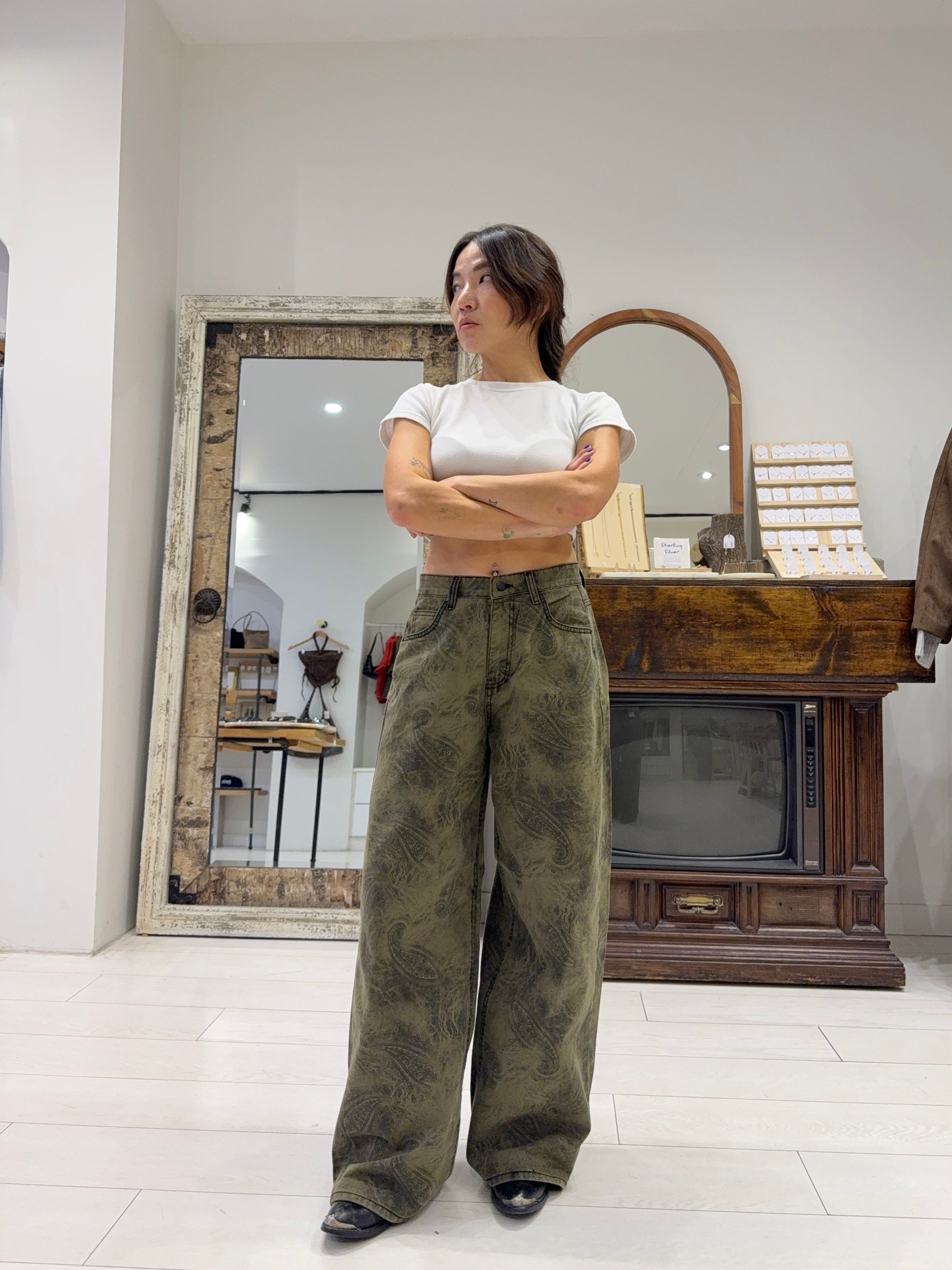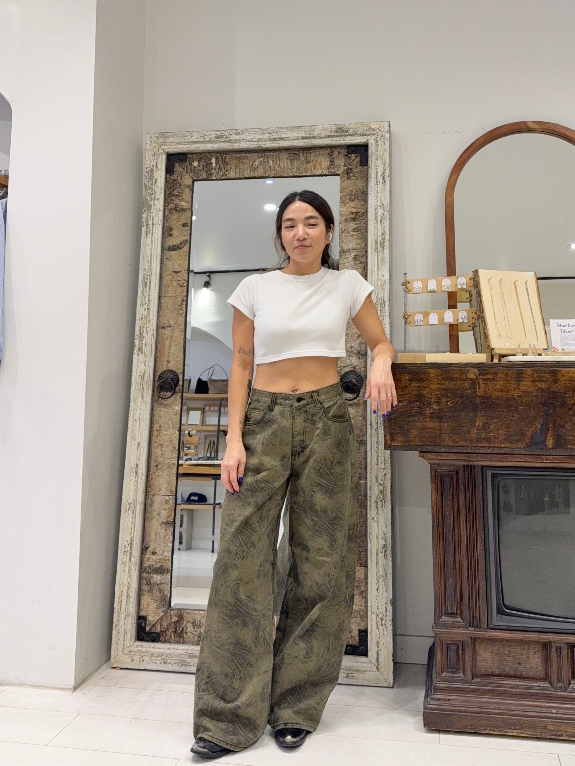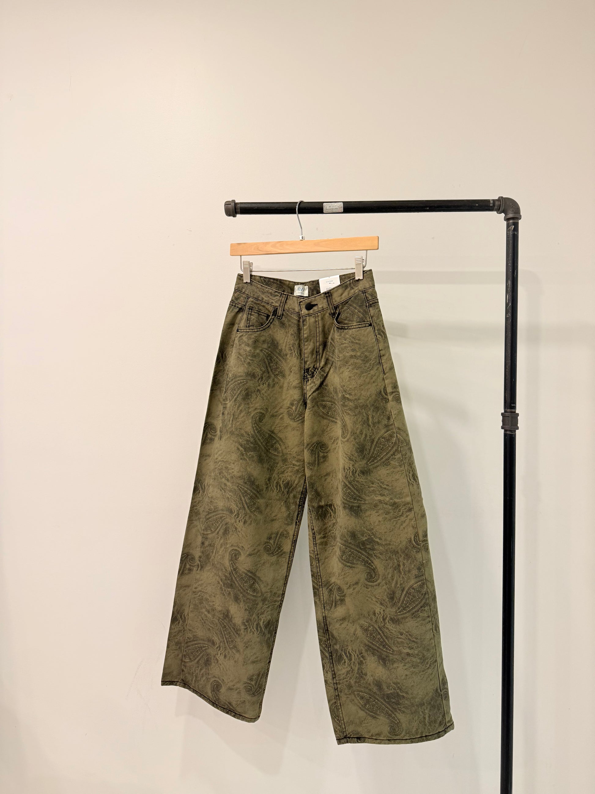 Prints to add the full fall feeling? Say less. Our Paisley-print jeans comes with a diagonal seam detail and a faded, rugged finish that gives them a worn-in charm. Designed in a gorgeous earthy green wash, they feature a mid-rise waist and a relaxed, baggy fit for that effortless vintage-inspired edge.