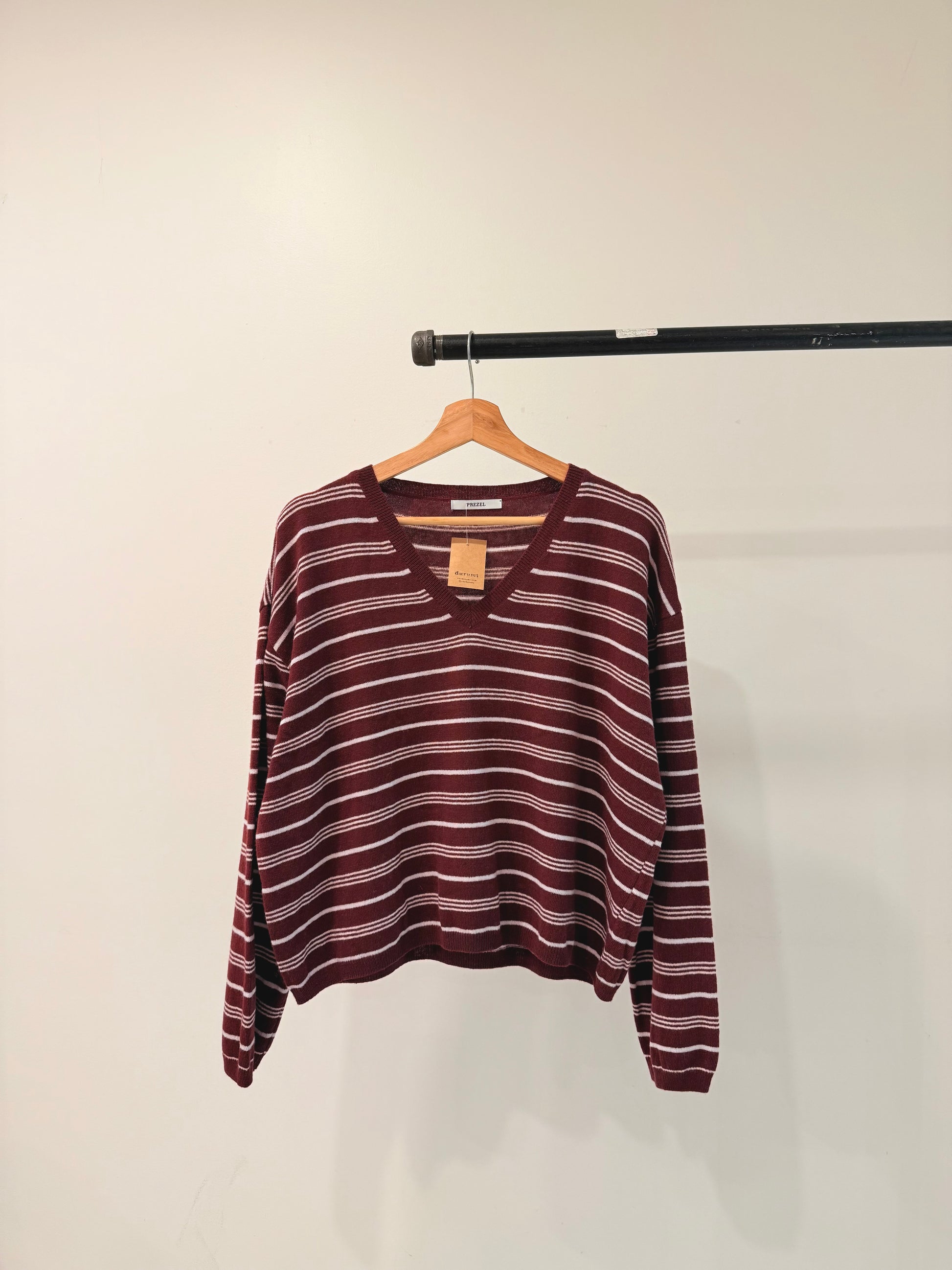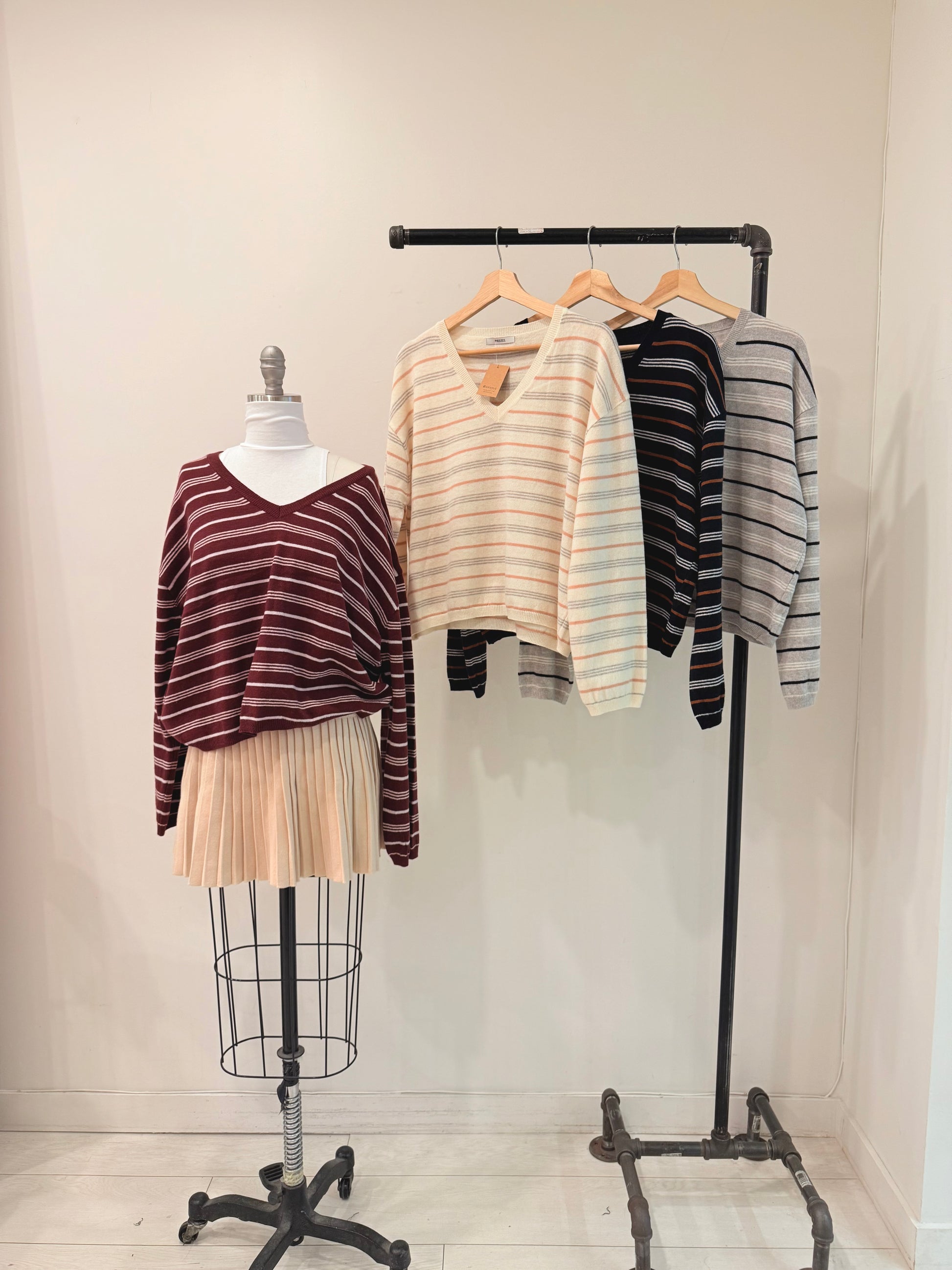 Relaxed yet effortlessly chic, our loose-fit V-neck stripe knit top is here to rule your fall wardrobe. Cozy and cute, it features a deep V-neckline, ribbed cuffs and hem, and timeless horizontal stripes—a fail-safe piece for layering or wearing solo.