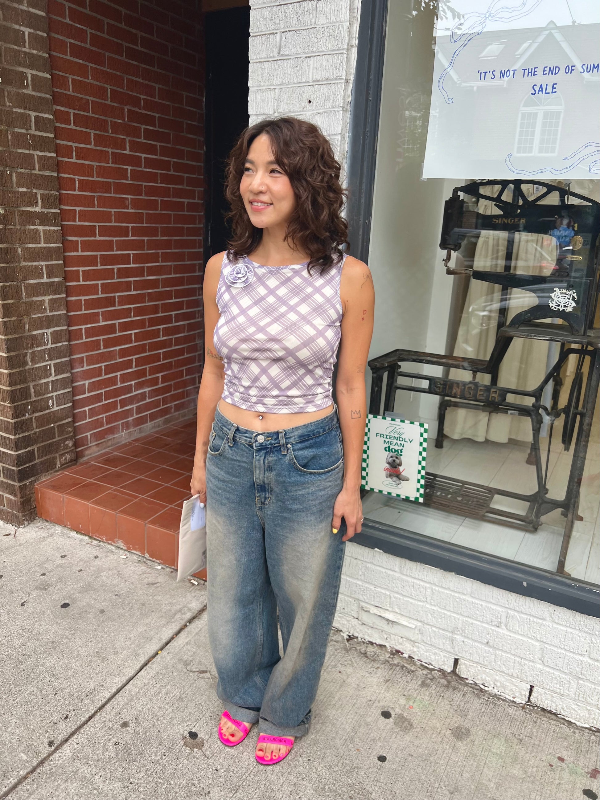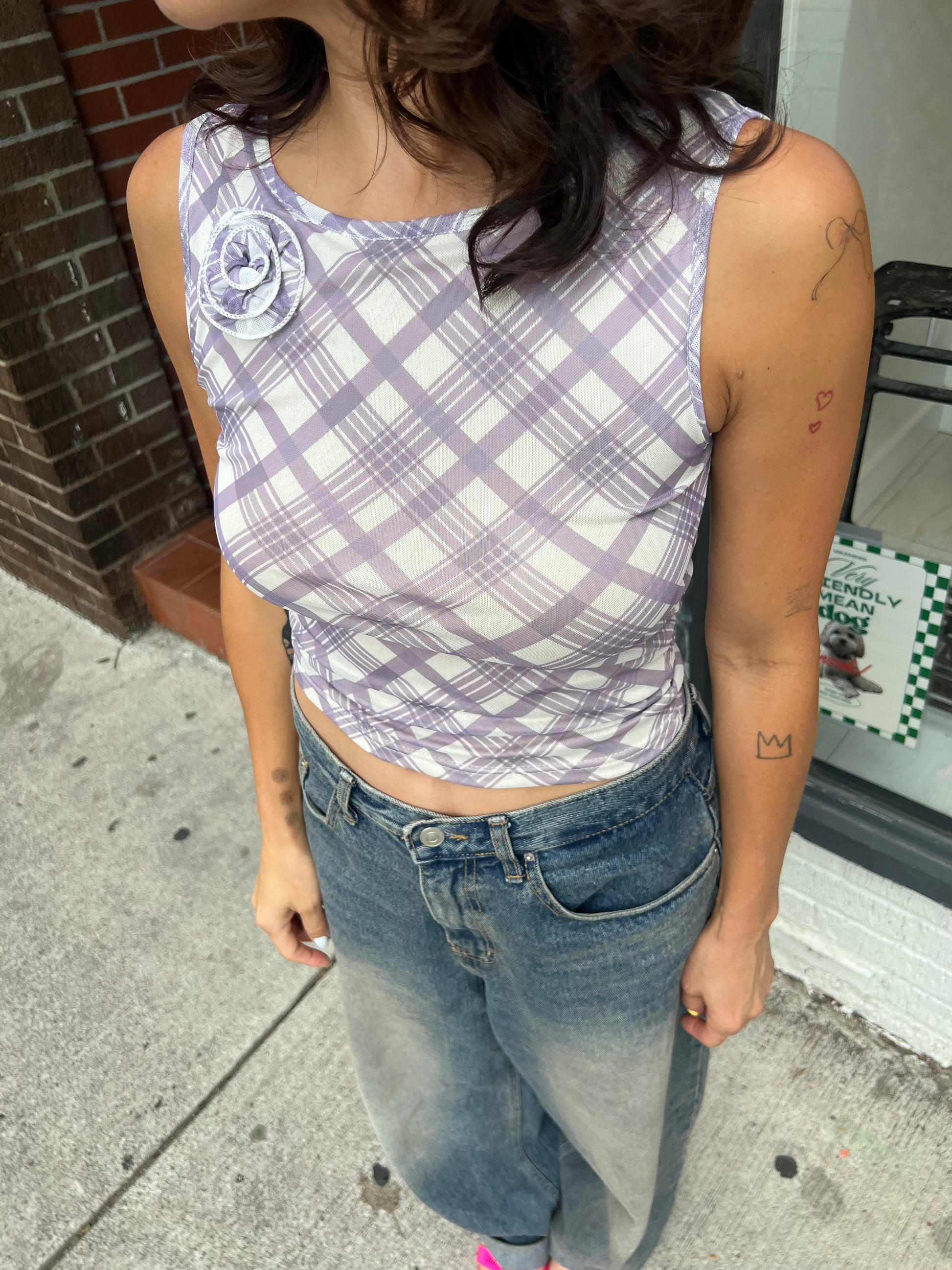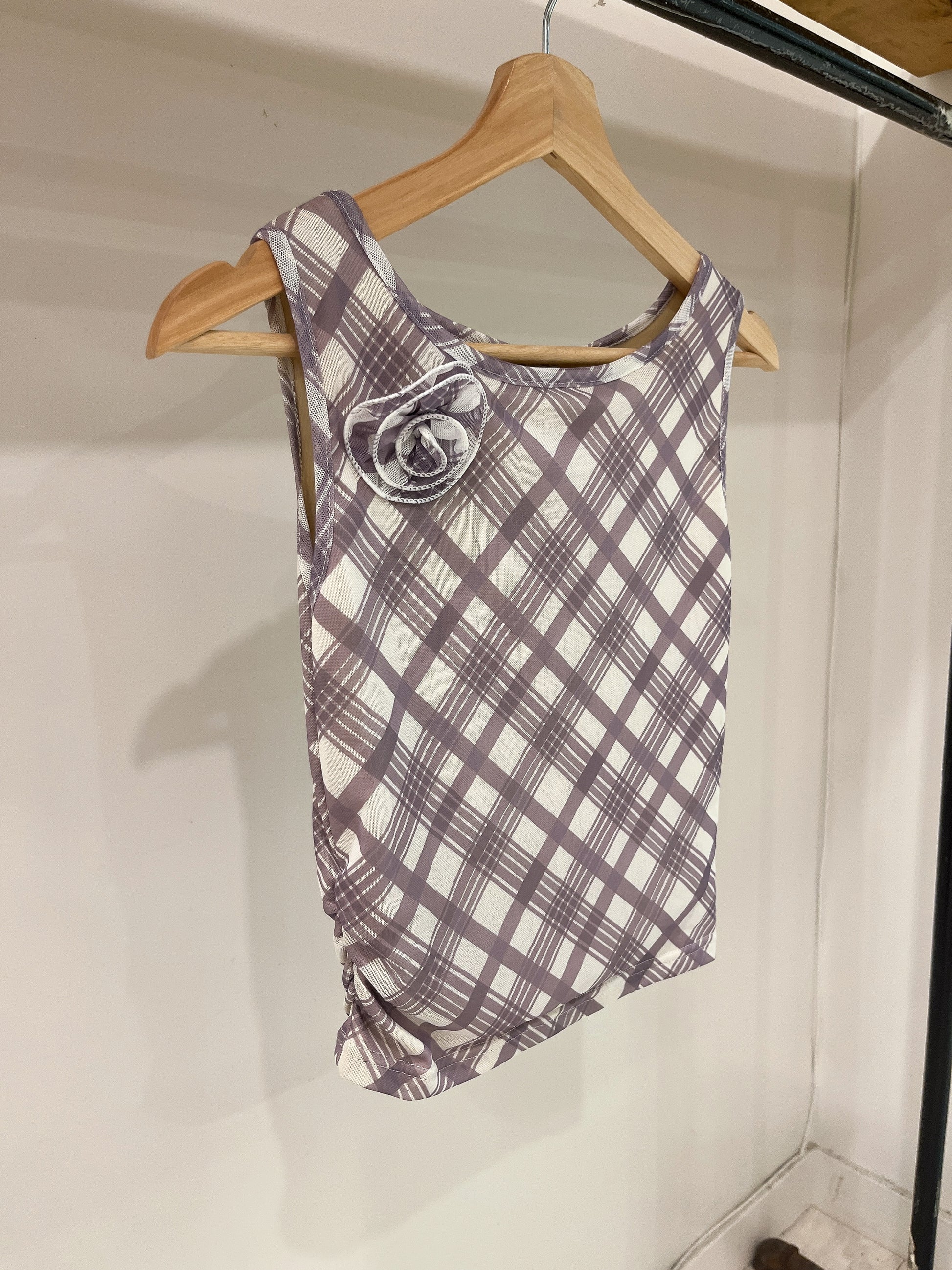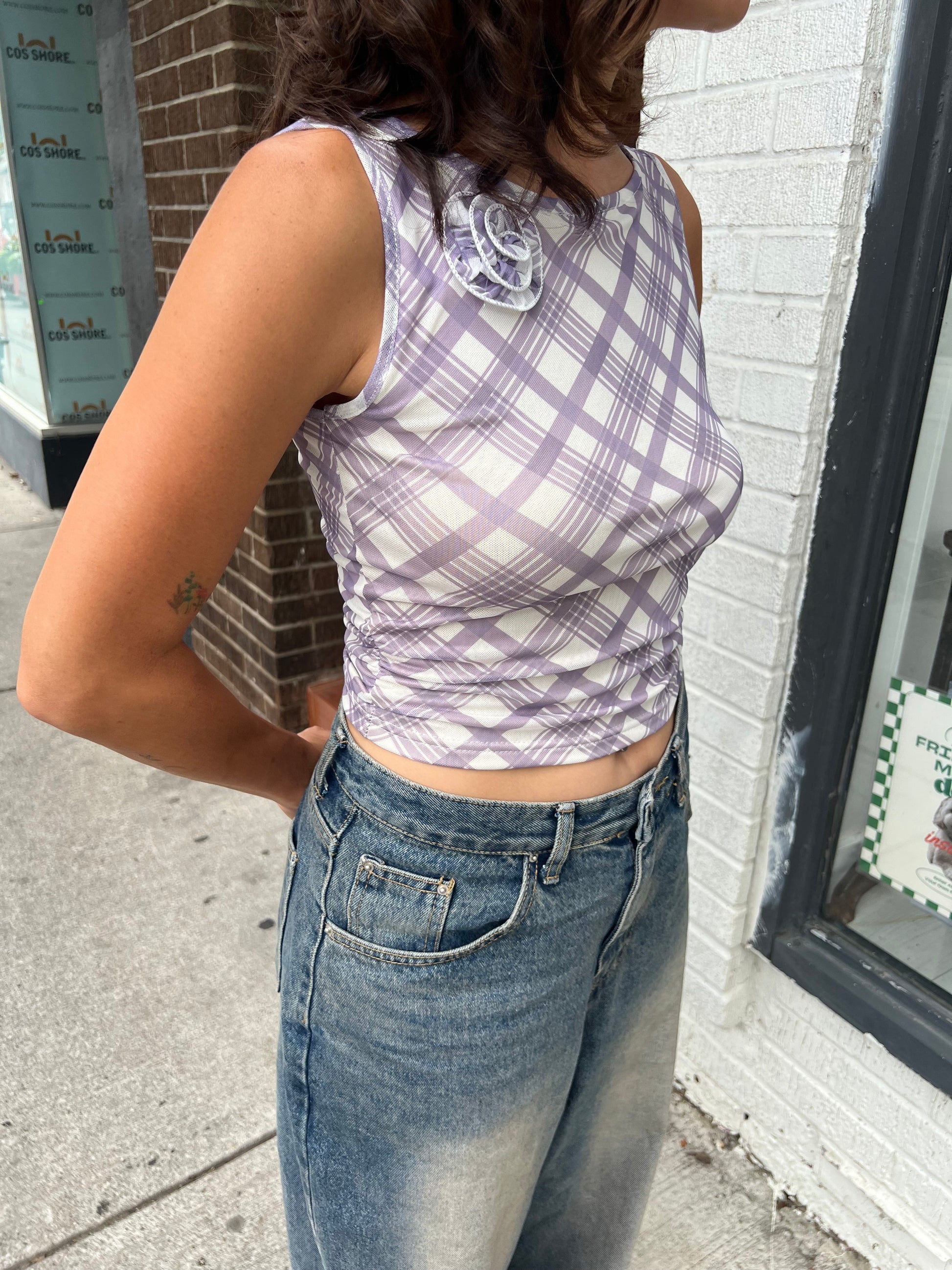 Our super fun, plaid-printed, one-sided ruched end mesh tank top with 3D side rose shoulder detail is a must have elevated basic for your summer wardrobe!