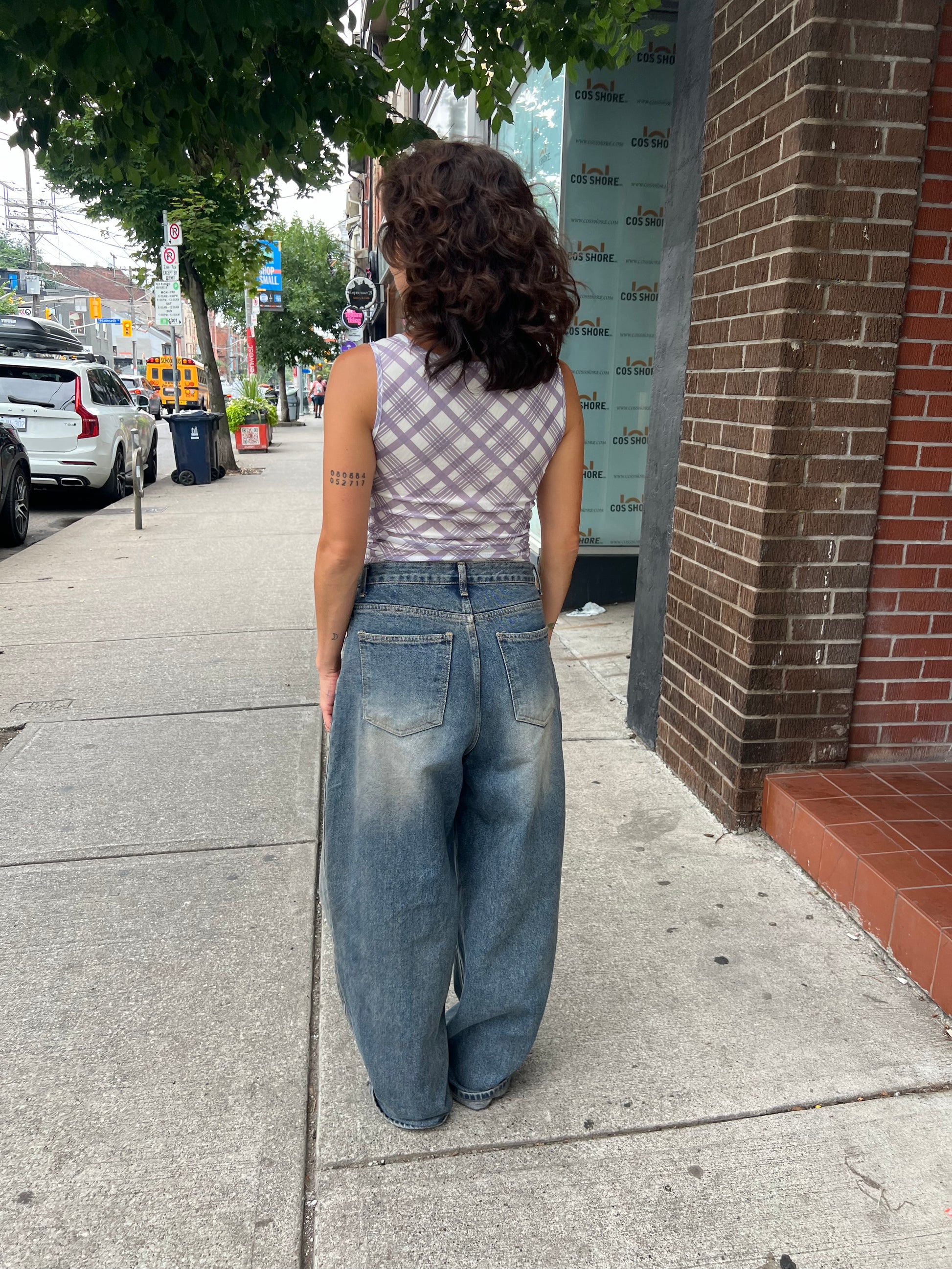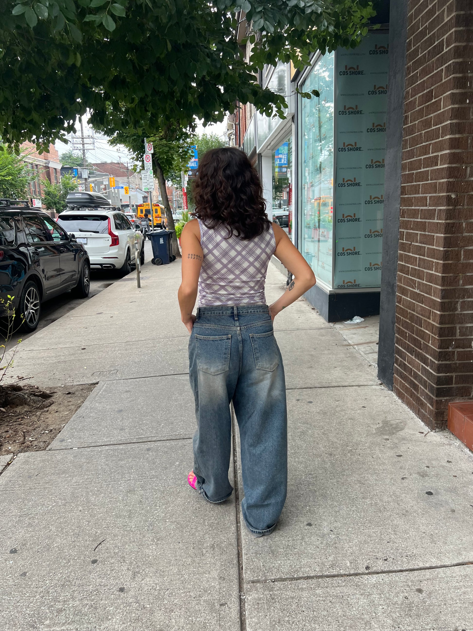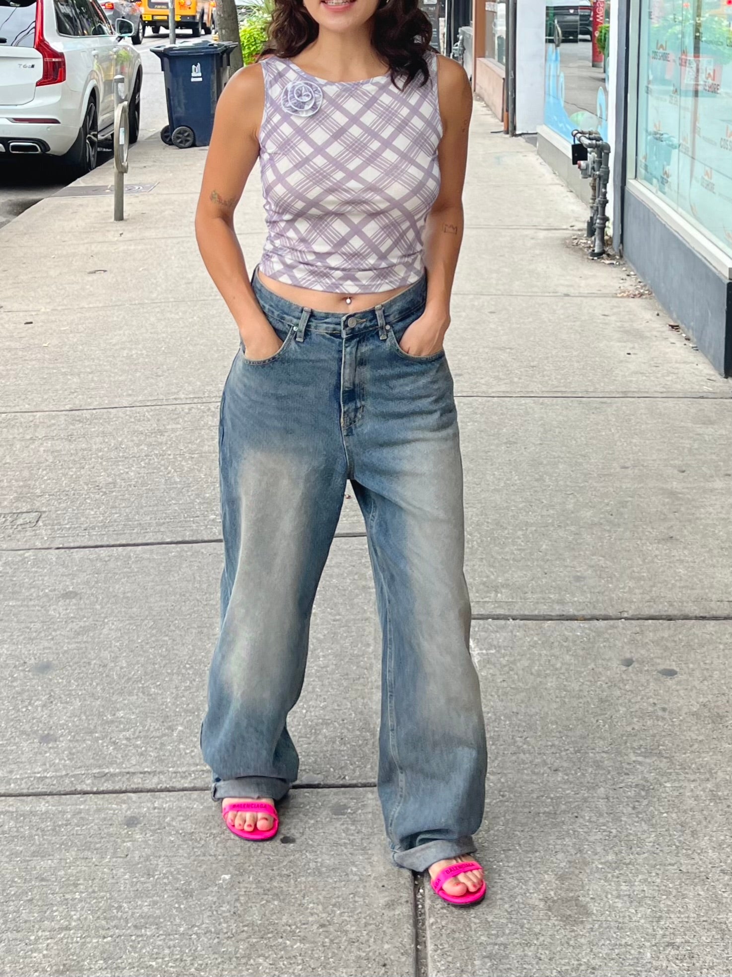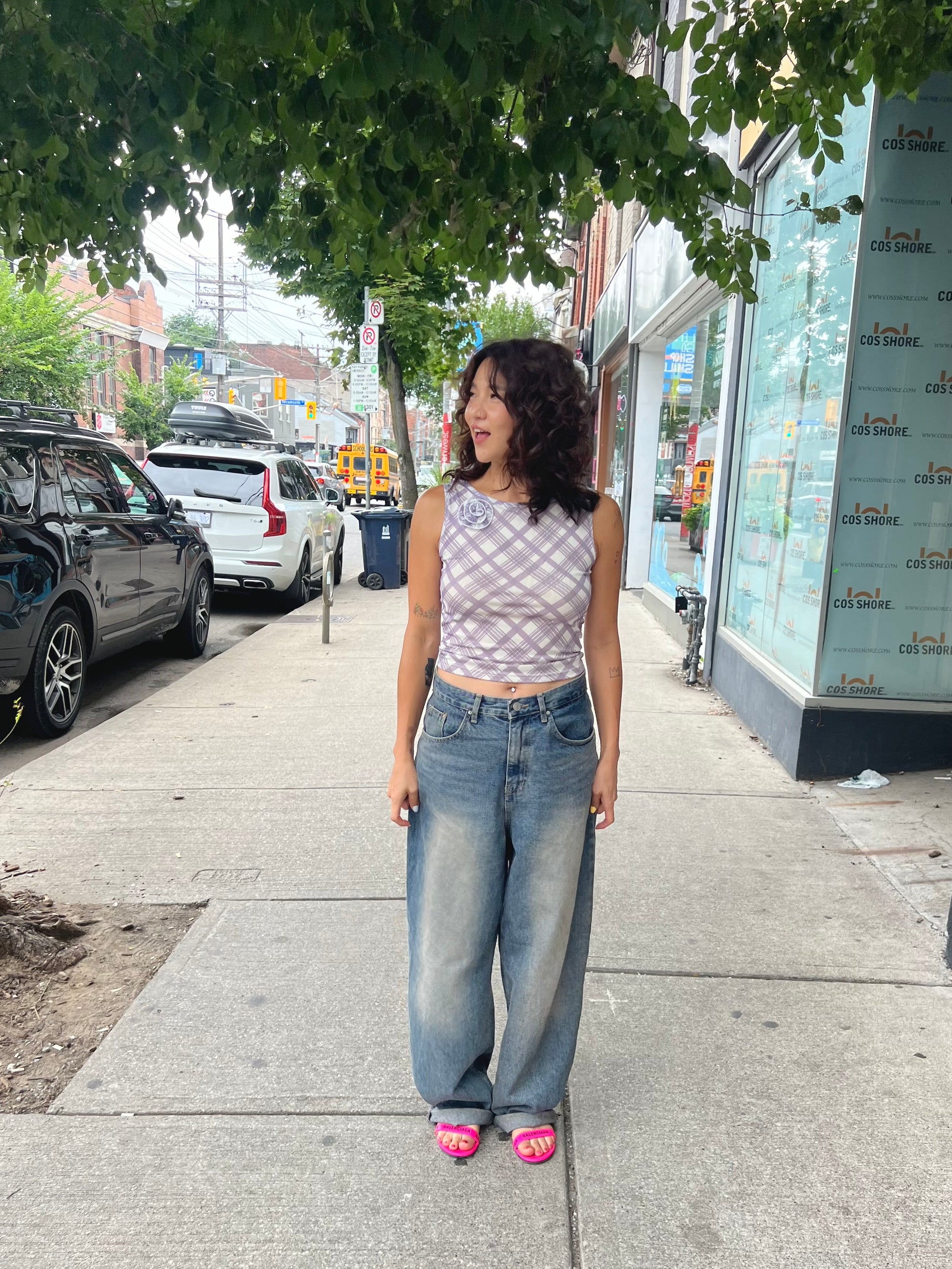 Our super fun, plaid-printed, one-sided ruched end mesh tank top with 3D side rose shoulder detail is a must have elevated basic for your summer wardrobe!