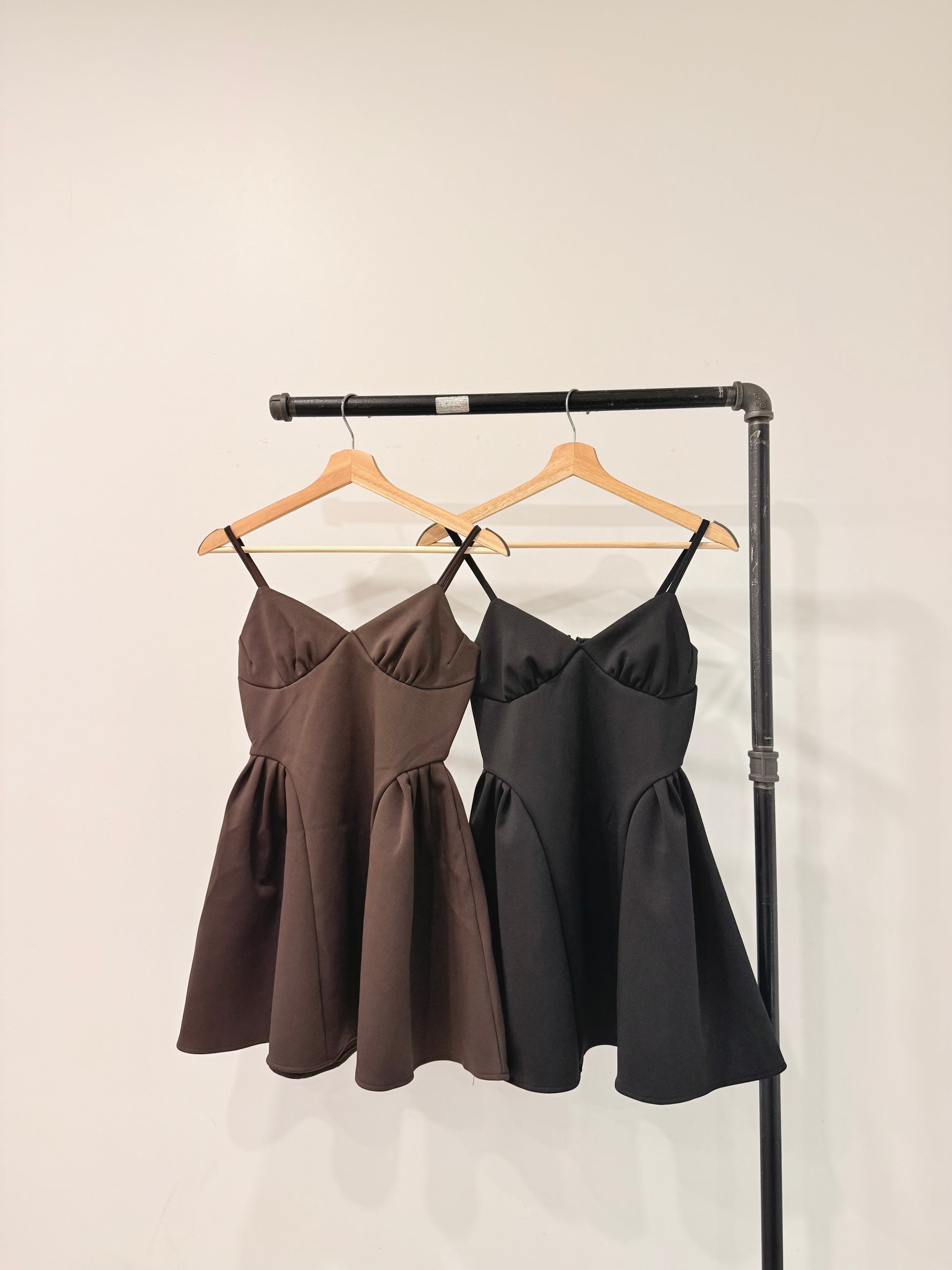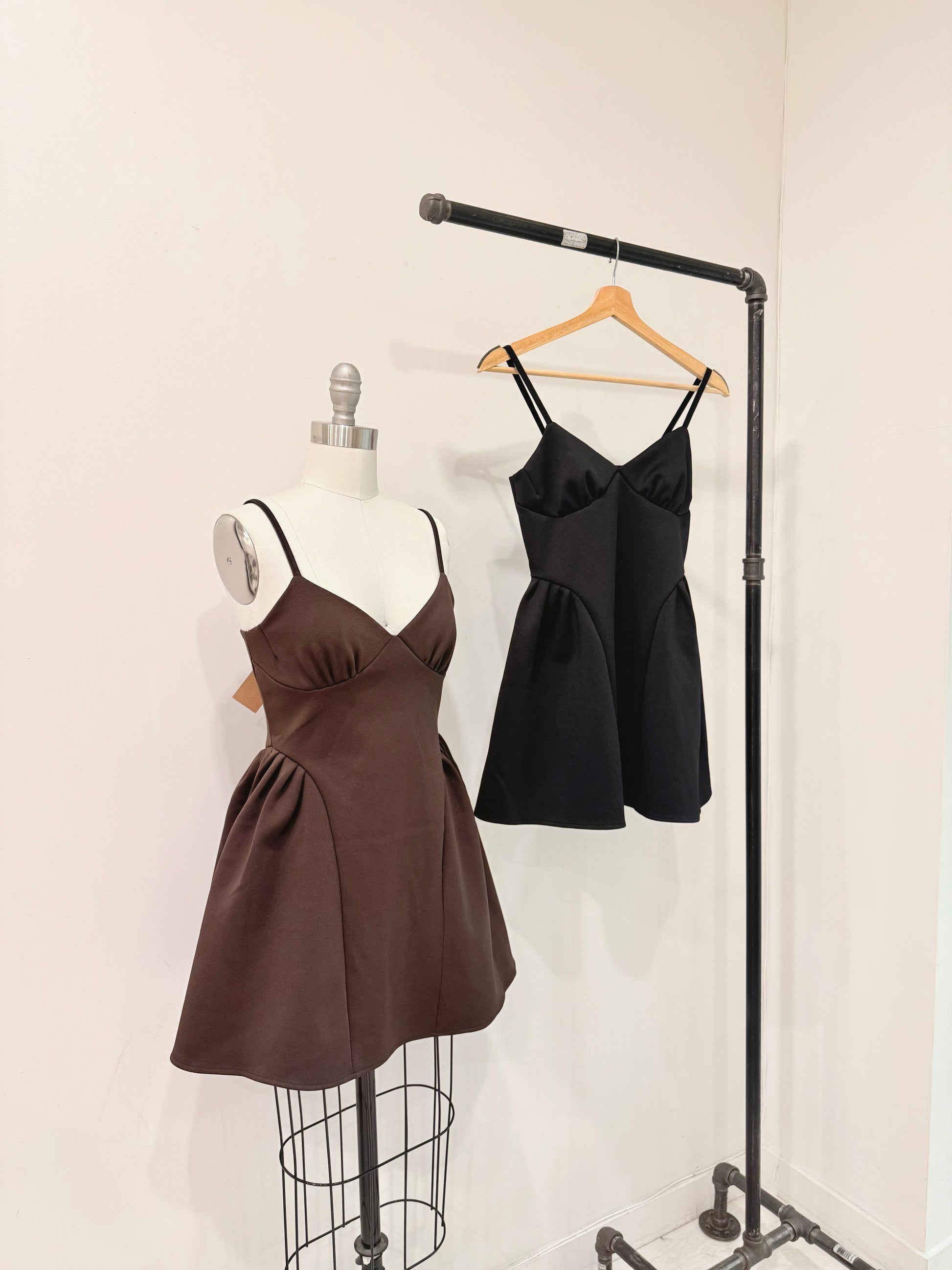 `A flirty mini bustier dress with adjustable noodle straps and a voluminous skater silhouette that moves beautifully. Designed with subtle ruching along the bust and sides for a flattering fit. Finished in a soft, structured fabric that gives just the right amount of bounce. Available in classic black and rich brown.