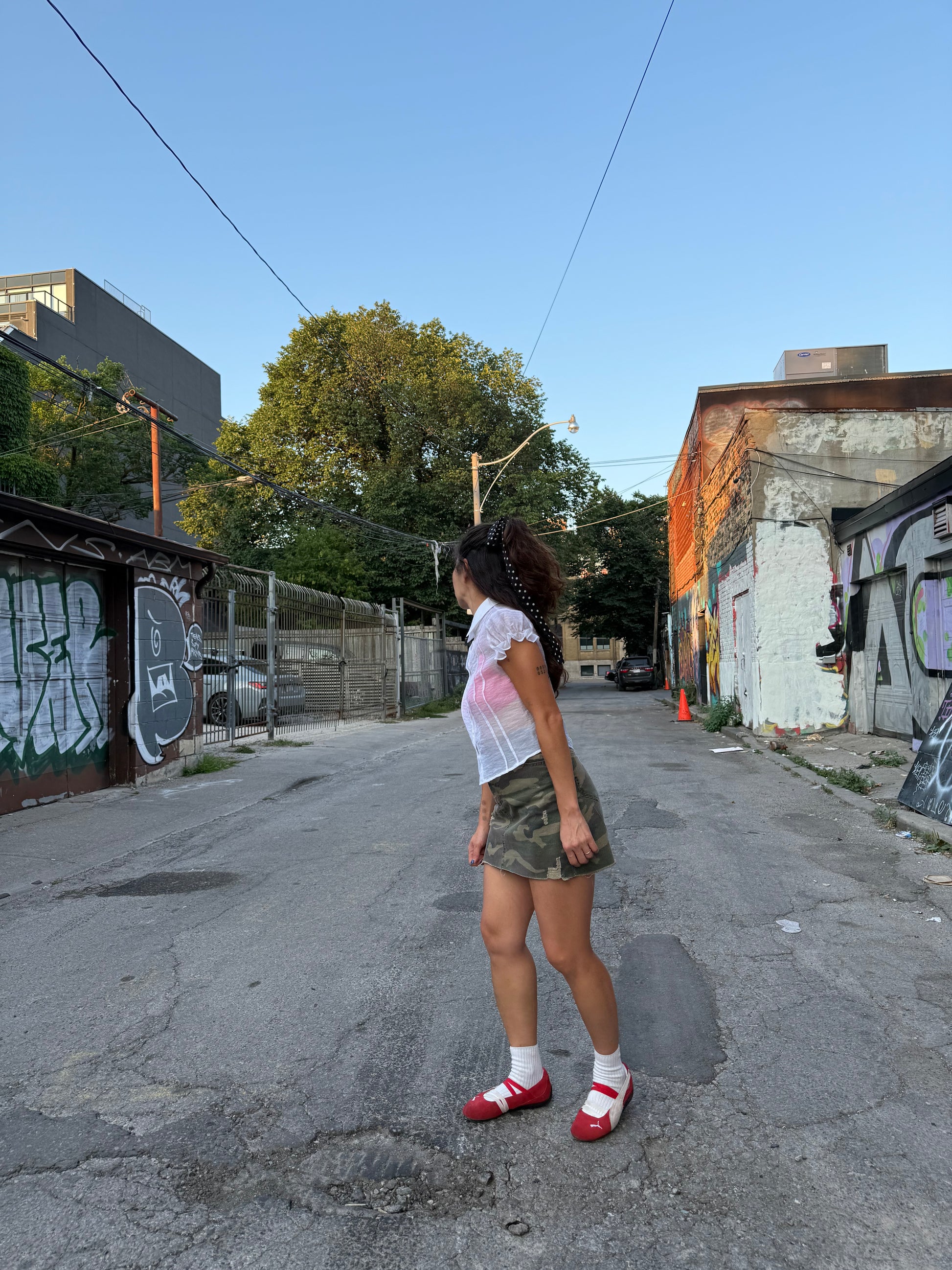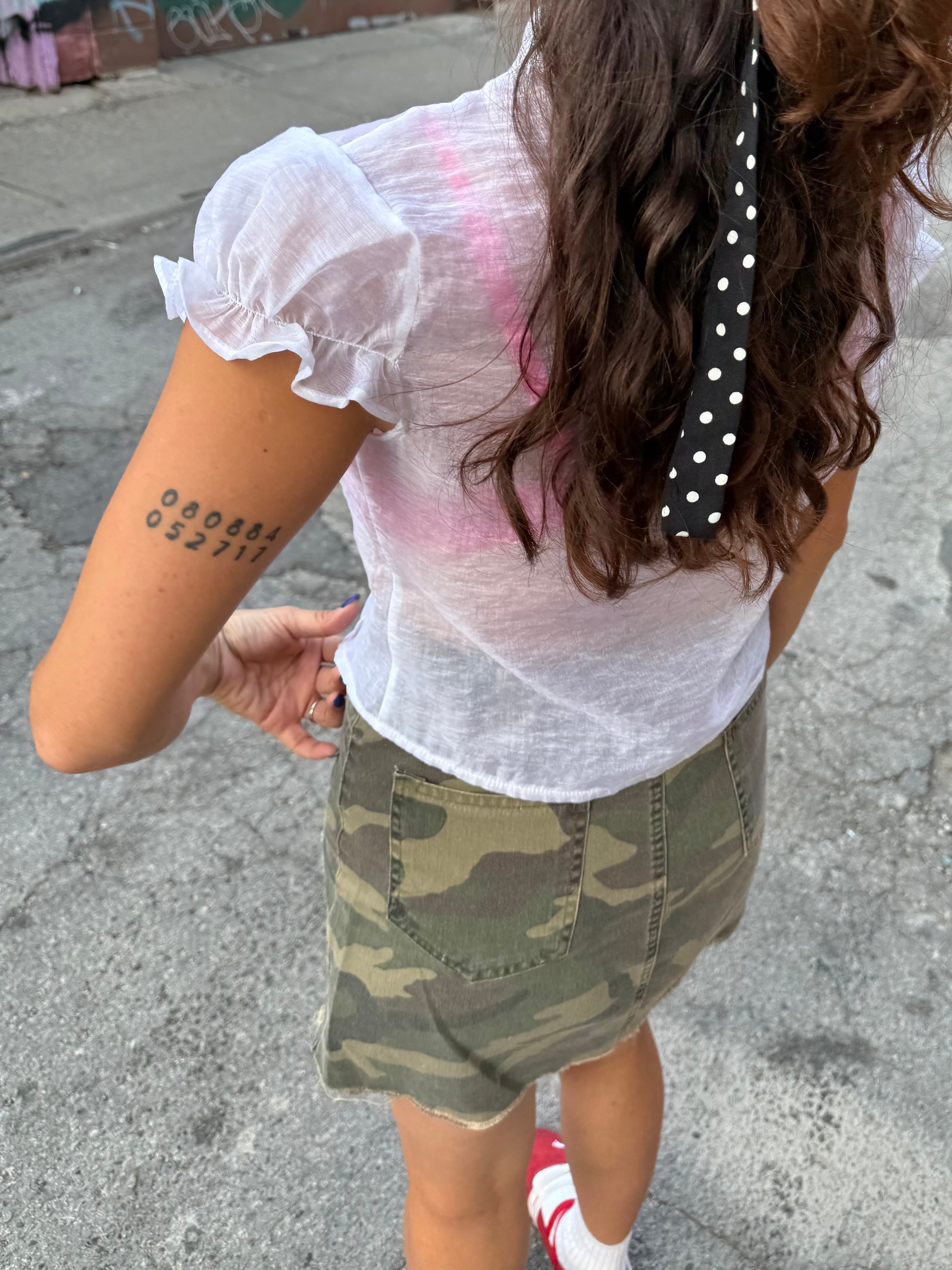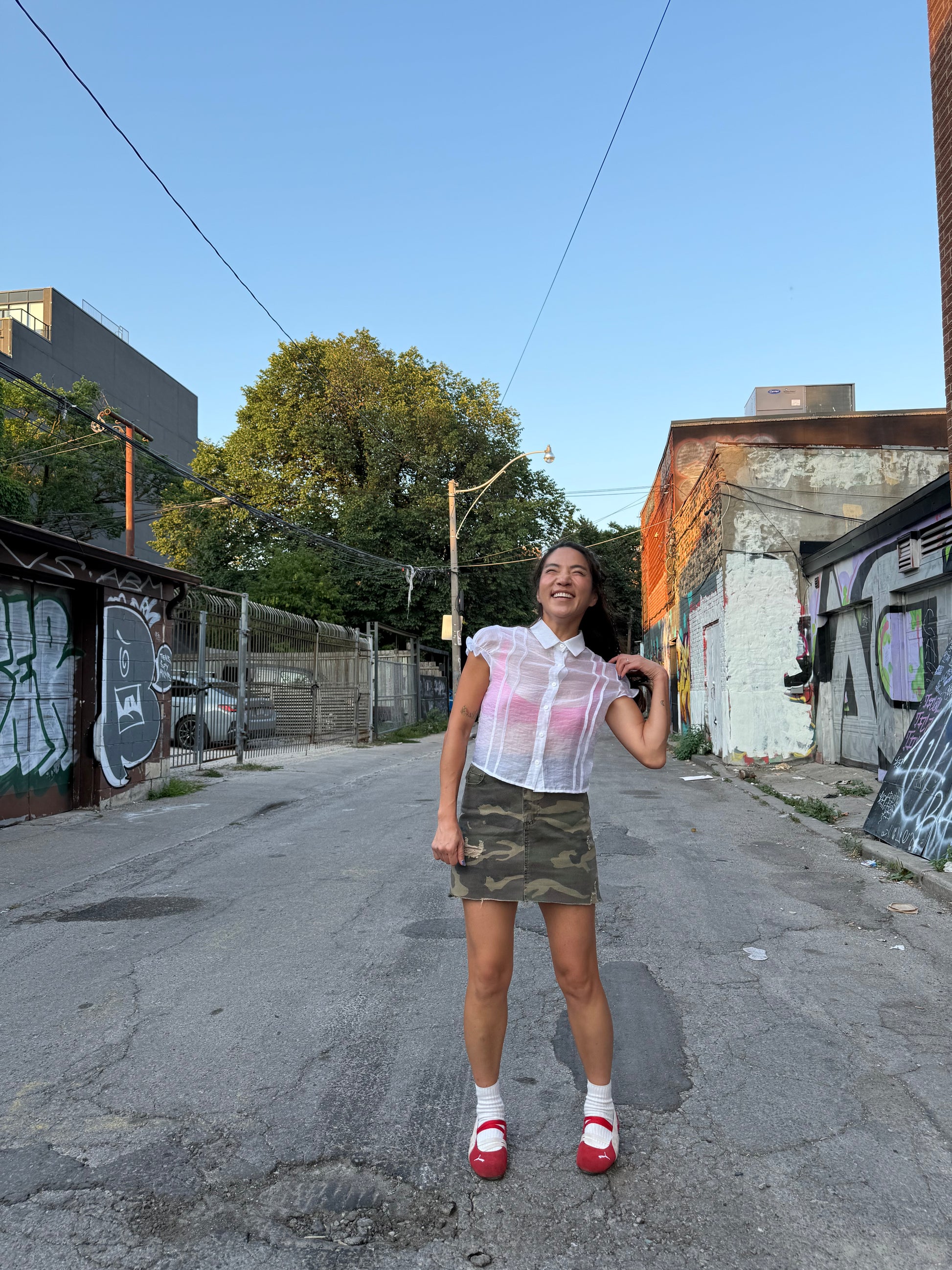 Light, airy, and effortlessly chic. This chiffon short-sleeve shirt features a crisp collar, button-down front, and capped ruffle sleeves for a soft, feminine feel. The sheer mesh bodice and front stitching detail add a delicate, dreamy vibe to any outfit.