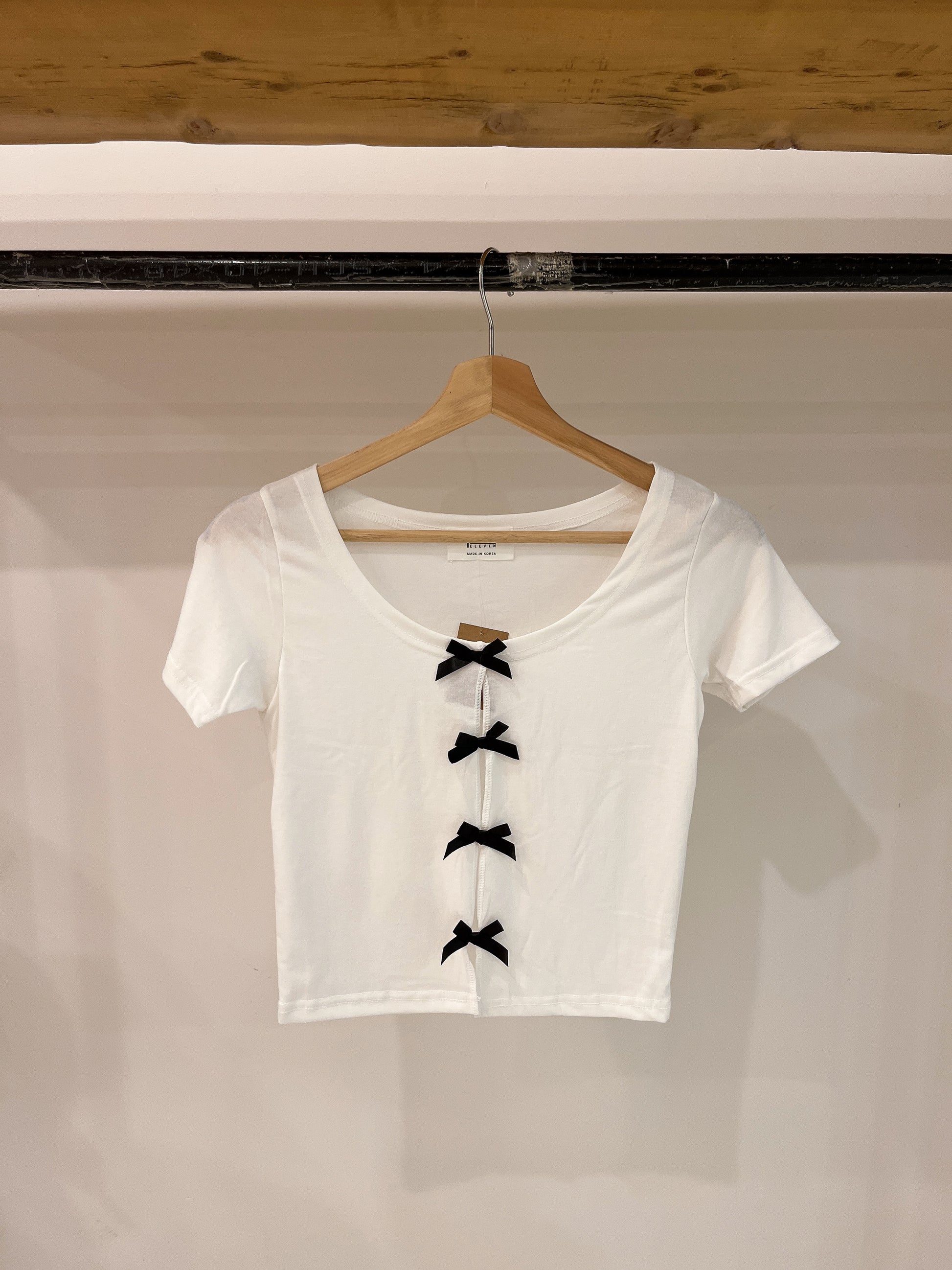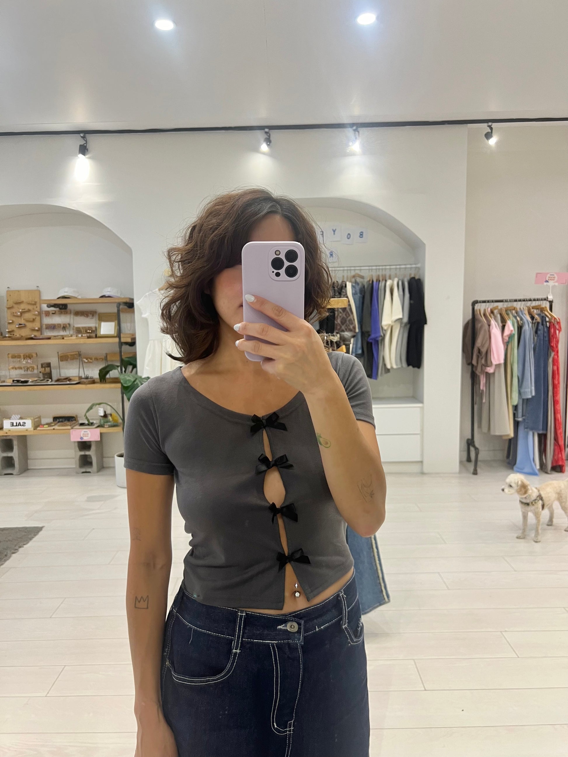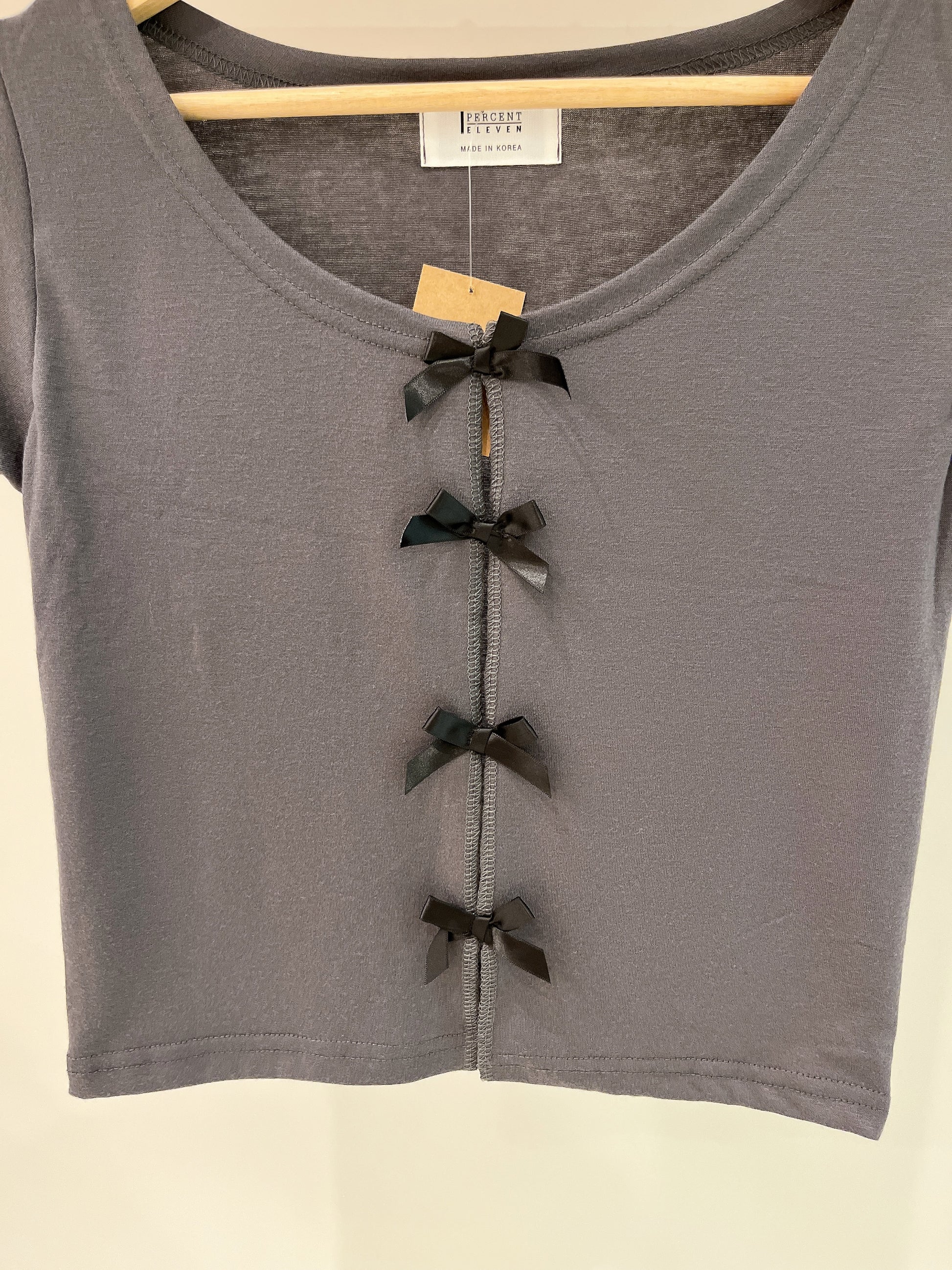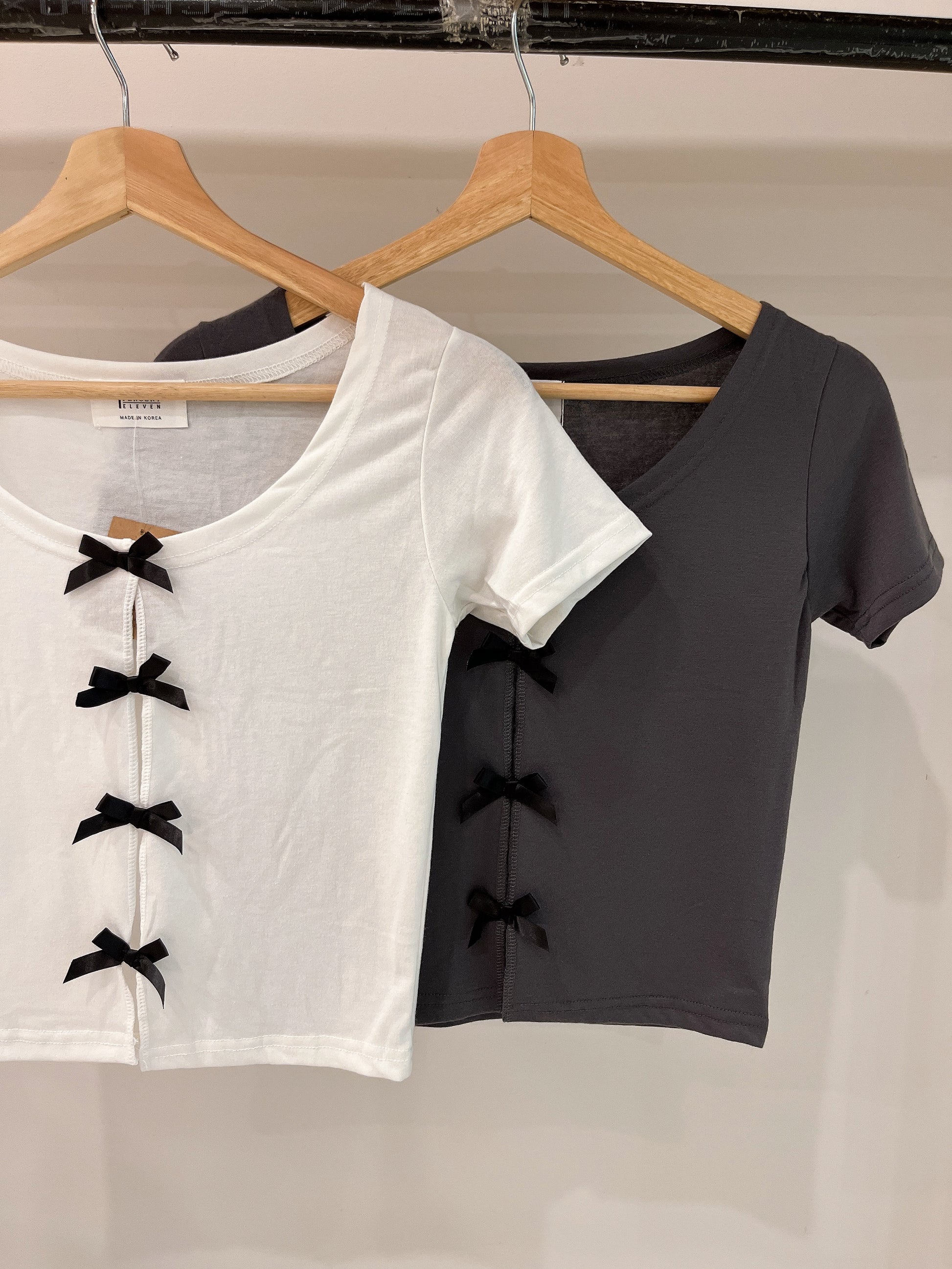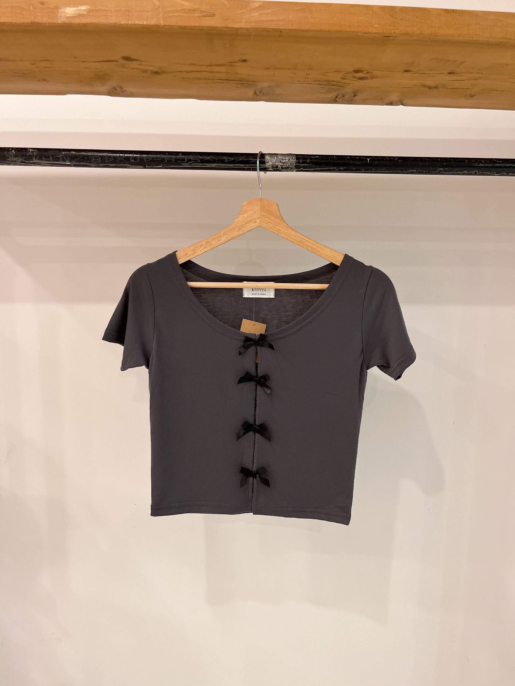 Embrace feminine ease in our super cute round neck, short sleeve top featuring front cut out detail, little black bows and a regular fit! Now available in charcoal and white!