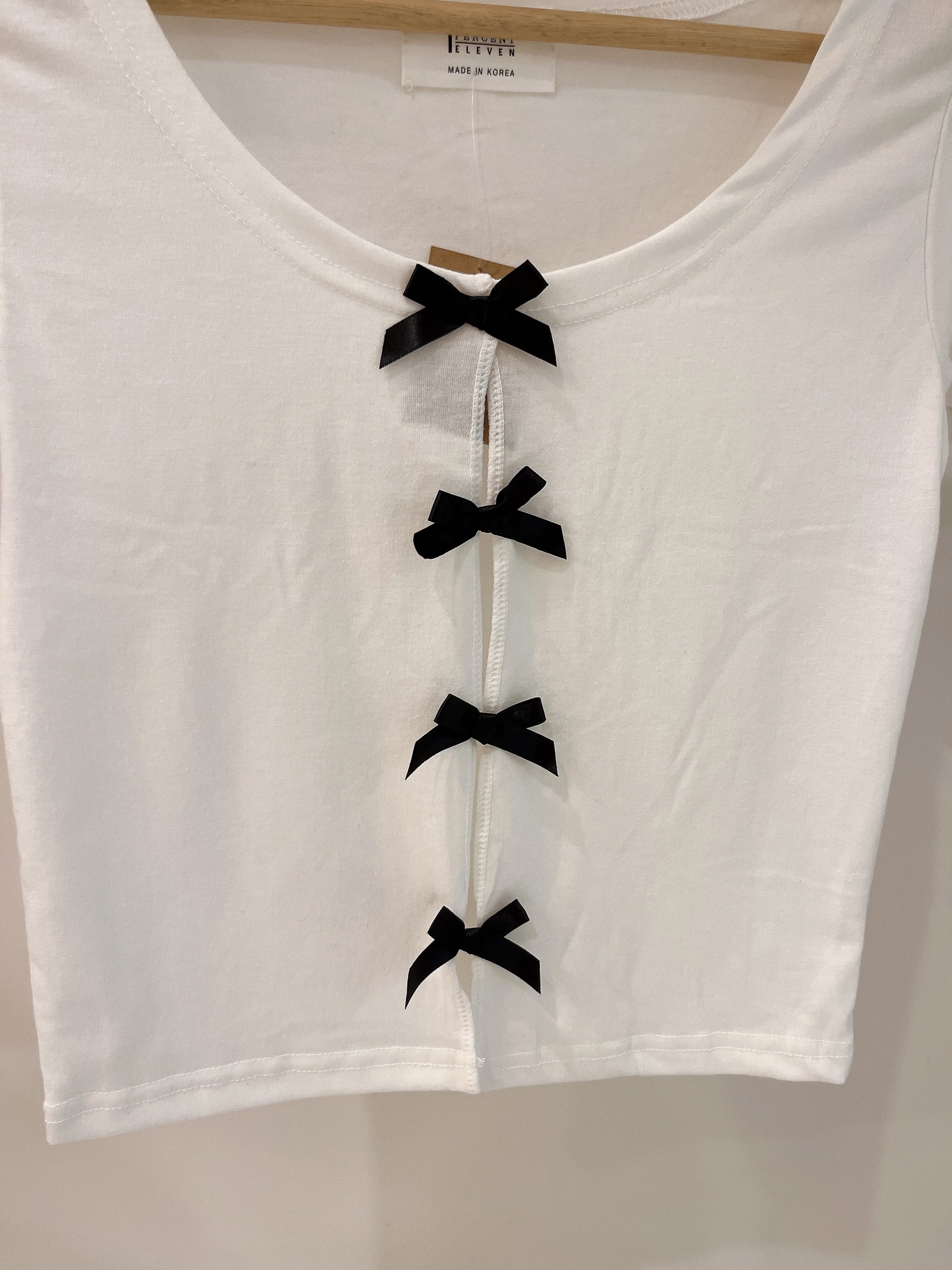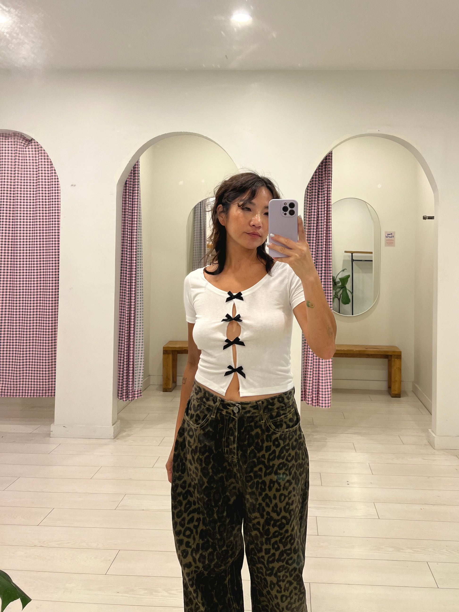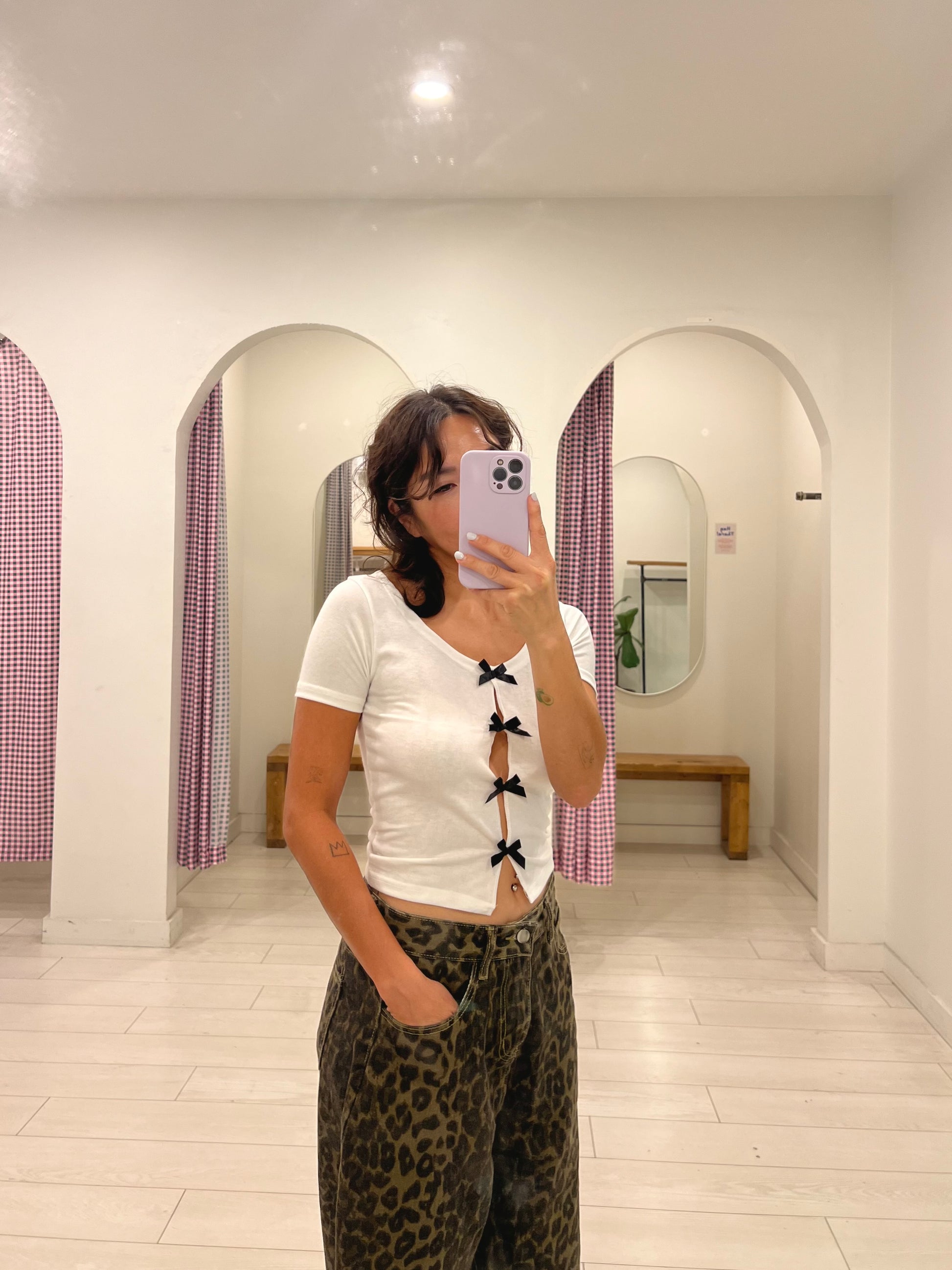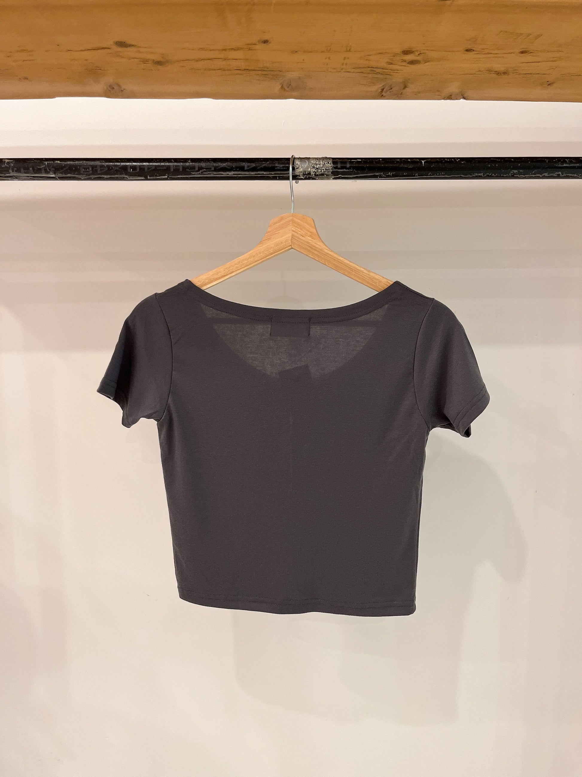 Embrace feminine ease in our super cute round neck, short sleeve top featuring front cut out detail, little black bows and a regular fit! Now available in charcoal and white!