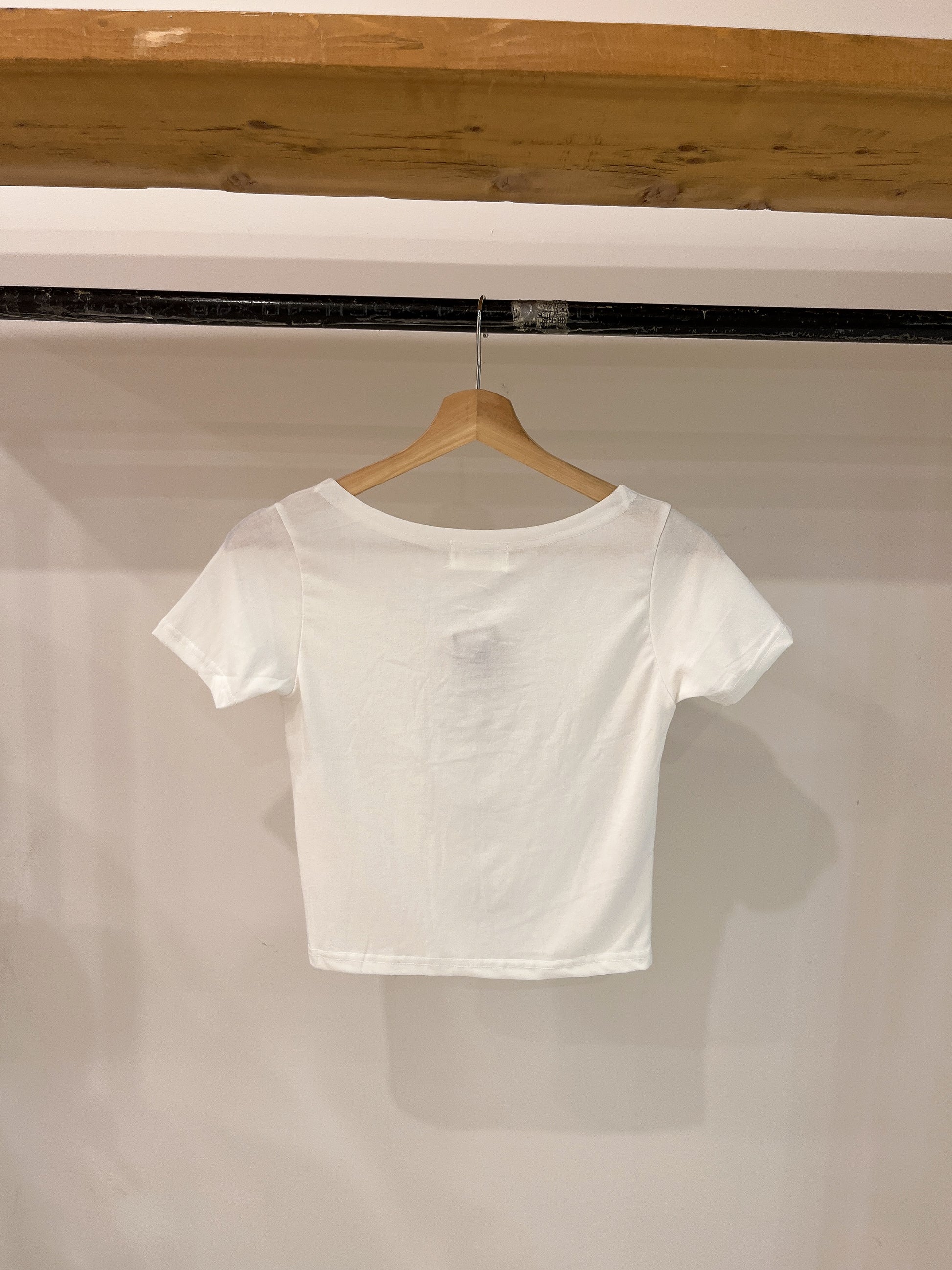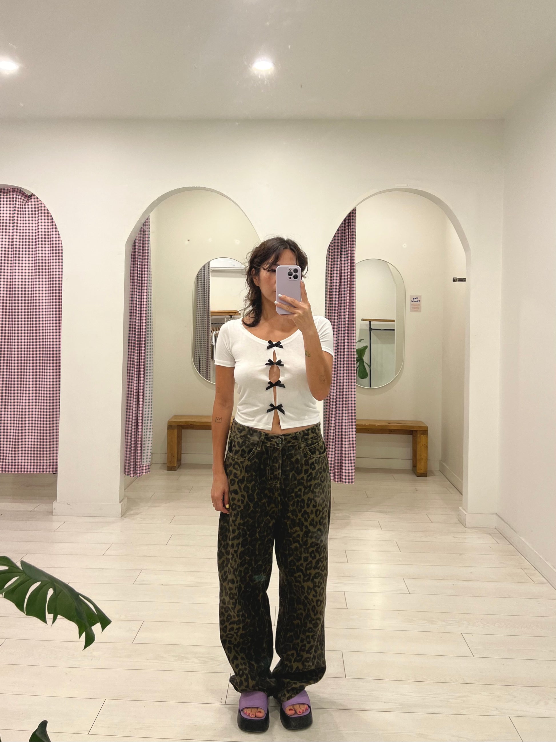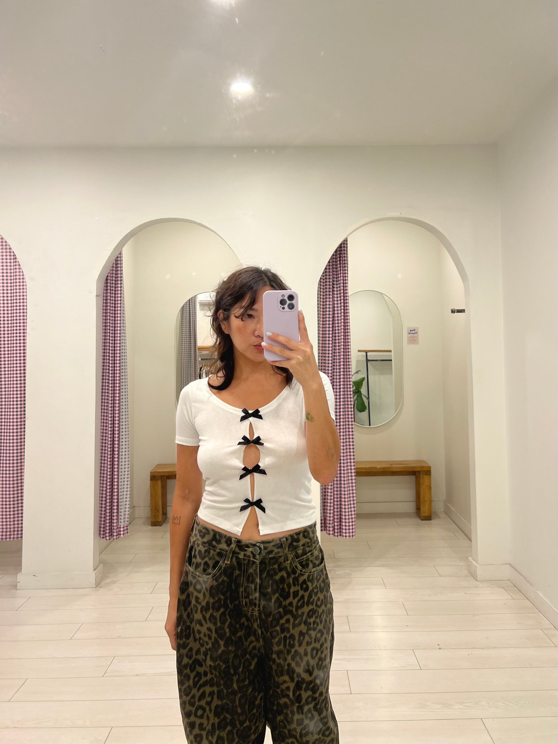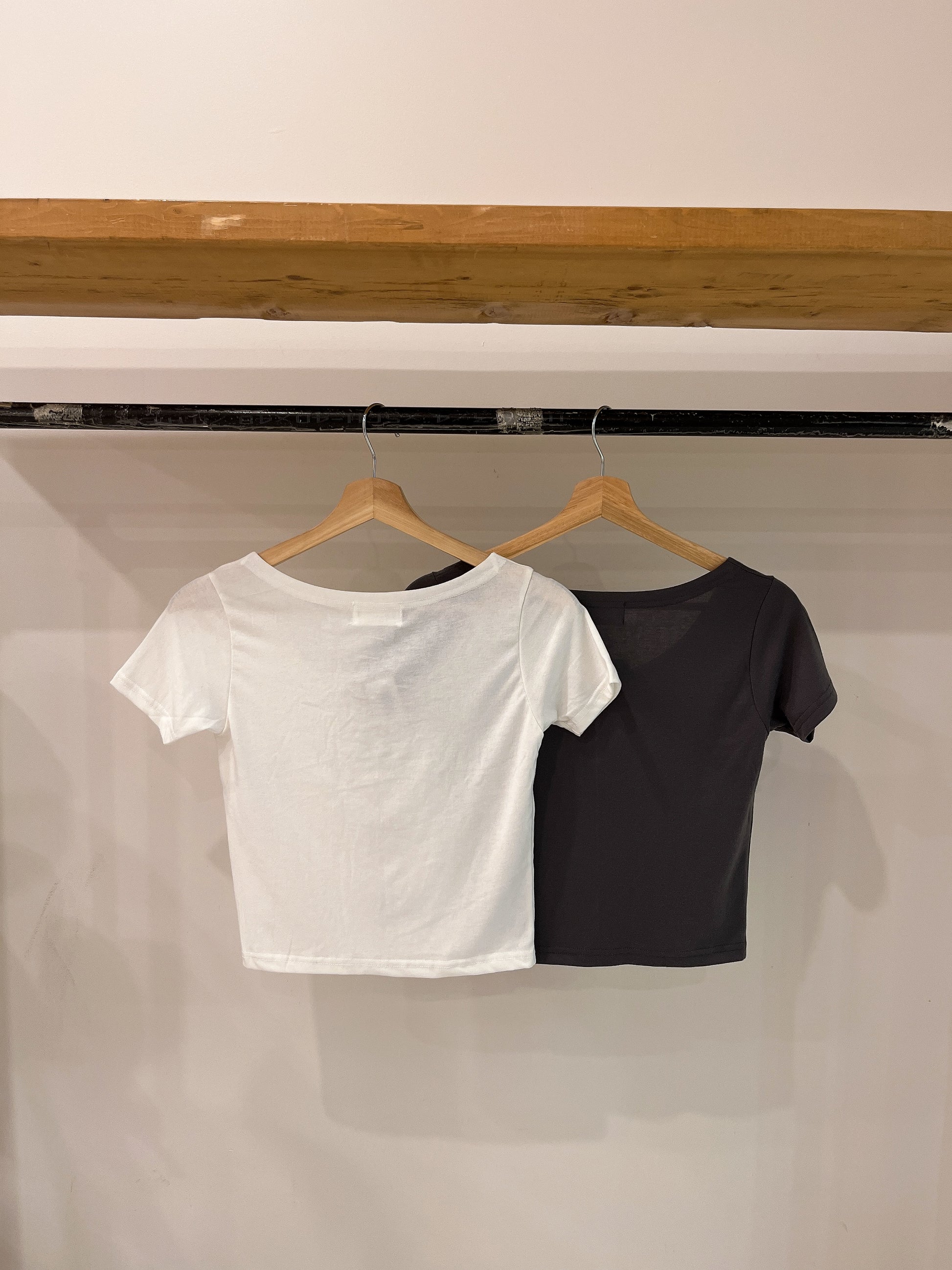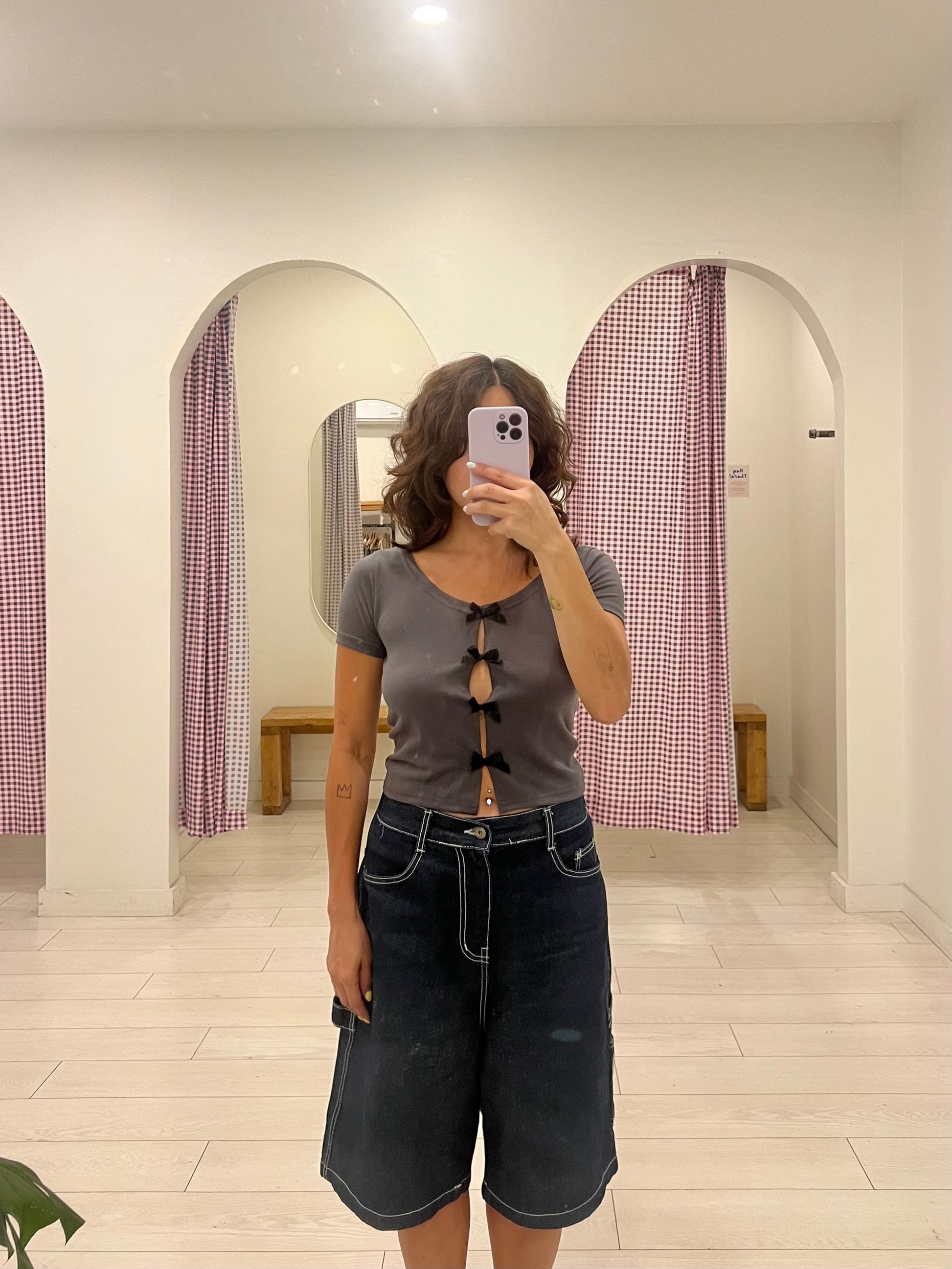 Embrace feminine ease in our super cute round neck, short sleeve top featuring front cut out detail, little black bows and a regular fit! Now available in charcoal and white!